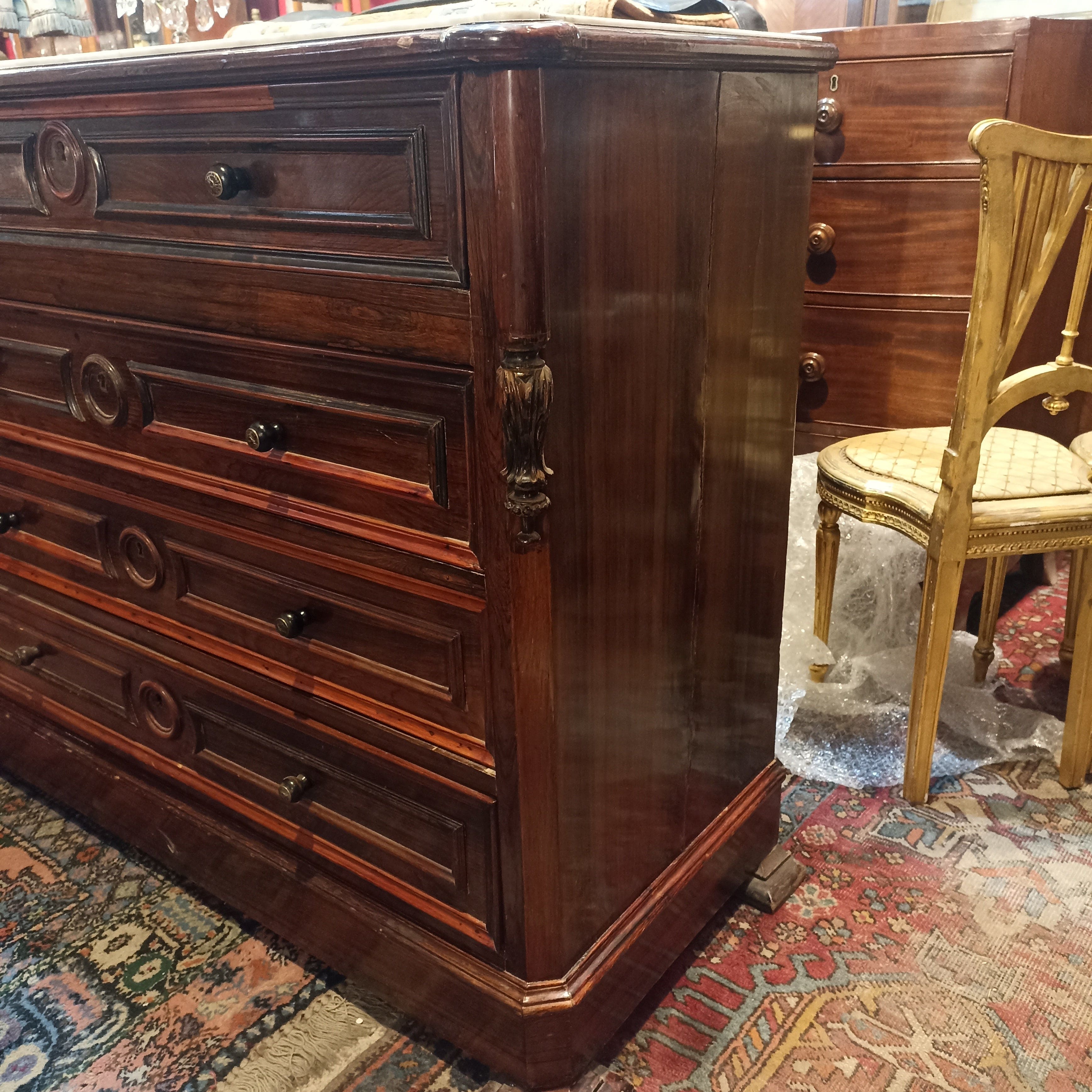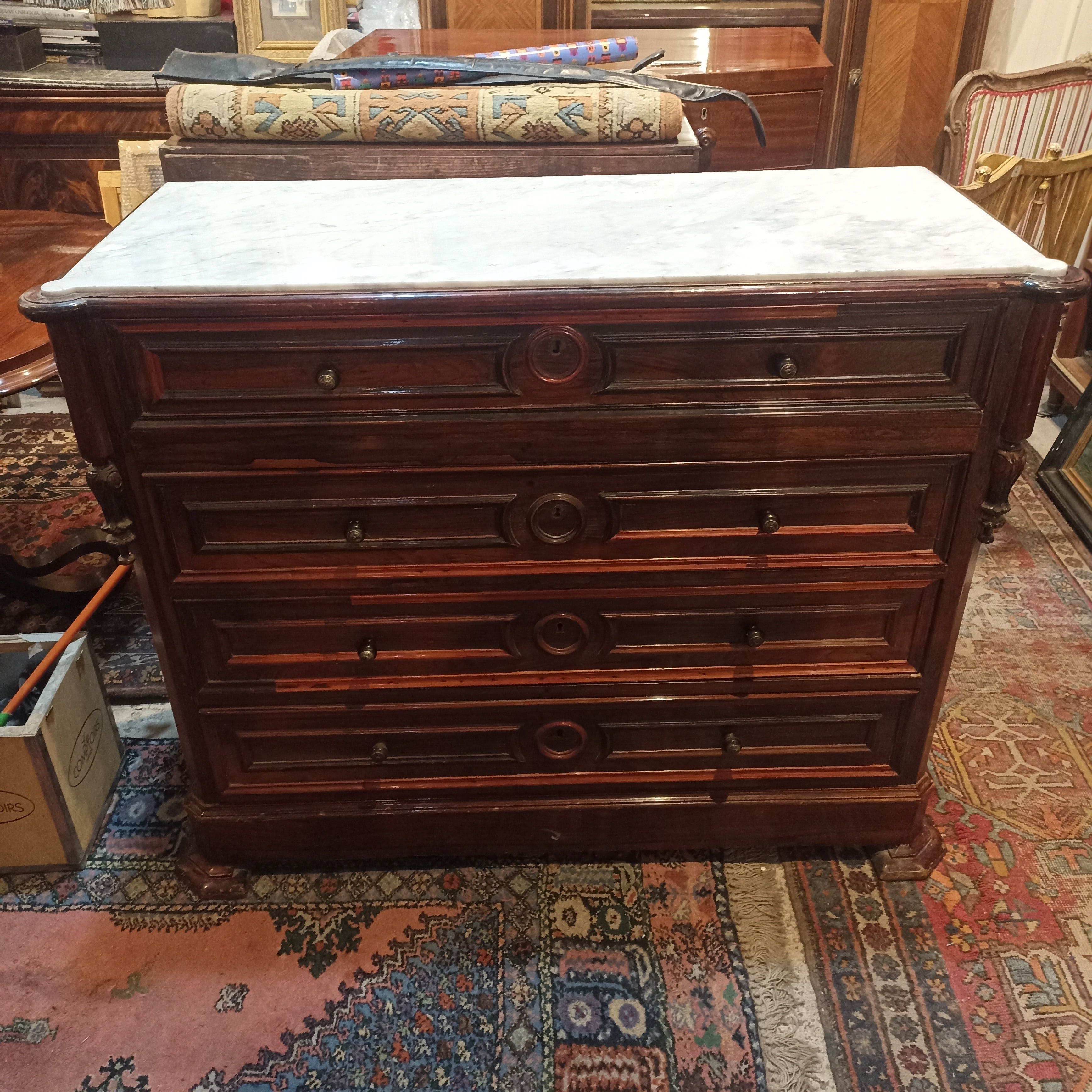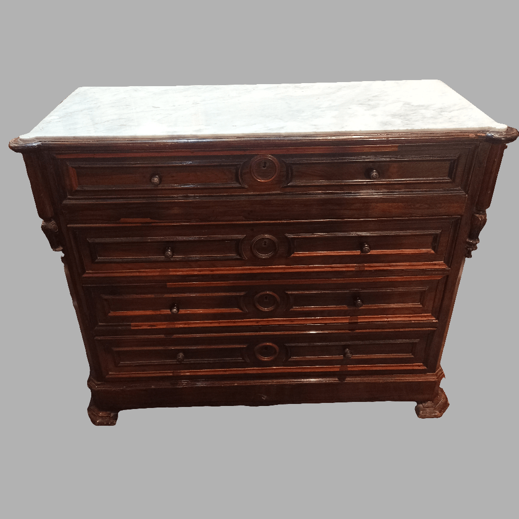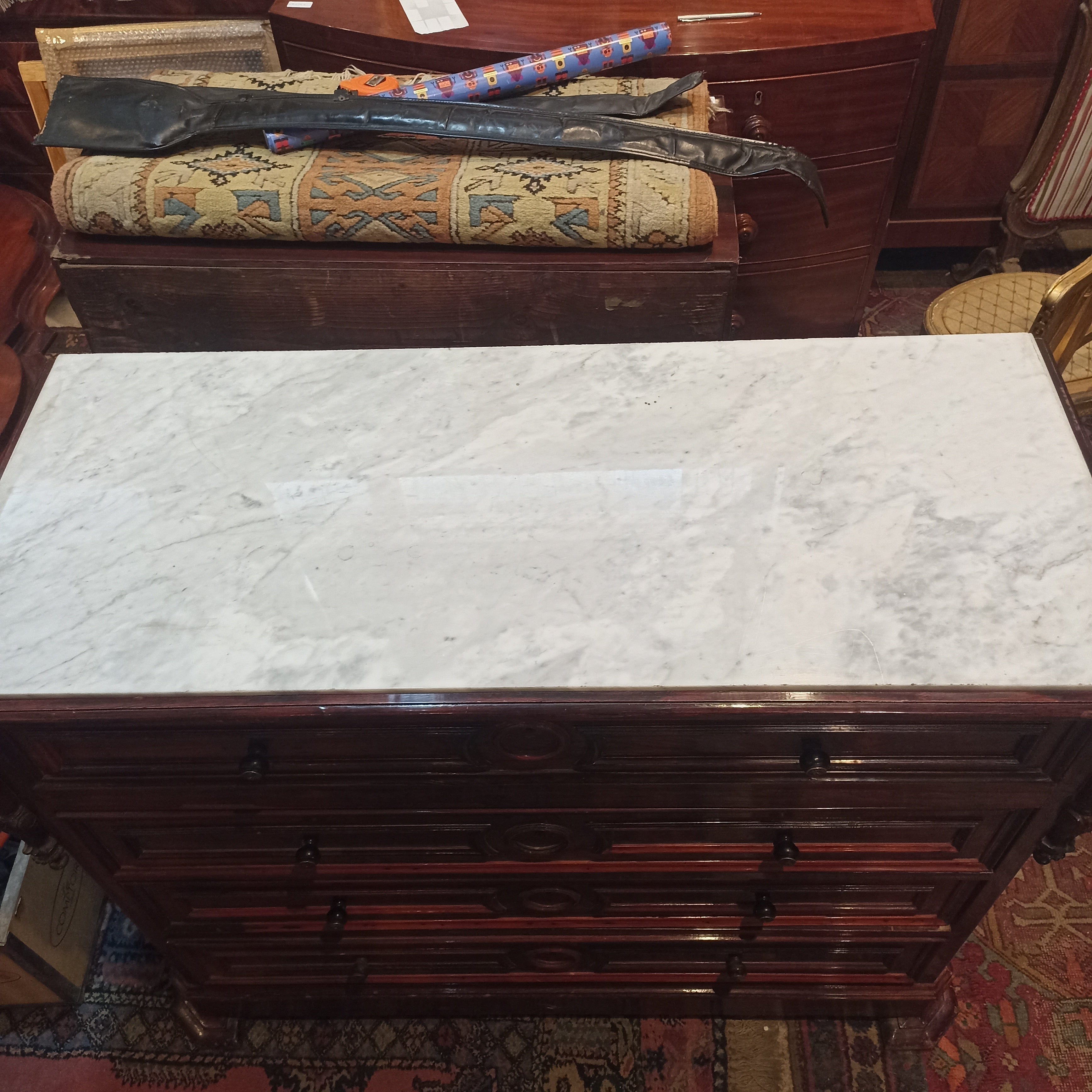 Elegante cómoda inglesa en caoba, con sobrios tallados y cubierta en mármol blanco.La pieza cuenta con 4 cajones amplios para almacenaje.