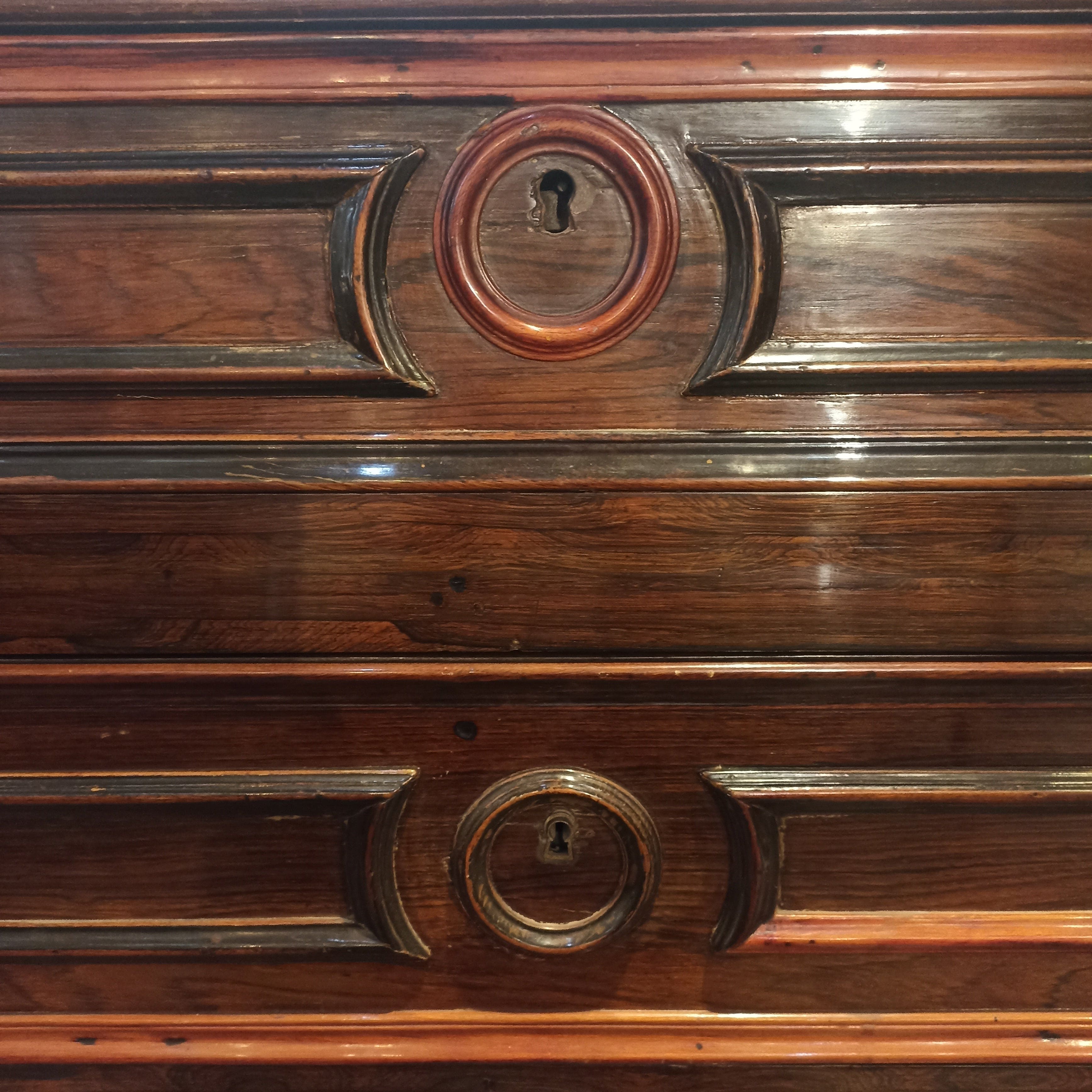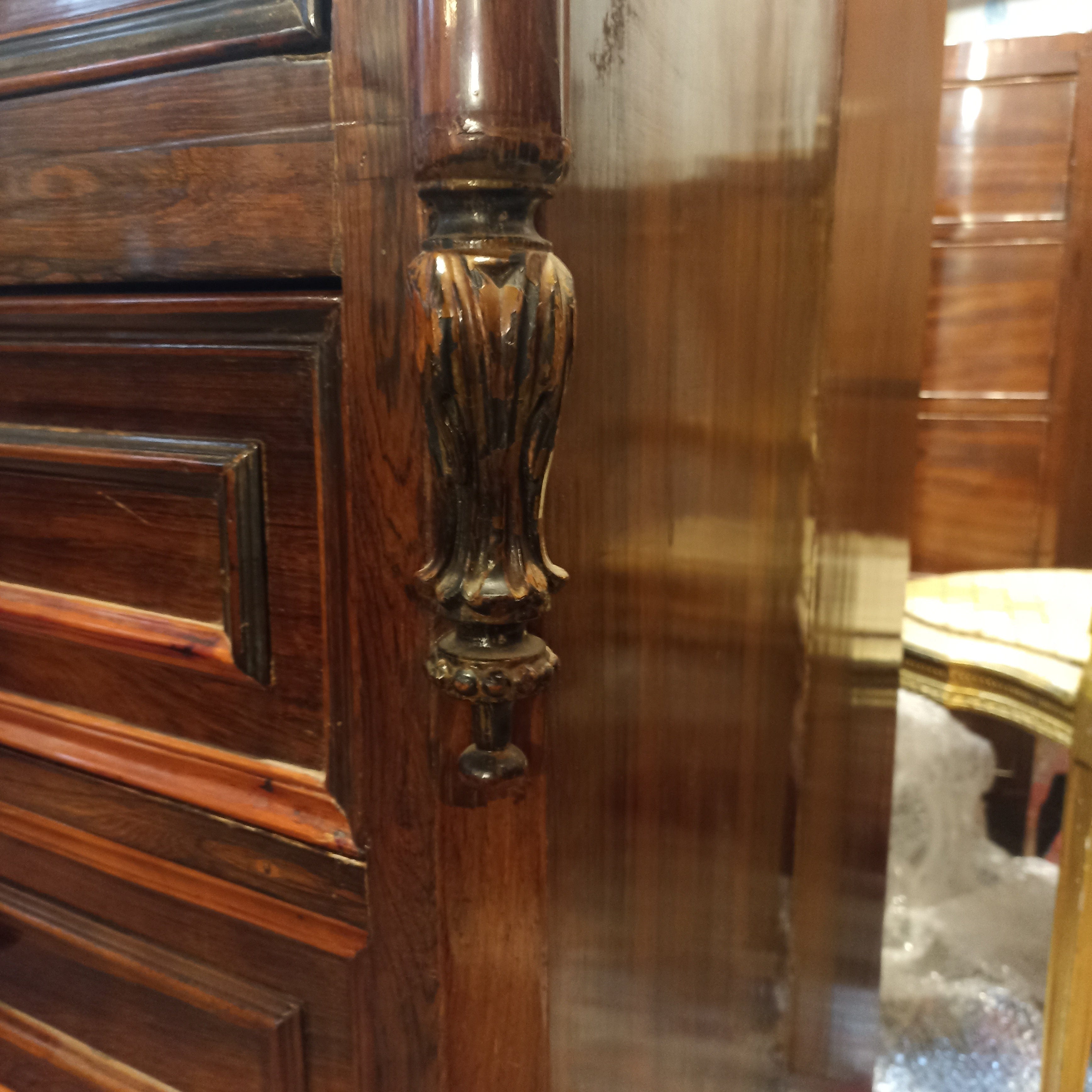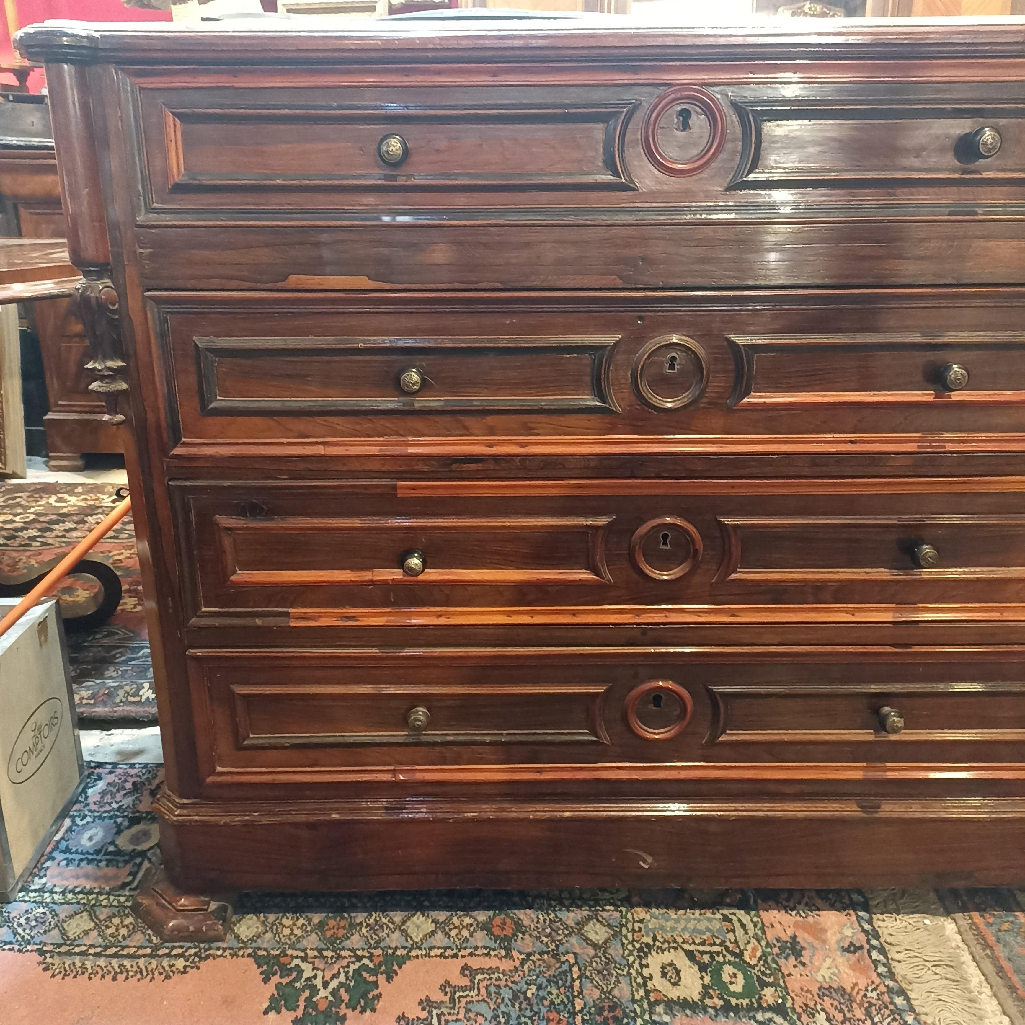 Elegante cómoda inglesa en caoba, con sobrios tallados y cubierta en mármol blanco.La pieza cuenta con 4 cajones amplios para almacenaje.