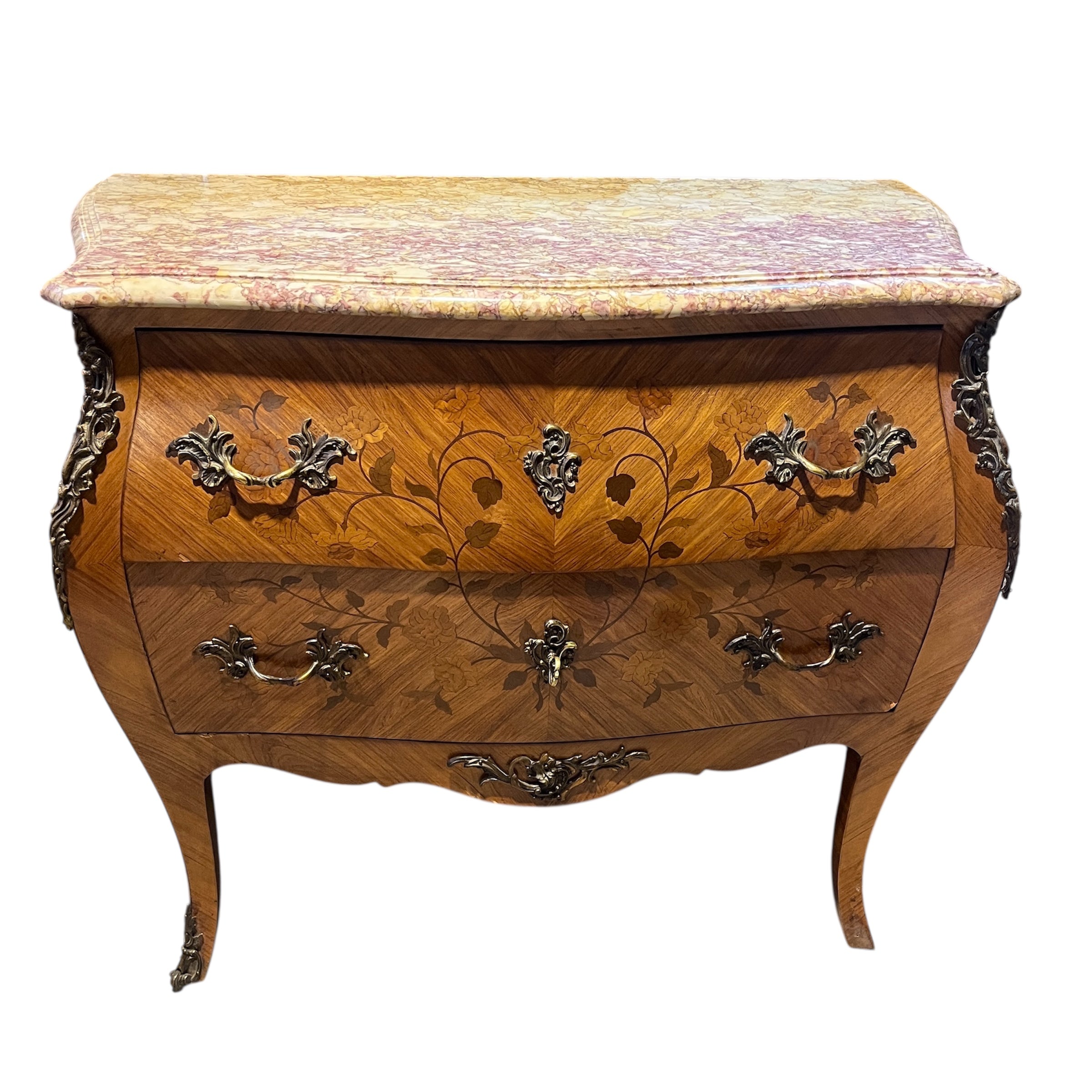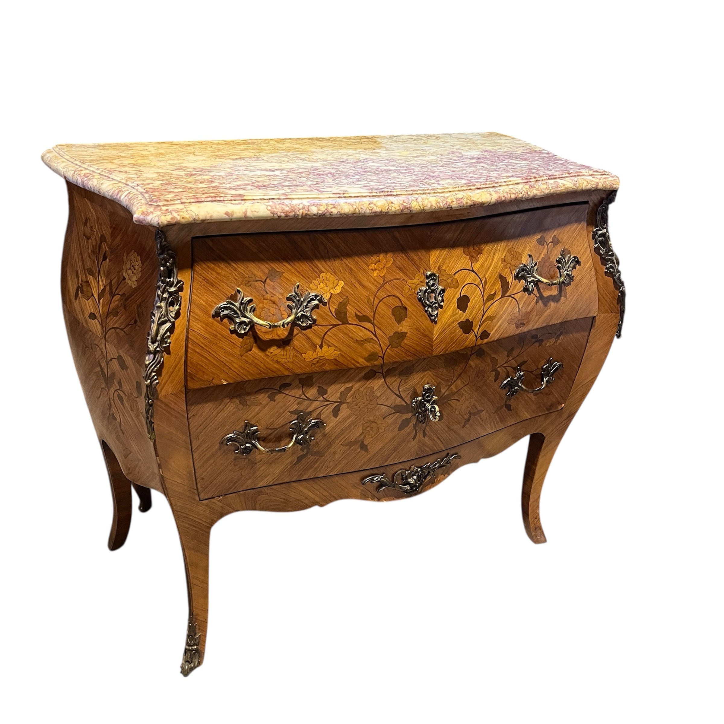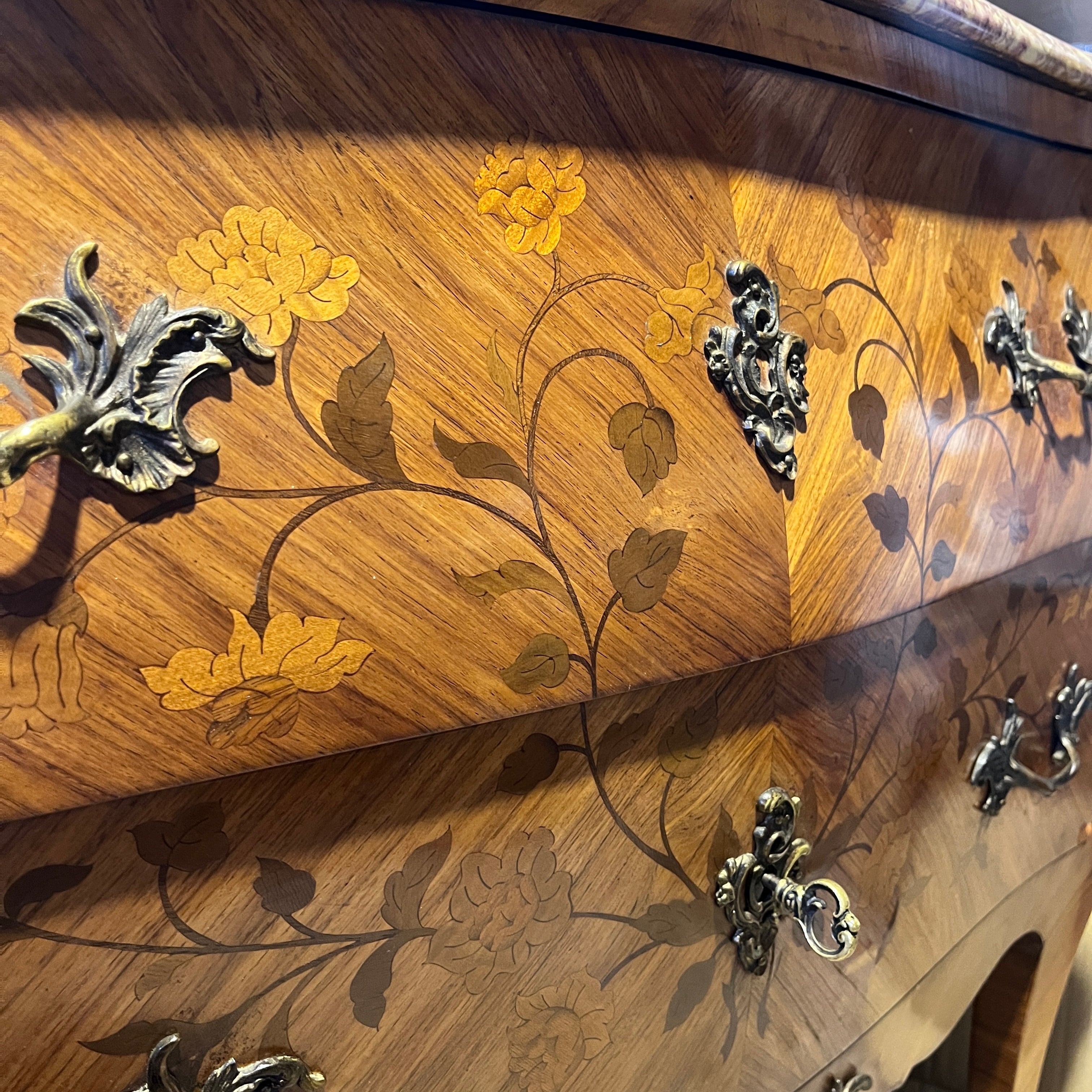 Cómoda de estilo Luis XV, elegantemente galbeada en todas sus caras. Presenta dos amplios cajones sin travesaño, decorados con delicada marquetería floral que resalta la fineza de su ejecución. Su cubierta de mármol amarillo aporta luminosidad y un contraste sofisticado, completando una pieza de gran armonía y refinamiento.