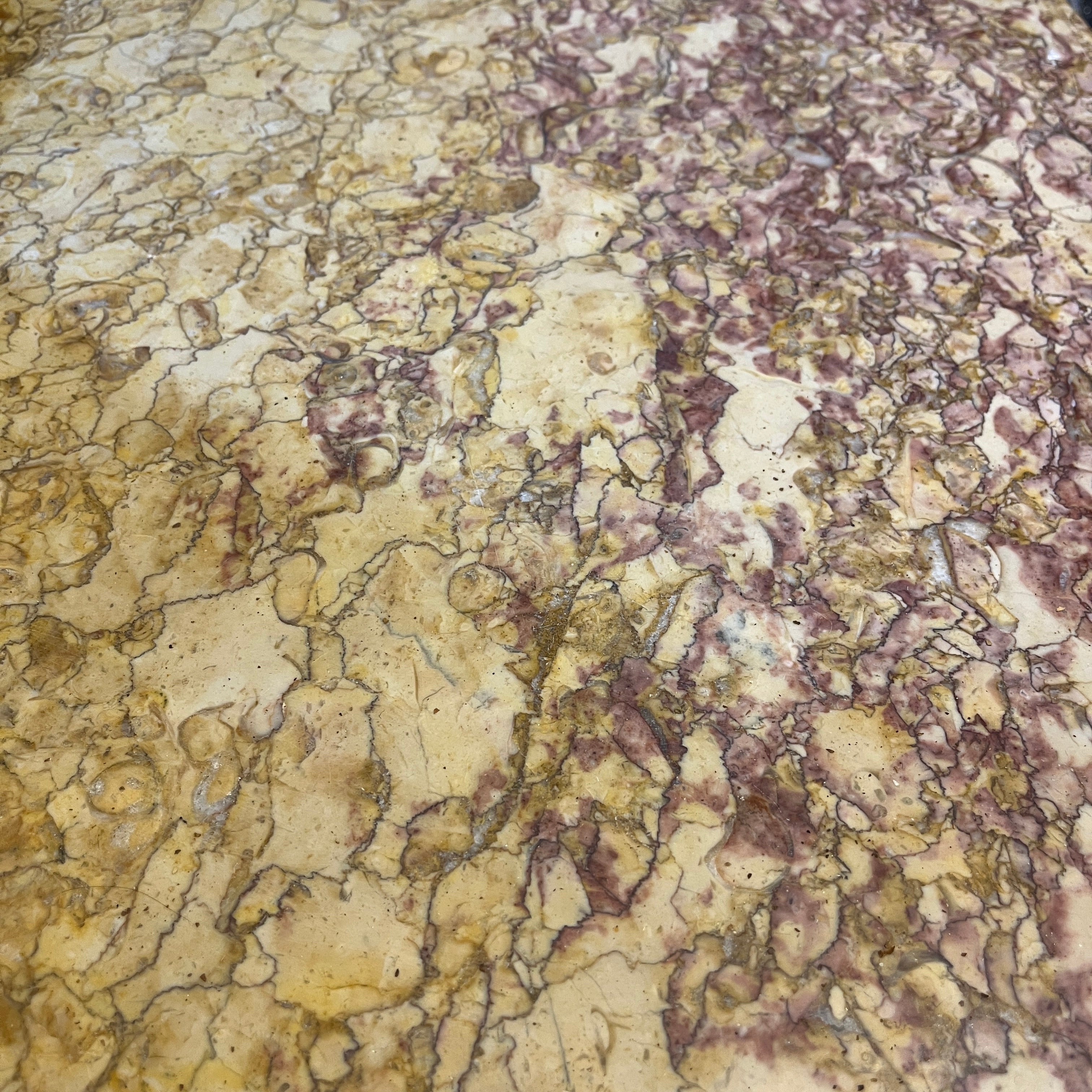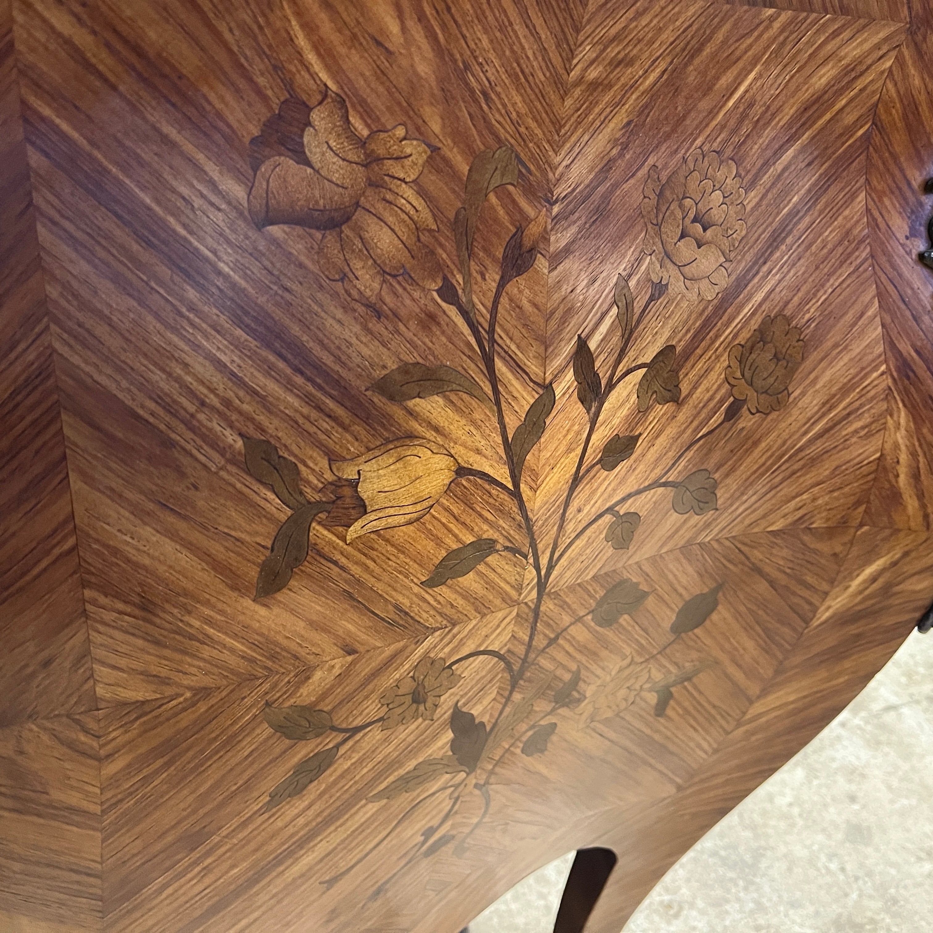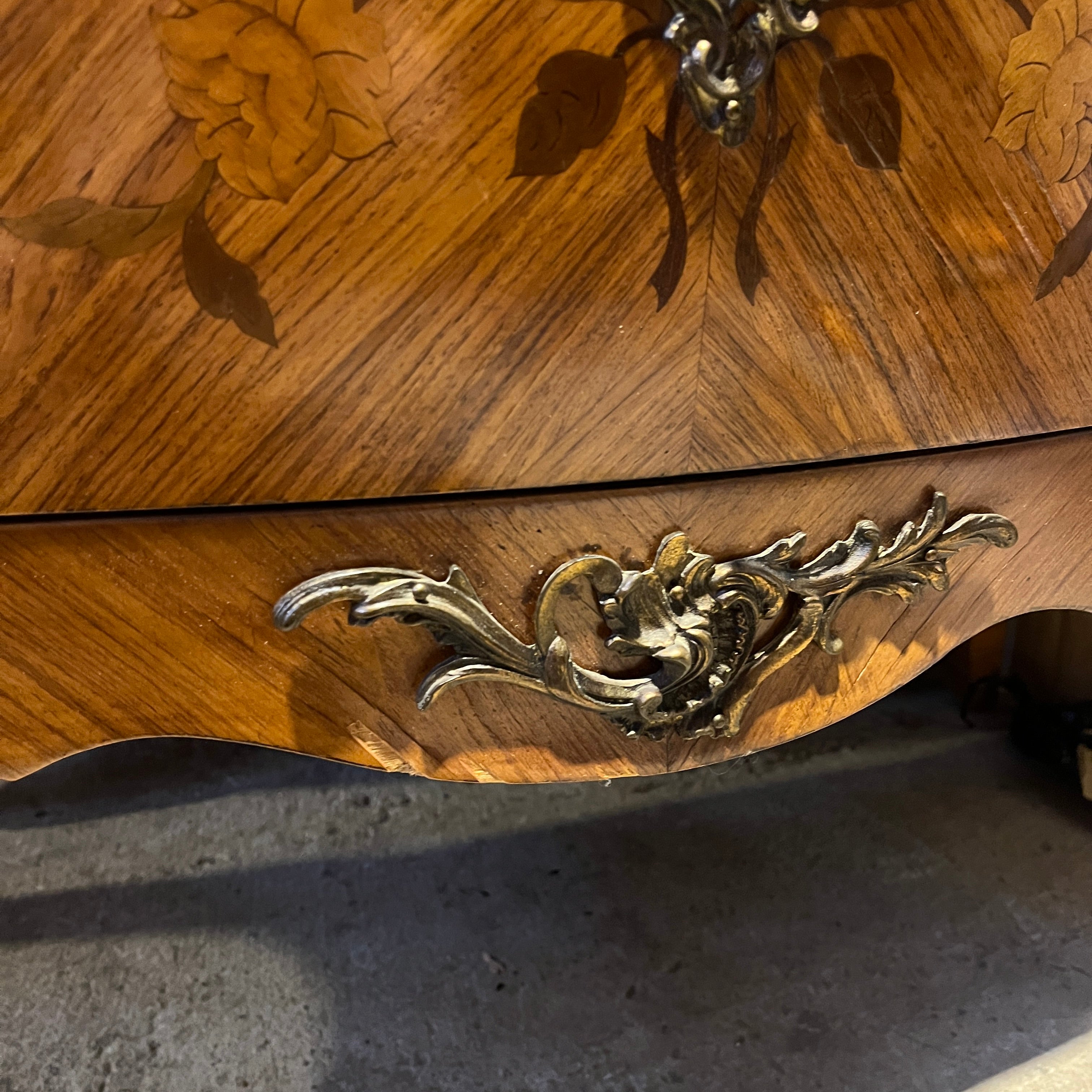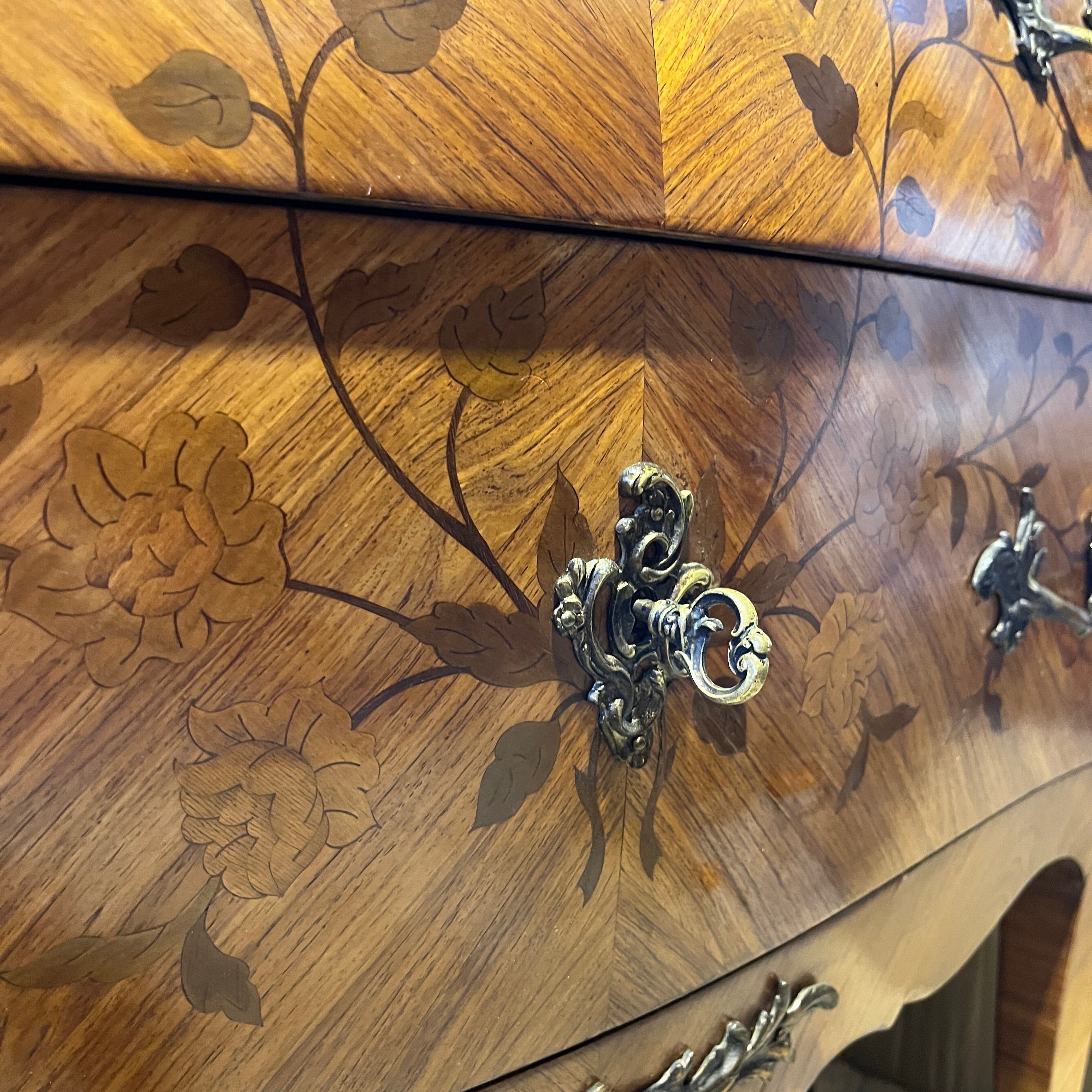 Cómoda de estilo Luis XV, elegantemente galbeada en todas sus caras. Presenta dos amplios cajones sin travesaño, decorados con delicada marquetería floral que resalta la fineza de su ejecución. Su cubierta de mármol amarillo aporta luminosidad y un contraste sofisticado, completando una pieza de gran armonía y refinamiento.
