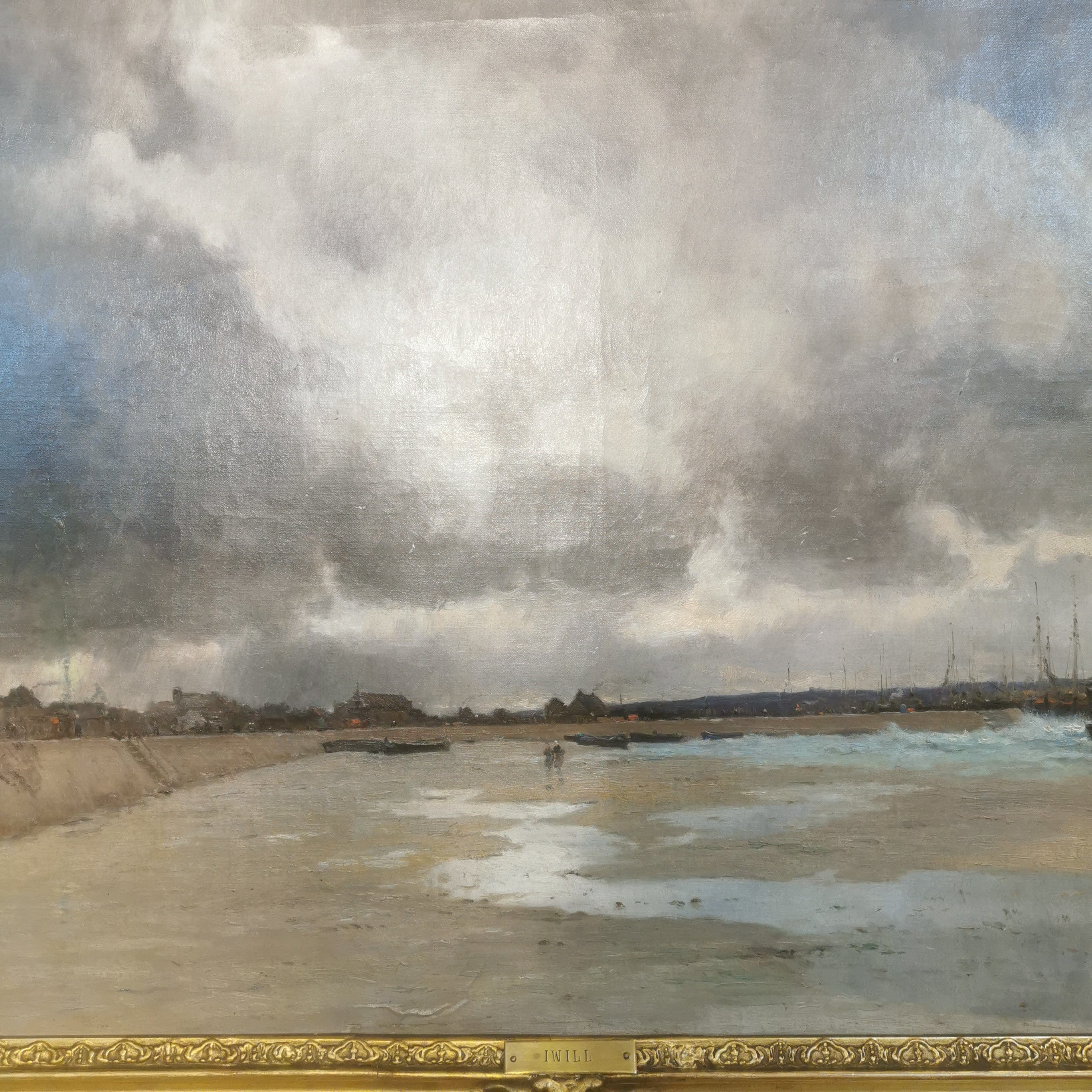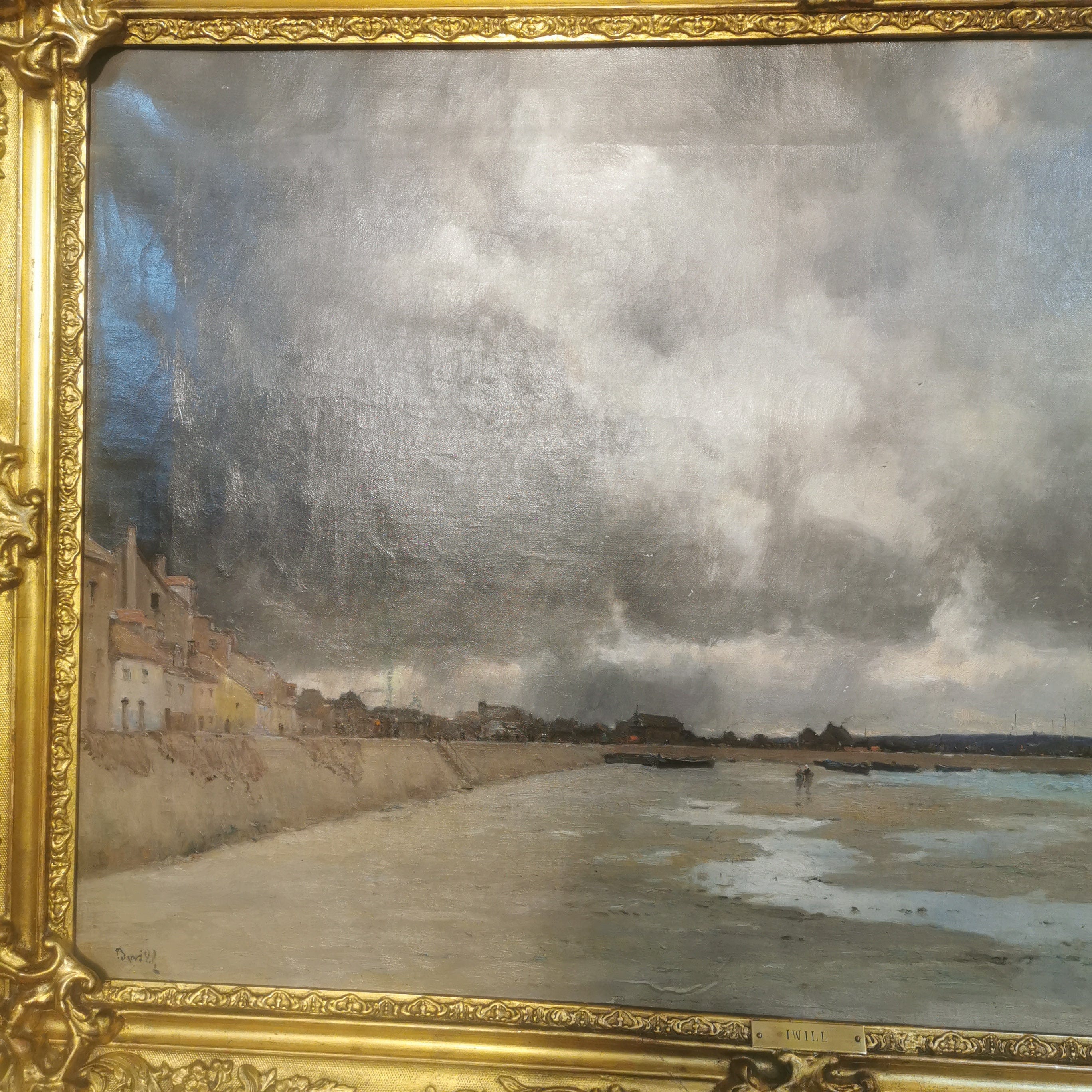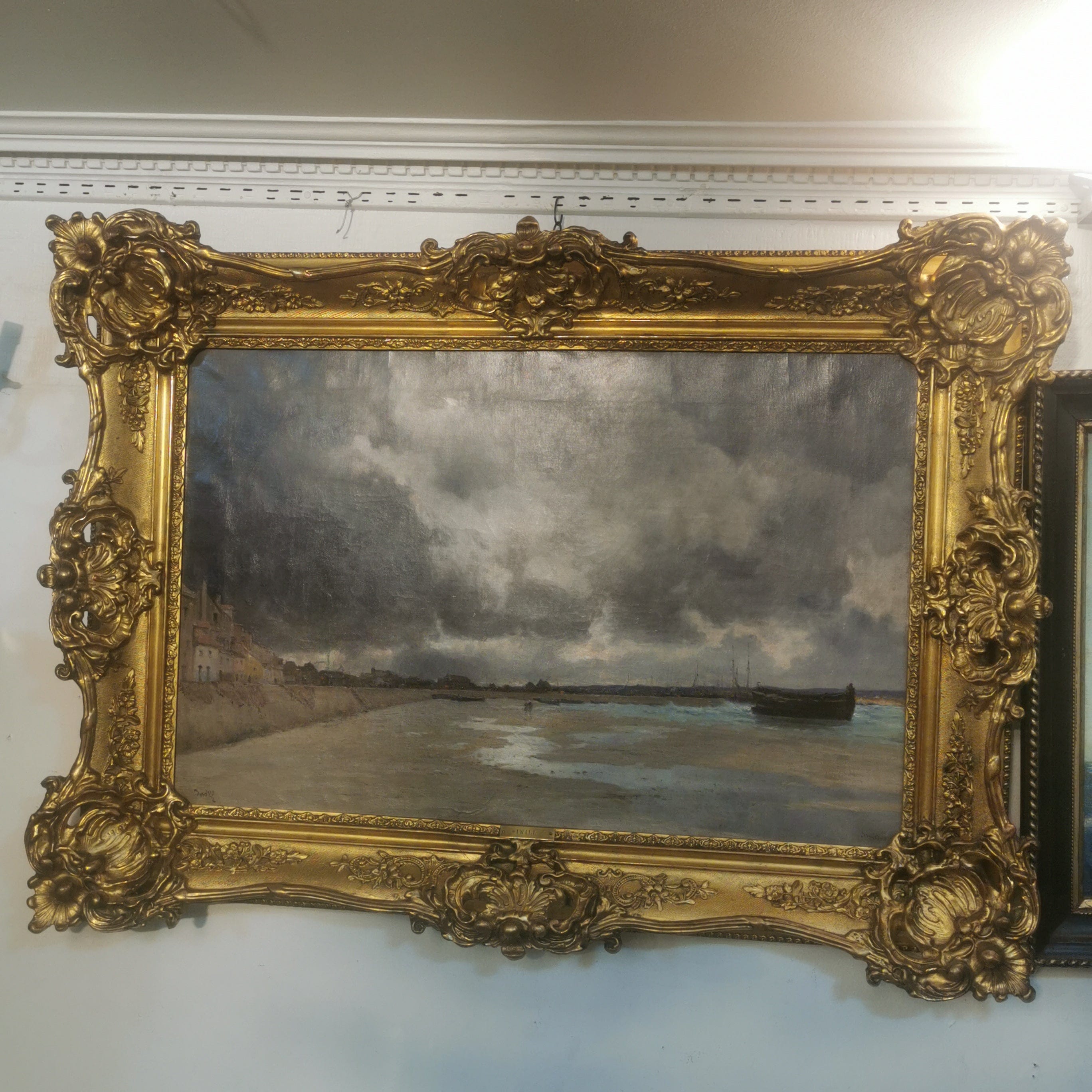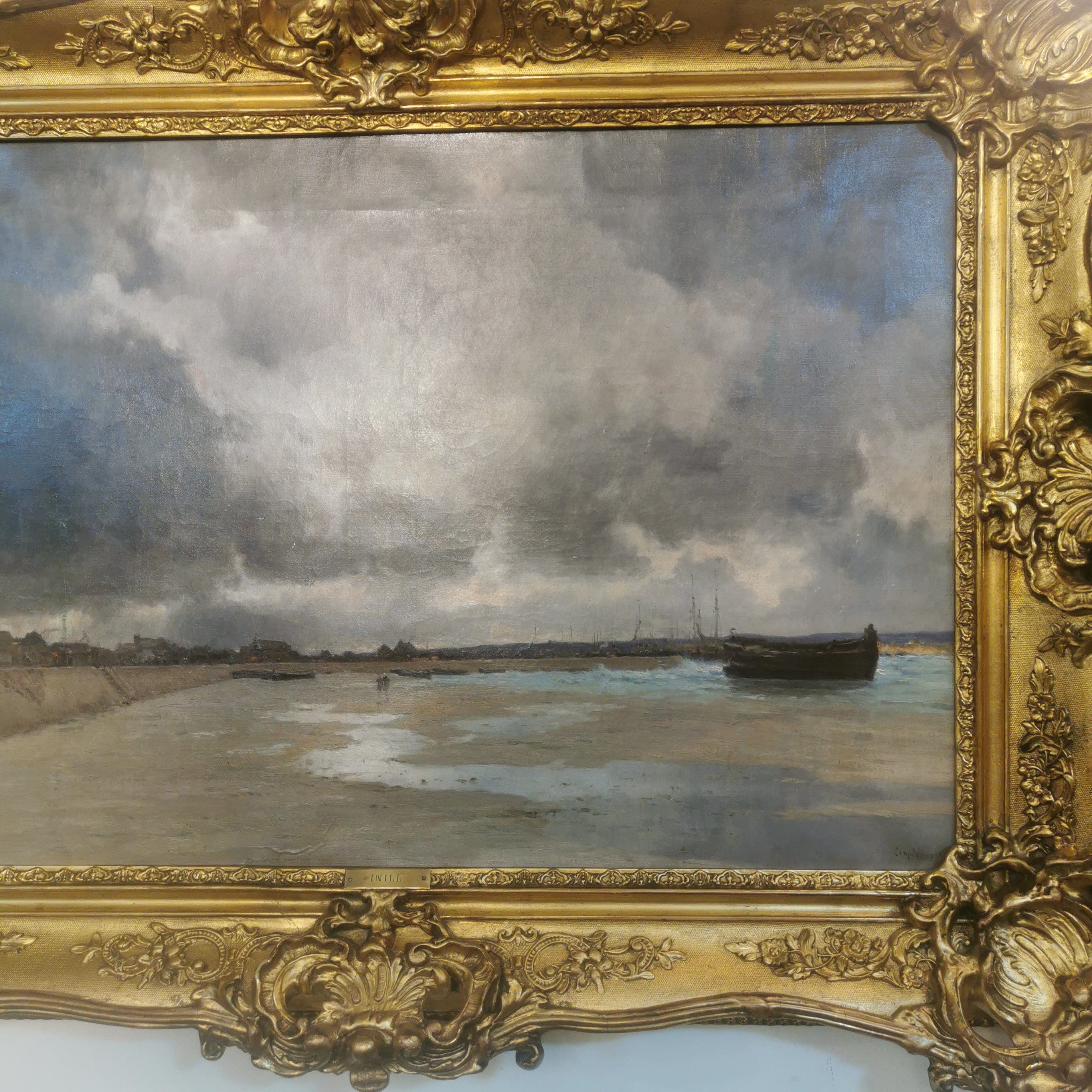 Bellísima obra del pintor Francés Marié Joseph León IWill (1850-1923). En la obra se pueden apreciar unos botes a la orilla, regresando de la pesca en un día nublado. El cuadro está enmarcado con un imponente marco dorado tallado.