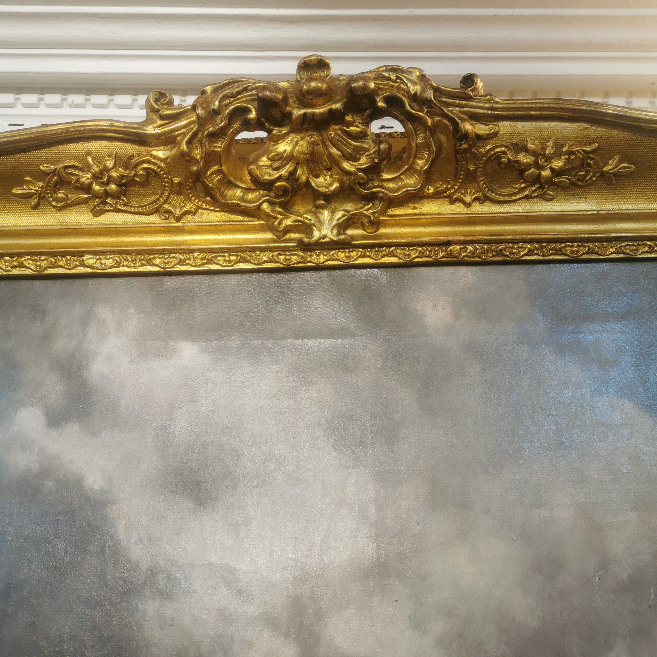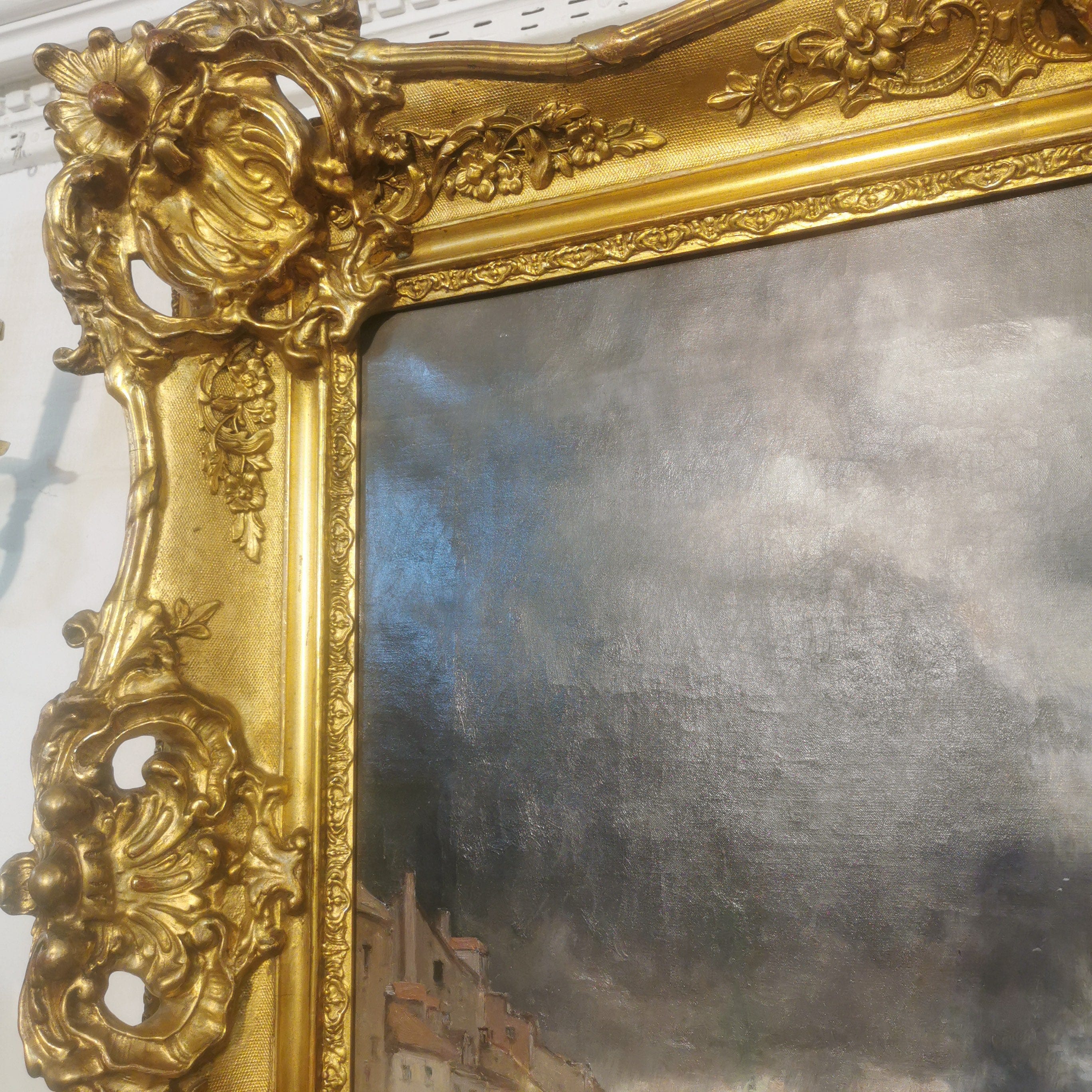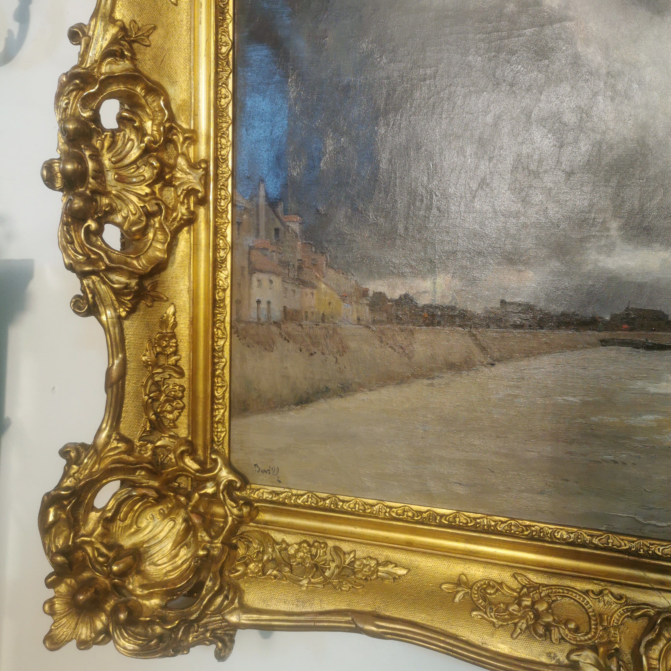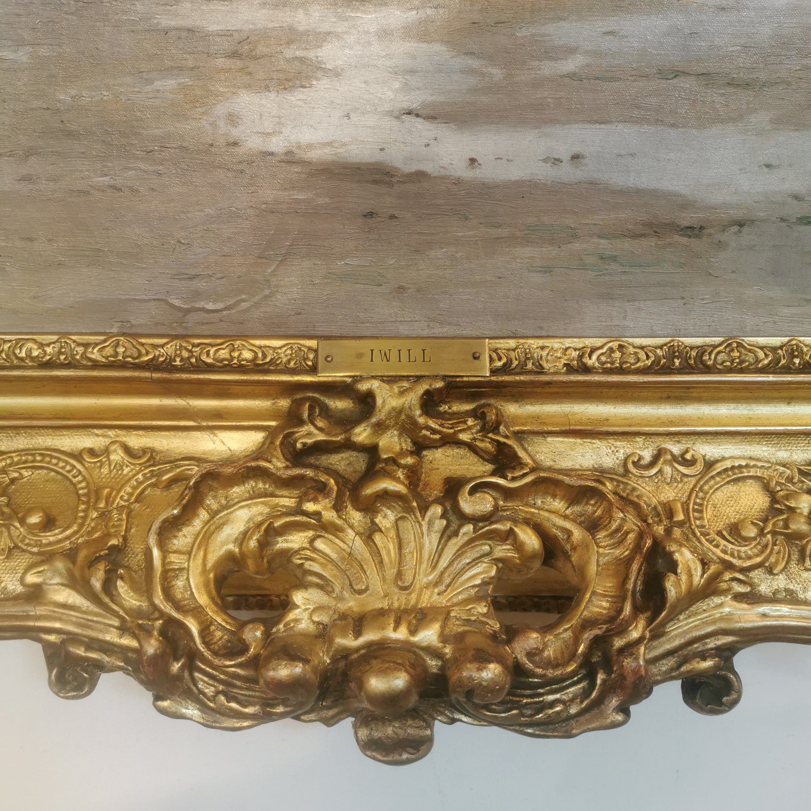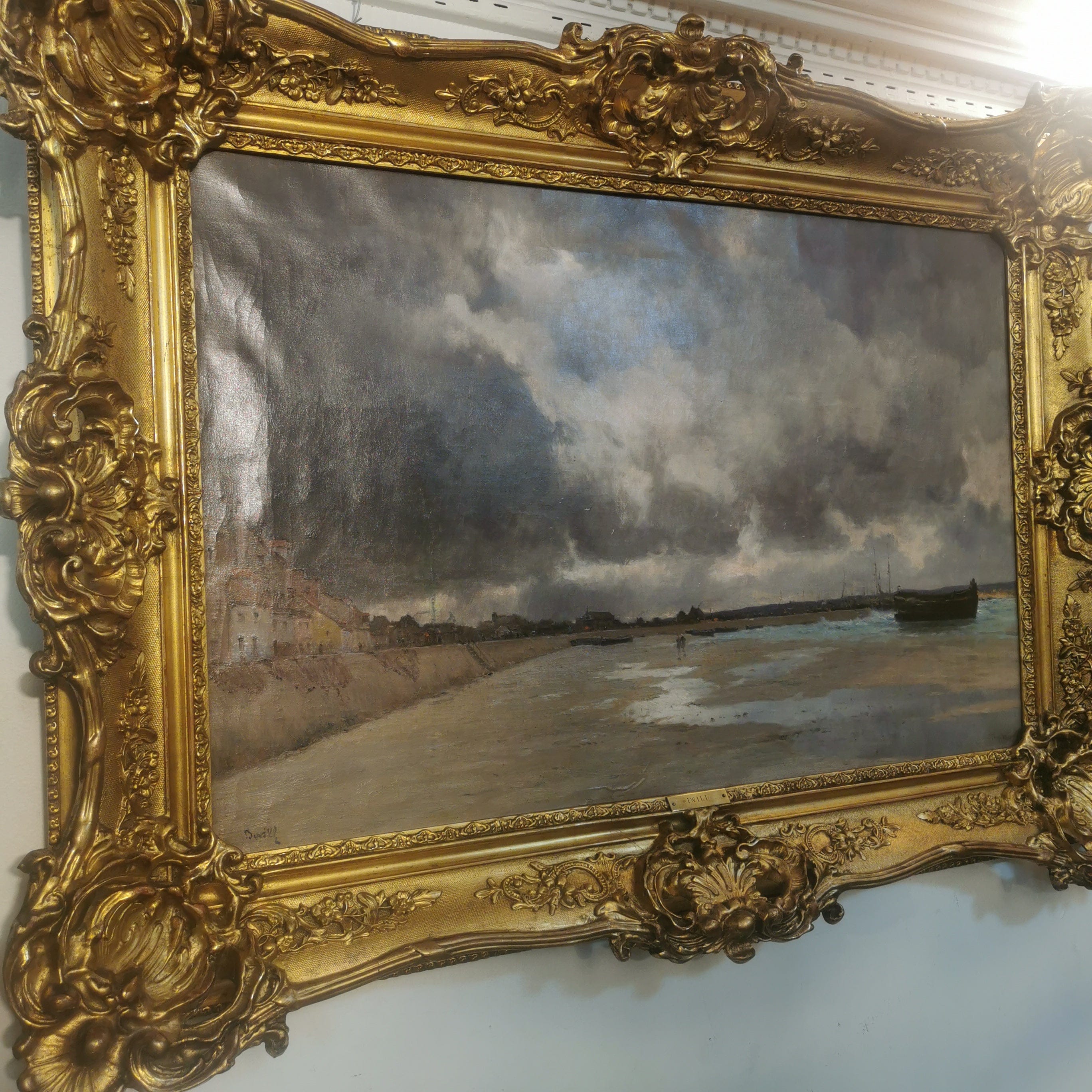 Bellísima obra del pintor Francés Marié Joseph León IWill (1850-1923). En la obra se pueden apreciar unos botes a la orilla, regresando de la pesca en un día nublado. El cuadro está enmarcado con un imponente marco dorado tallado.