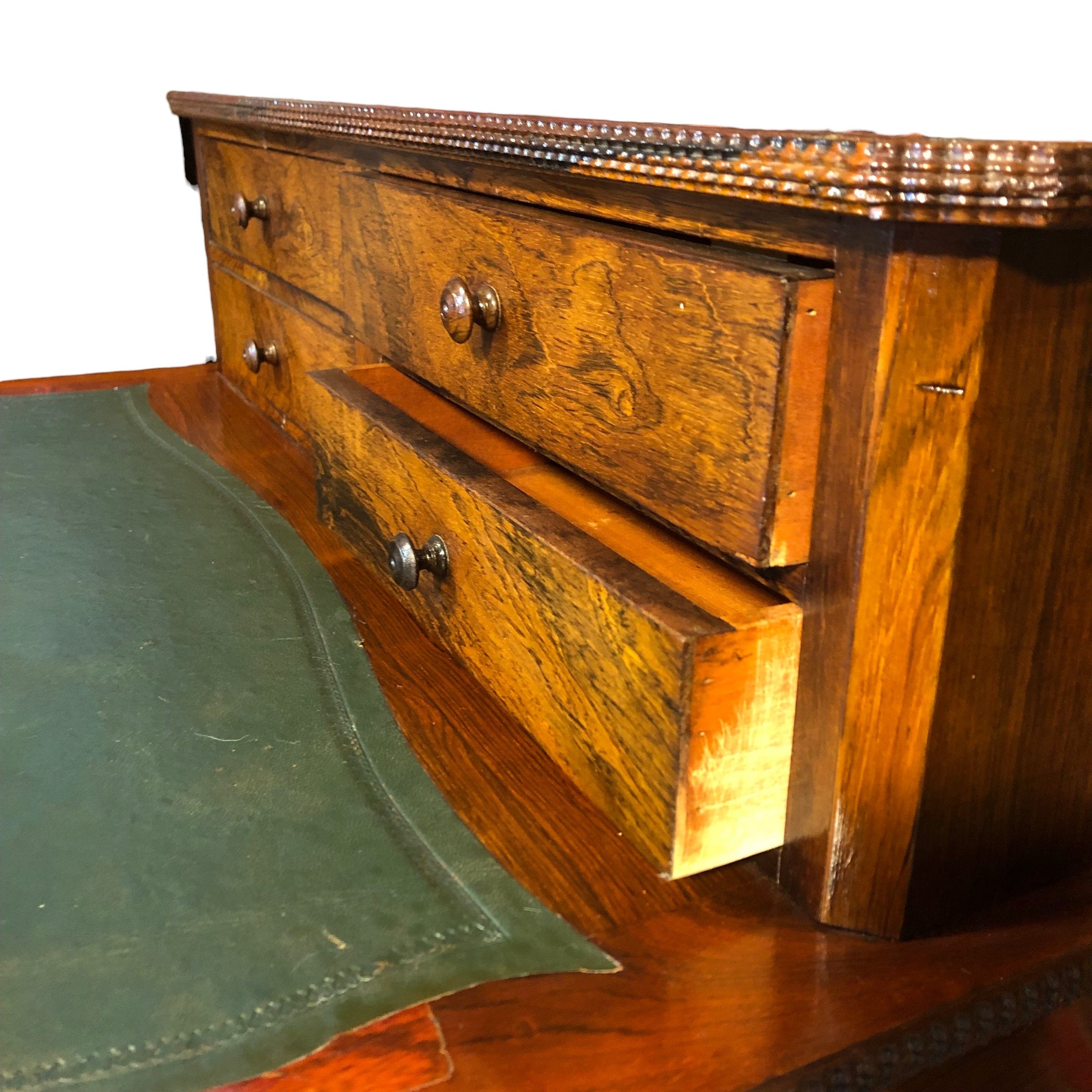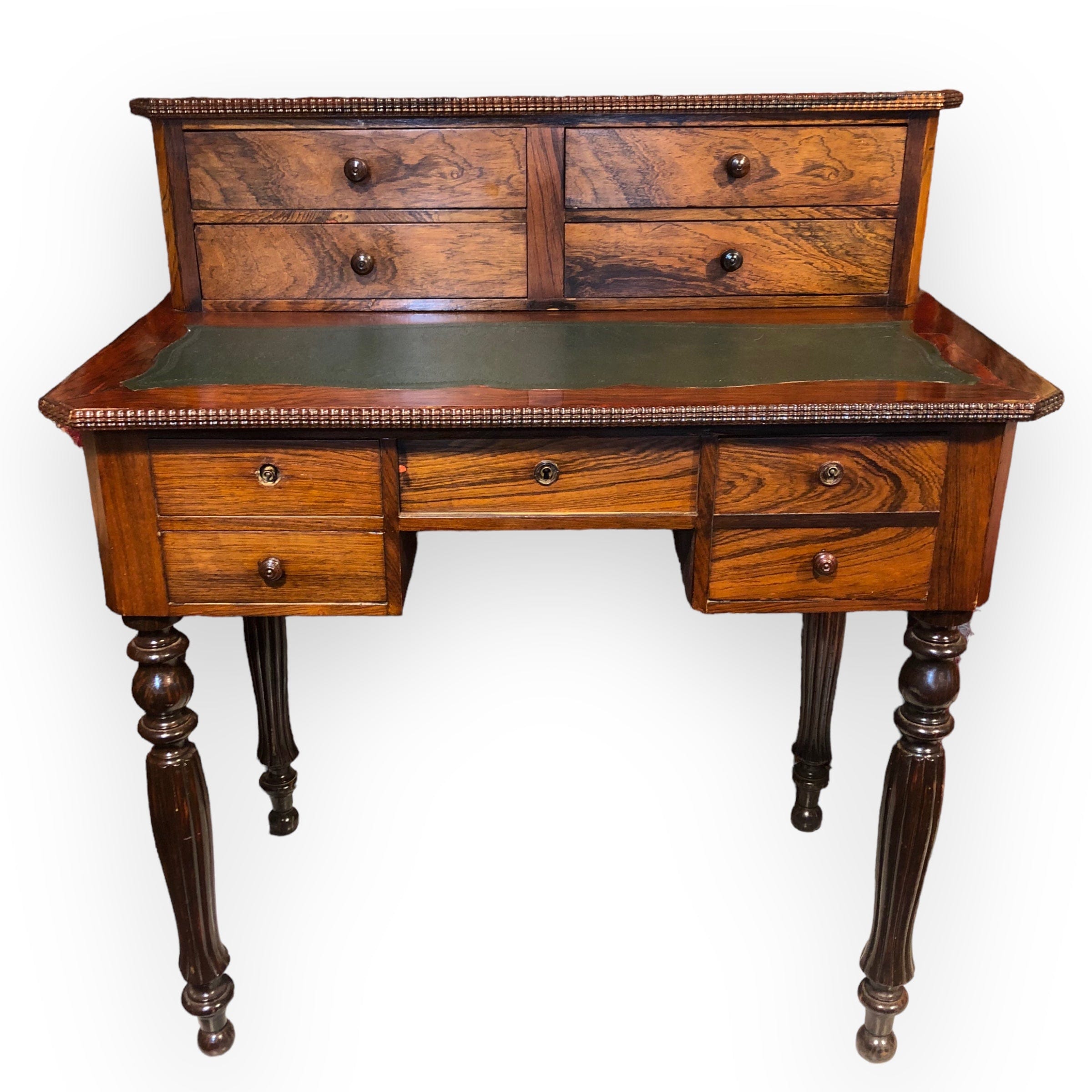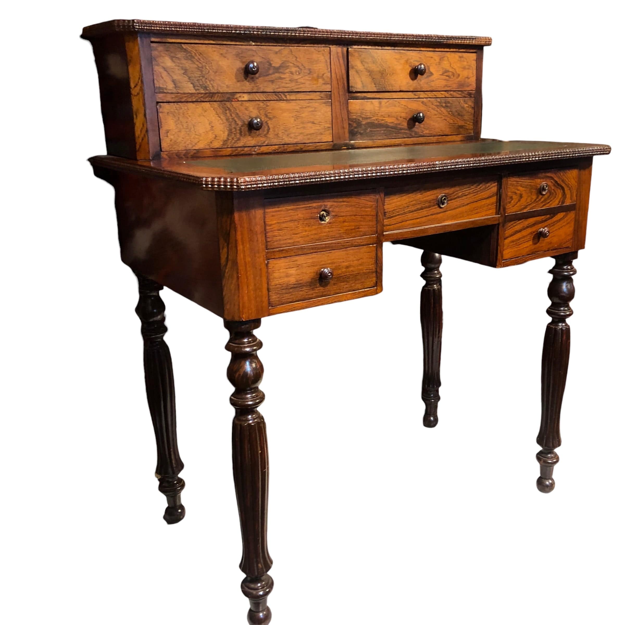 De estilo Louis Philippe, escritorio hecho en madera de jacarandá con 4 cajones superiores y 3 inferiores. Cubierta de cuero original.