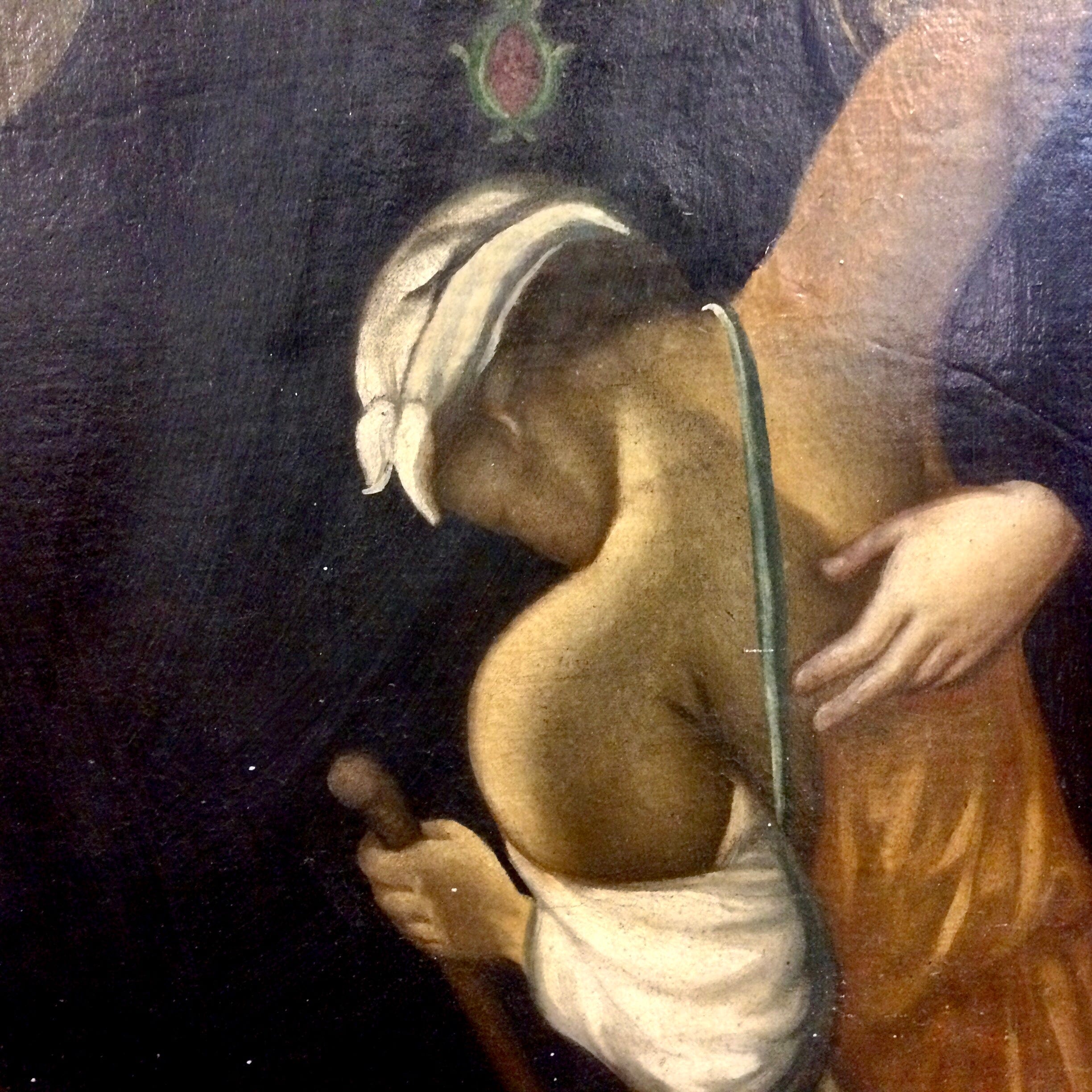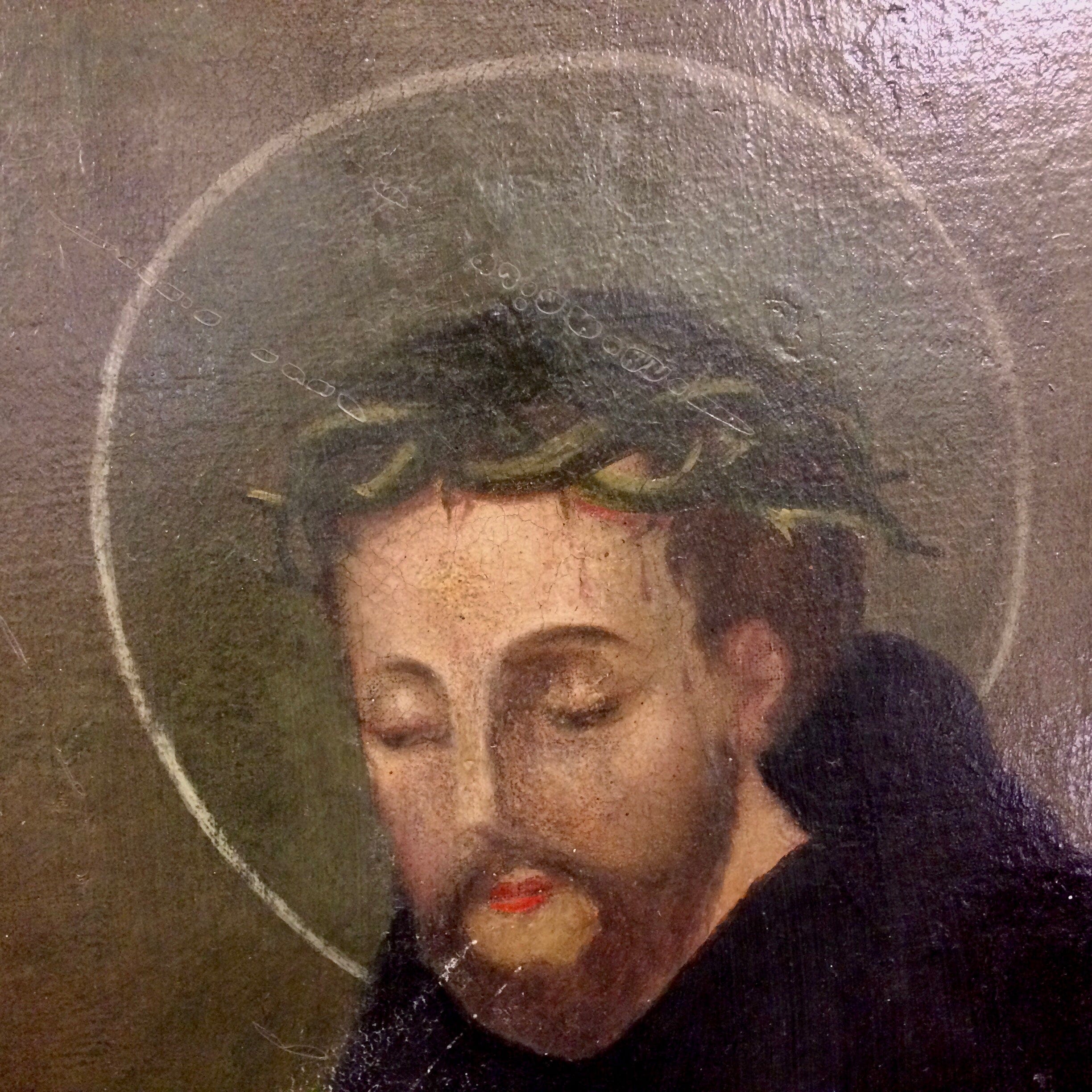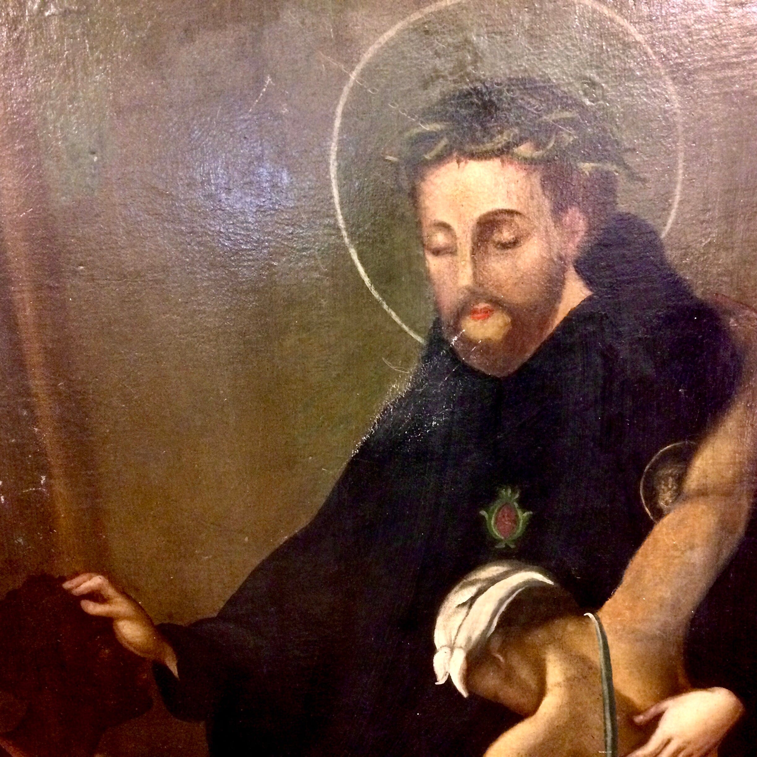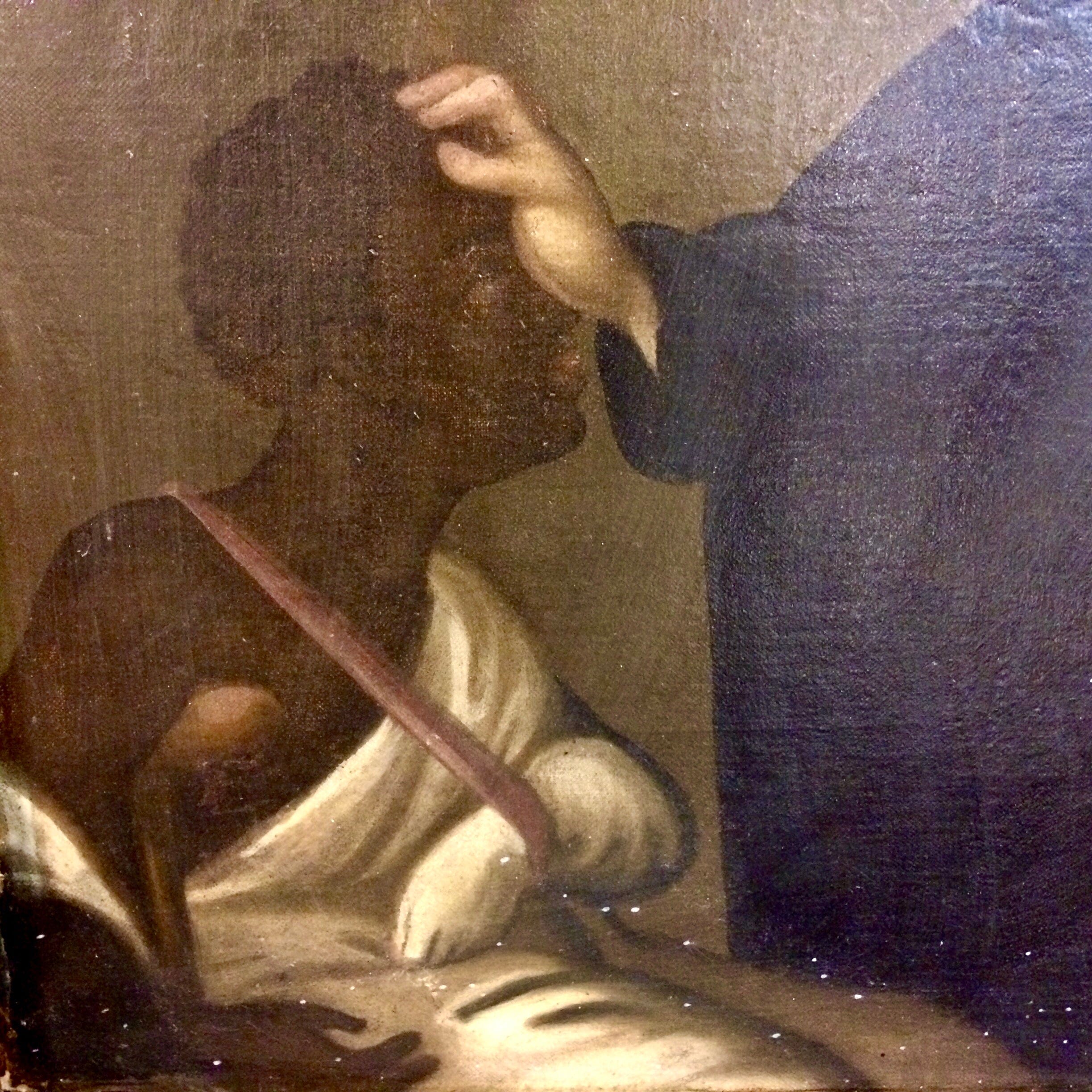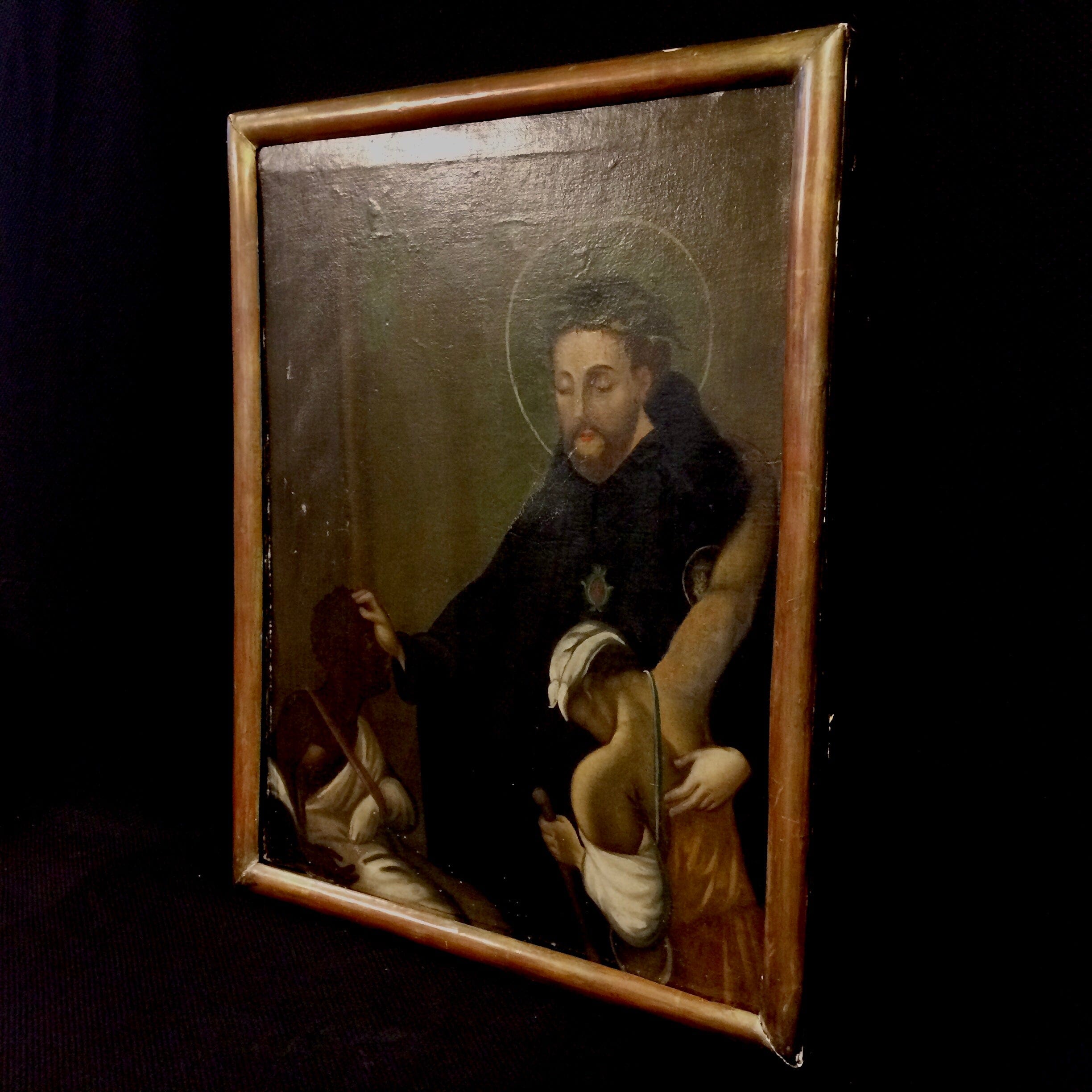 Pintura religiosa antigua de origen cuzqueño, sin firma en óleo sobre tela (re entelado), representando a San Geronimo sanando a leprosos.