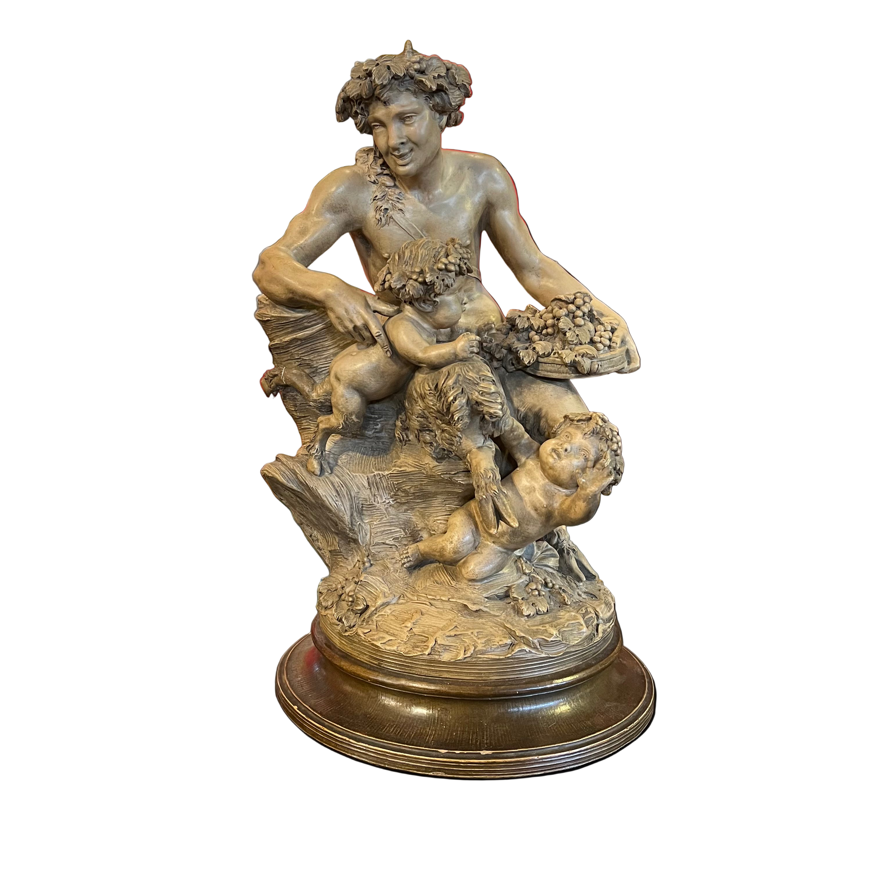 Finísima terracota patinada representando escena del Dios Baco rodeado de dos sátiros jovenes. Firmada 'GC', en el estilo Clodion. Francia.