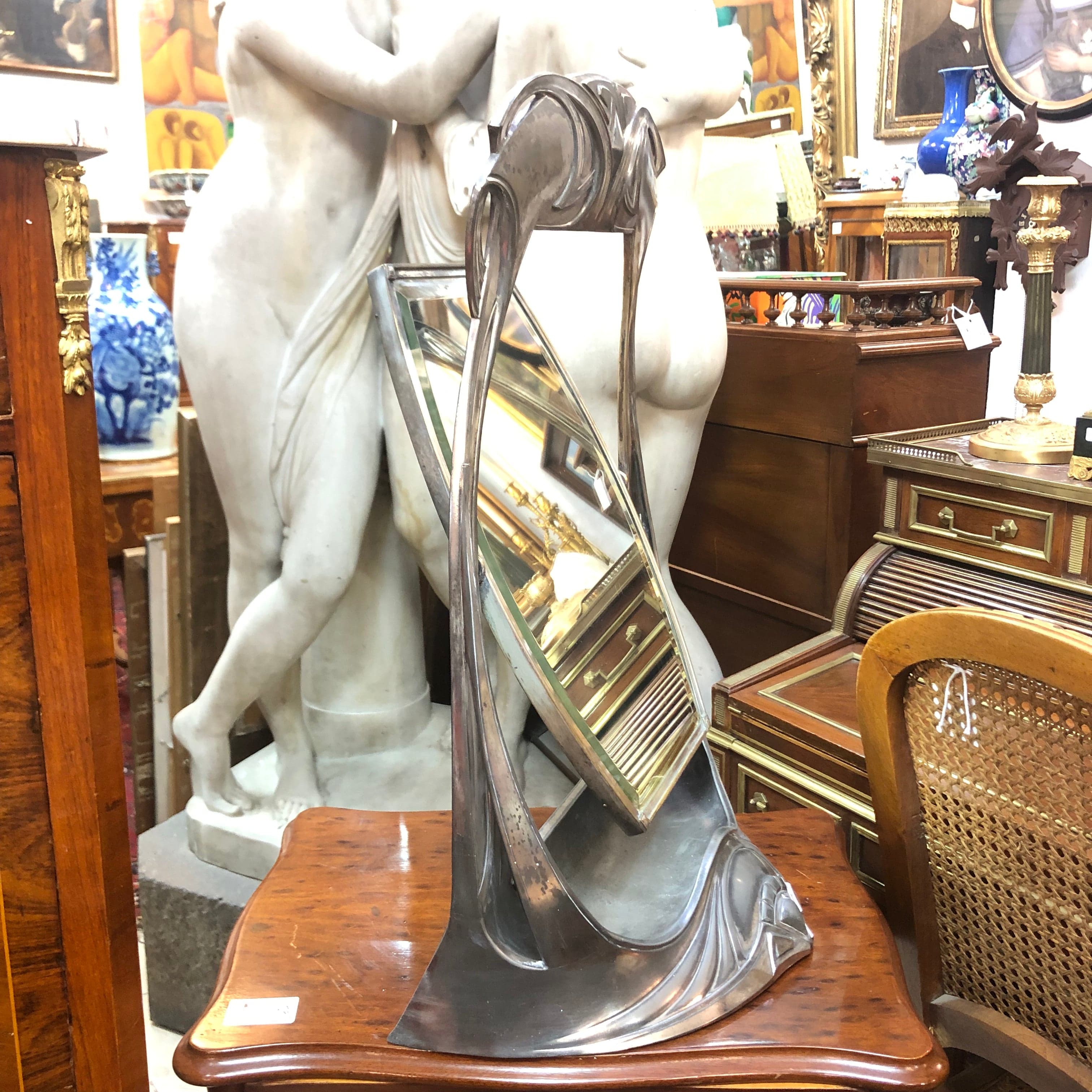 Hermoso espejo de mesa, estilo Art-Nouveau siglo XIX, de la prestigiosa marca alemana WMF bañado en plata.