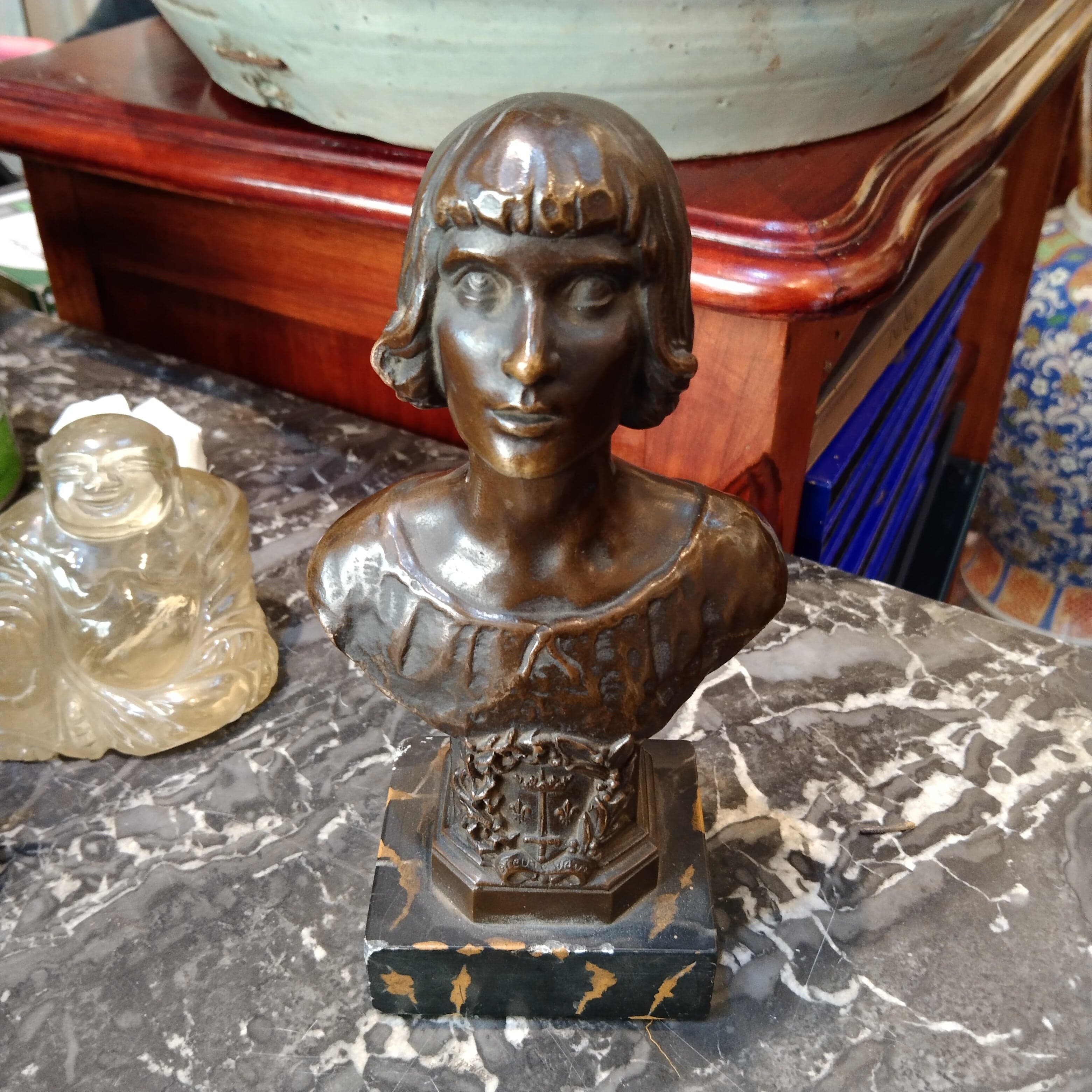 Elegante figura de un busto en bronce, con base de mármol oscuro. La pieza está inscrita en su parte posterior.