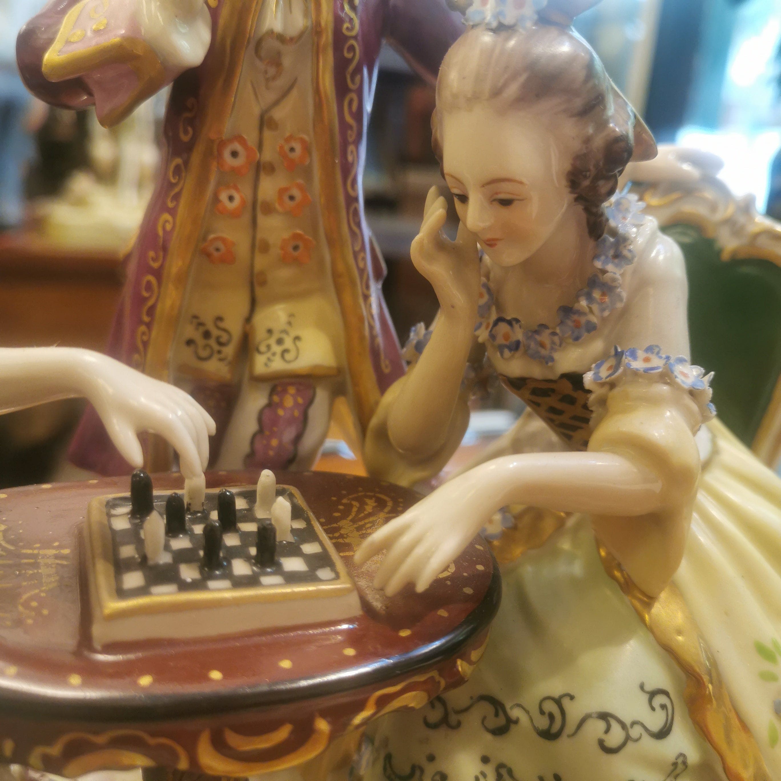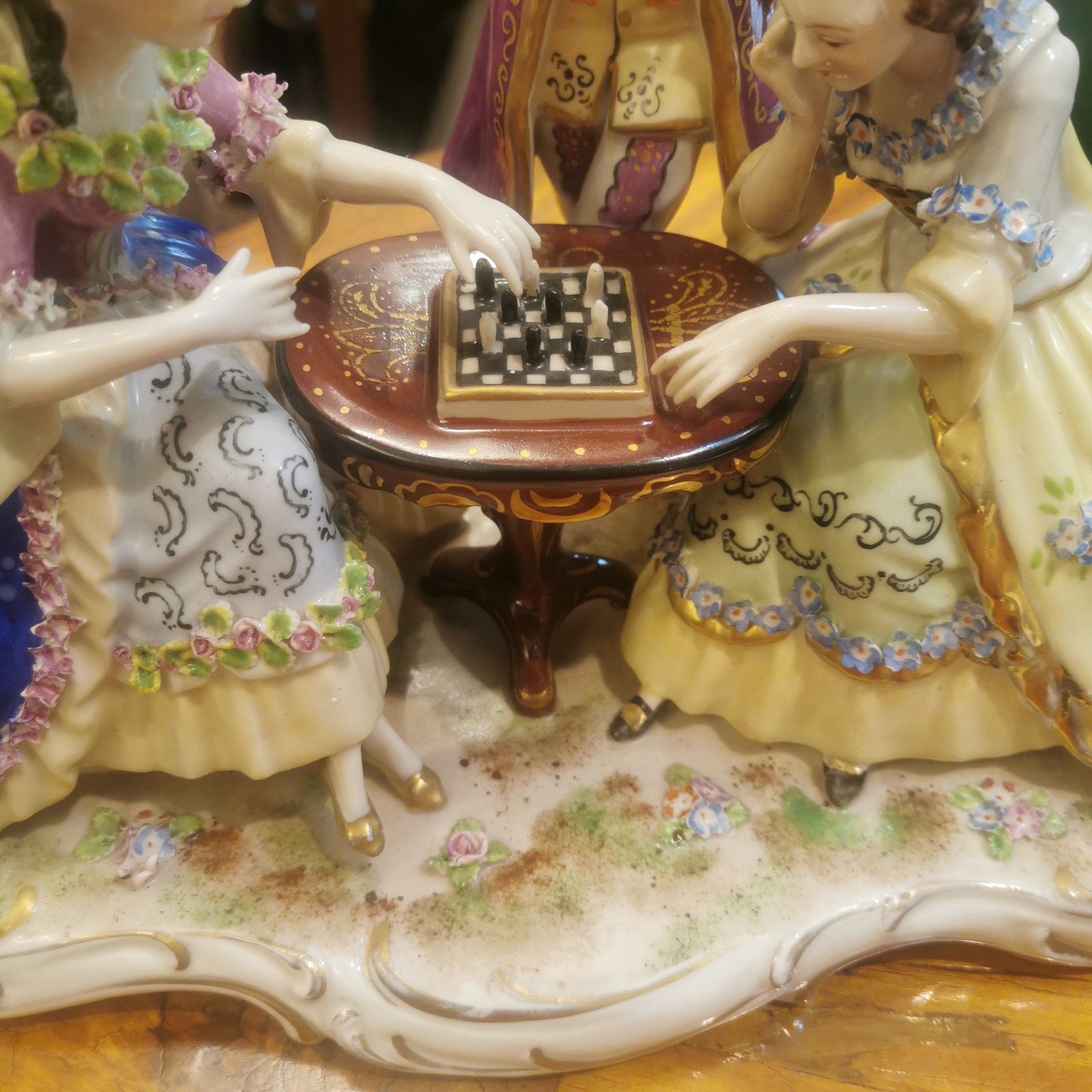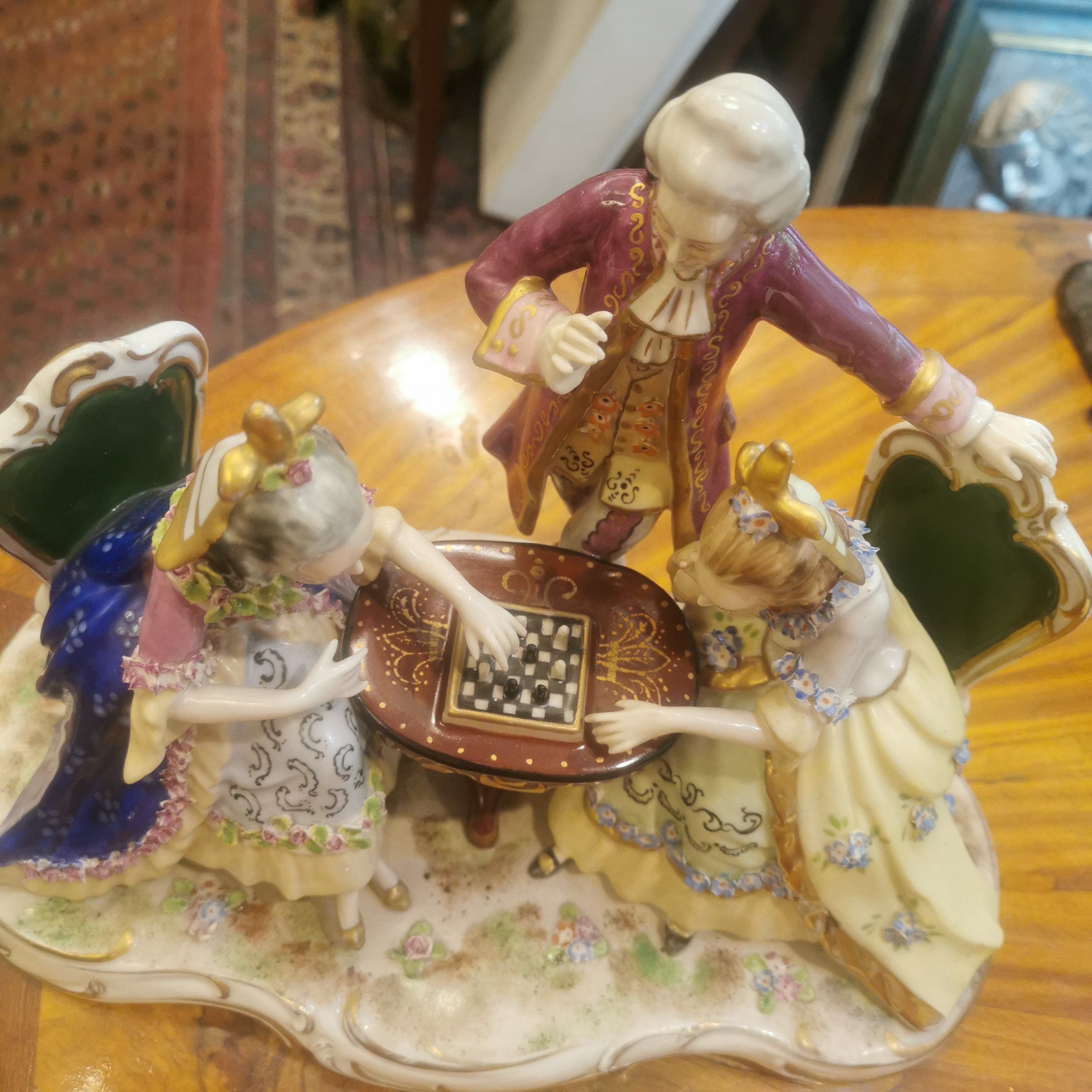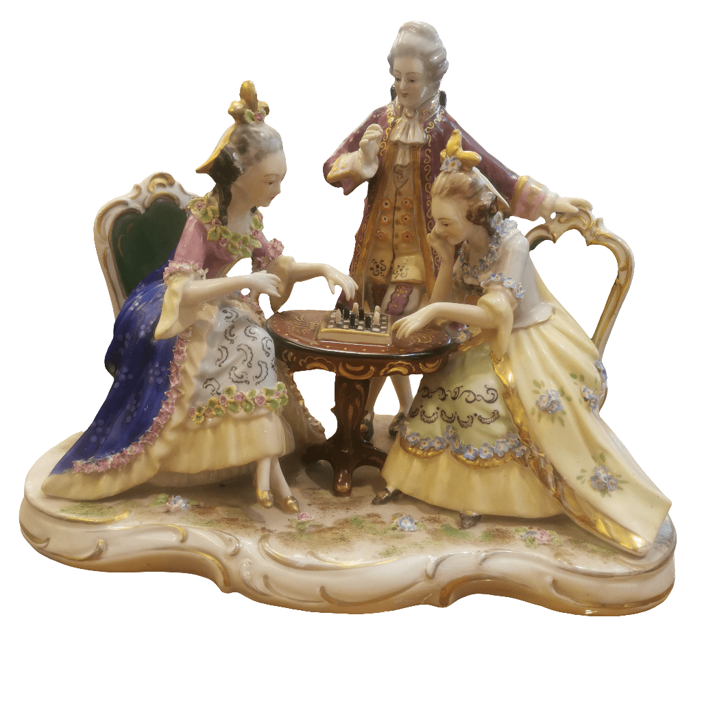 Hermosa figura de porcelana pintada a mano de origen francés Saxen, representando una escena de salón del siglo XVIII. En ella se puede apreciar una lúdica y coqueta escena de dos mujeres jugando ajedrez y hombre de pie observando.