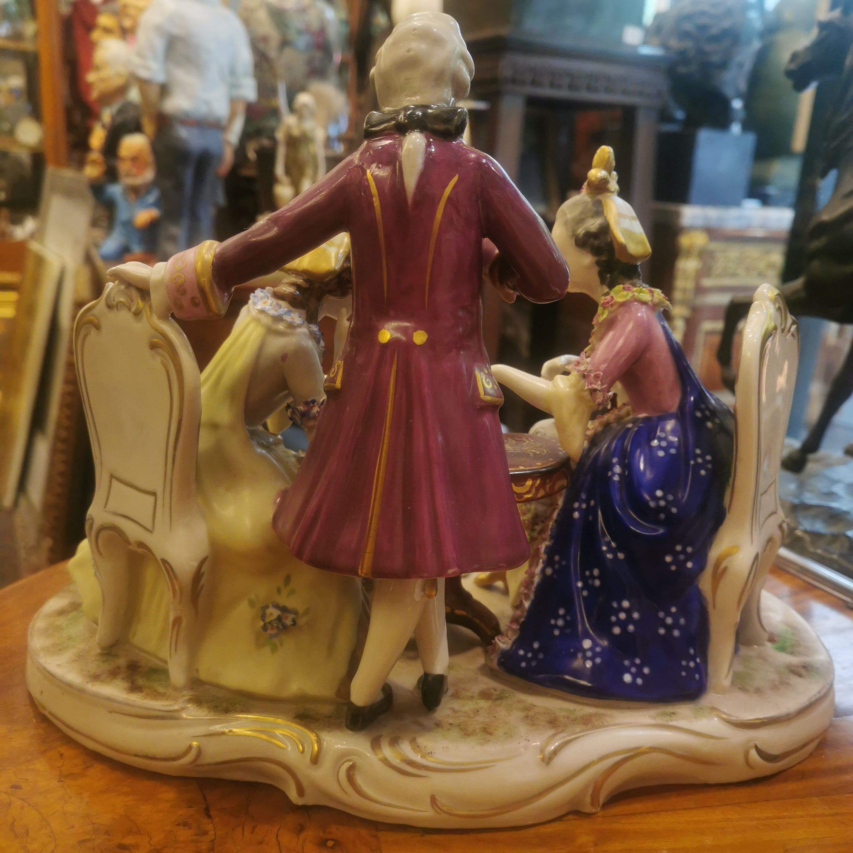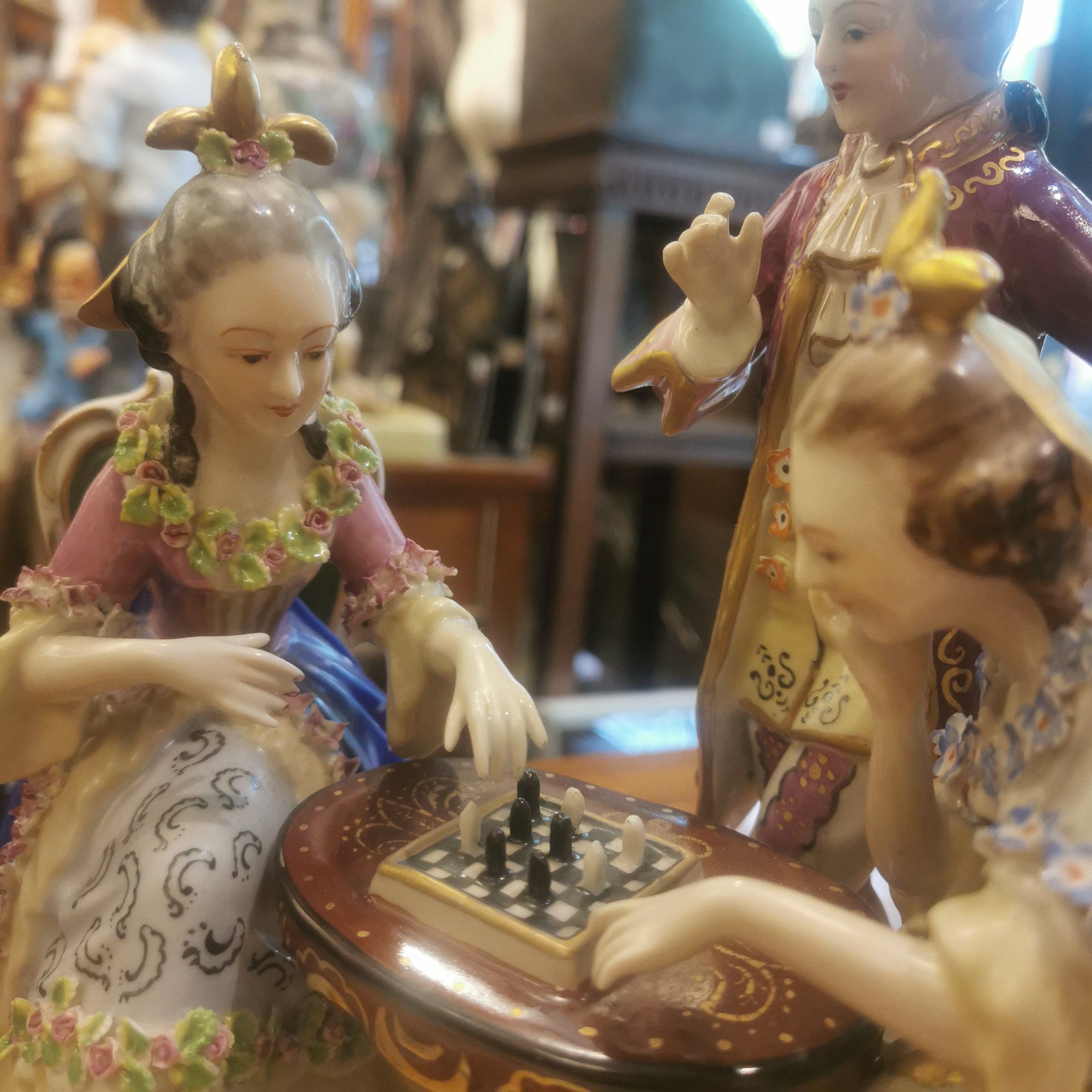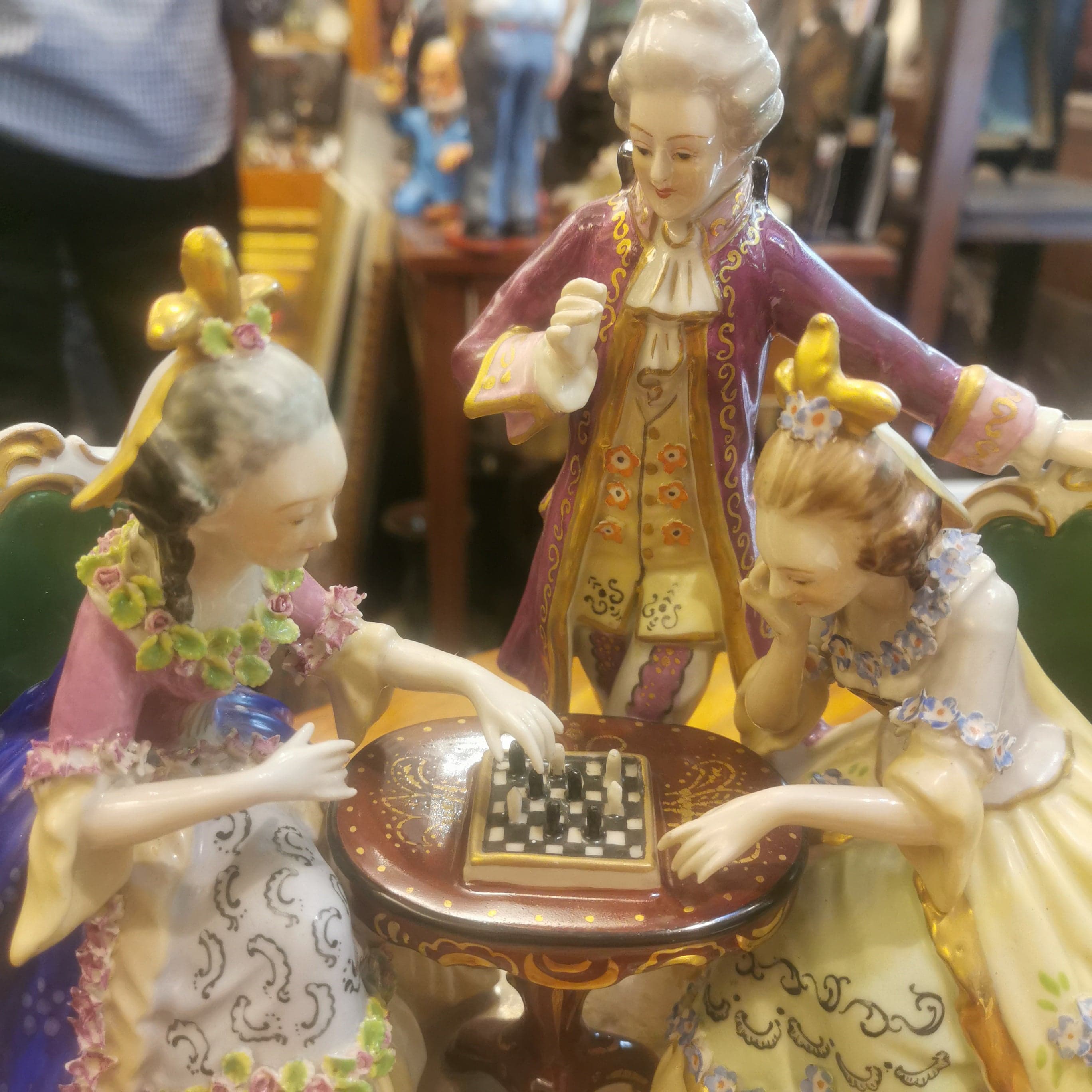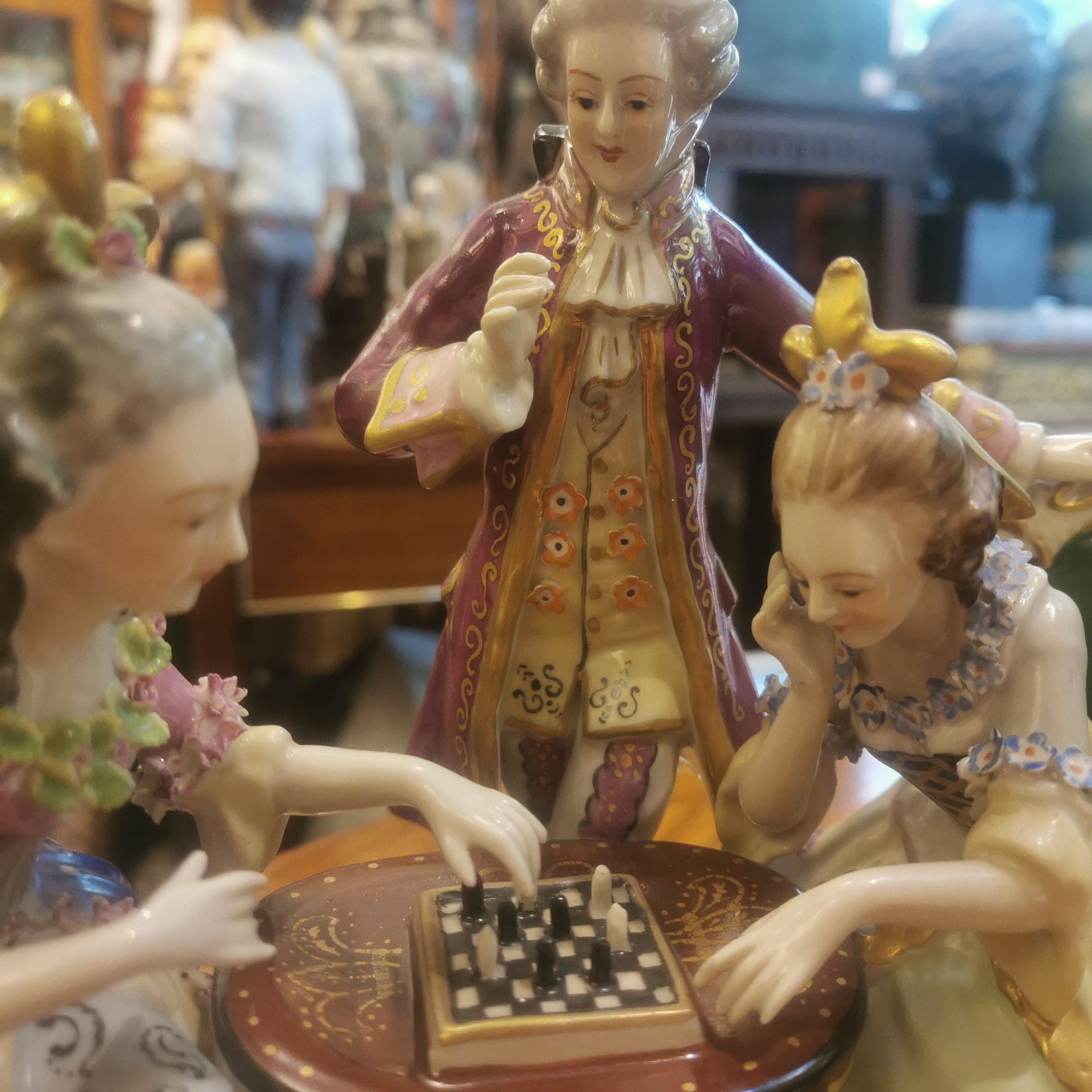 Hermosa figura de porcelana pintada a mano de origen francés Saxen, representando una escena de salón del siglo XVIII. En ella se puede apreciar una lúdica y coqueta escena de dos mujeres jugando ajedrez y hombre de pie observando.