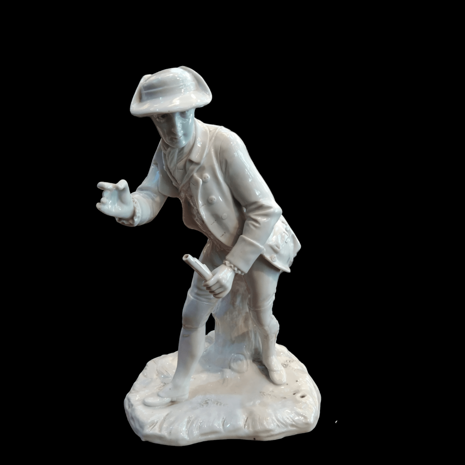 Bella figura de porcelana Capodimonte representando a un hombre caminando con unos documentos en su mano.