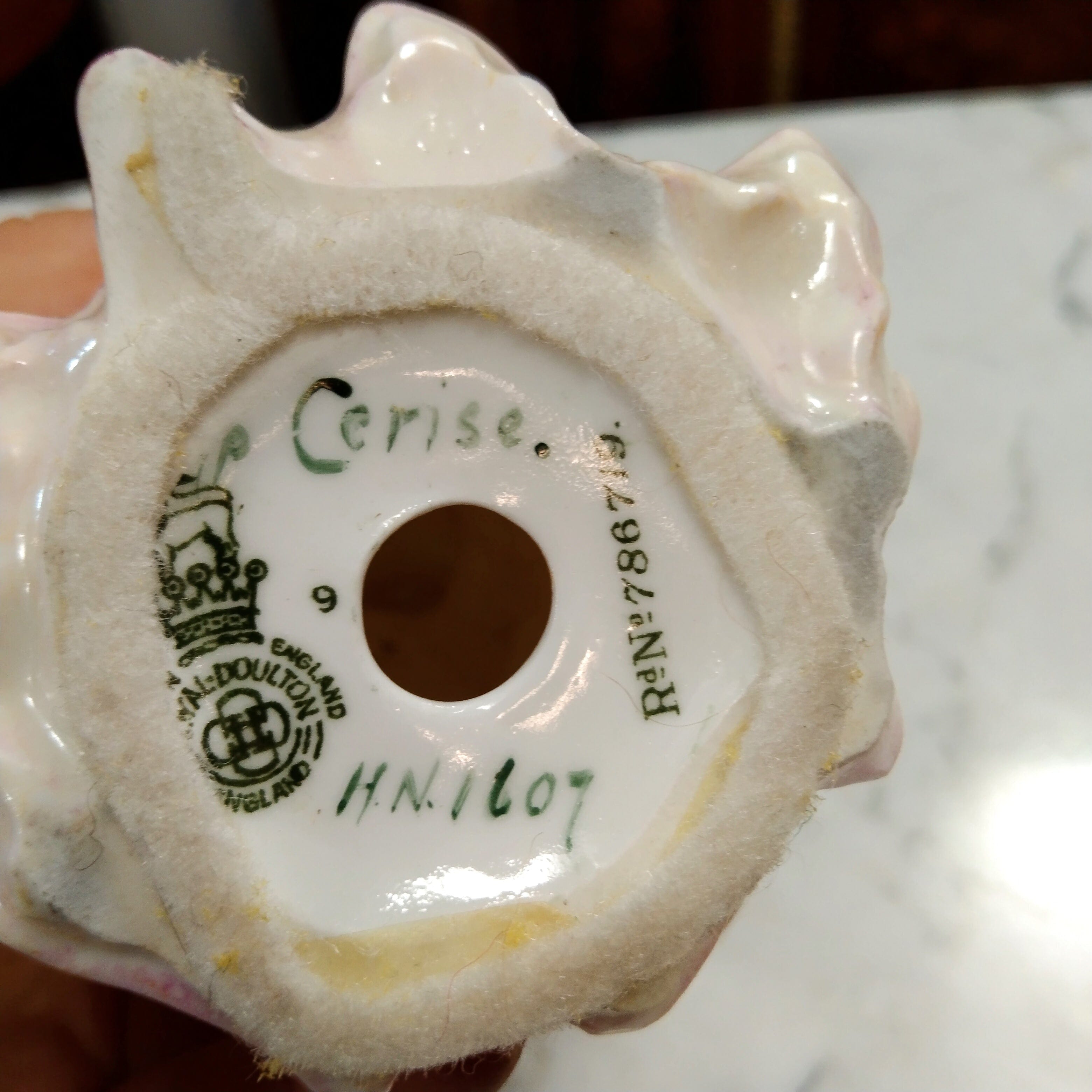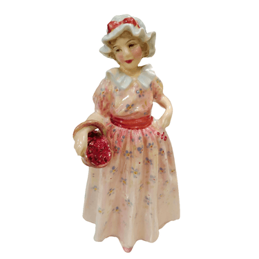 Linda figurita de porcelana inglesa de la marca Royal Doulton, llena de finos detalles pintados a mano. La figura representa a una niña campesina con un vestido floreado y una cesta con pétalos rojos bajo uno de sus brazos.