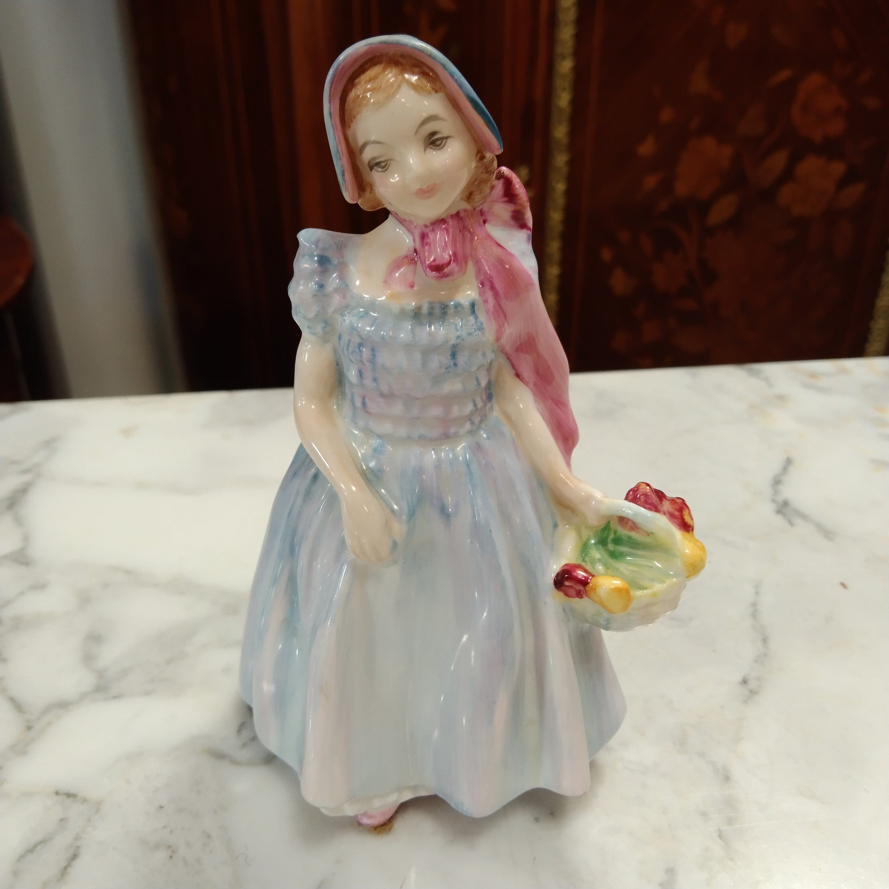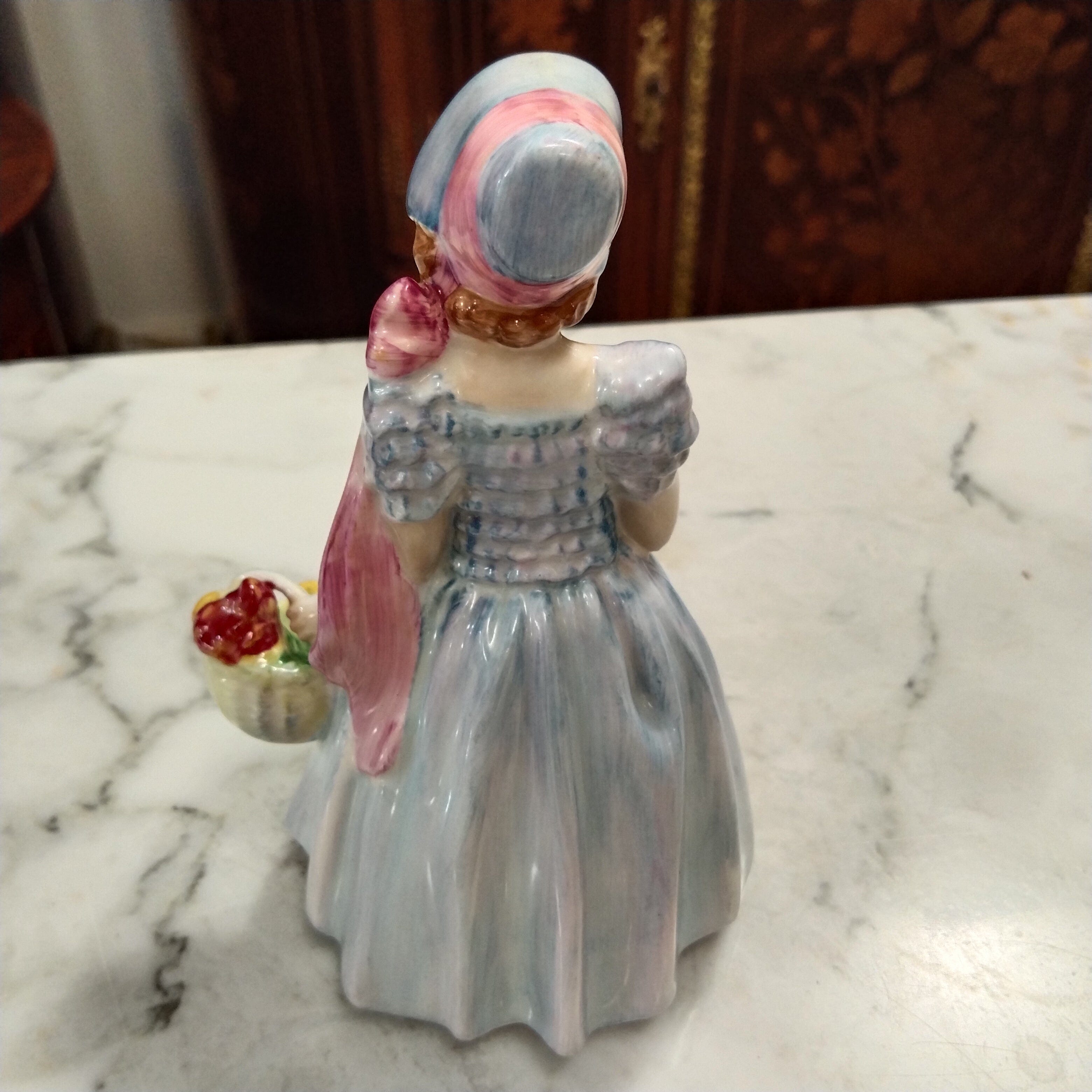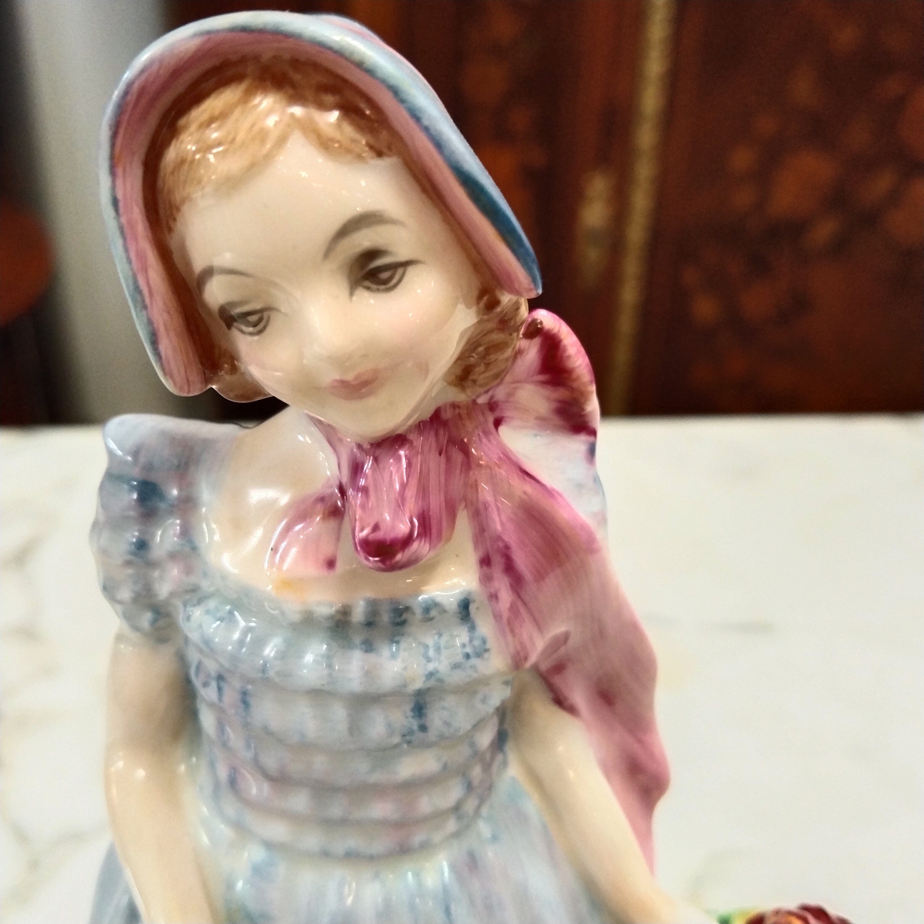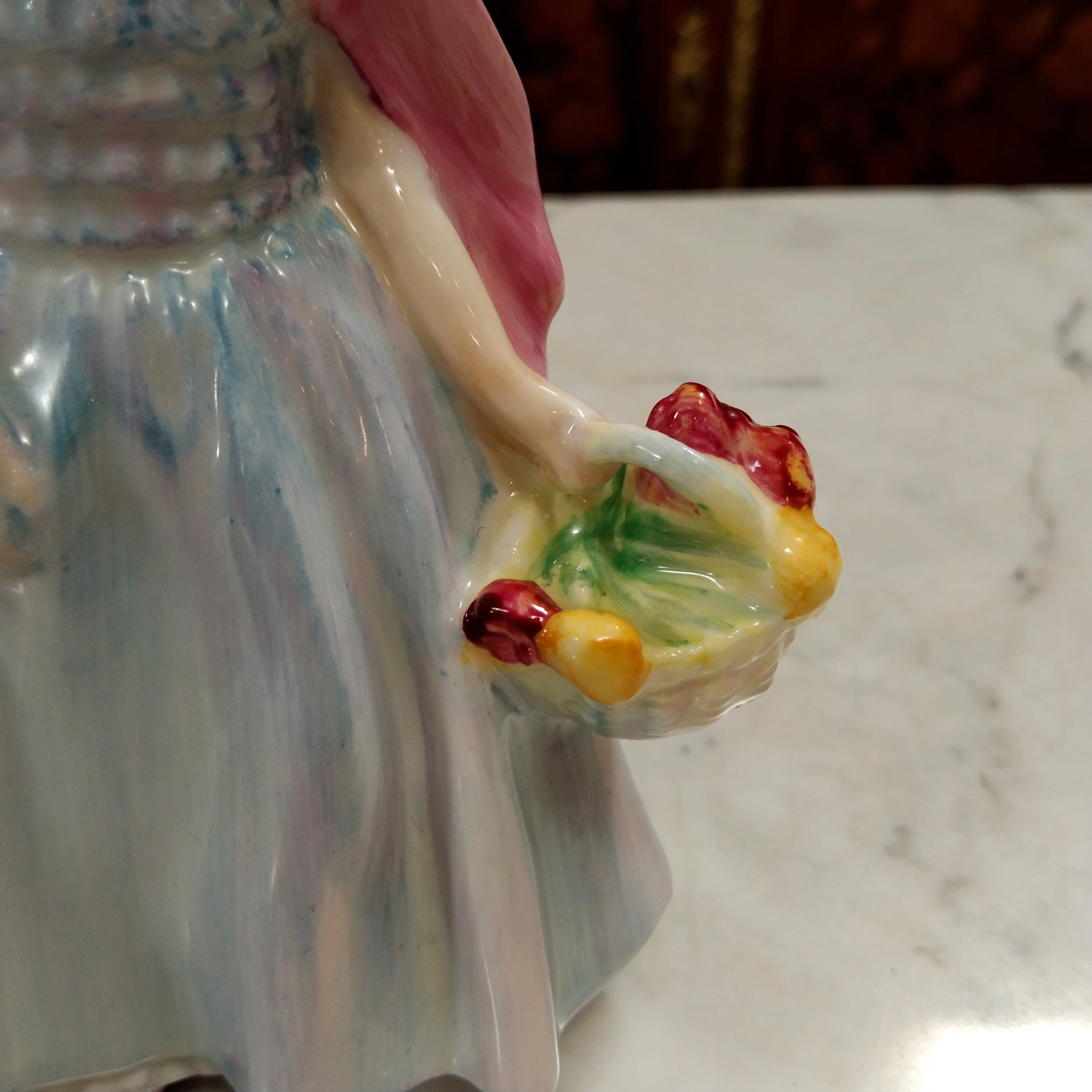 Linda figurita de porcelana de la marca inglesa Royal Doulton, fabricada y pintada a manos con bellos detalles en 1952. La figura representa a una niña con un sombrero amarrado aún gran lazo color rosa y una cesta de flores en una de sus manos.