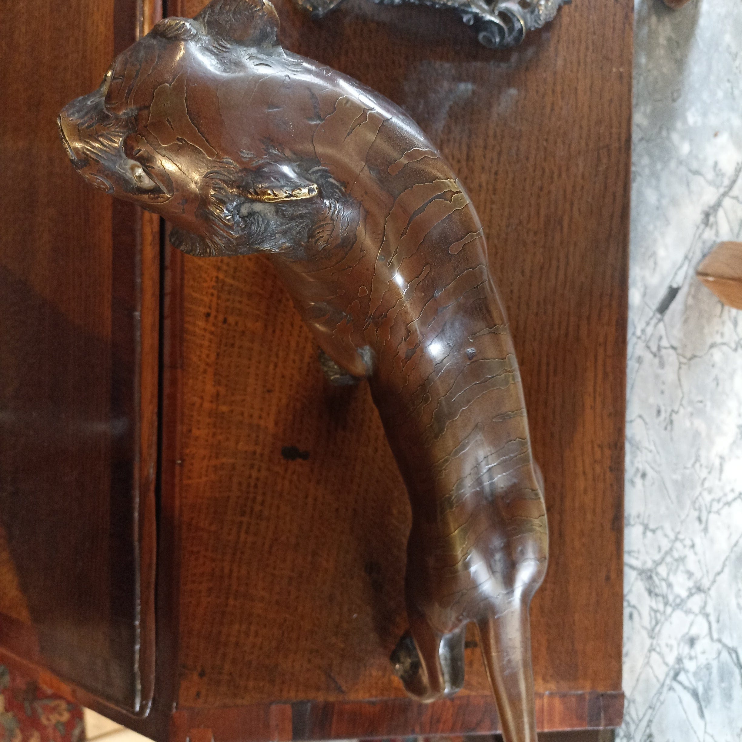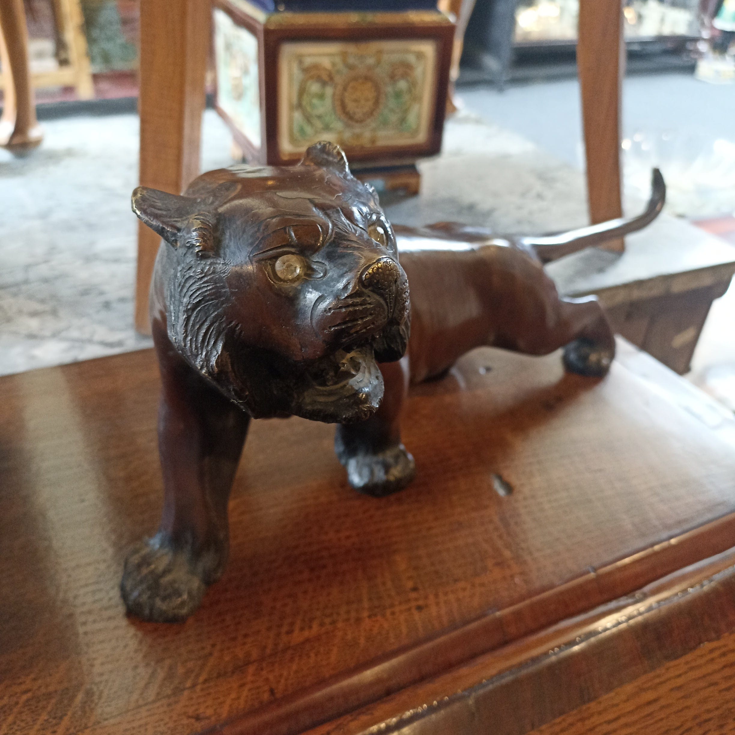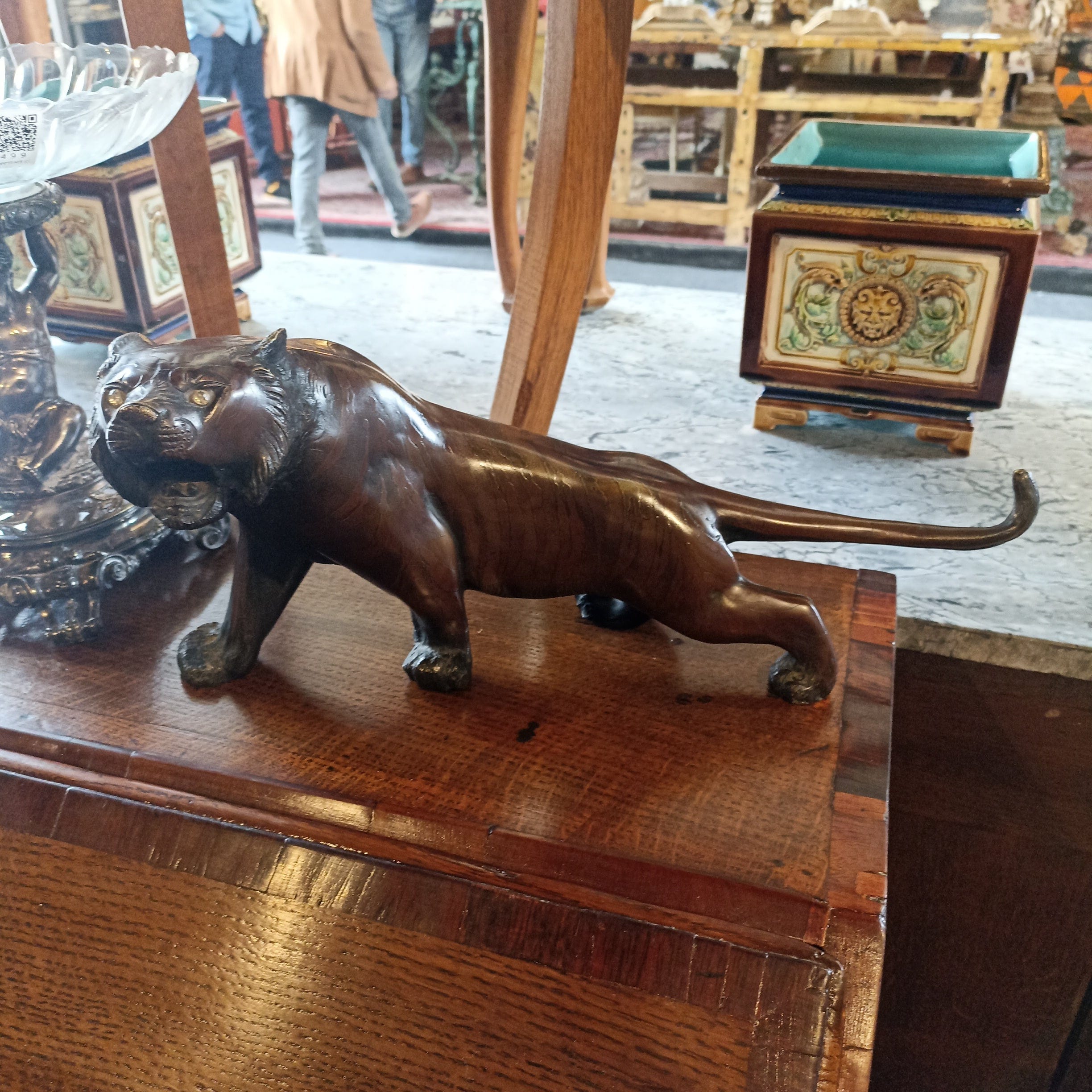 Hermosa escultura de bronce, representando un tigre de bengala, delicado diseño de las lineas en el cuerpo del animal.
