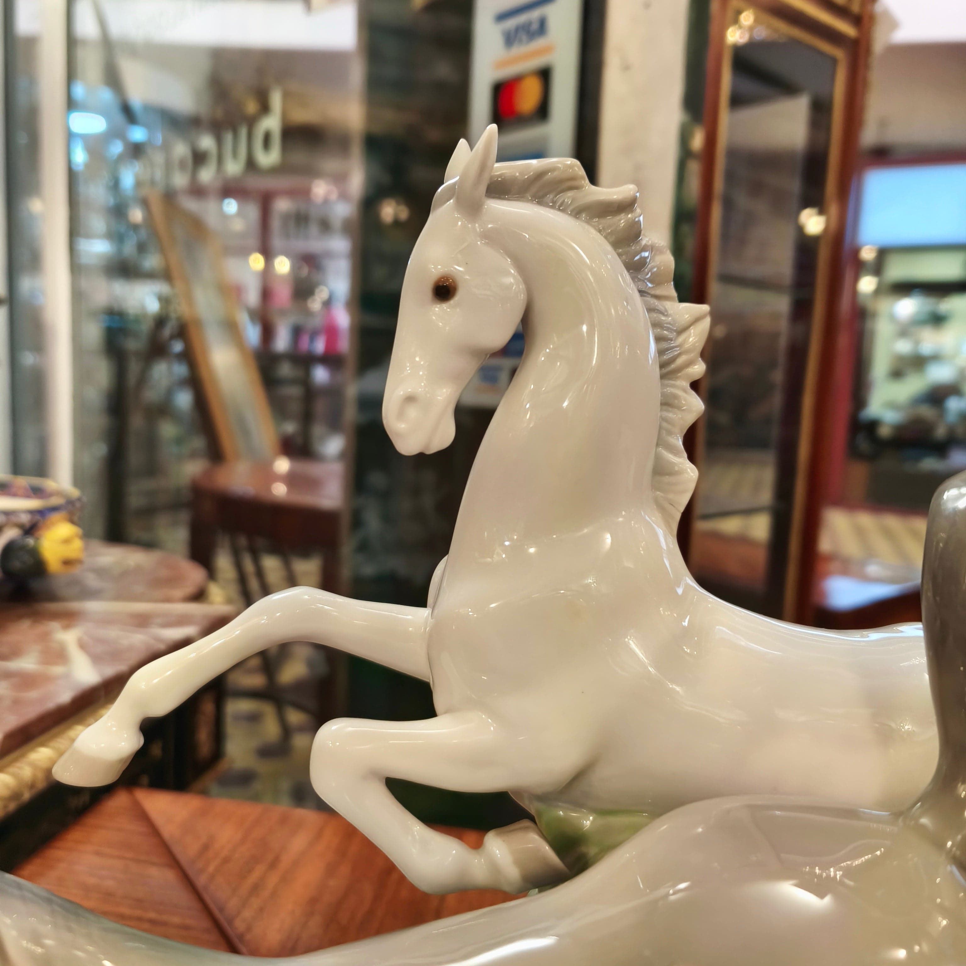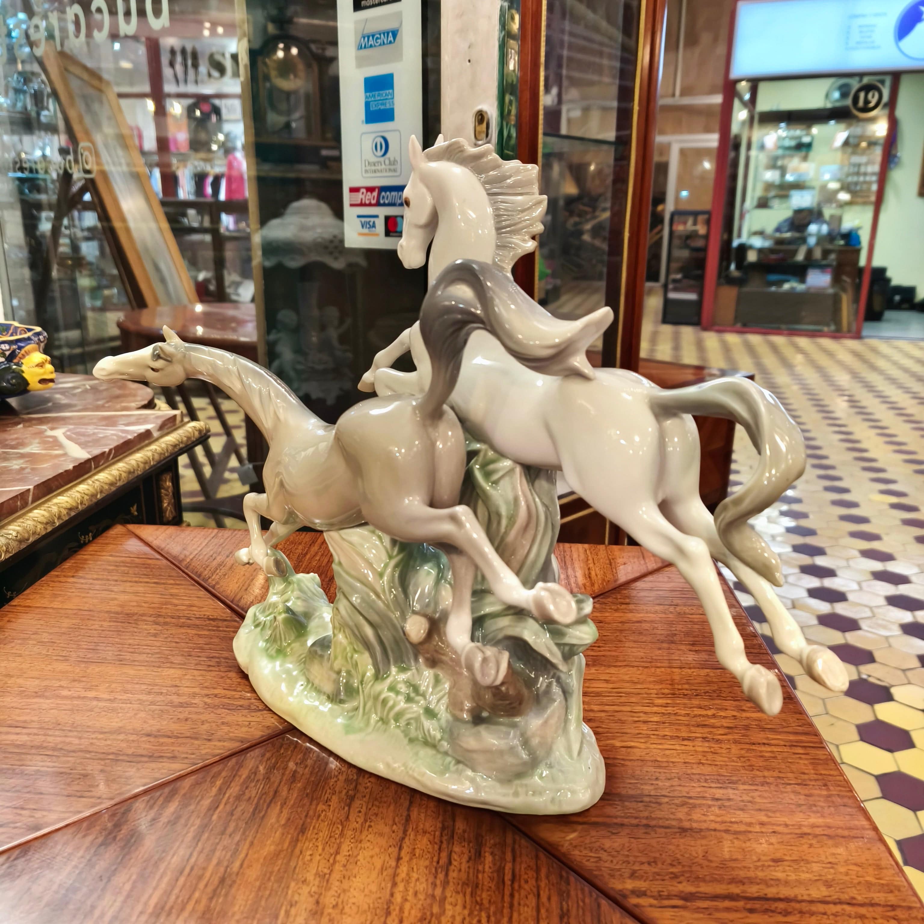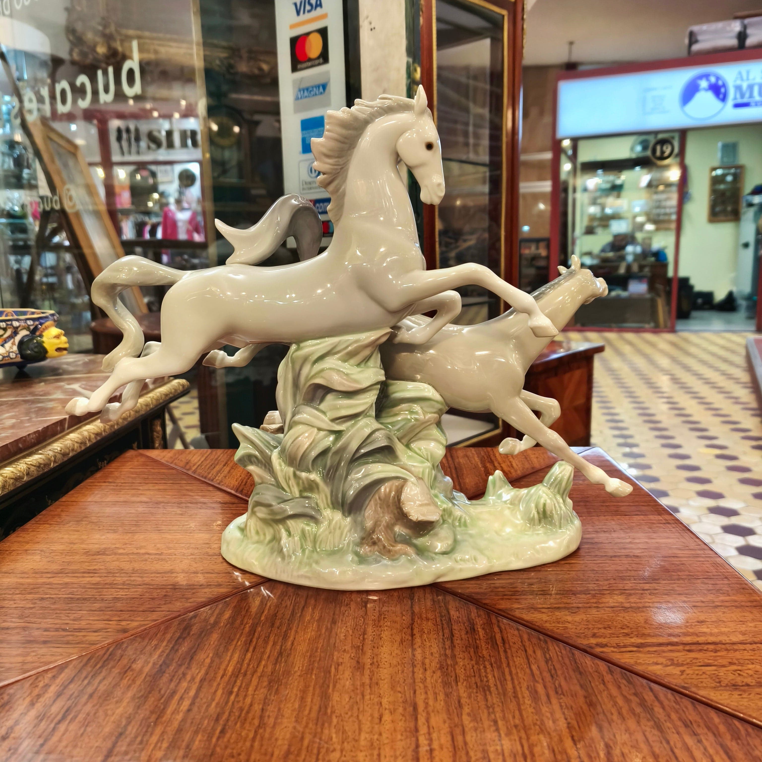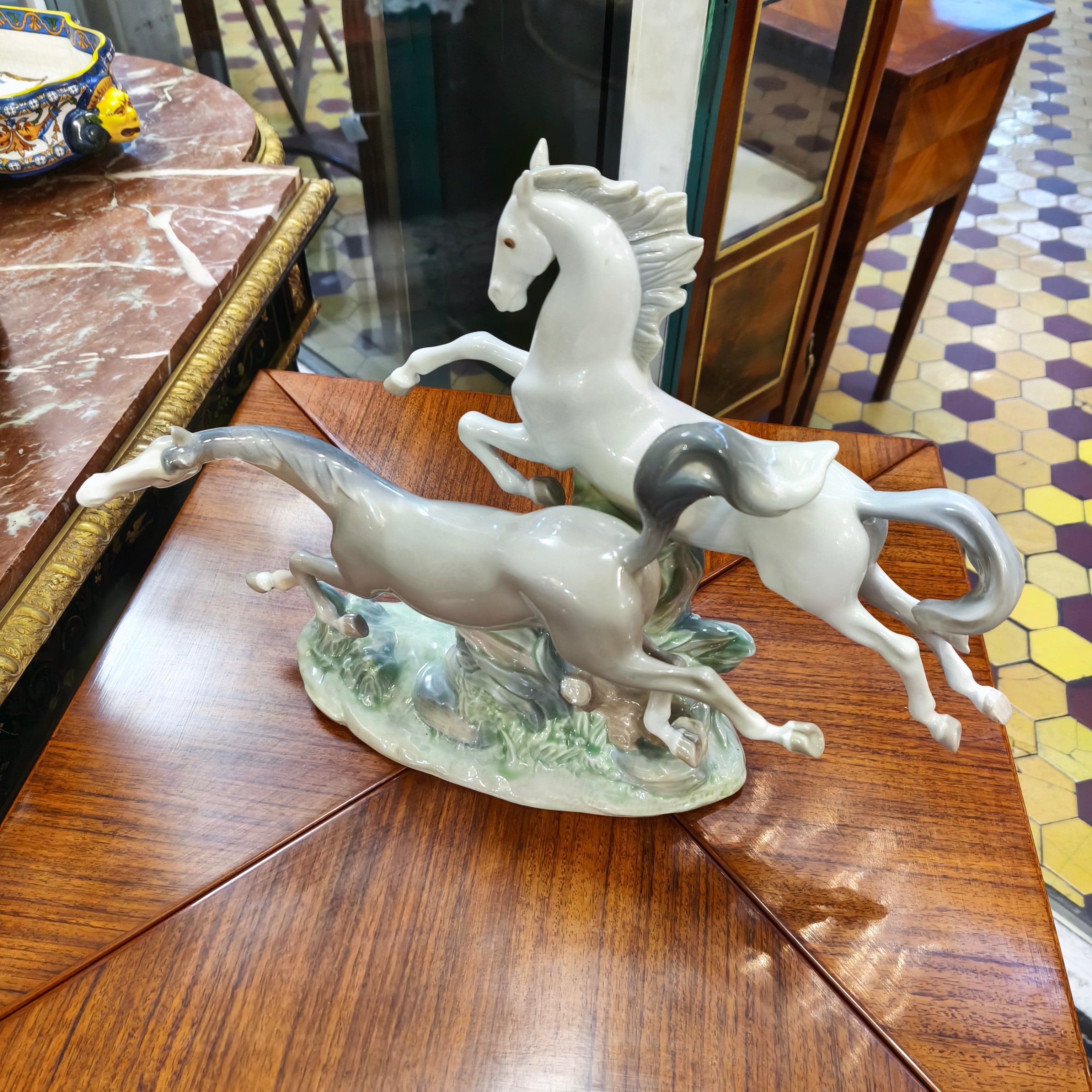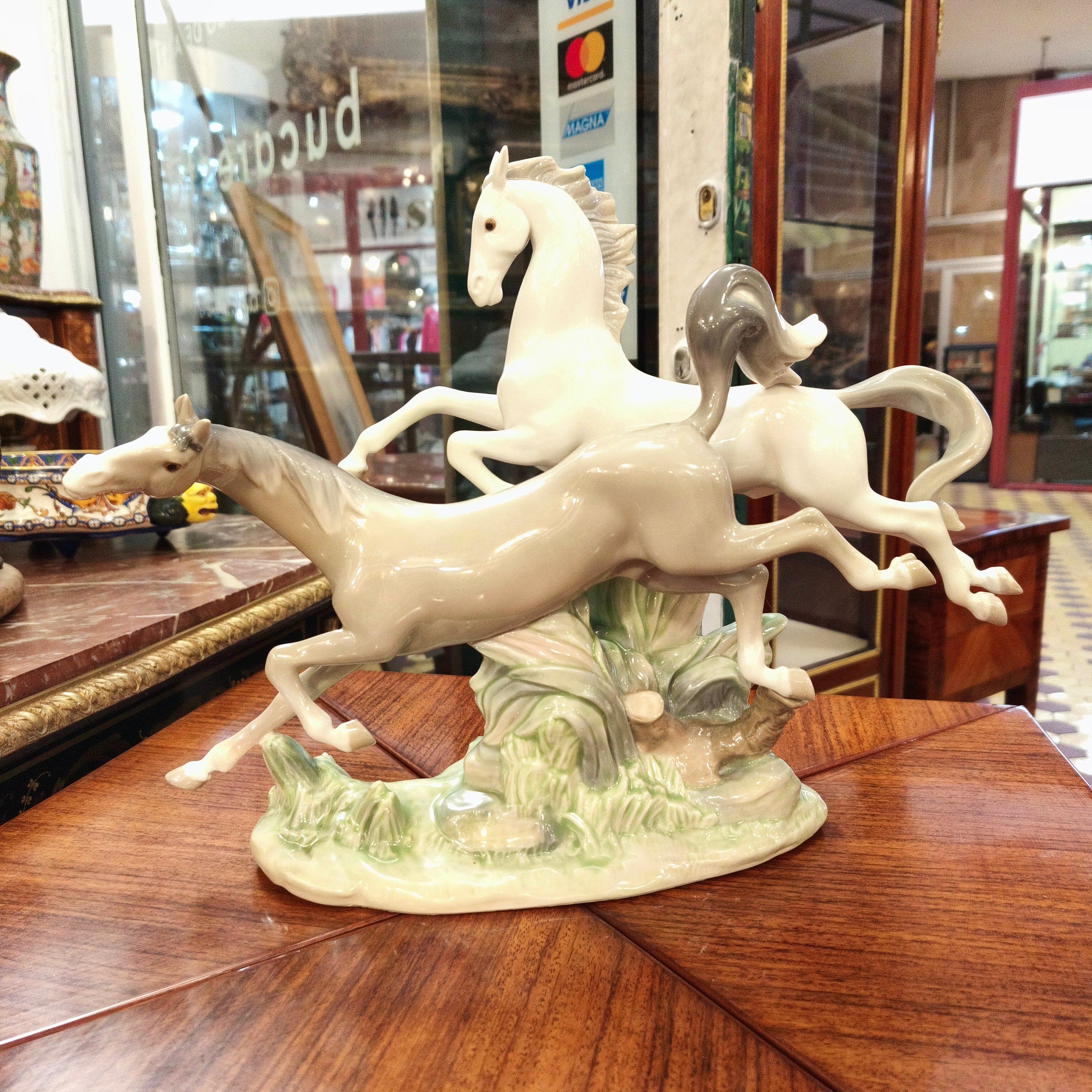 Bella figura de porcelana de la marca española Lladró, en la cual podemos ver a dos caballos galopando, uno gris otro blanco.