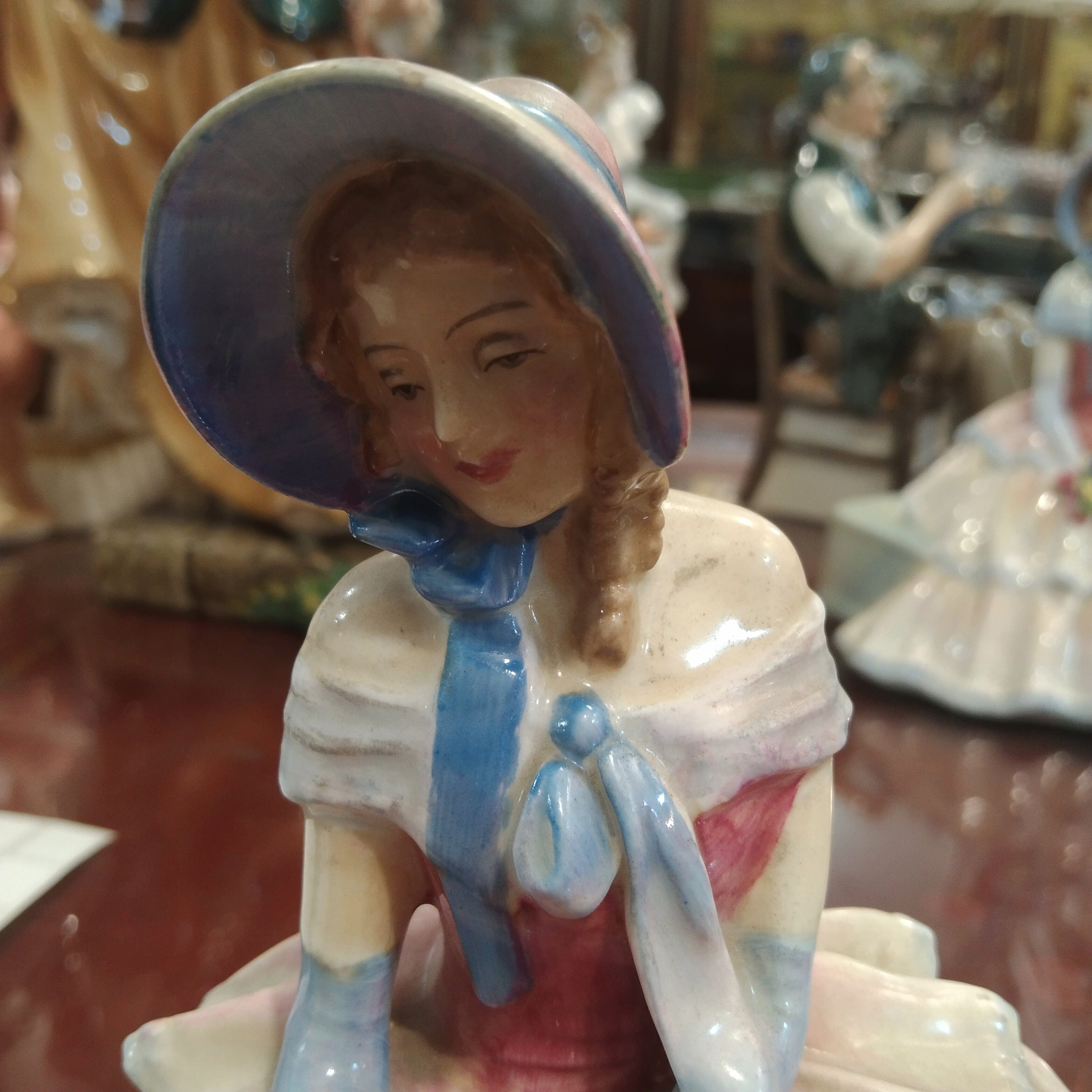 Linda figura de porcelana antigua de la marca inglesa Royal Doulton, fabricada y pintada a mano. La figura representa a una mujer noble con un bello vestido tornazol y con volúmen, un sombrero de lazo con cinta celeste y un ramo de flores, detalladamente pintadas en amarillos, rosas y rojos , en su regazo.