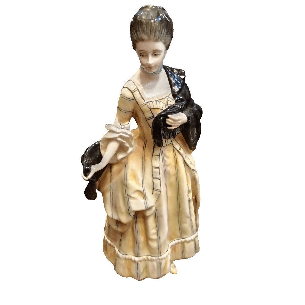 Bella figura de porcelana de la marca inglesa Royal Doulton, fabricada y pintada a mano en 1989, representando al personaje de Isabella, una condesa de la corte real con un elegante vestido amarillo.