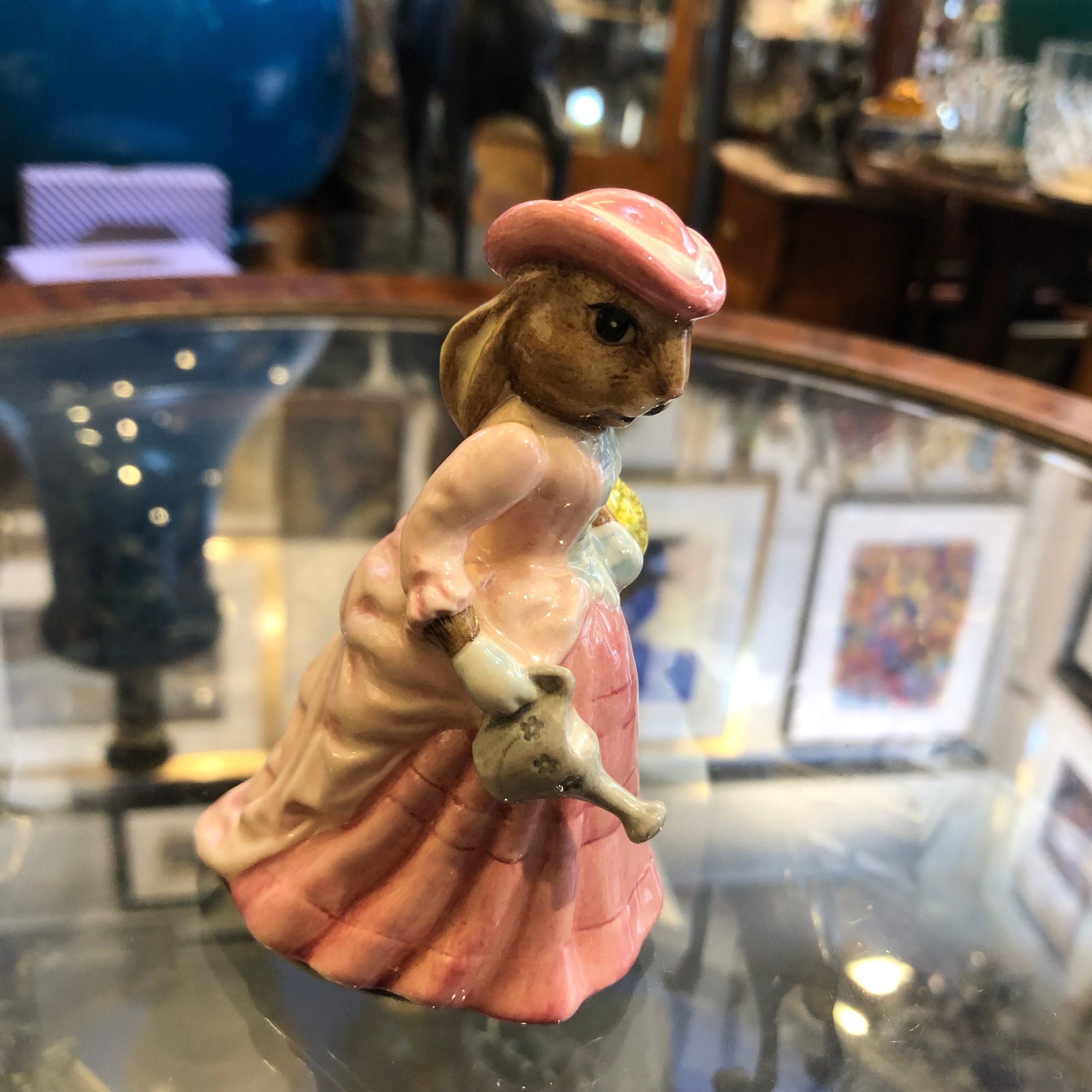 Hermosa figura de porcelana De la marca Royal Doulton, con forma de conejo, vestida de dama con vestido largo, sombrero y en sus manos una canasta de flores y regadera.