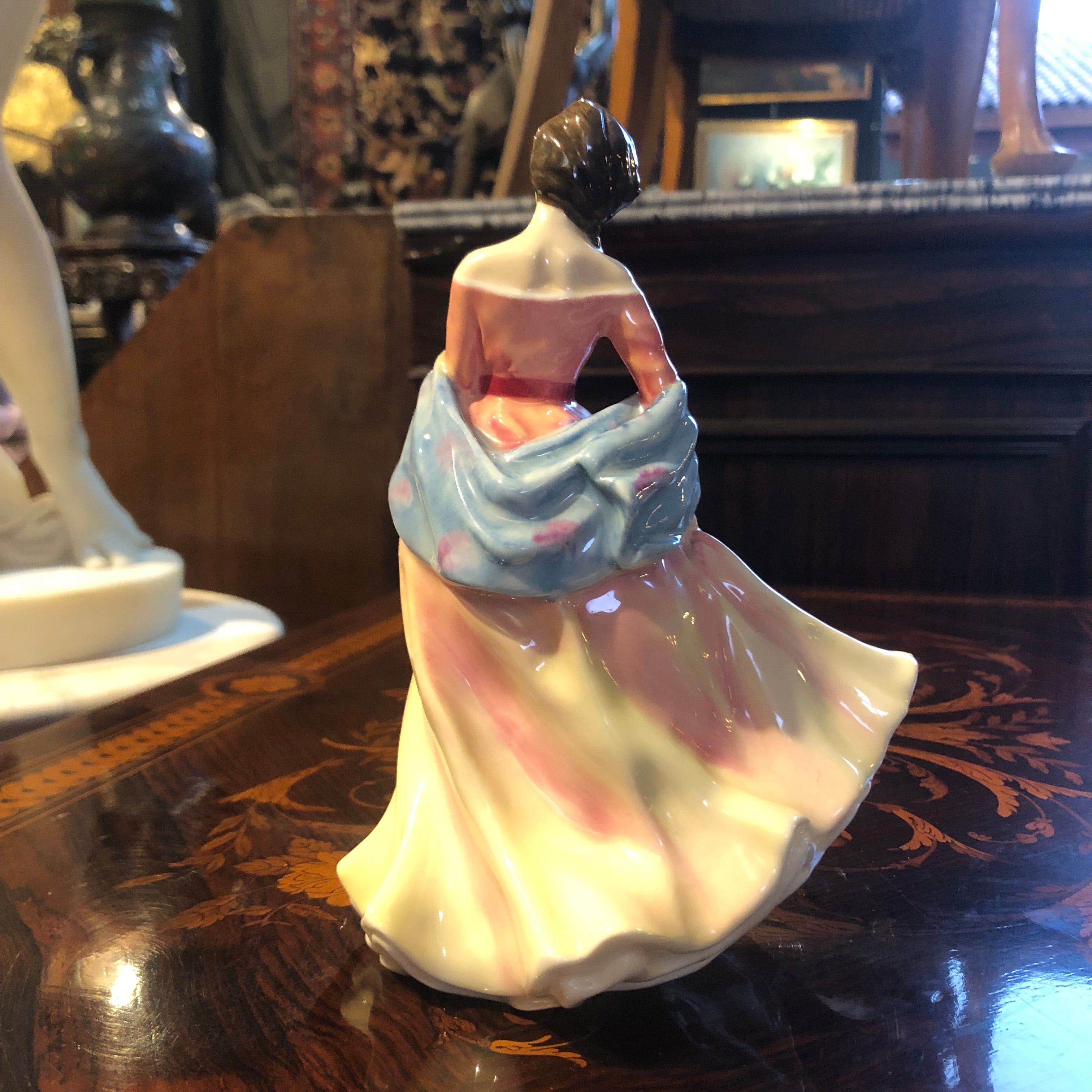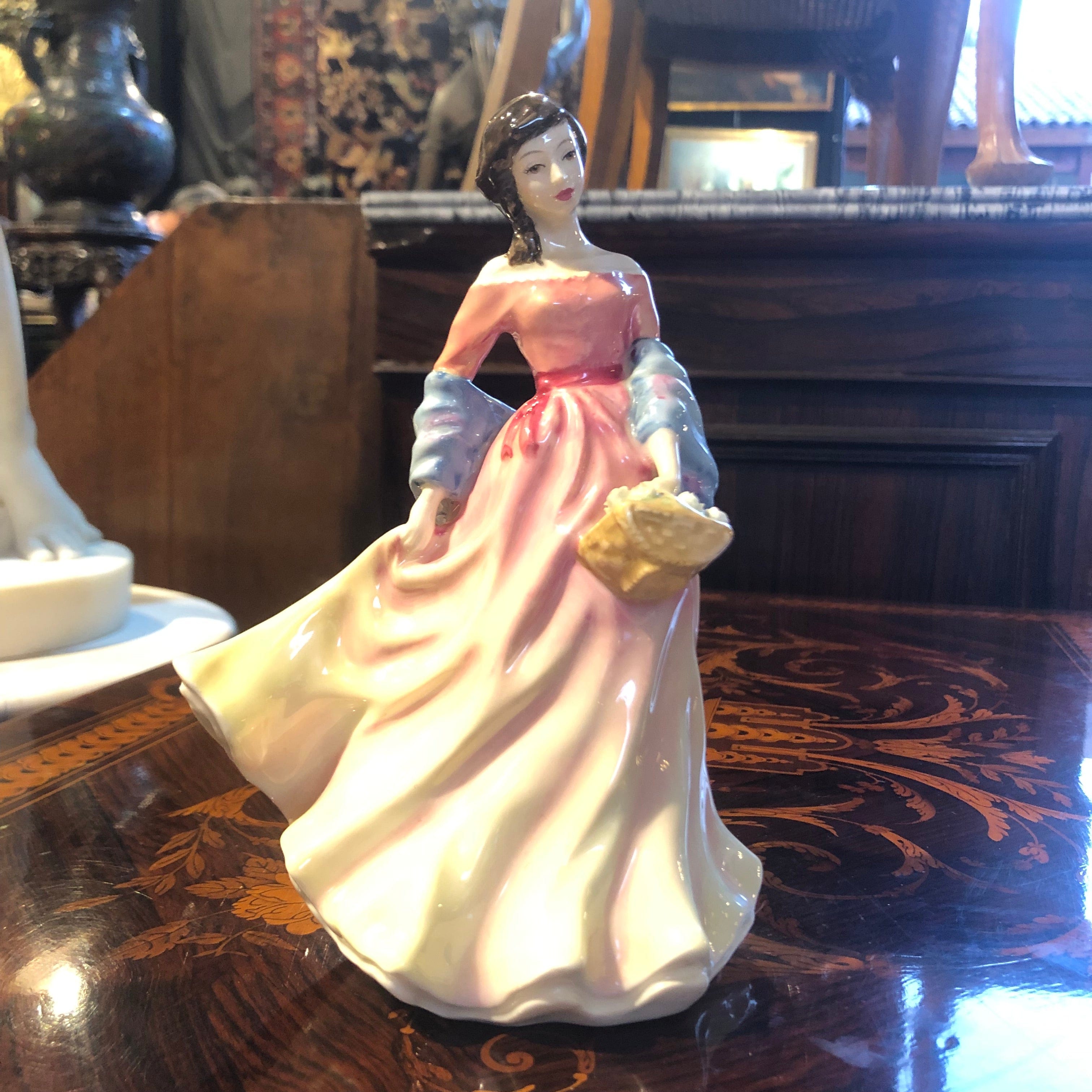 Figurita de porcelana de origen inglés de la reconocida marca Royal Doulton, fabricada en 1997. La pieza representa a una mujer con un vestido de color rosado y amarillo, con un pañuelo celeste alrededor de sus hombros. El nombre de la figura es Summer Scent o “Esencia veraniega”, aludiendo a la canasta con flores que lleva la mujer.