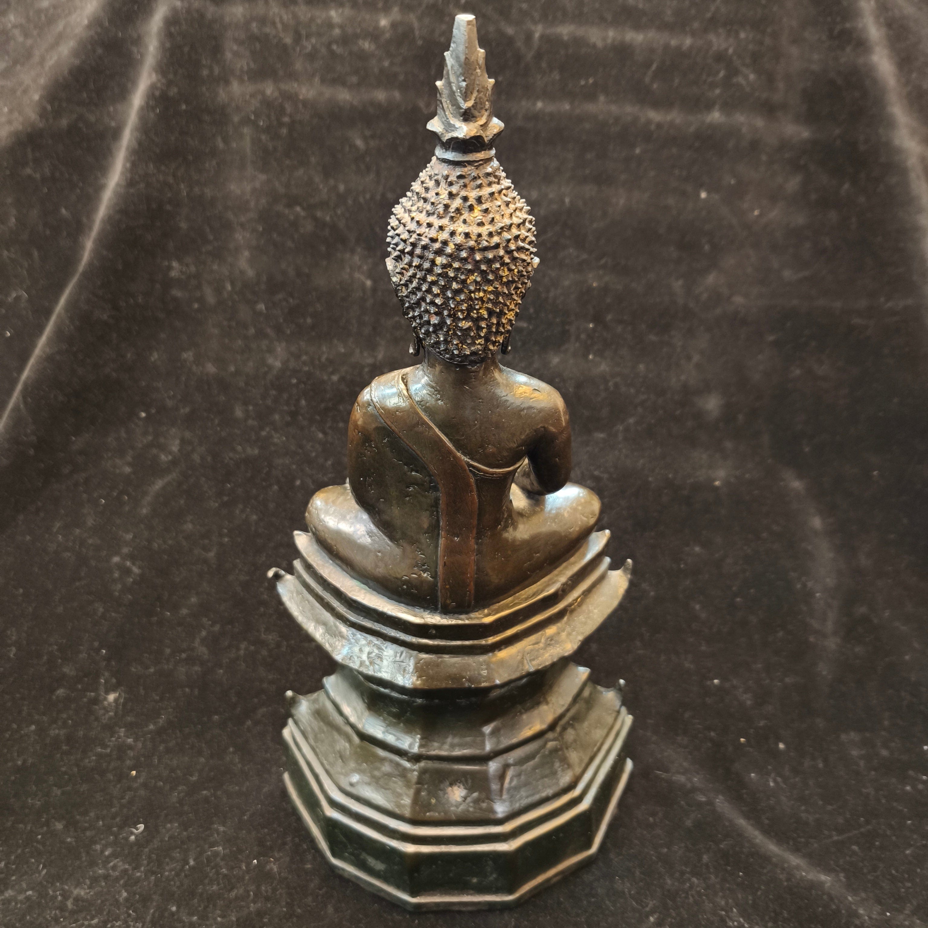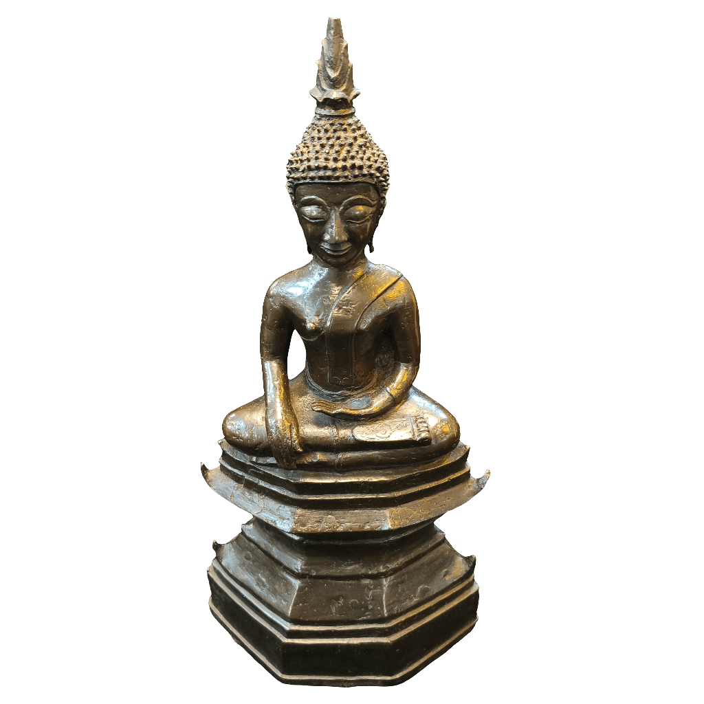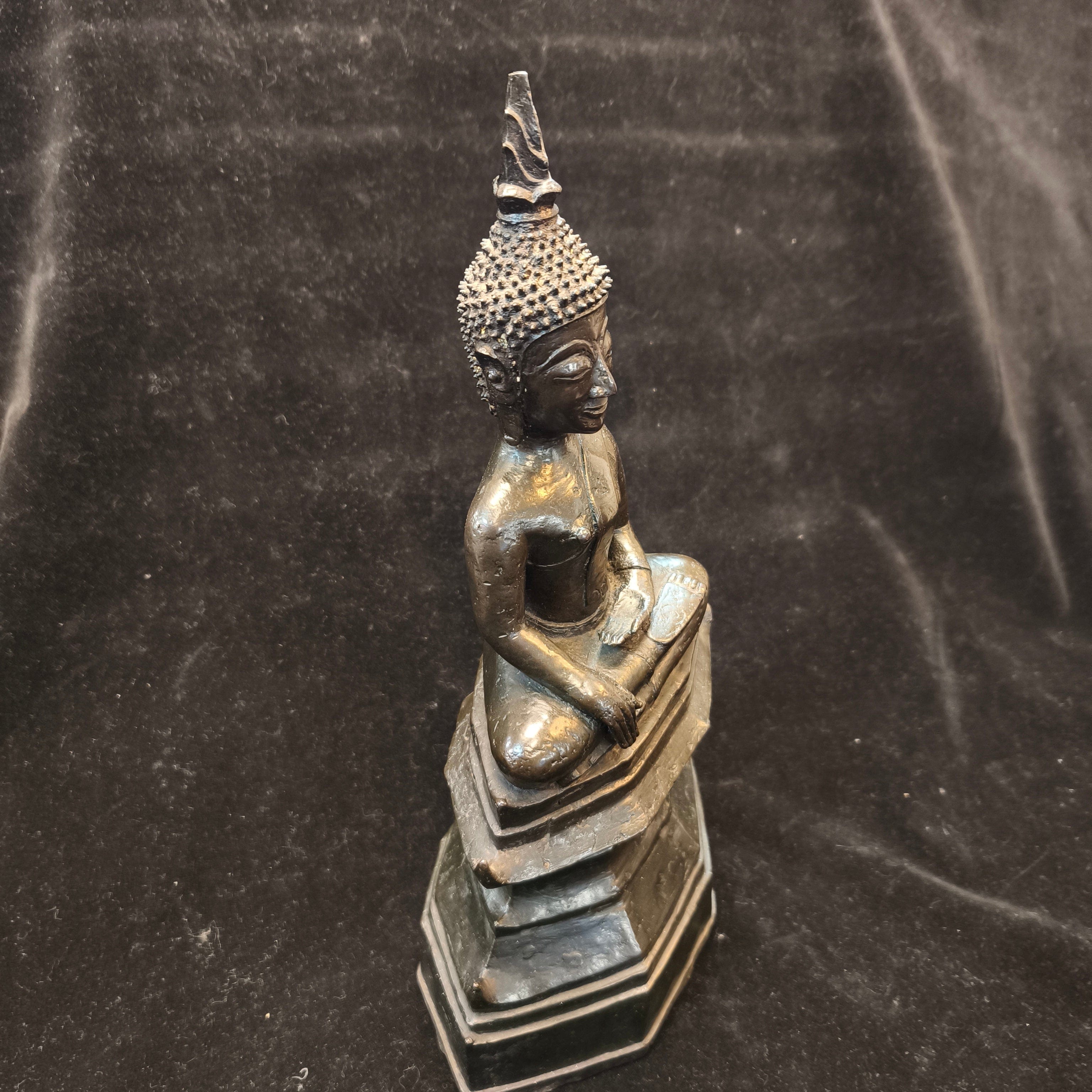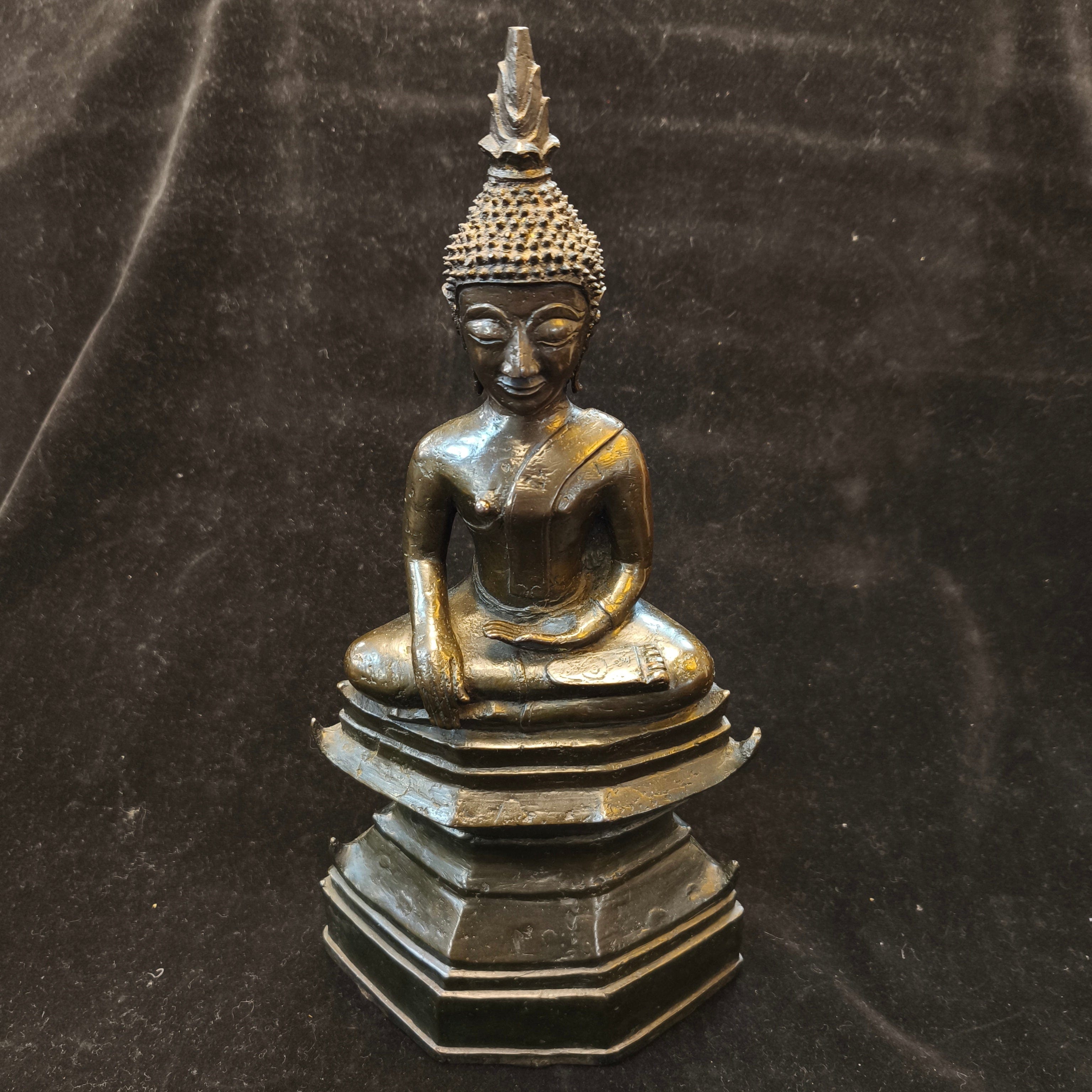 Bella figura tailandesa en bronce, representando a Buda en posición de loto, realizando un mudra sobre un gran pedestal.
