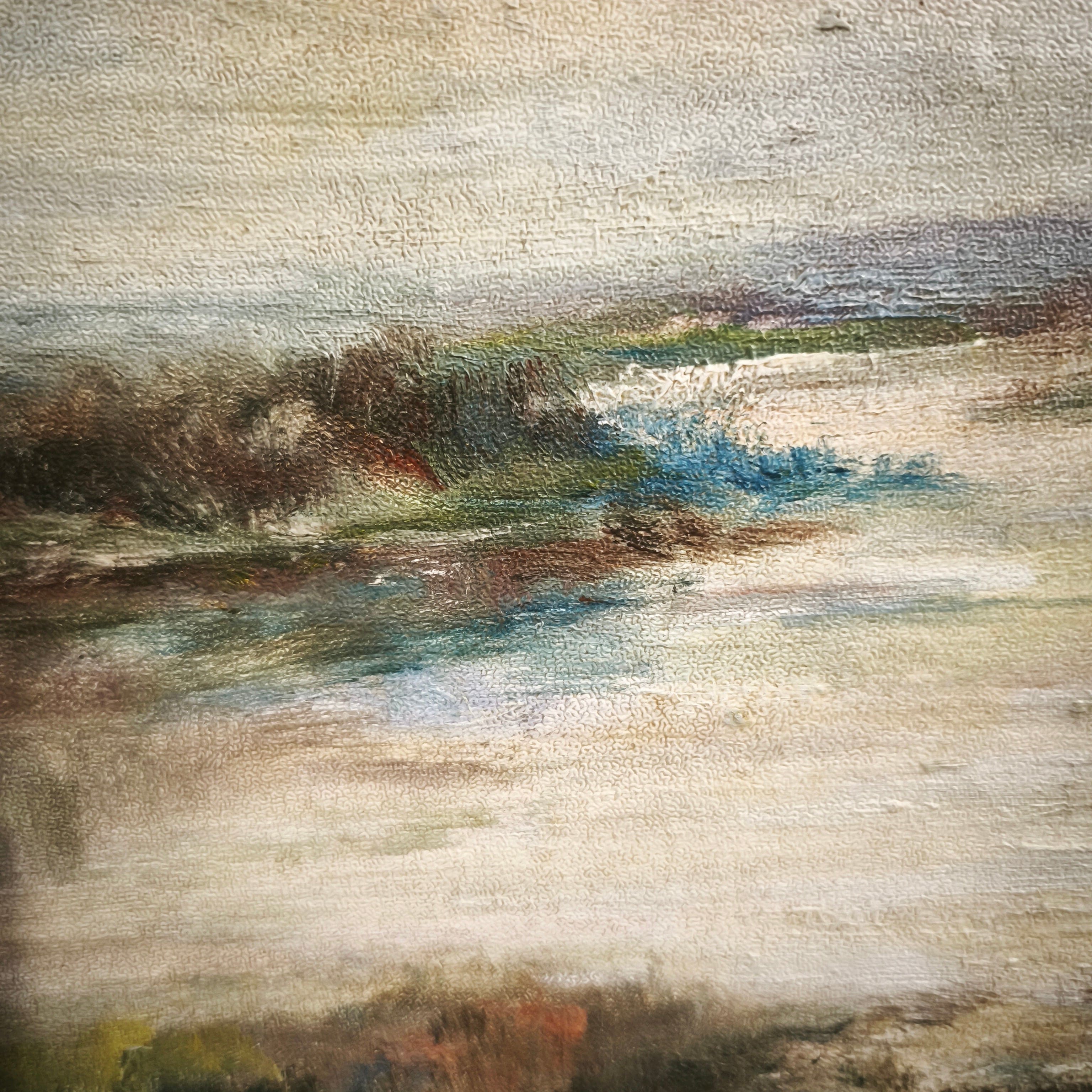 Óleo sobre madera entelada, de origen chileno,representando un paisaje de humedal, con un bello y sutil trabajo de luz y texturas, tanto en el cielo como en la vegetación del paisaje. El óleo está enmarcada en madera pintada de negro, haciedo resaltar la obra.