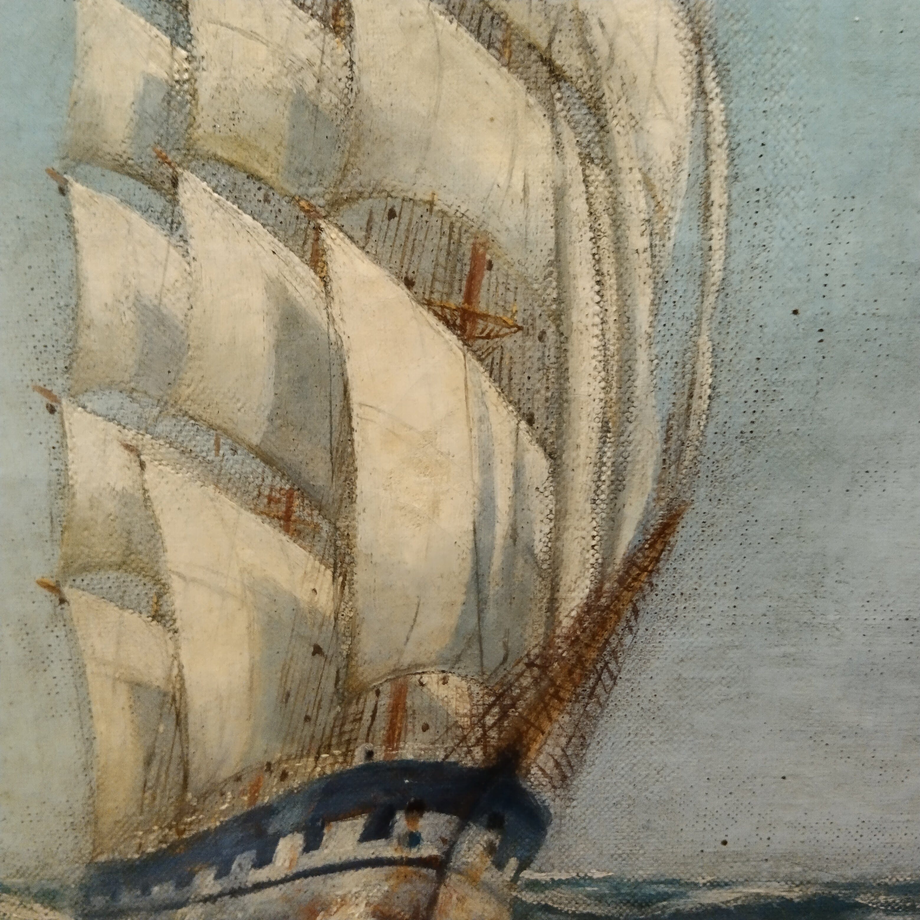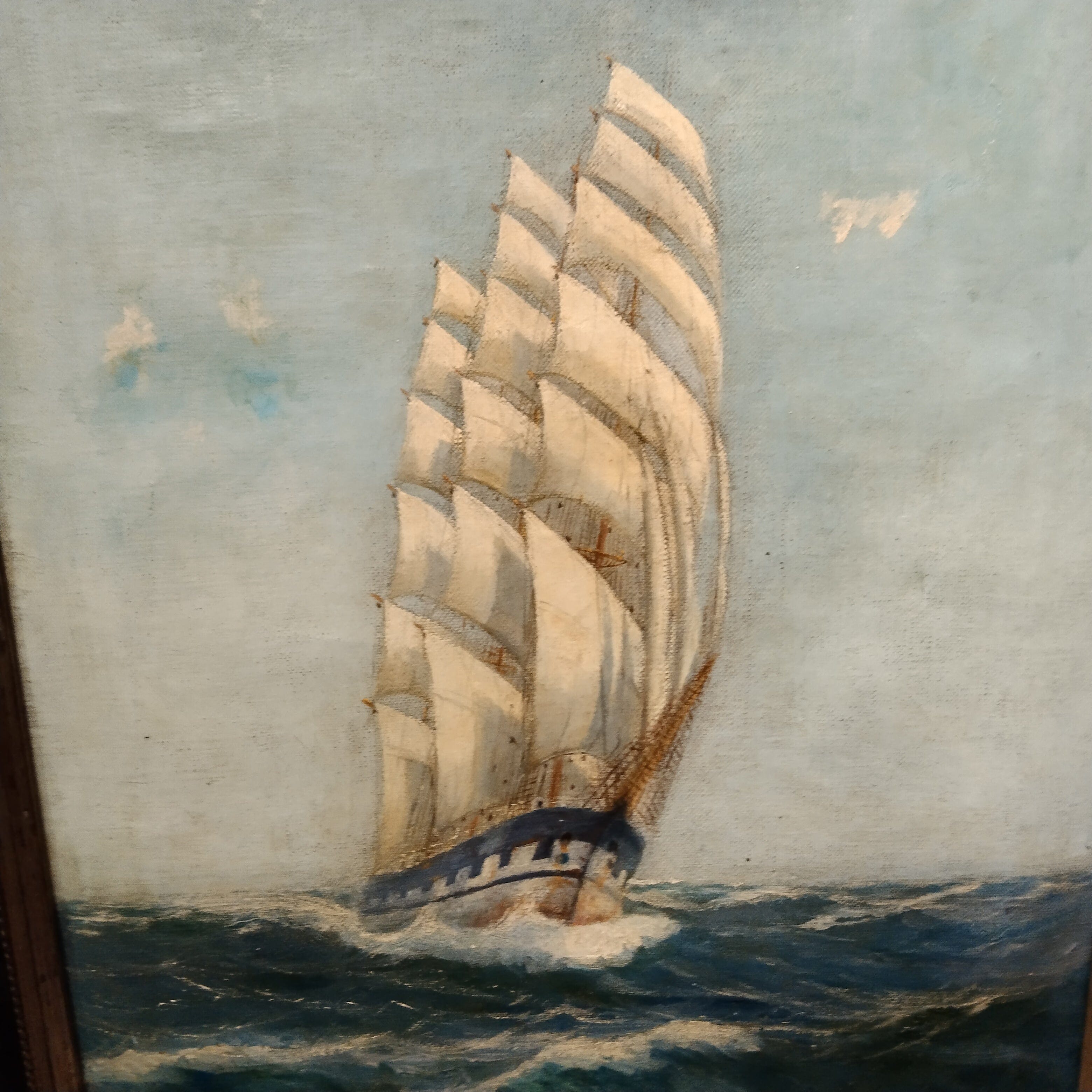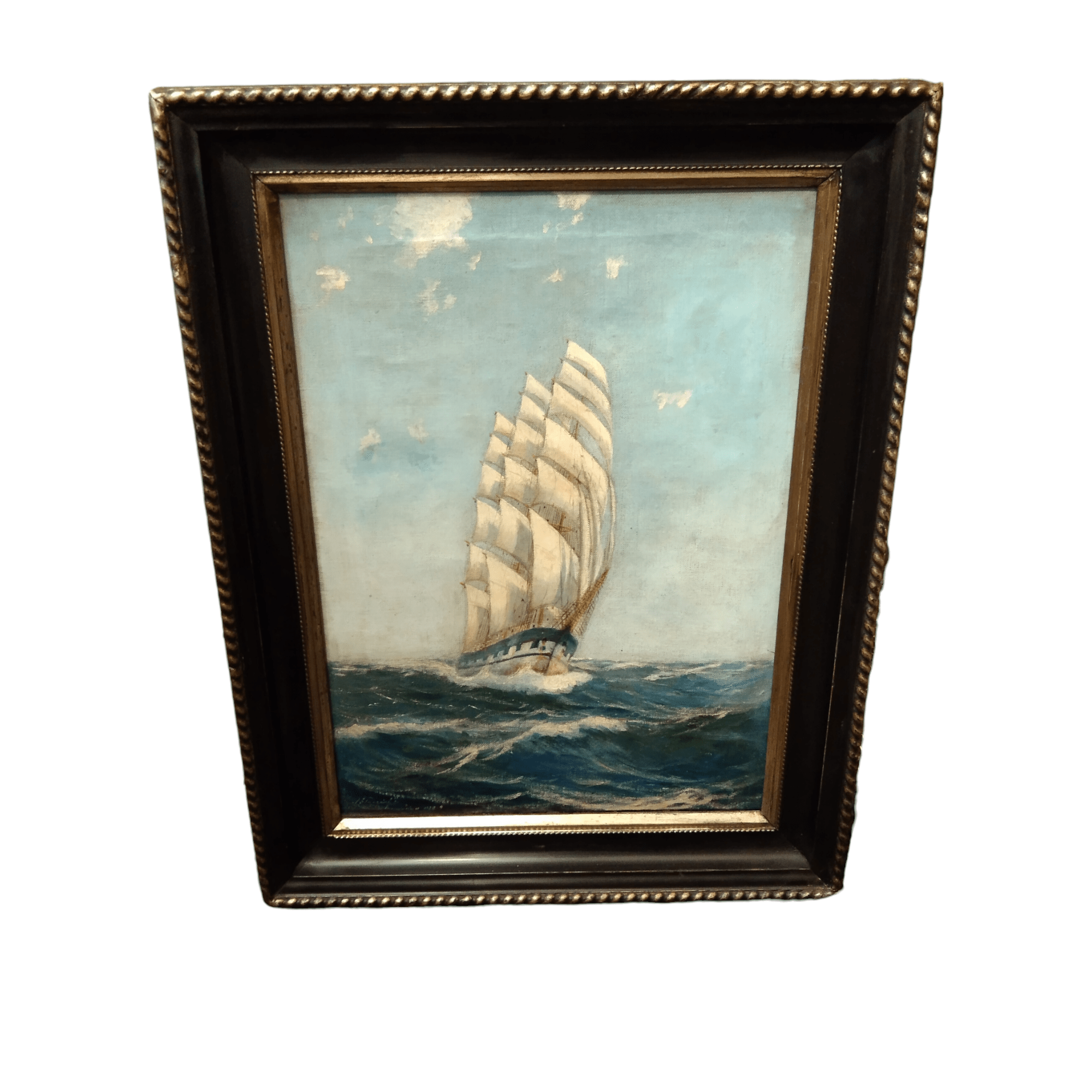 Óleo sobre tela del artista chileno Florentino Previst, representando un gran barco de velas blancas navegando en medio del mar. La obra está enmarcada elegantemente en madera pintada de negro y dorado.