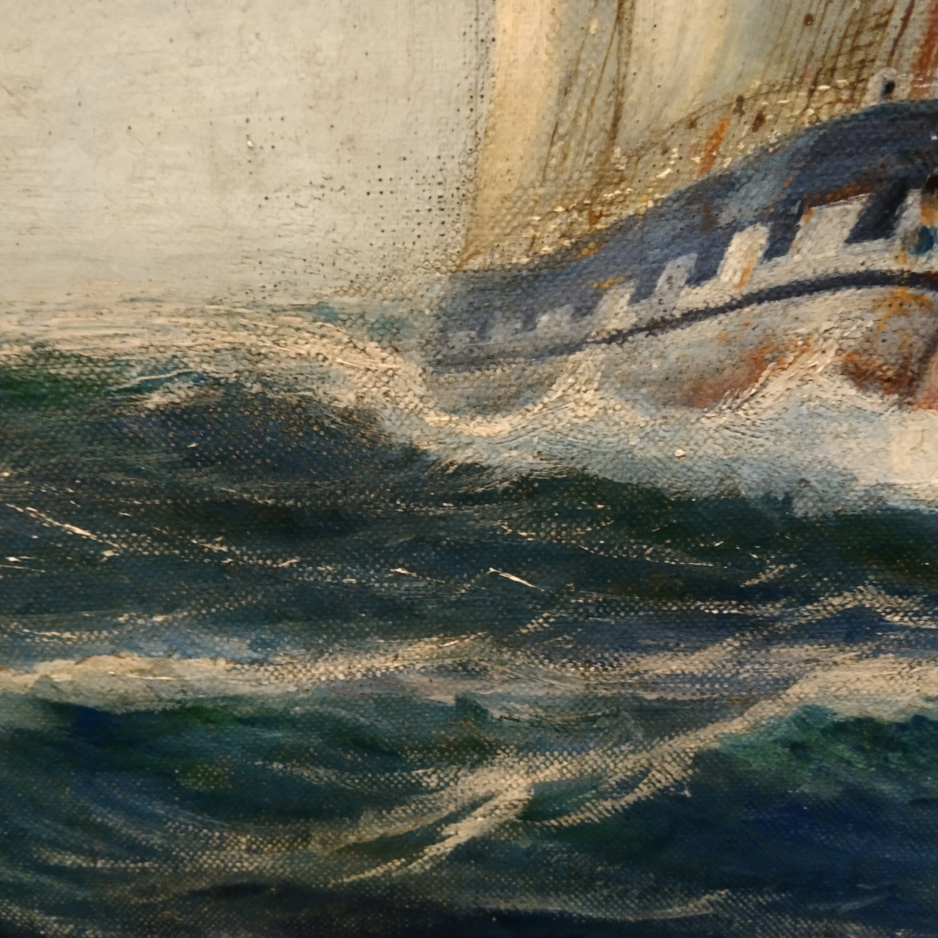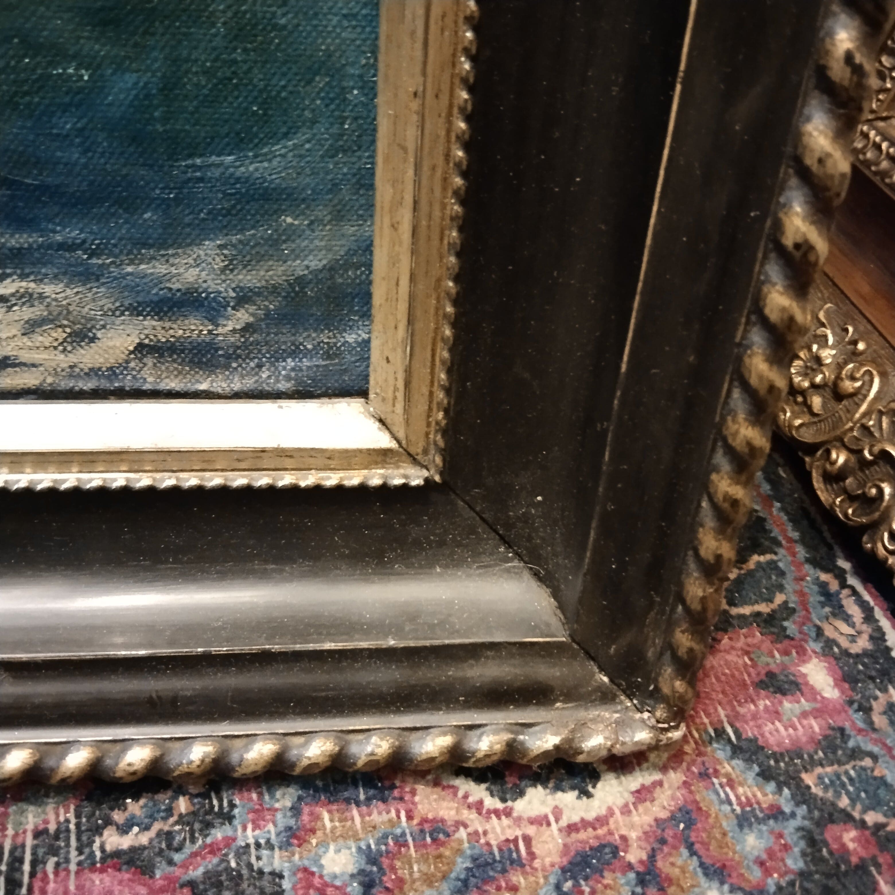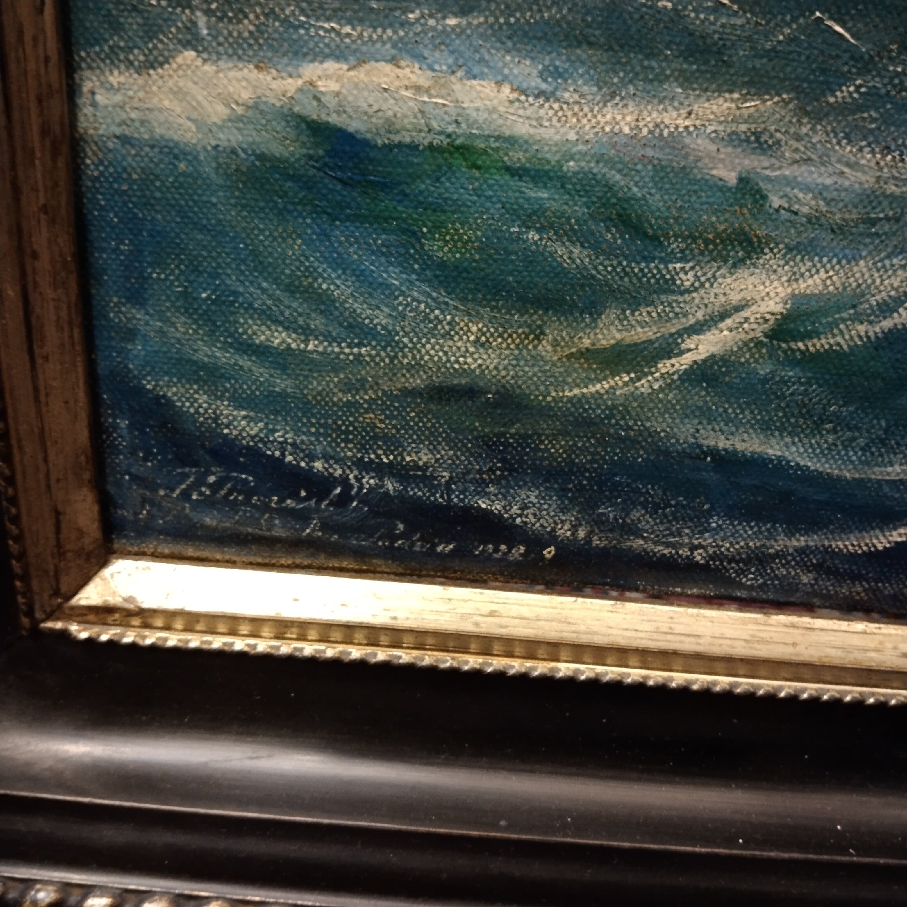 Óleo sobre tela del artista chileno Florentino Previst, representando un gran barco de velas blancas navegando en medio del mar. La obra está enmarcada elegantemente en madera pintada de negro y dorado.