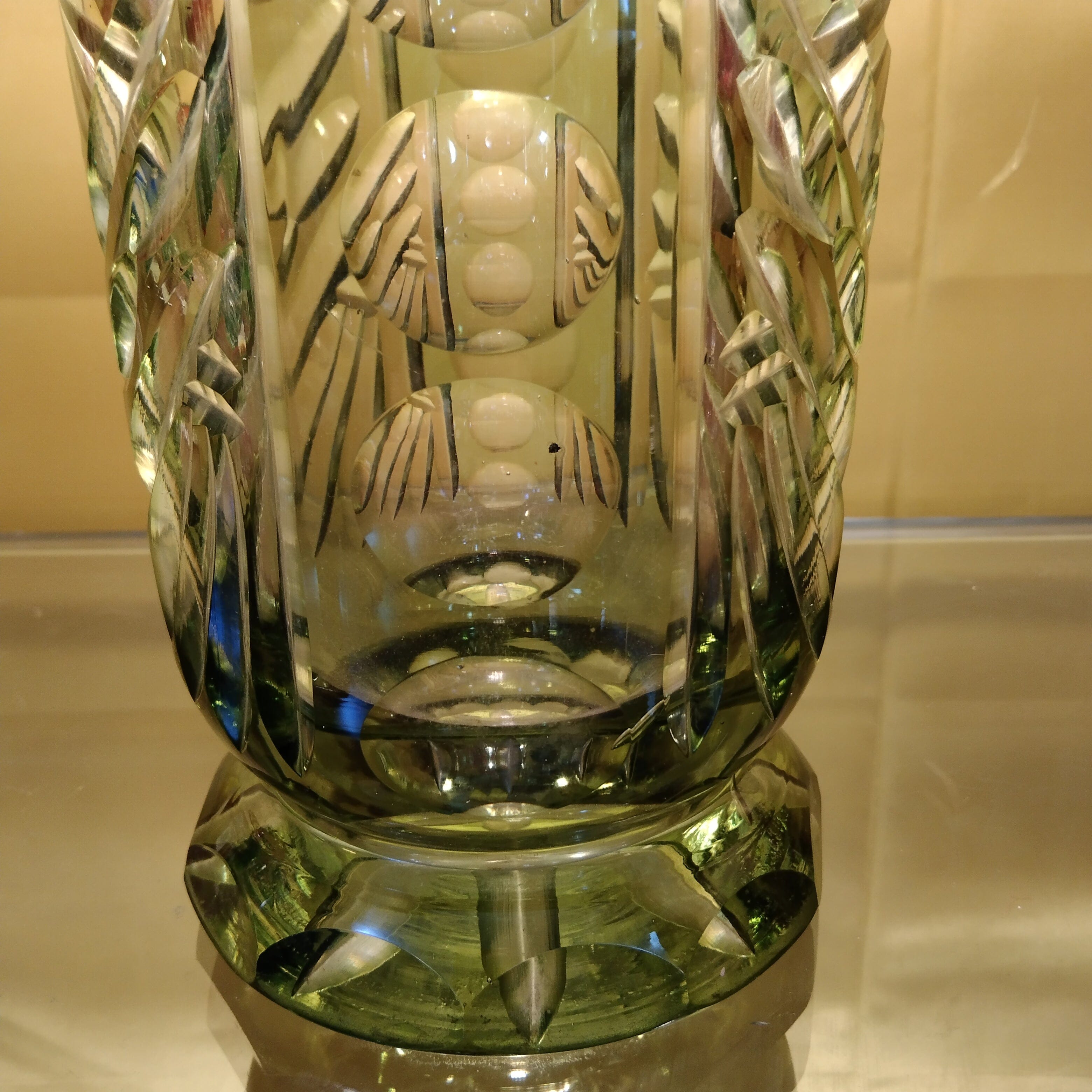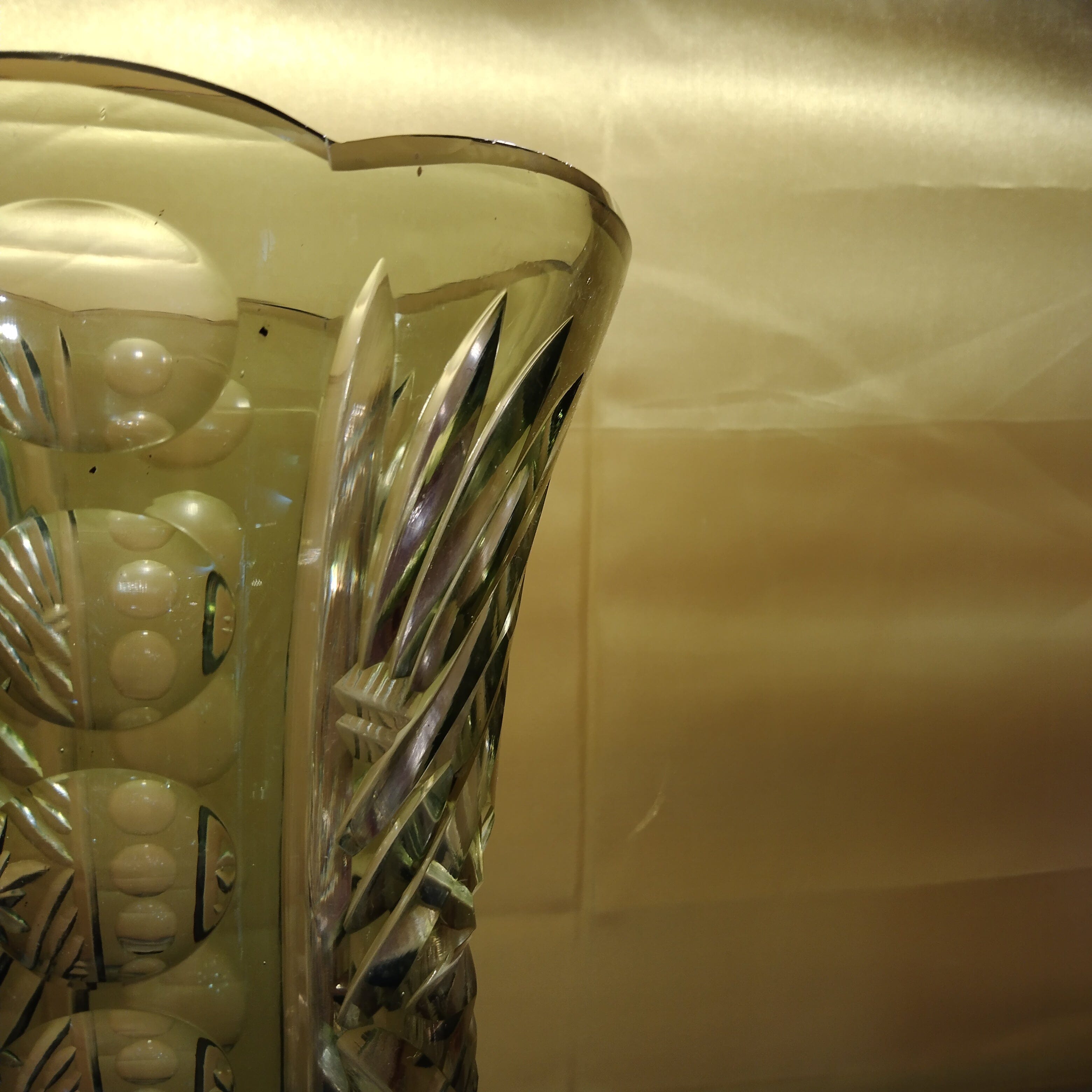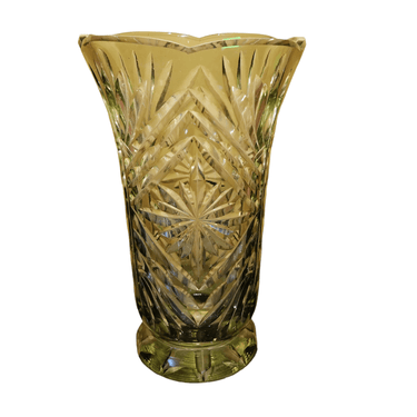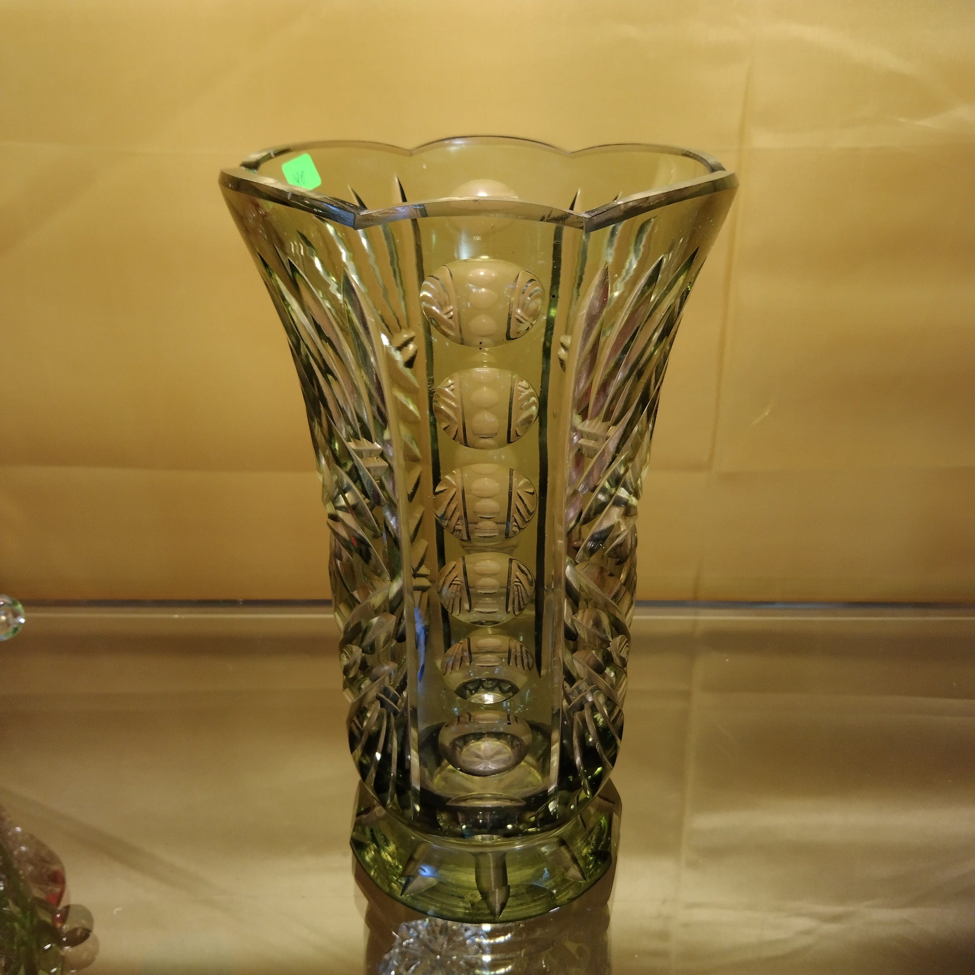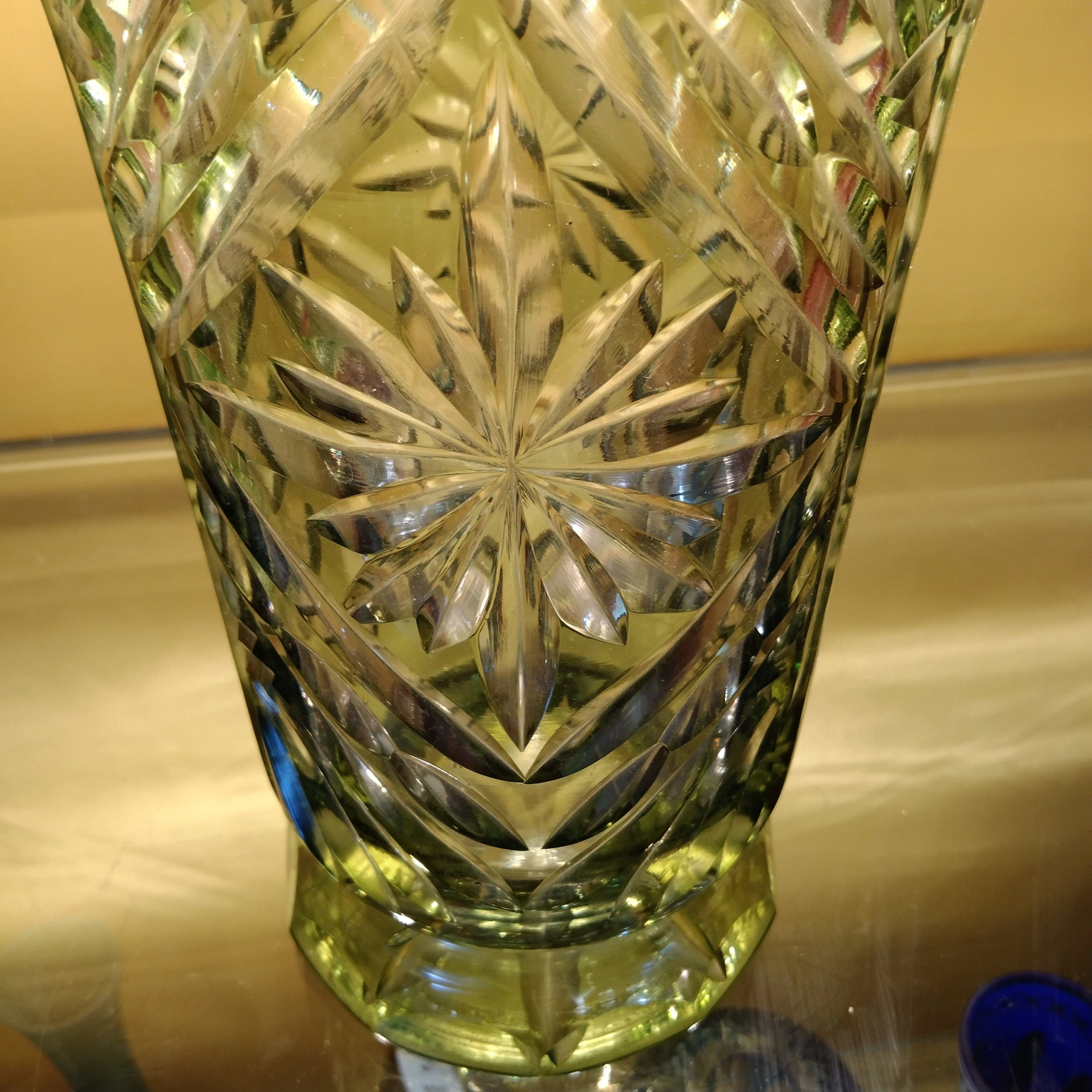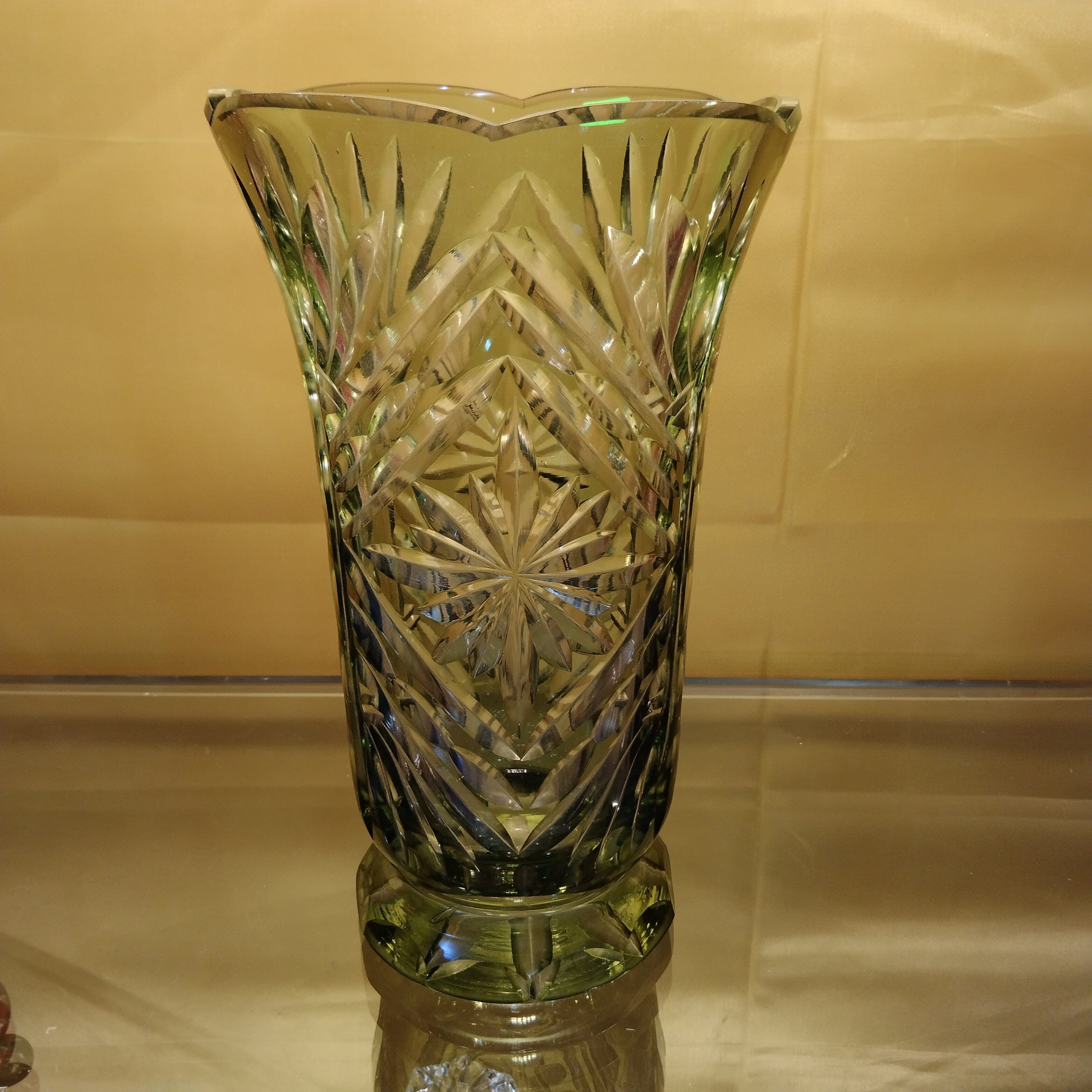 Elegante florero de vidrio, de origen francés, tallado con finos diseños geométricos en su superficie.