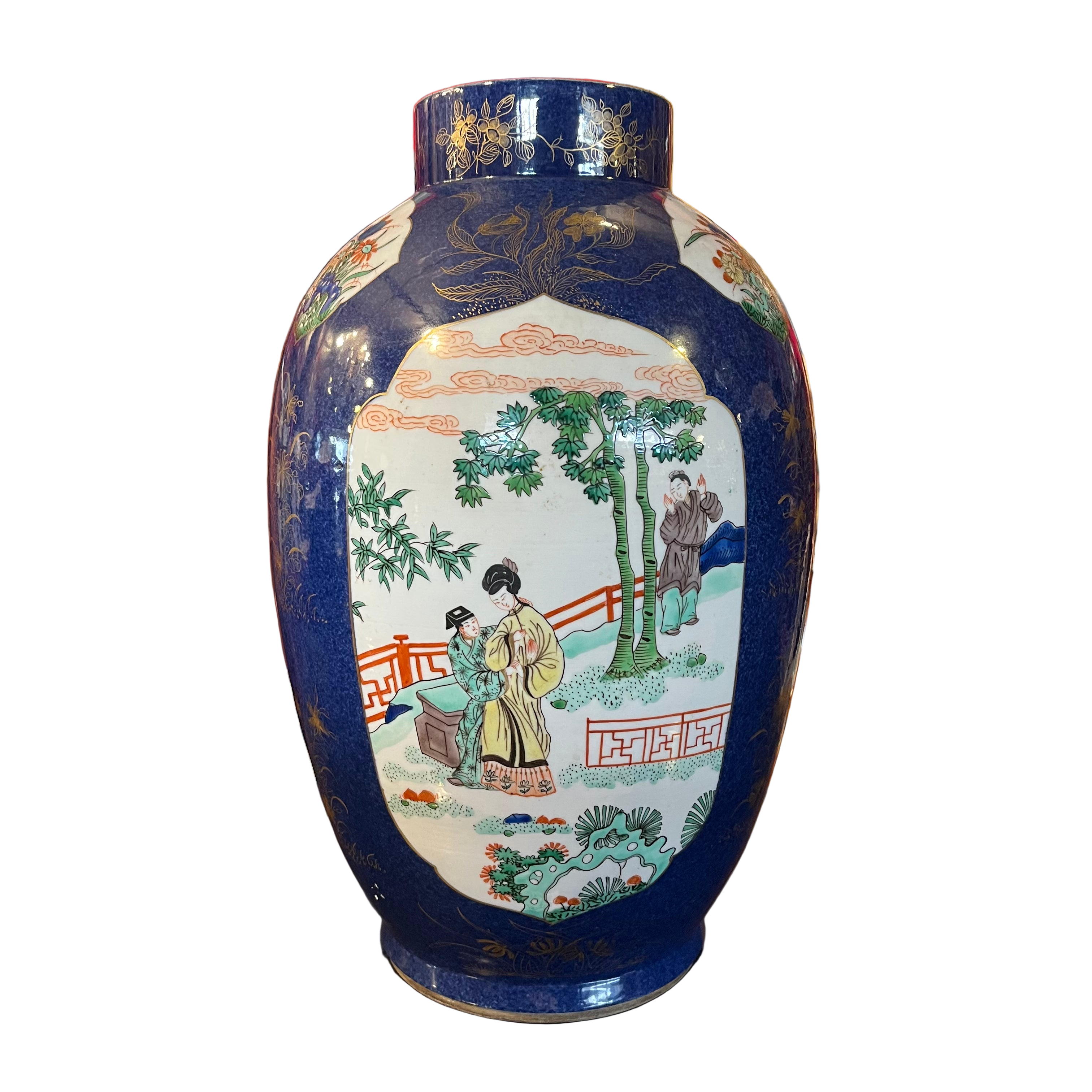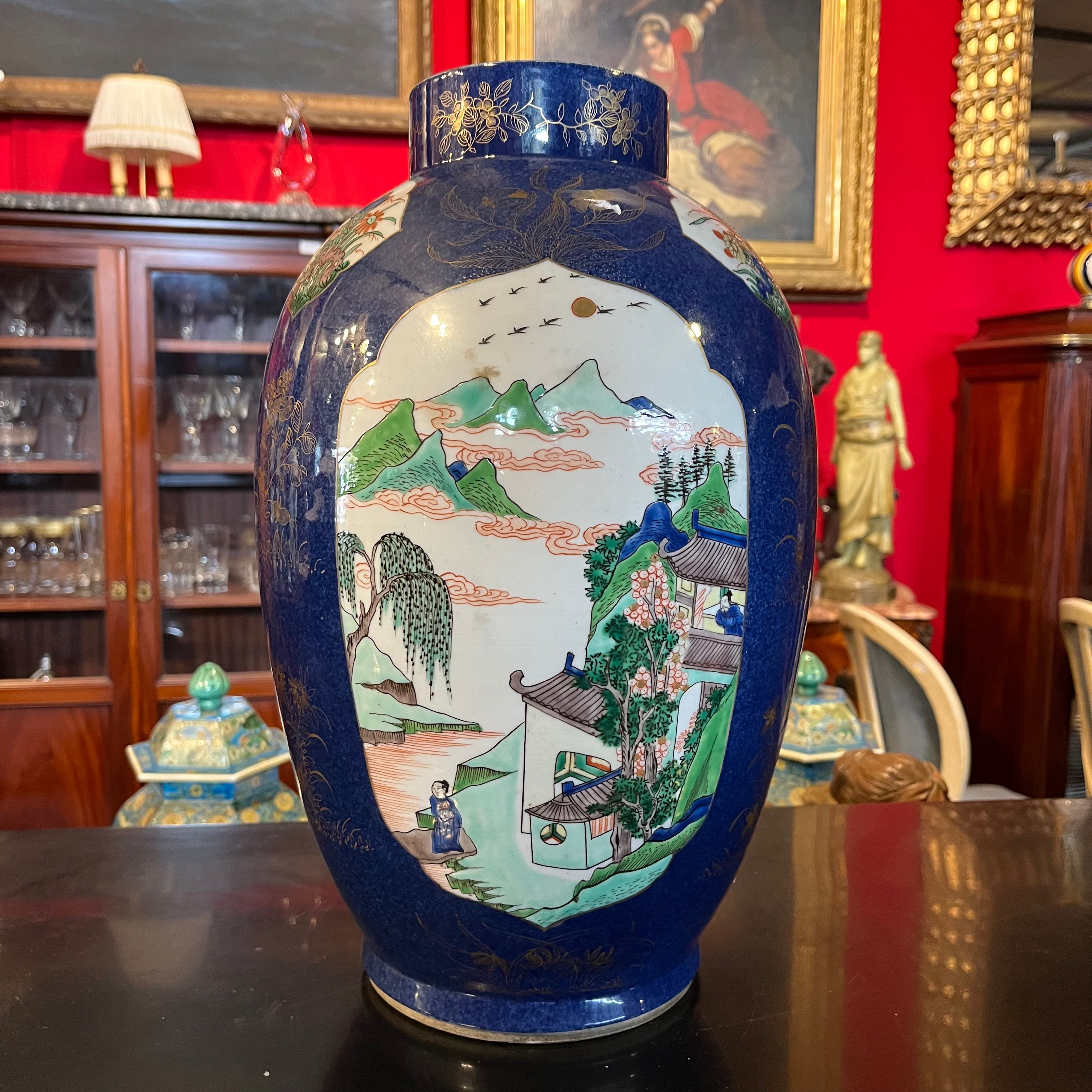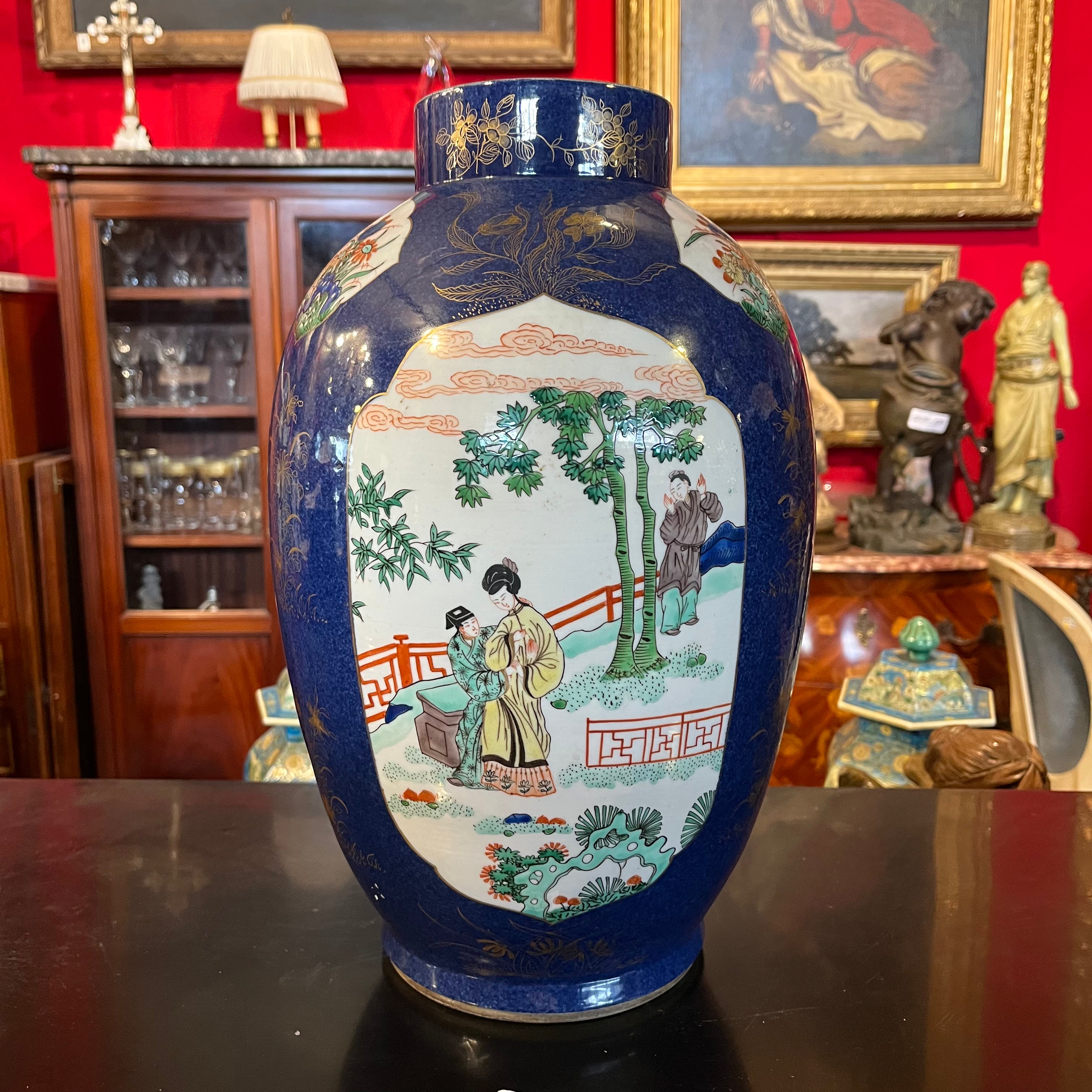 Jarrón de porcelana con decoración esmaltada de paisajes animados. Azul y dorado.