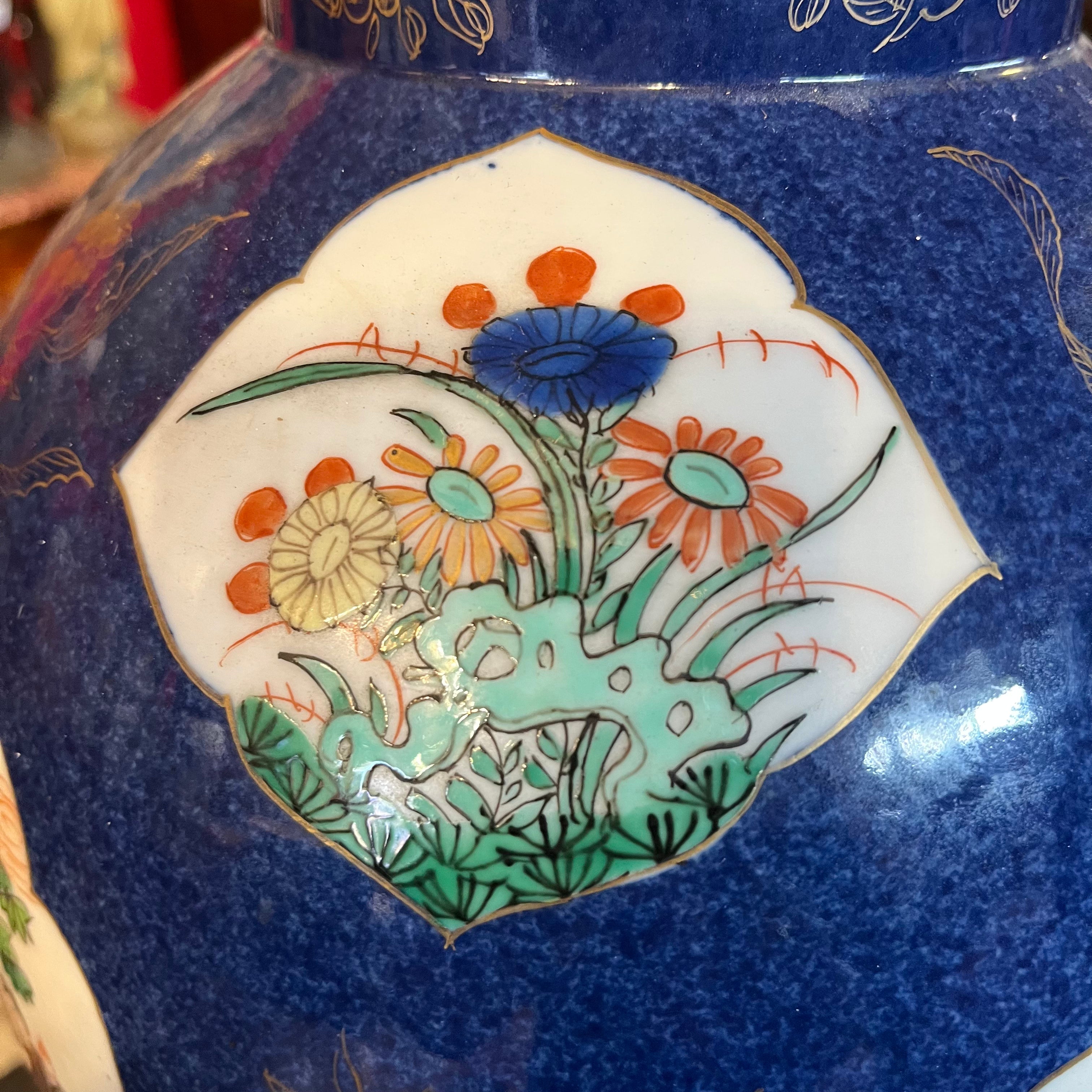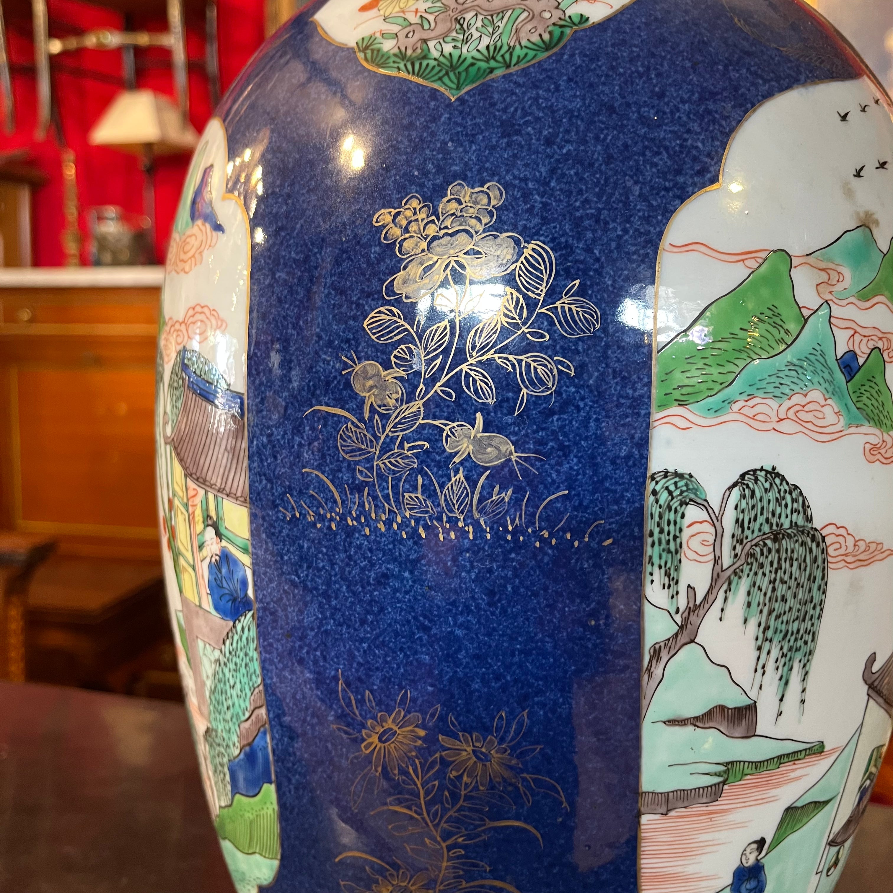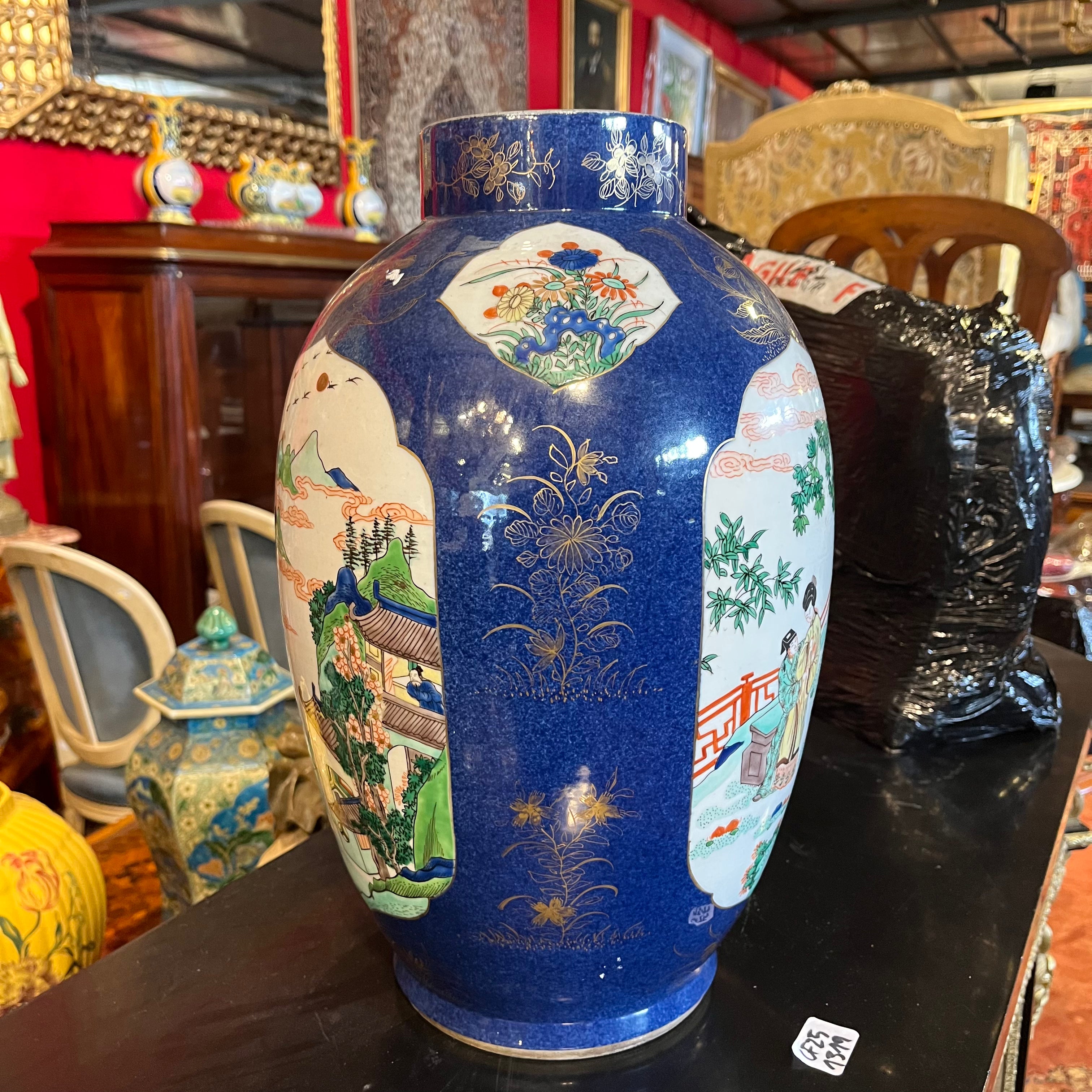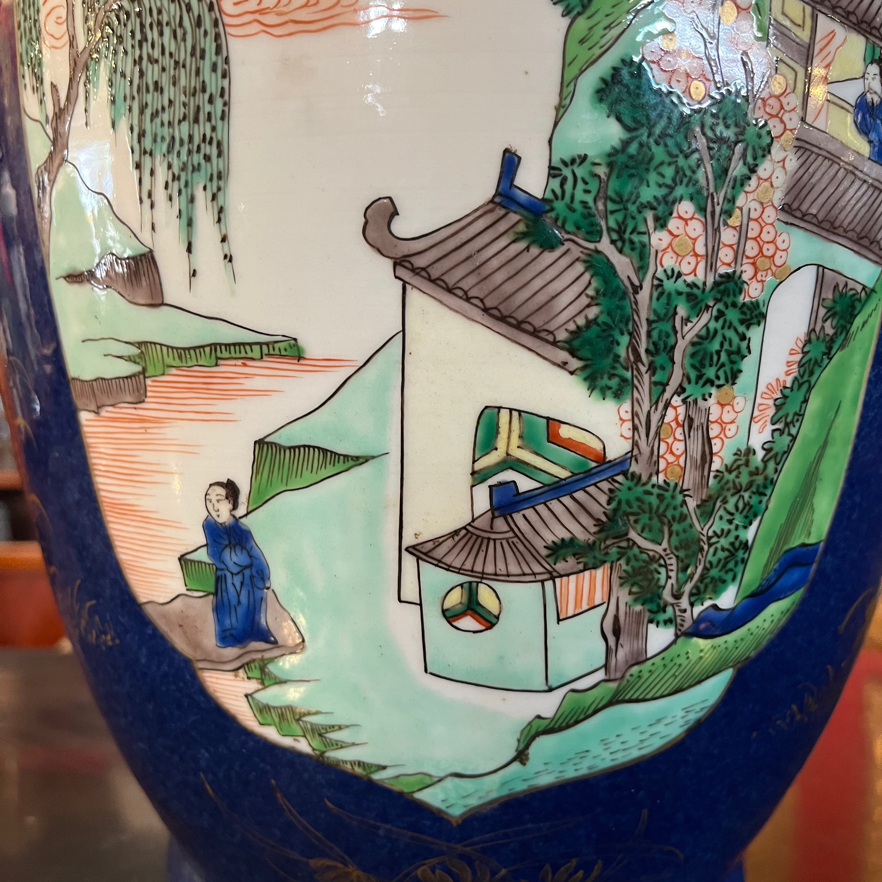 Jarrón de porcelana con decoración esmaltada de paisajes animados. Azul y dorado.