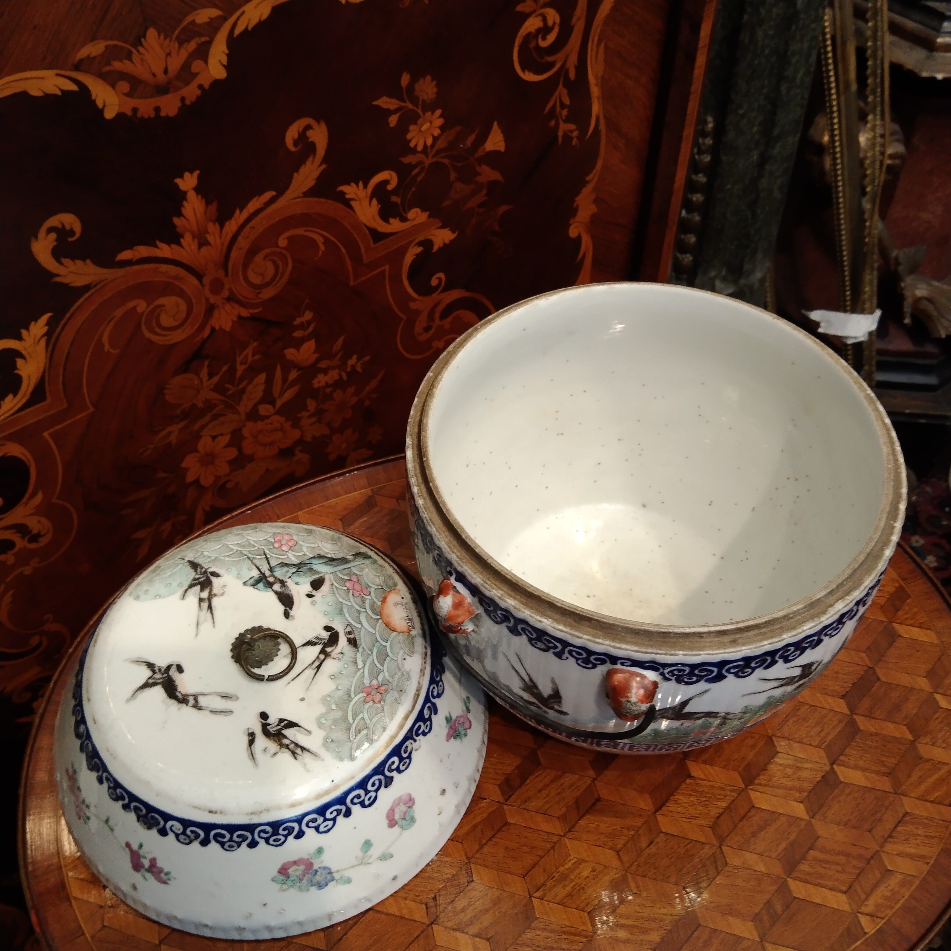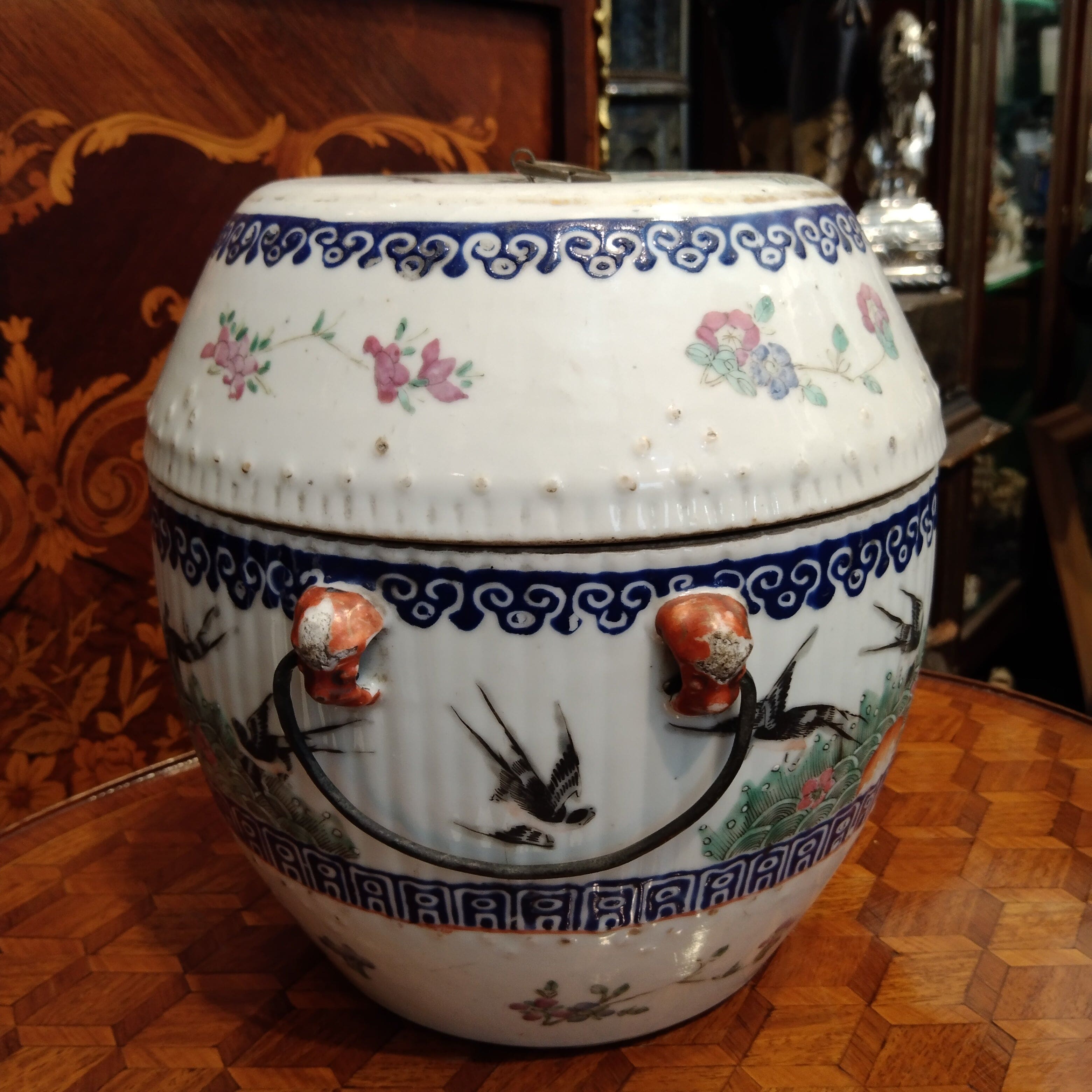 Bellísimo jarrón de porcelana oriental, perteneciente a la época del Compagnie des Indes, con diseños florales y dibujos a mano de aves. La pieza cuenta con una tapa con asas en forma de argolla.