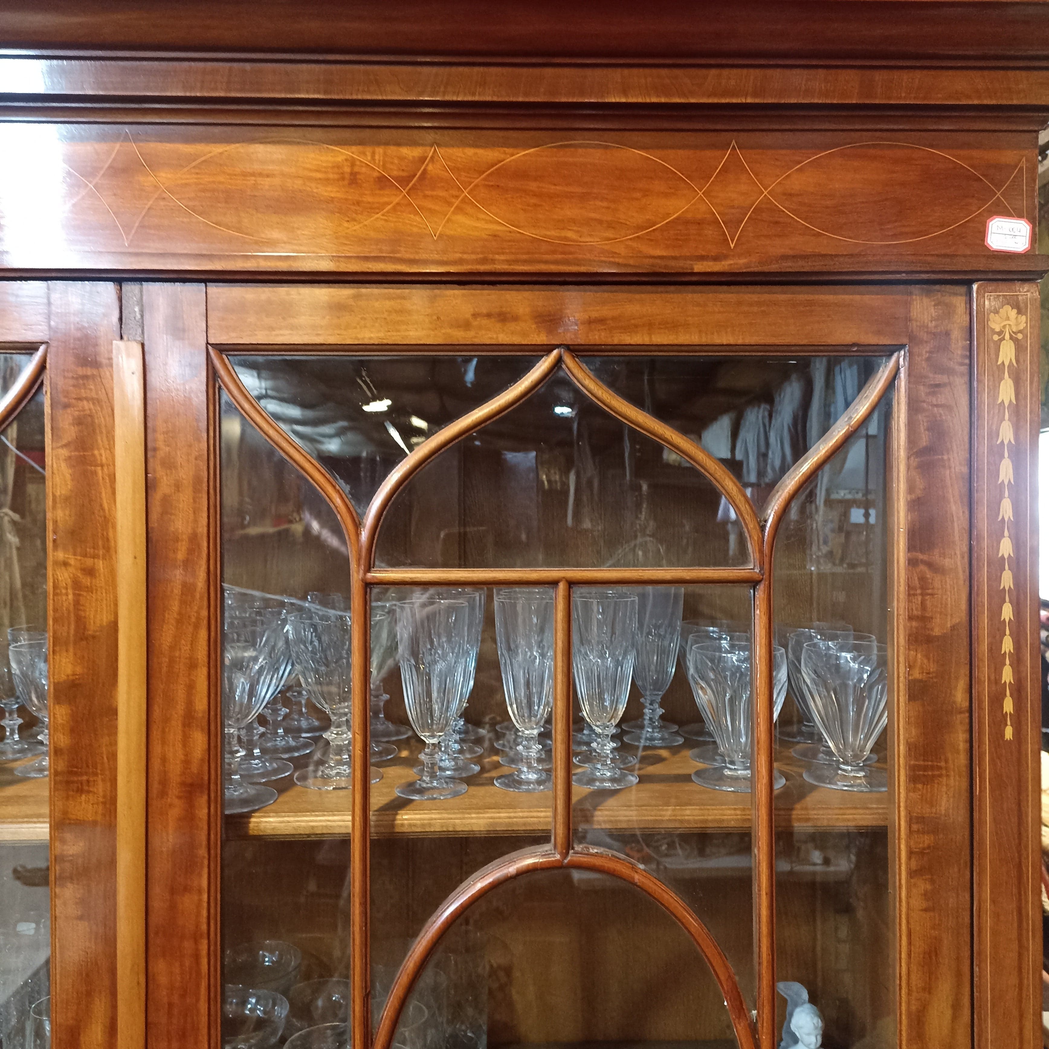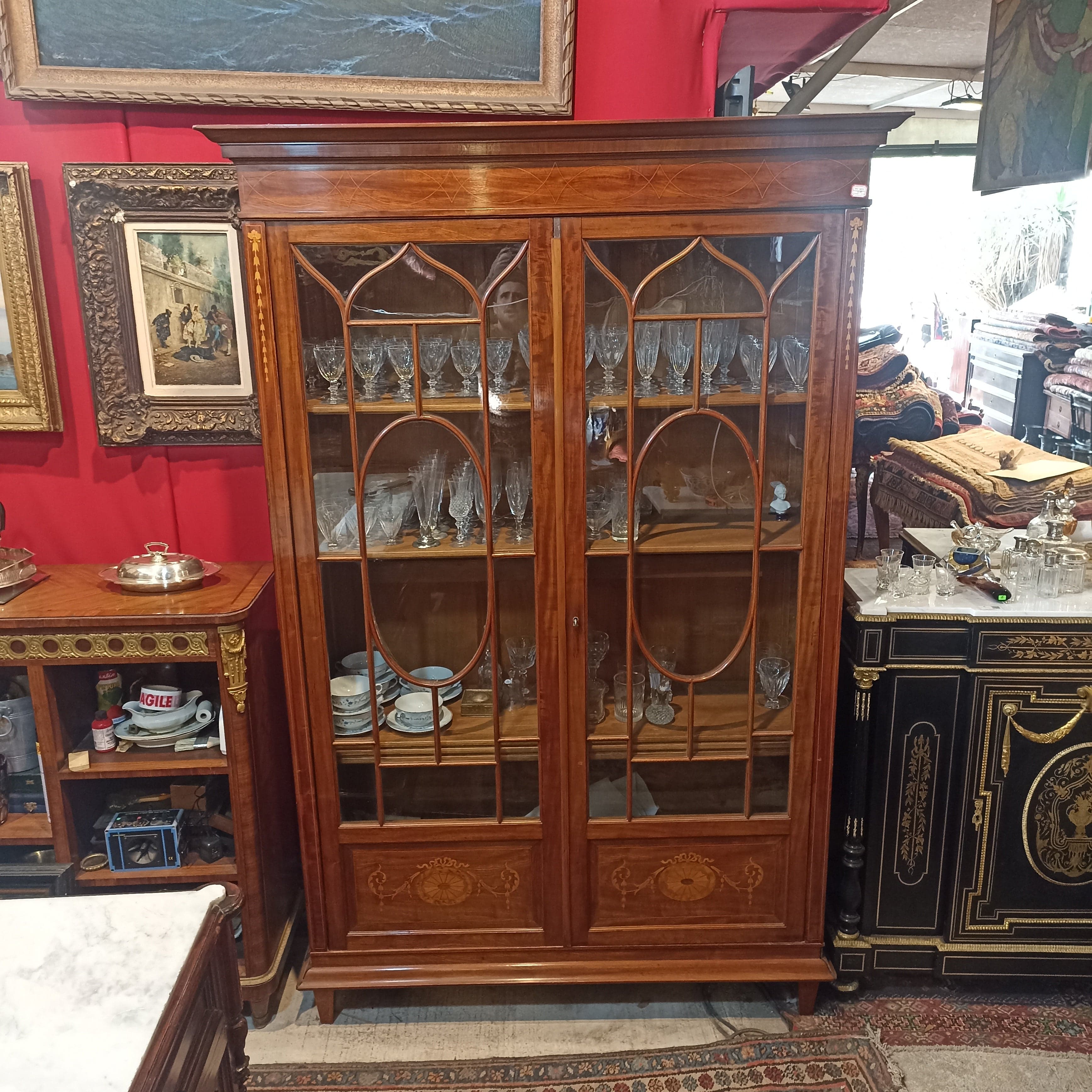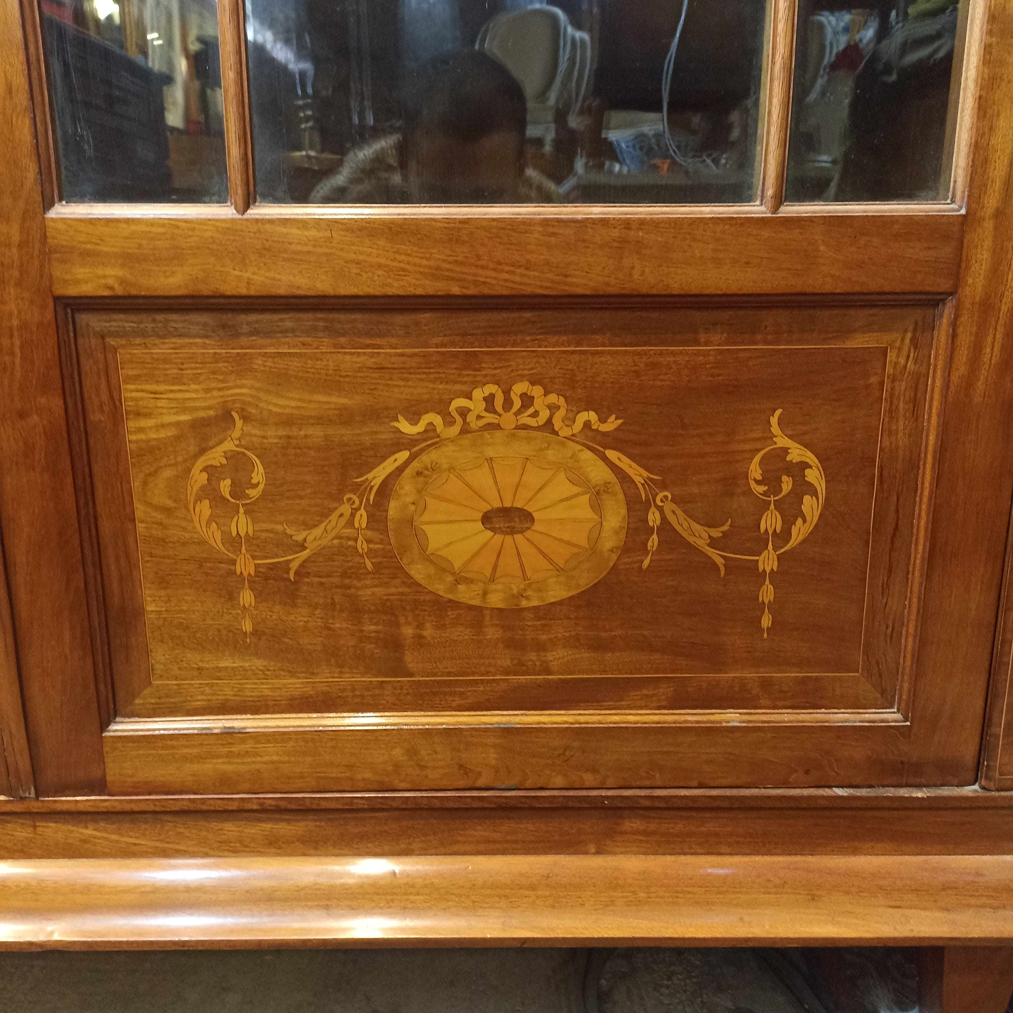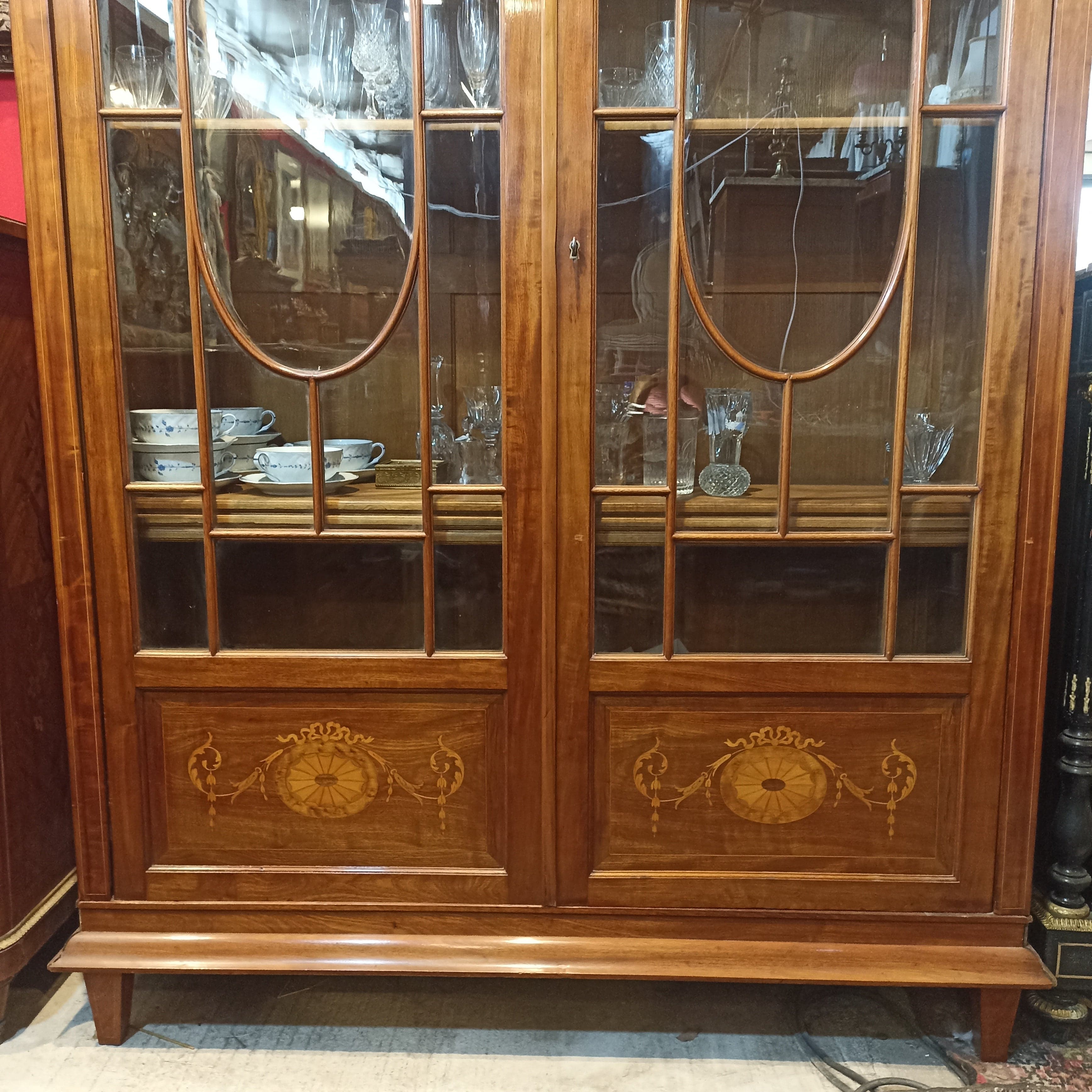 Elegante vitrina de gran tamaño estilo Edwardian, con bellos diseños sobre su vidrio y marquetería. La vitrina cuenta con 5 estantes internos y amplio espacio de almacenaje.