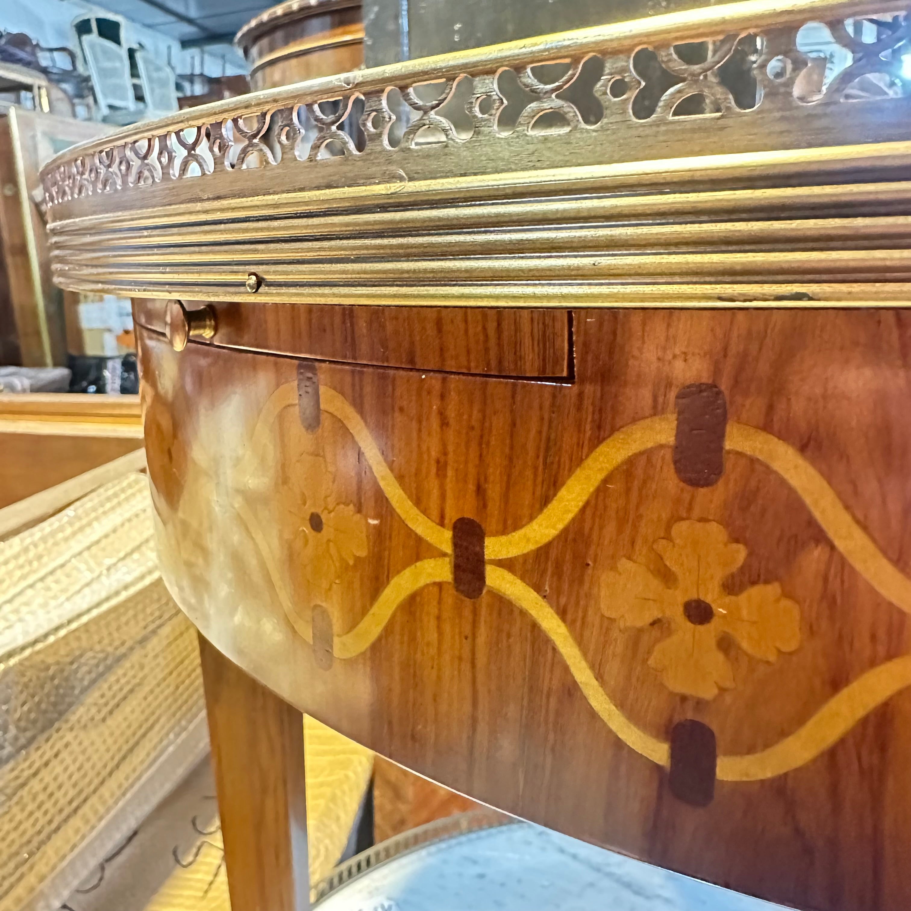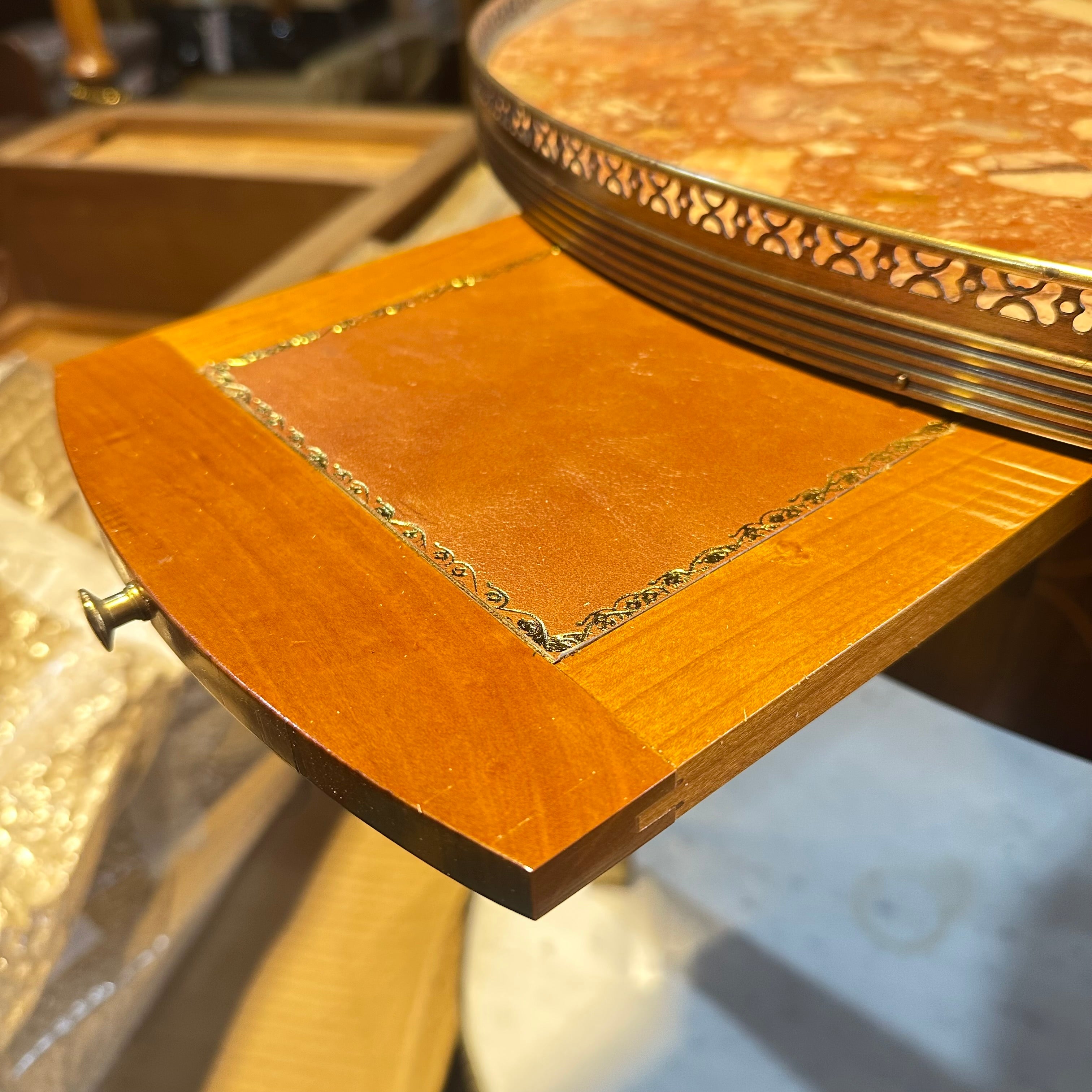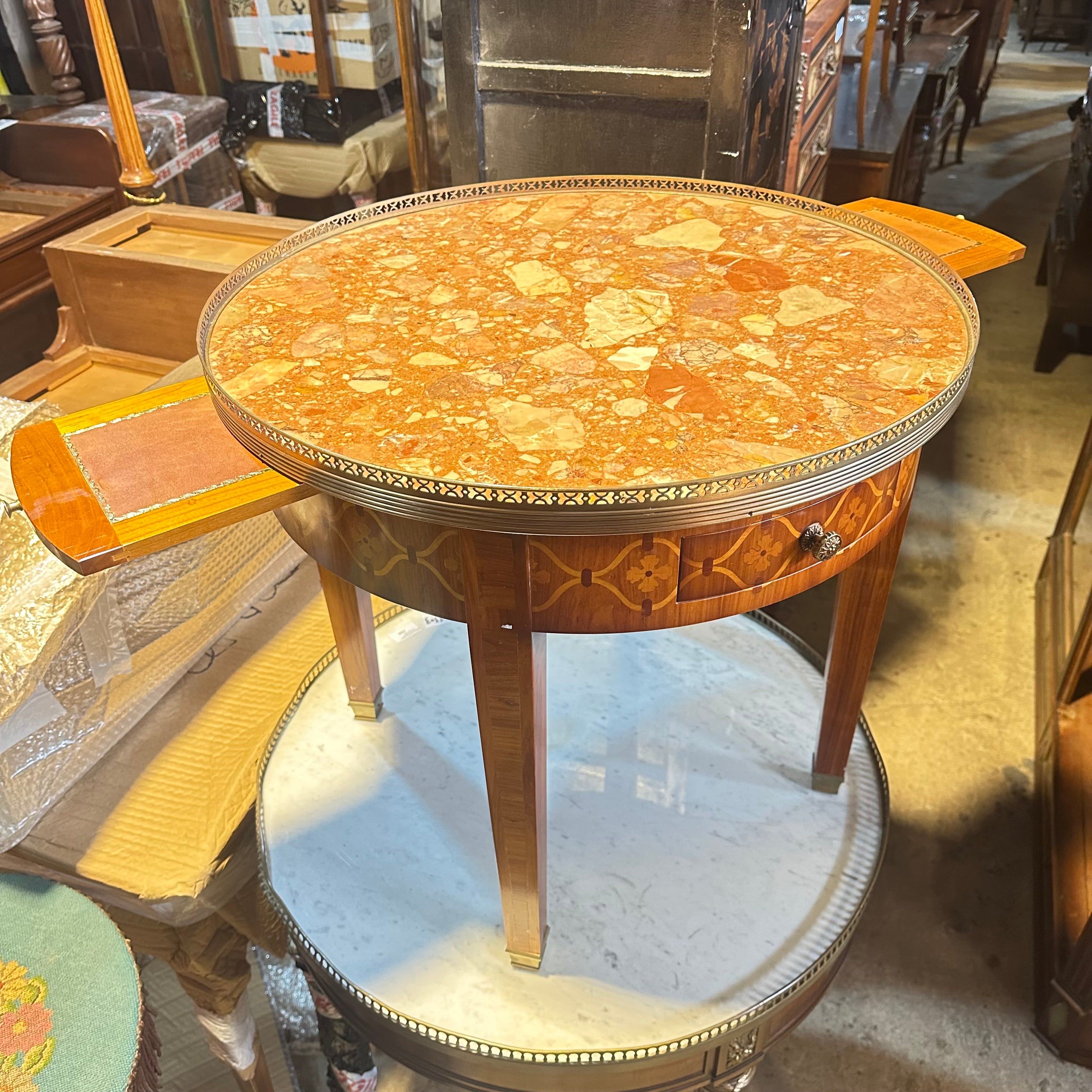 Estupenda mesa bouillotte, de origen francés estilo Luis XVI y fabricación moderna, hecha de madera Madera enchapada en caoba, patas rectas, galería de latón y cubierta mármol brèche d'Alep. Se trata de una pieza muy especial, ya que cuenta con dos cajones para almacenar las cartas y dos extensiones pequeñas, ambas cubiertas de cuero con detalles pintados a mano en dorado.