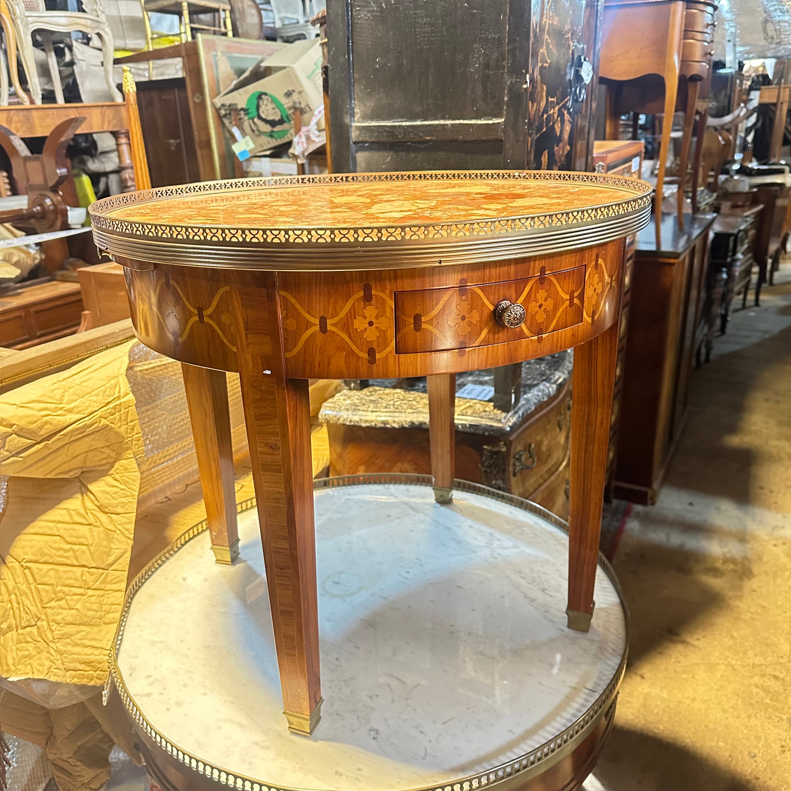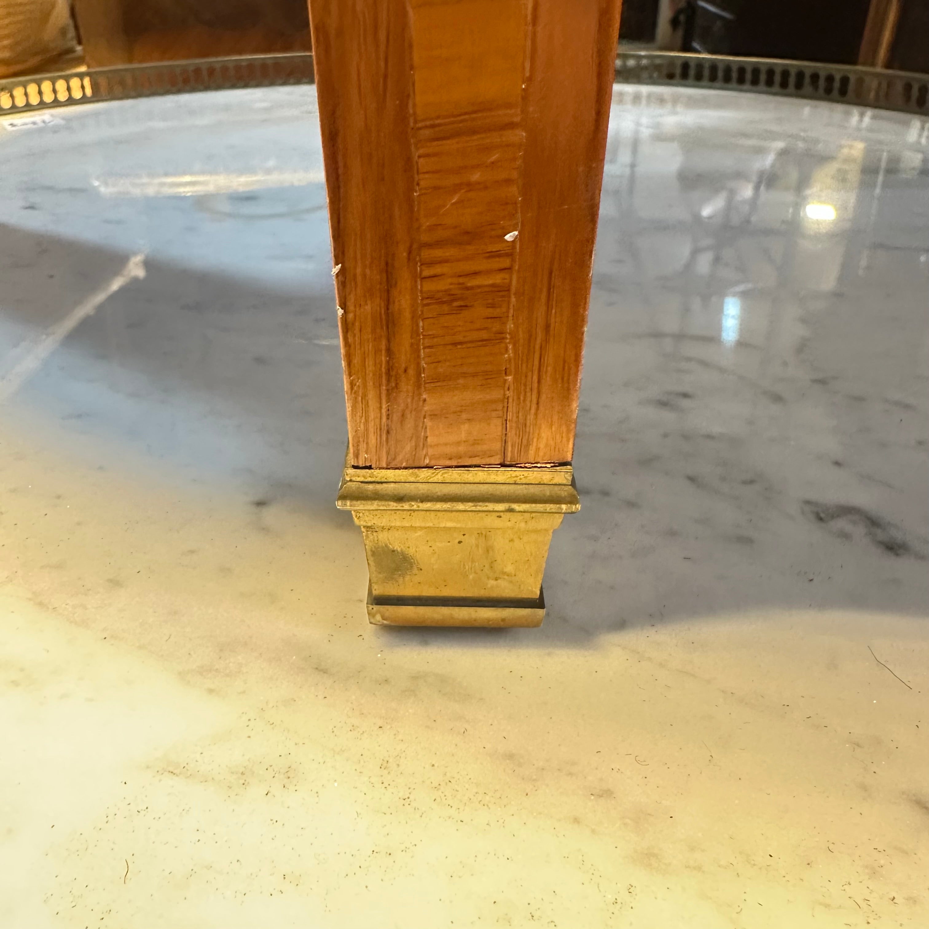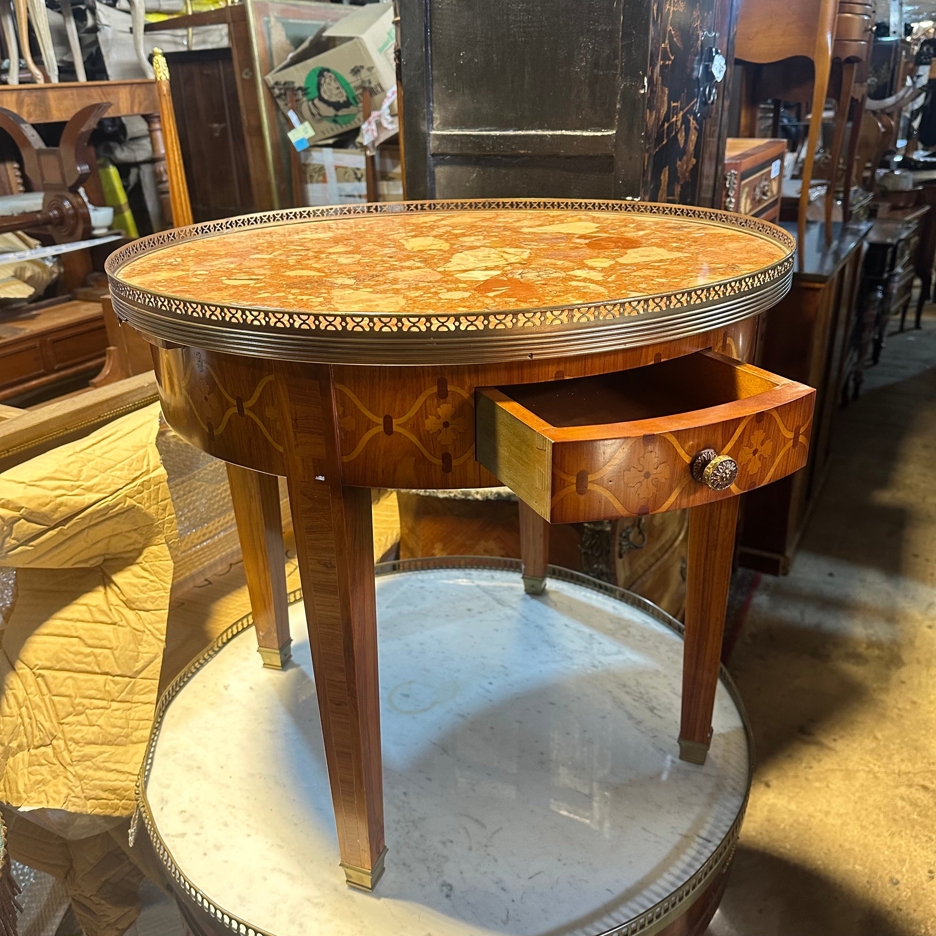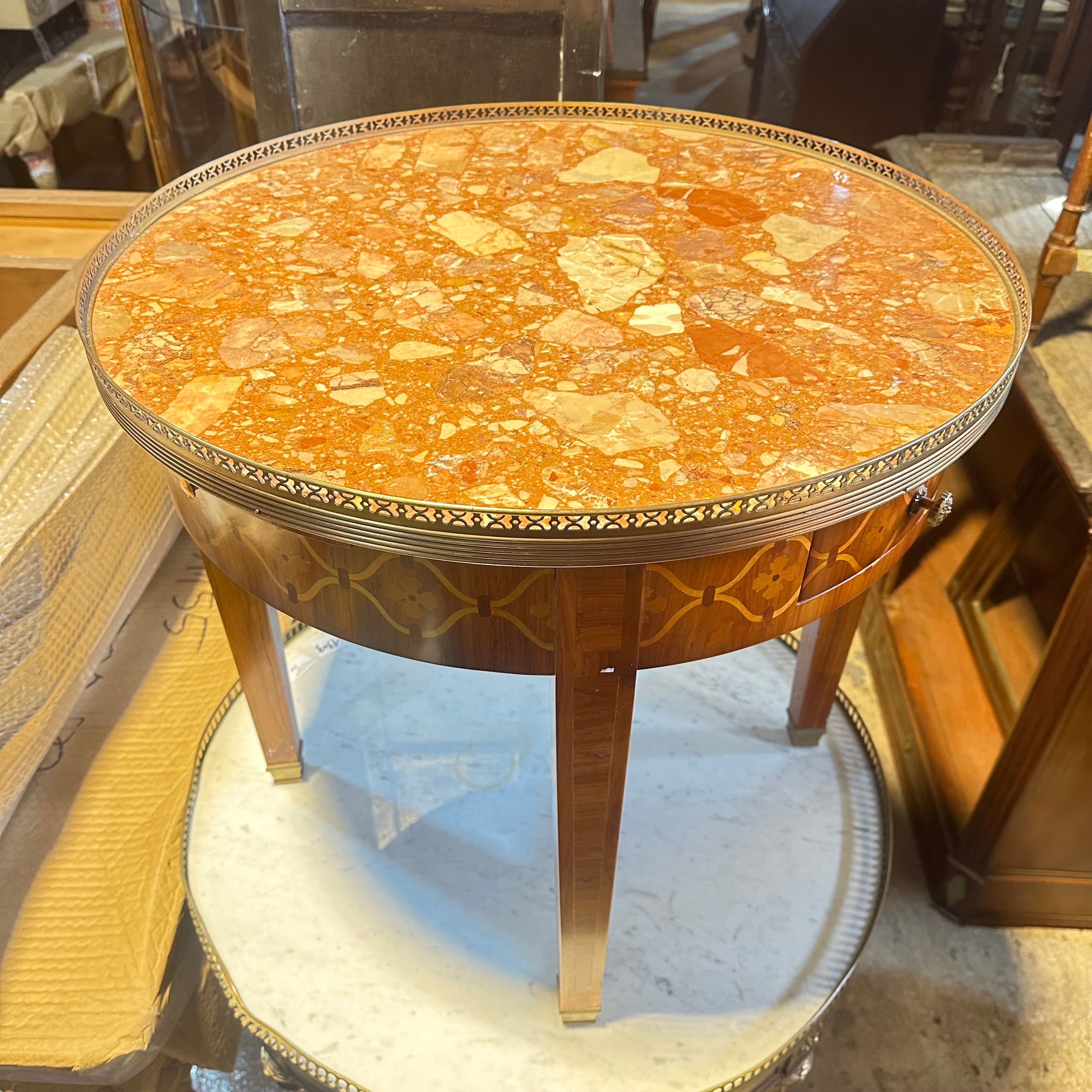 Estupenda mesa bouillotte, de origen francés estilo Luis XVI y fabricación moderna, hecha de madera Madera enchapada en caoba, patas rectas, galería de latón y cubierta mármol brèche d'Alep. Se trata de una pieza muy especial, ya que cuenta con dos cajones para almacenar las cartas y dos extensiones pequeñas, ambas cubiertas de cuero con detalles pintados a mano en dorado.