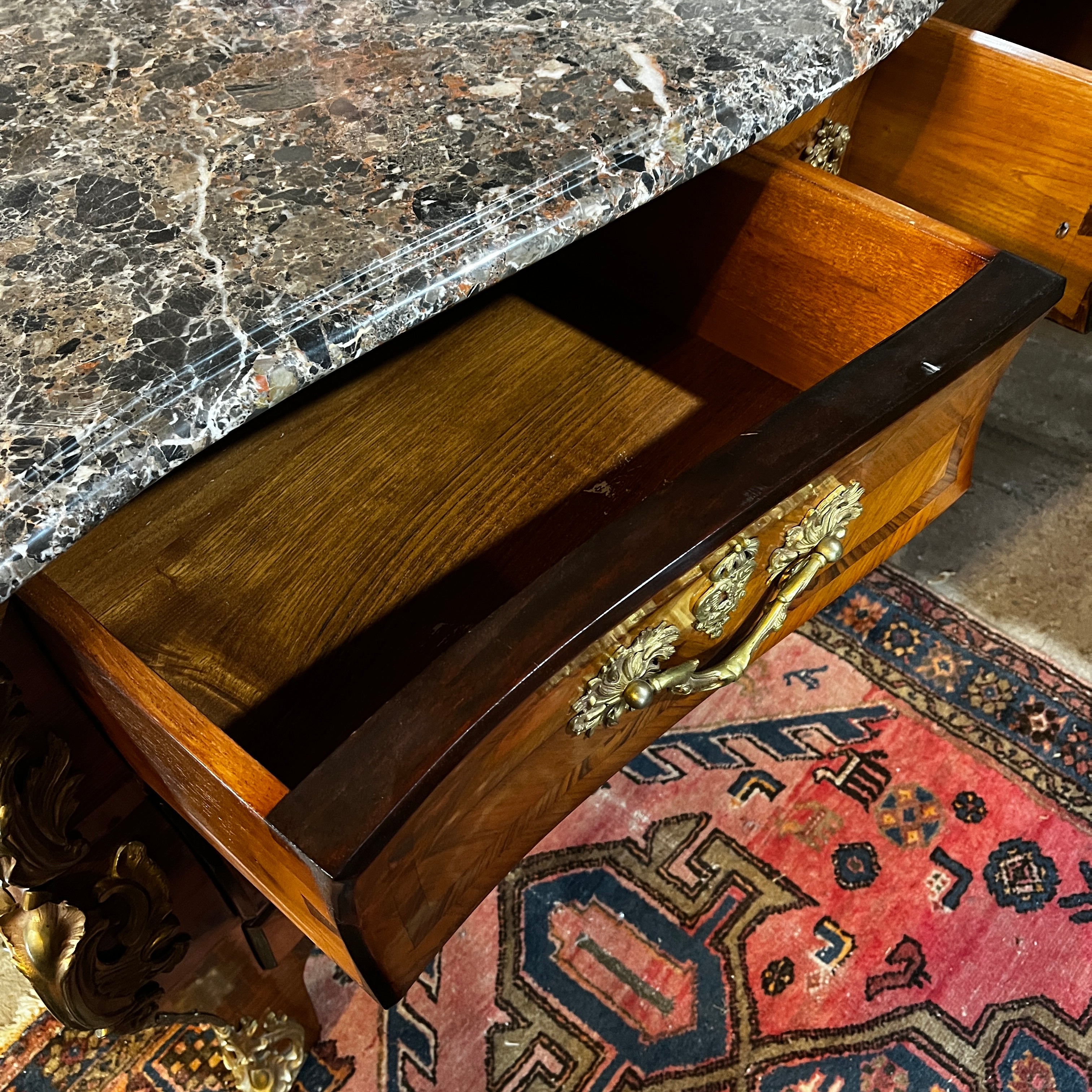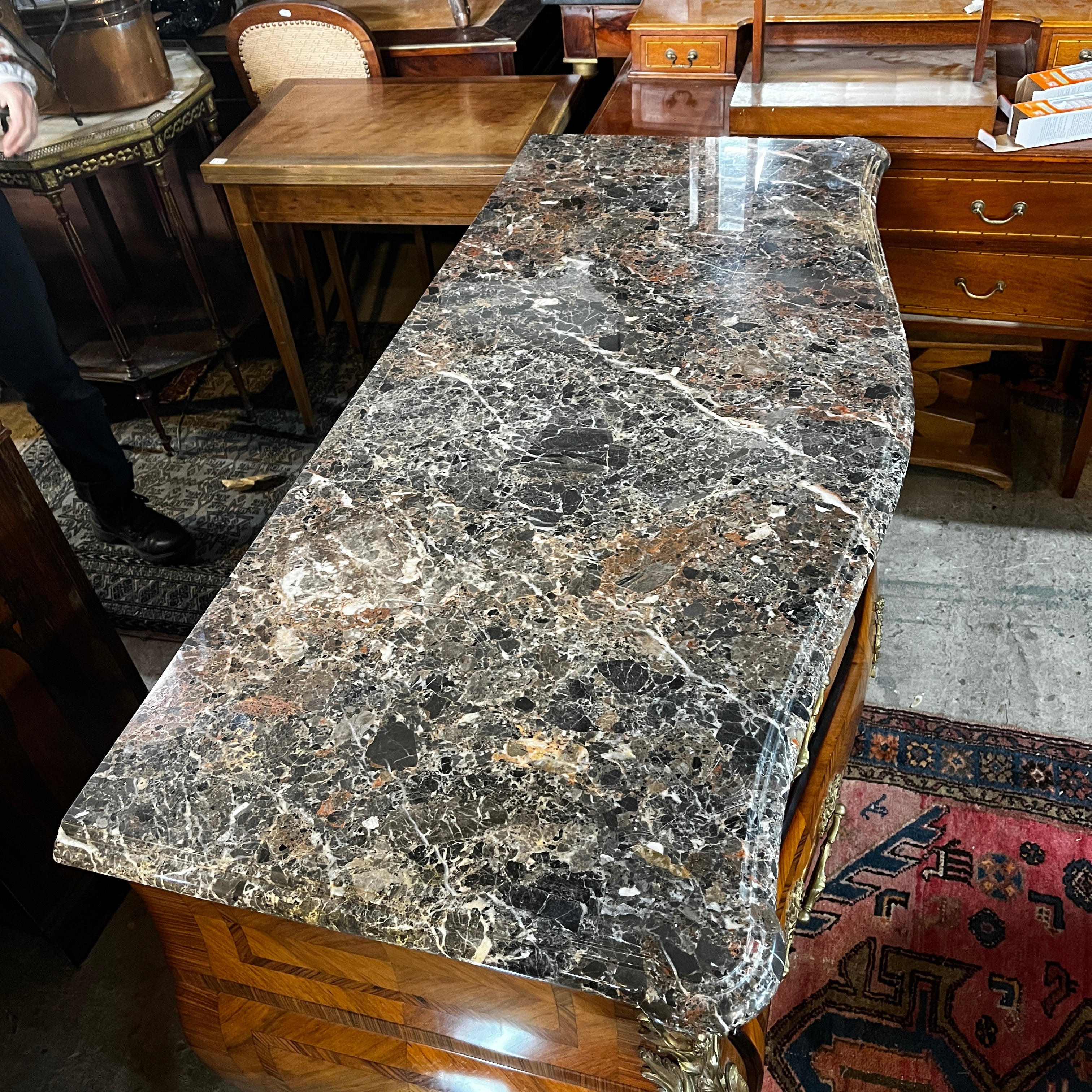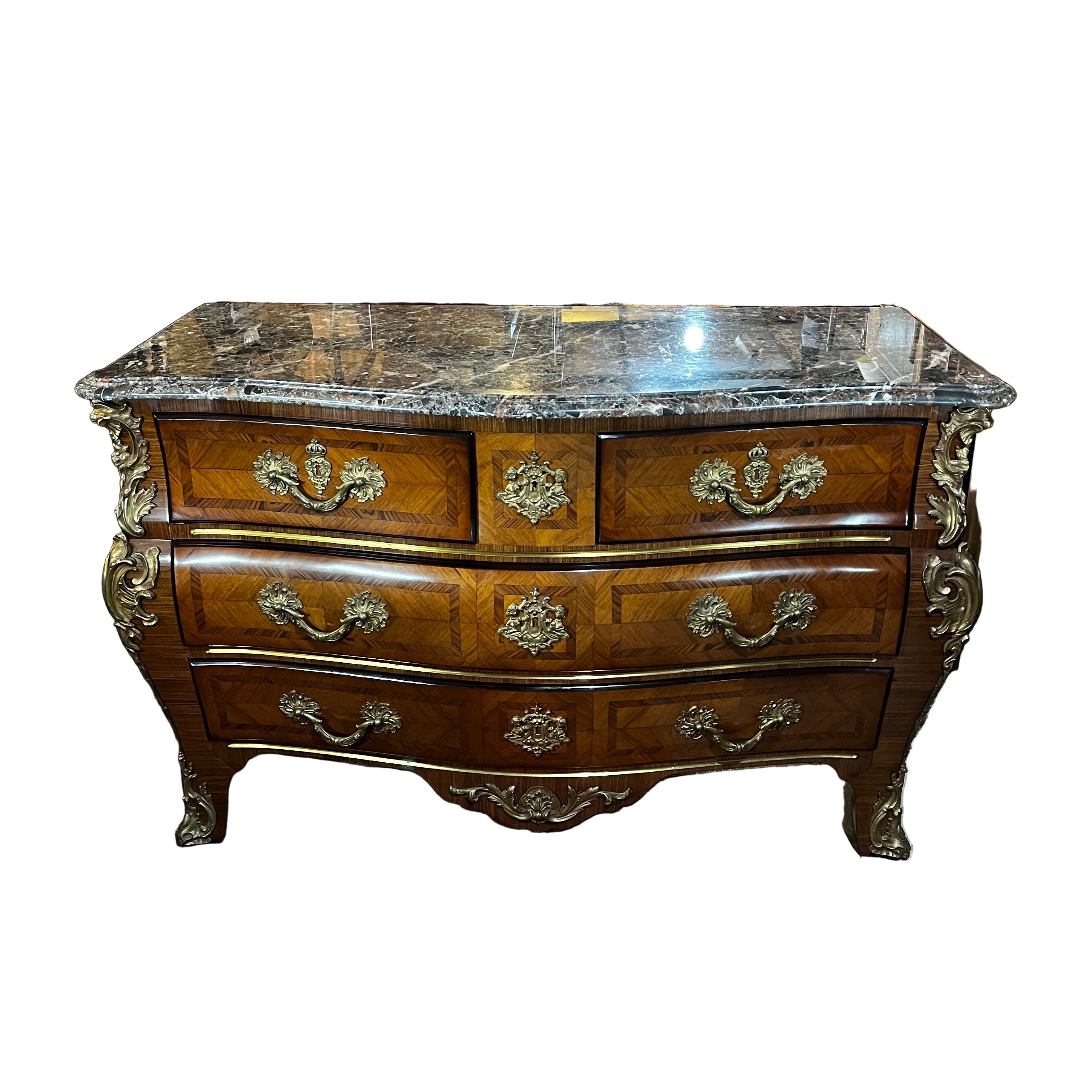 Gran cómoda tipo Tombeau en estilo Regencia, de fabricación contemporánea, a manos del ebanista René Barde, en replica de la original de Claude Charles Saulnier (1735-1805). Dos cajones superiores paralelos y dos amplios cajones inferiores. Madera enchapada, marquetería de filetes, bronces dorados (coronas, esfinges), mármol brèche Brocatelle. Firmada René Barde. Francia, 2001.