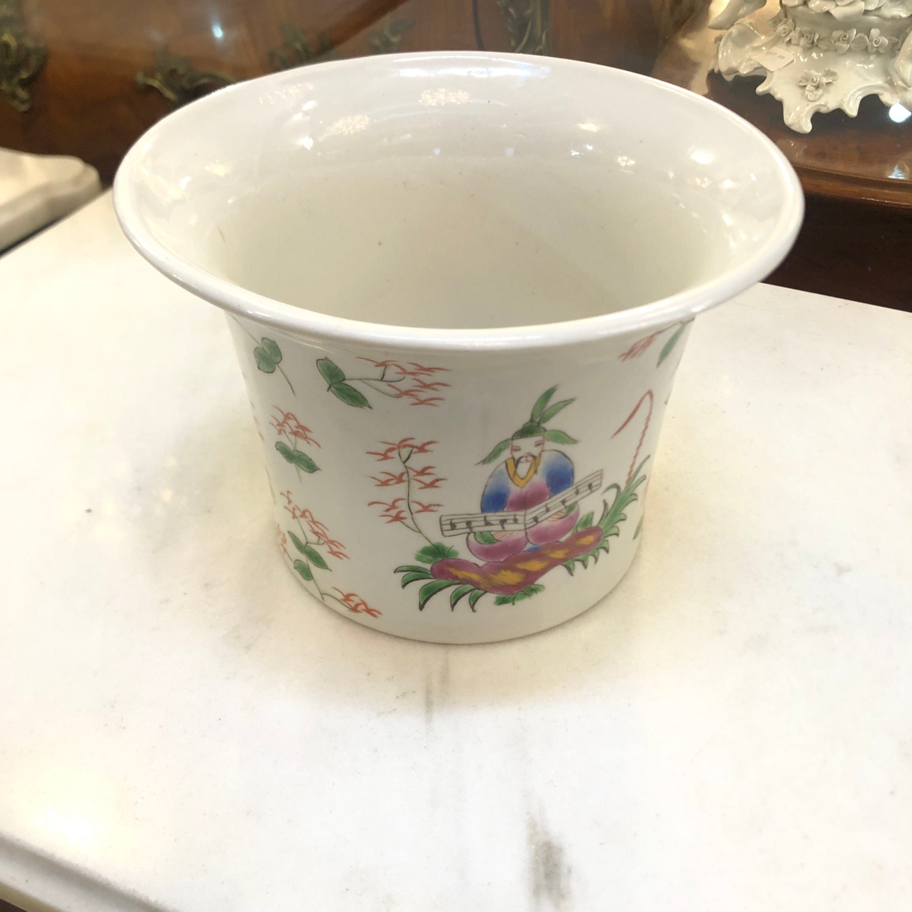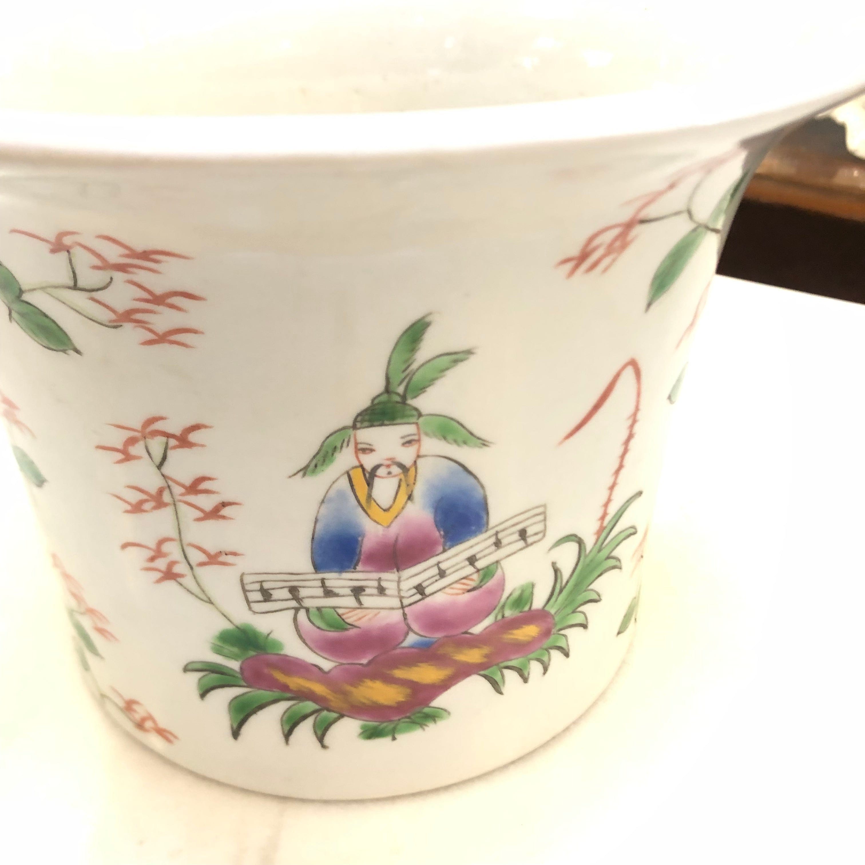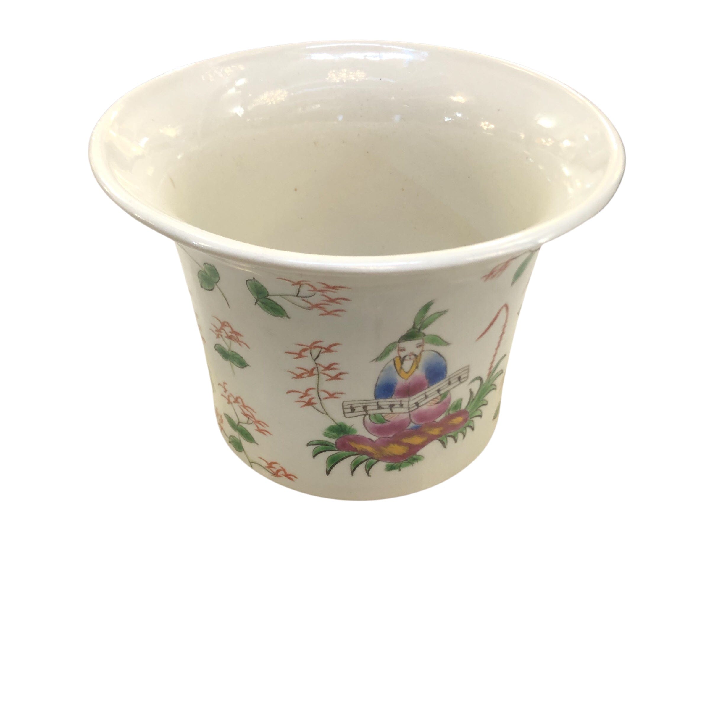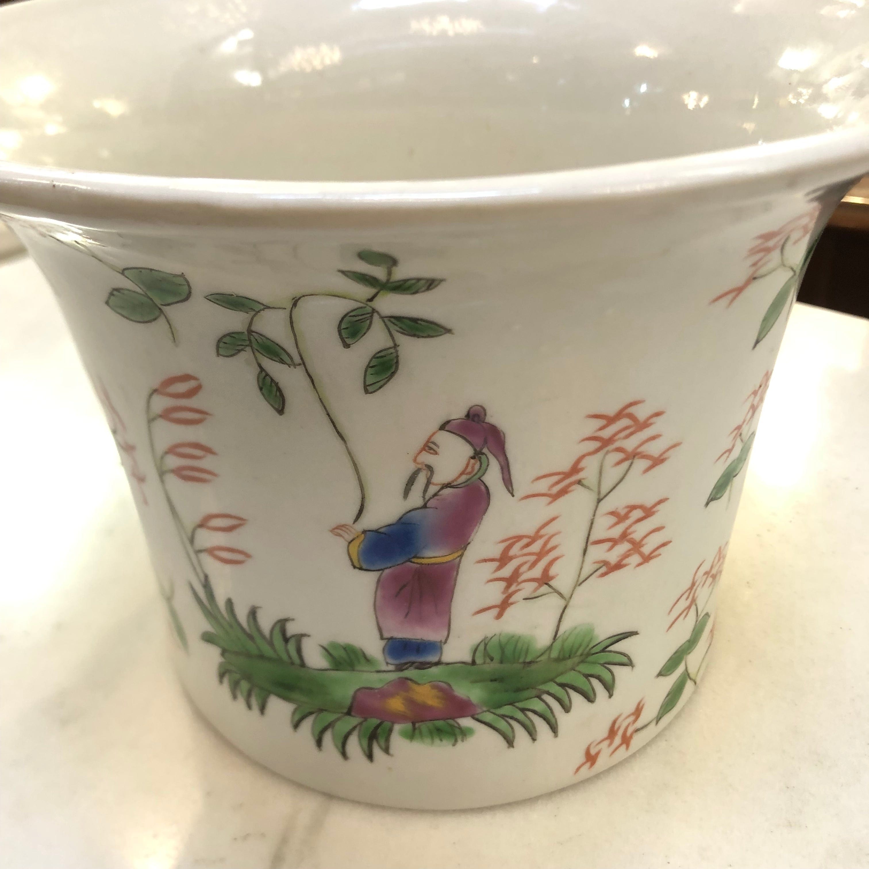 Bella Jardinera de porcelana de origen chino, diseño de diferentes personajes en un jardin, colores verdes, rosados, azul y amarillo.
