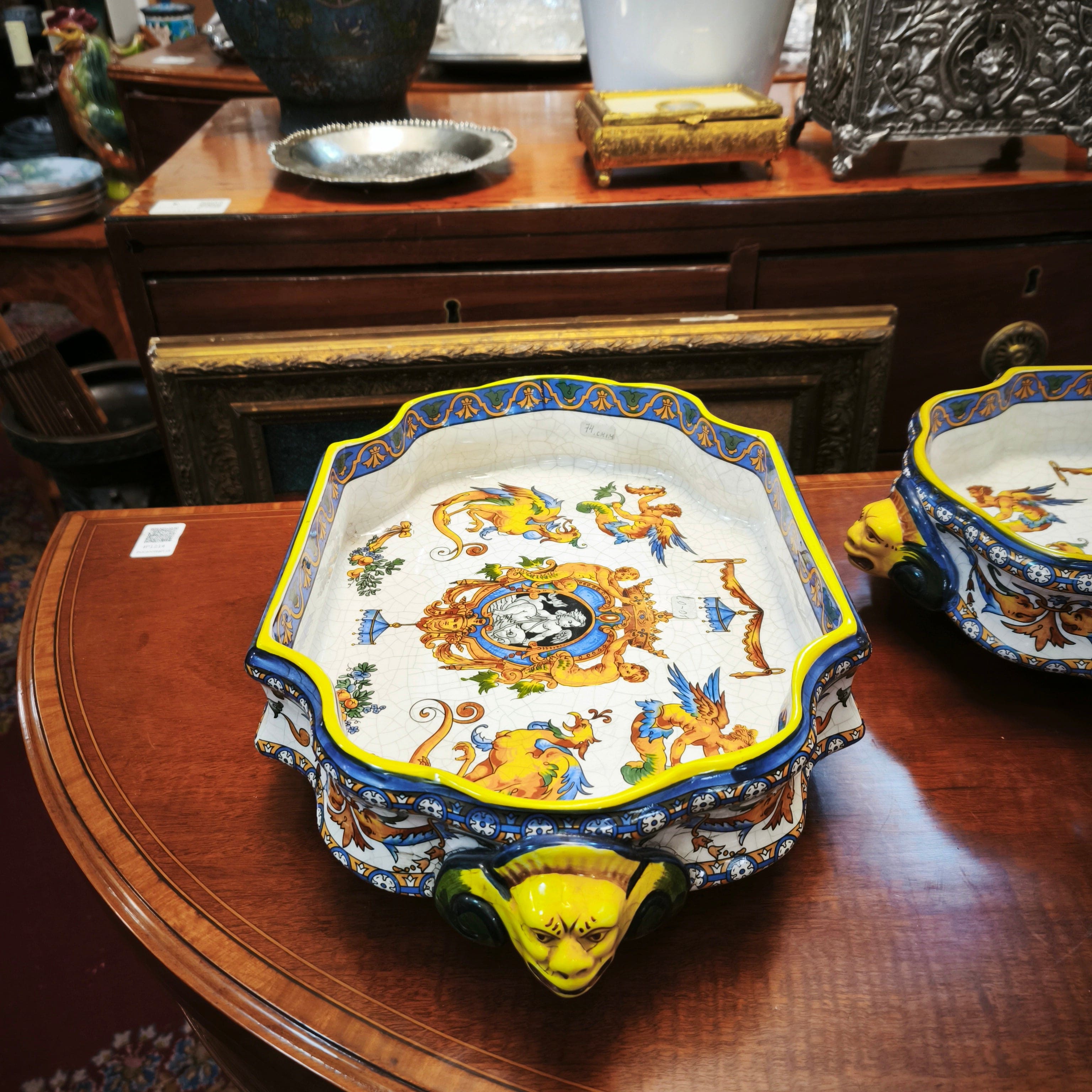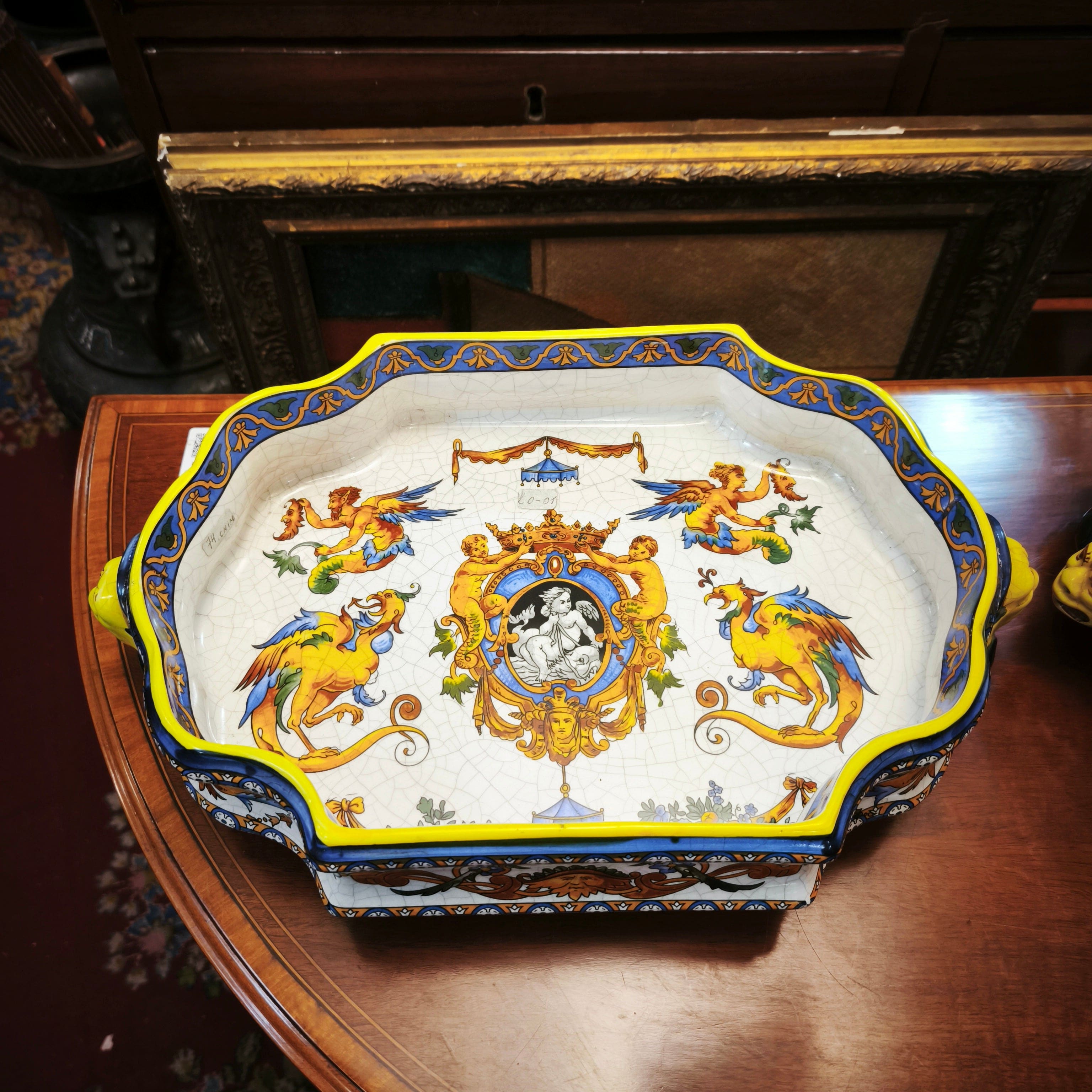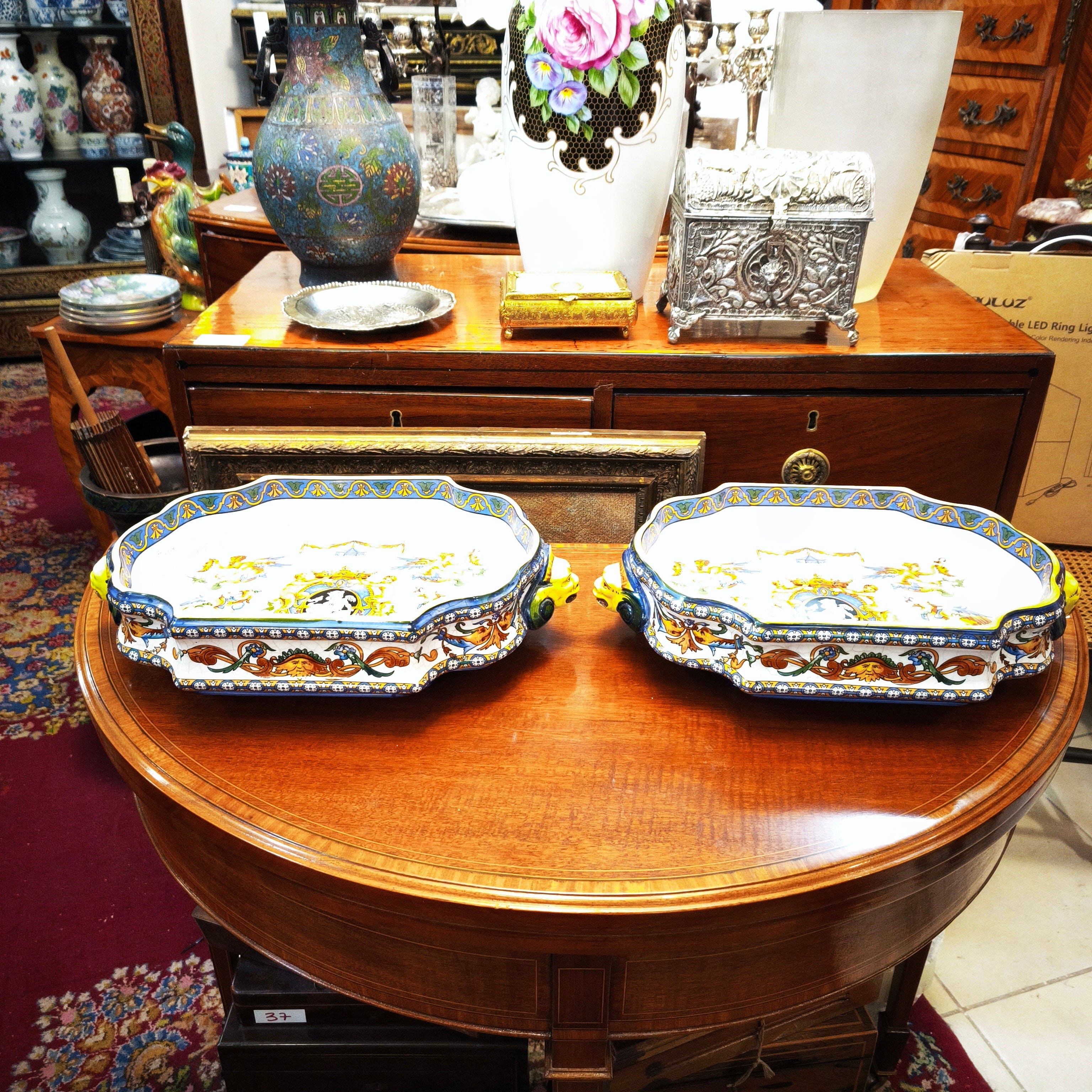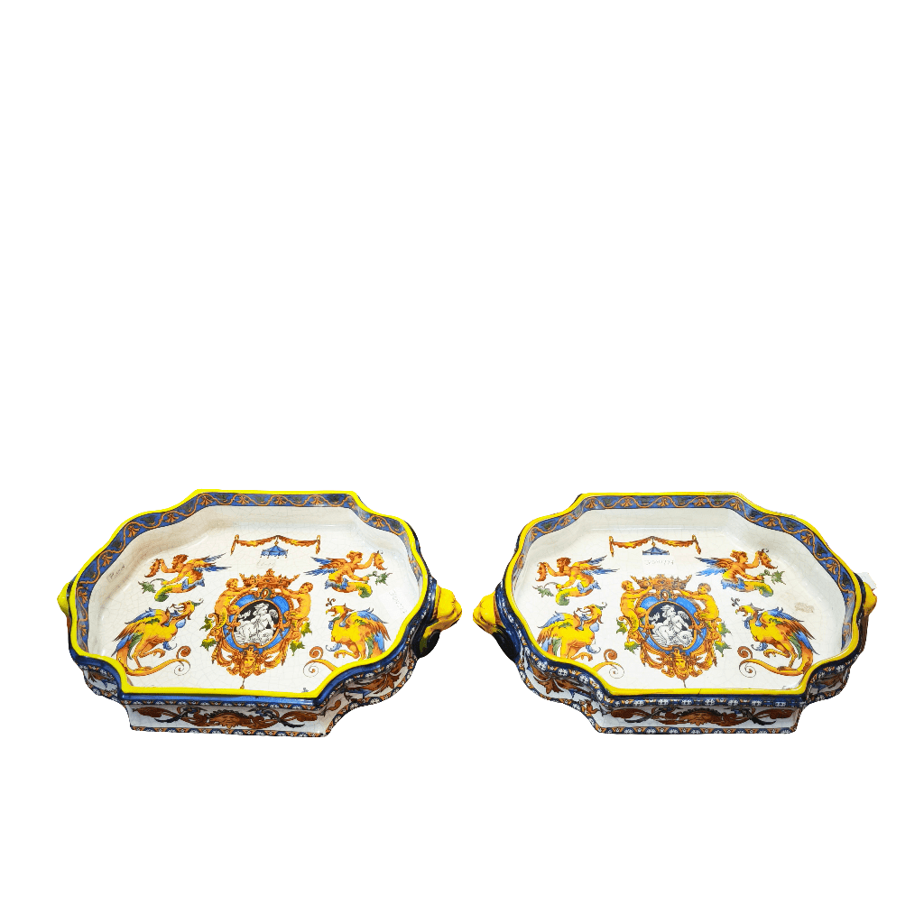 Hermoso par de jardineras o platos franceses pintados a mano, de la prestigiosa marca Keller & Guérin. Se pueden apreciar hermosas figuras mitológica con intensos amarillos y azules.