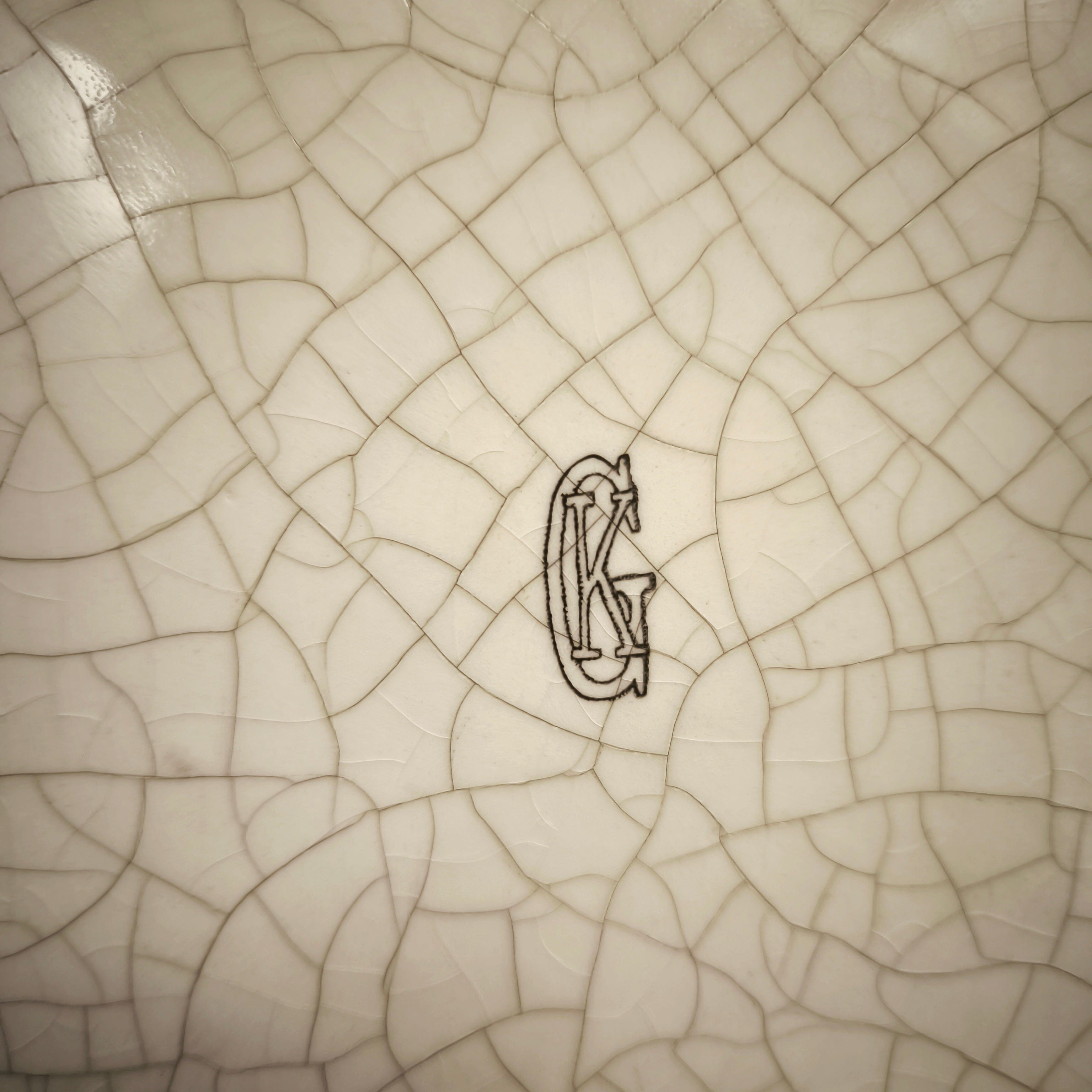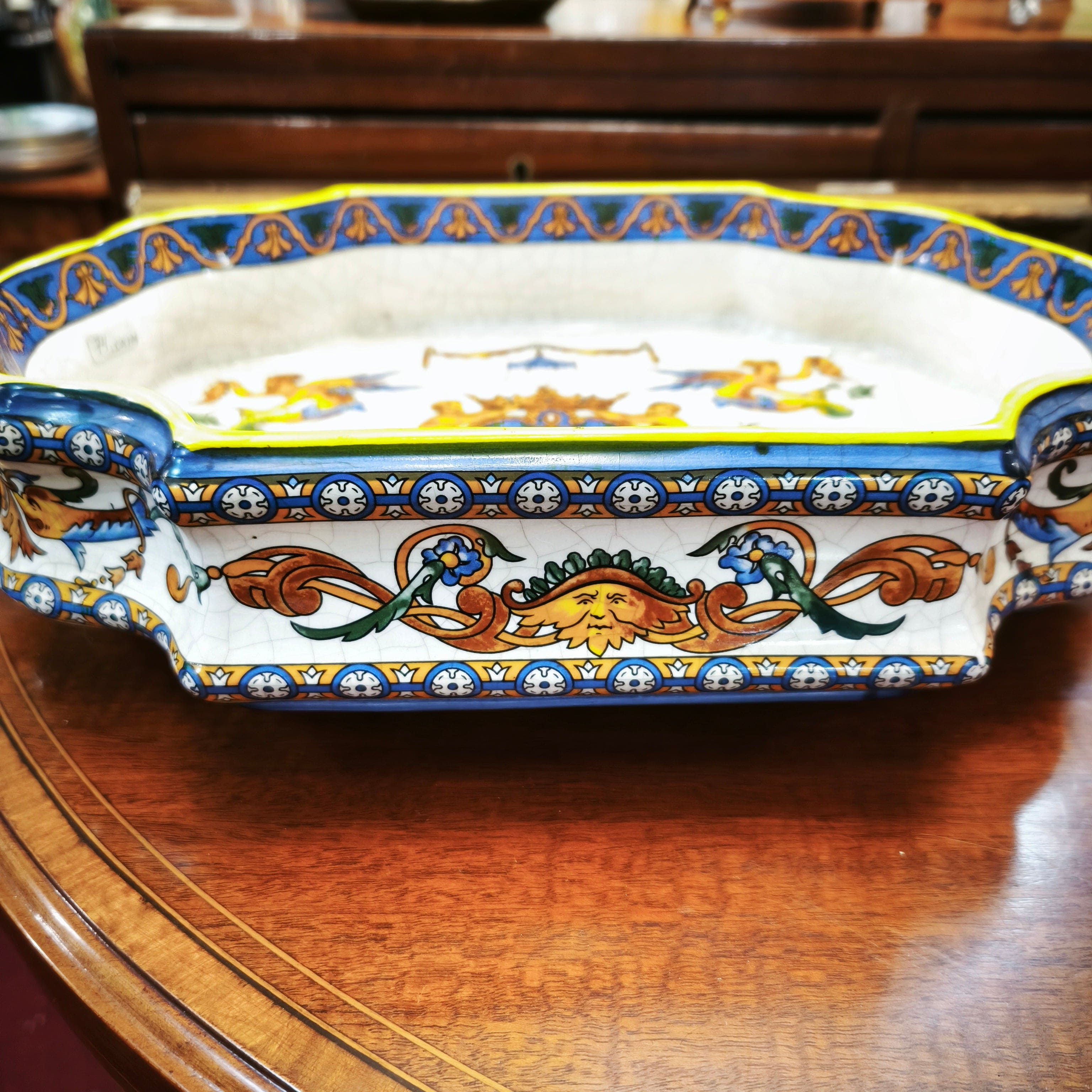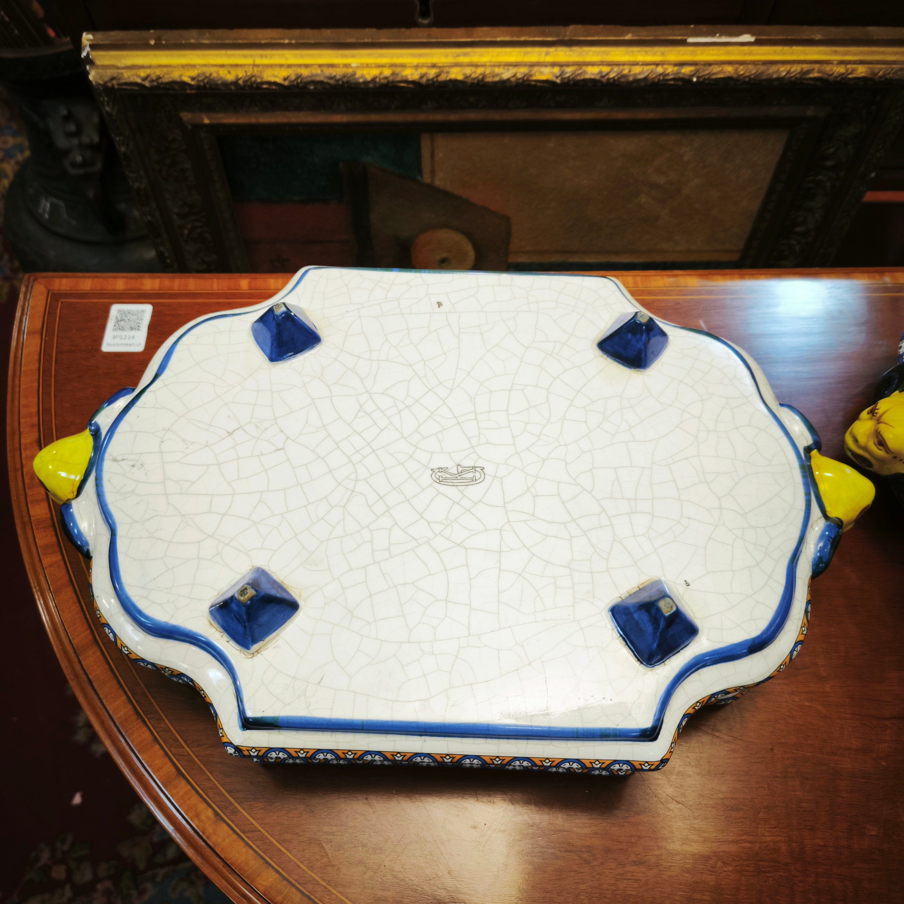 Hermoso par de jardineras o platos franceses pintados a mano, de la prestigiosa marca Keller & Guérin. Se pueden apreciar hermosas figuras mitológica con intensos amarillos y azules.