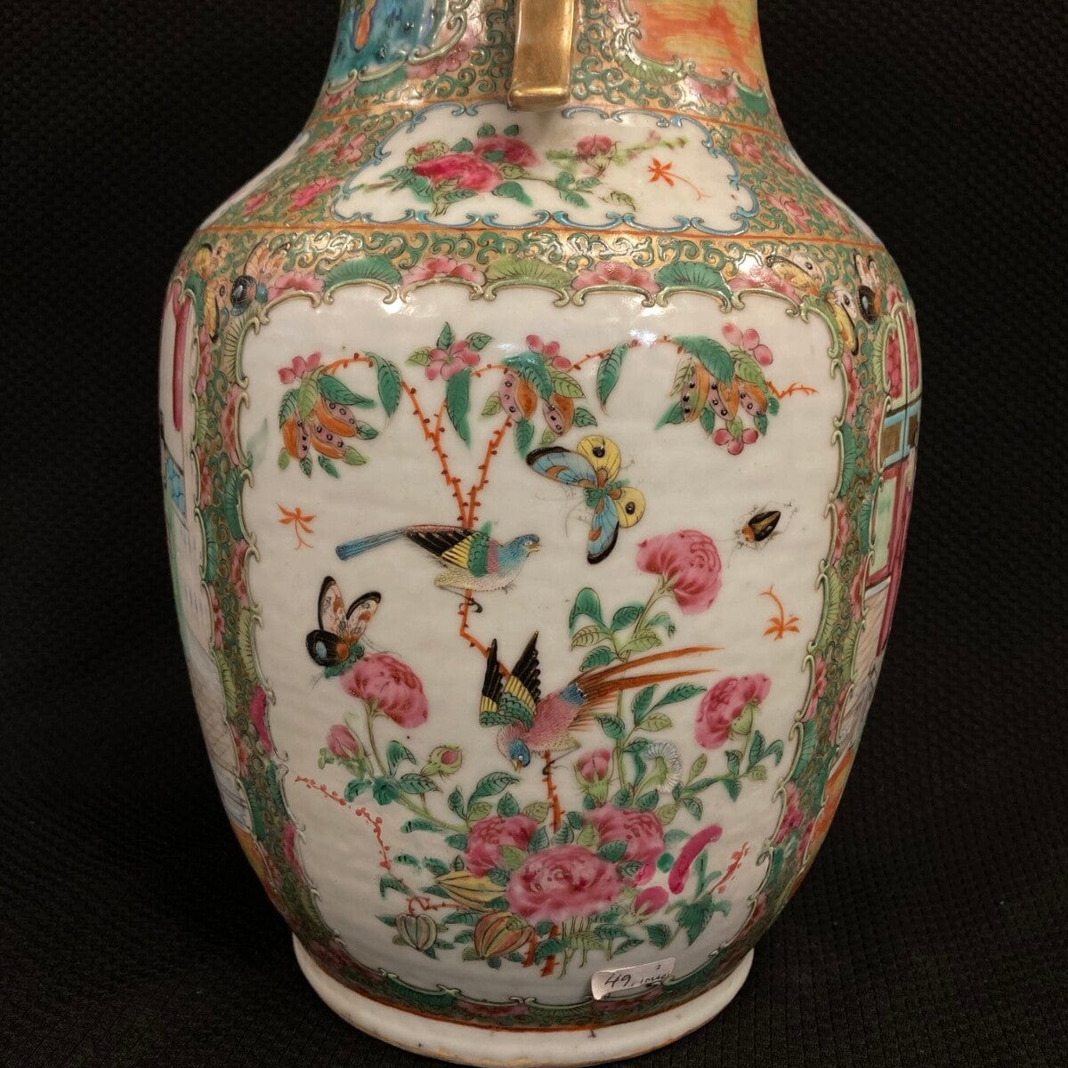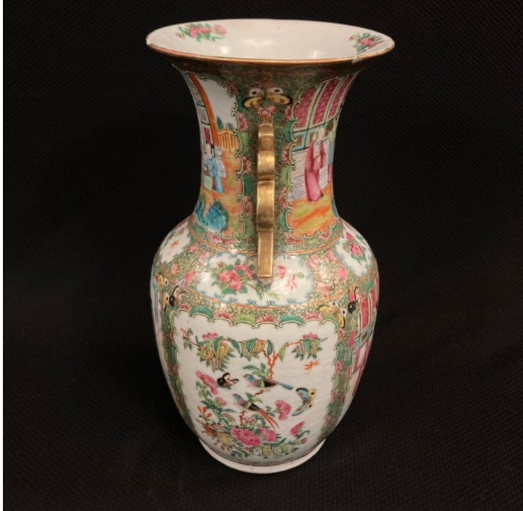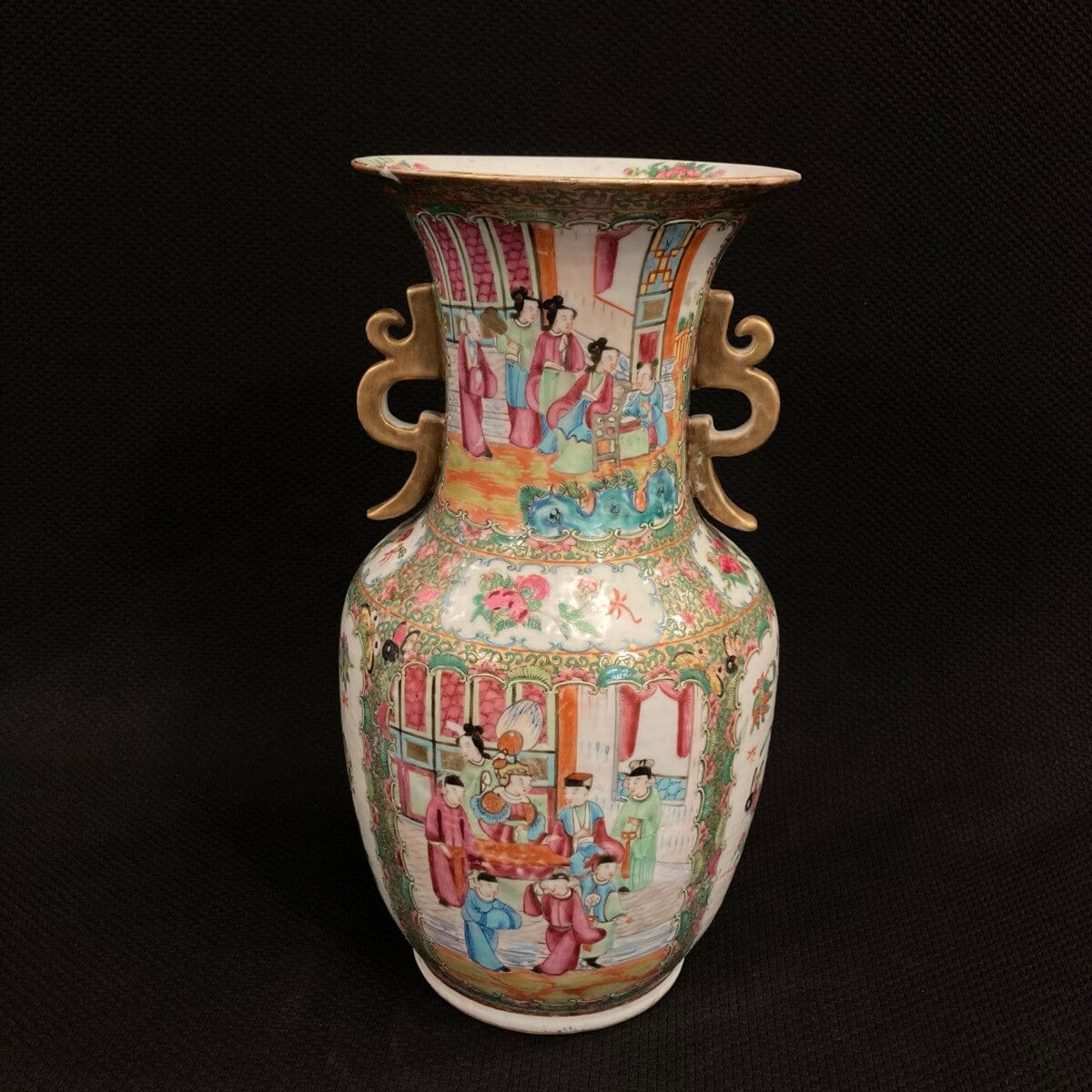 Jarrón chino de porcelana estilo Famille rose, con hermosa pintura retratando una escena cotidiana en un costado, y un jardín en el otro. Tiene cuello de trompeta y delicadas asas.