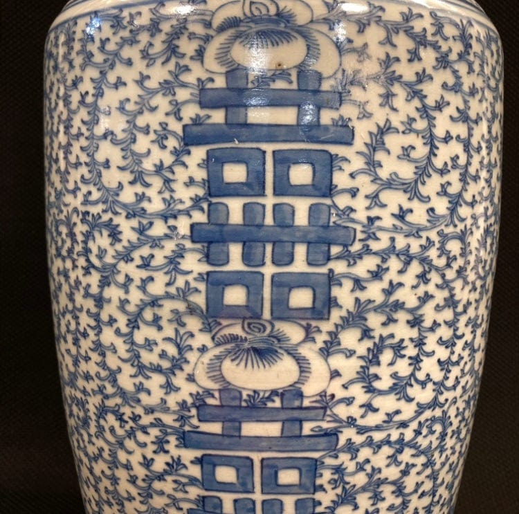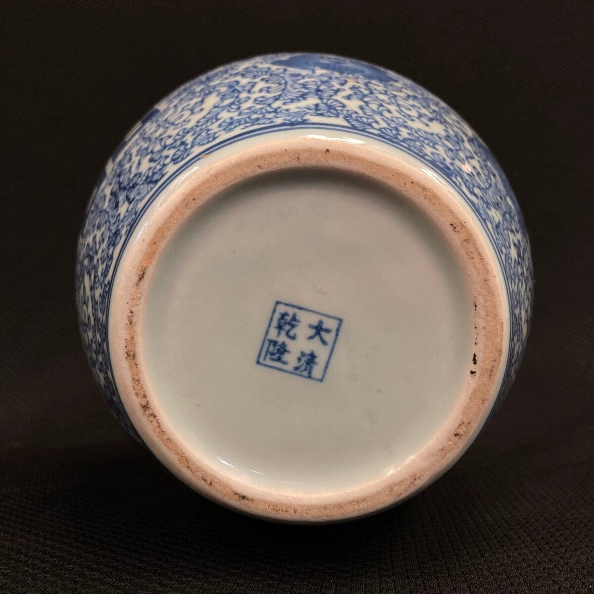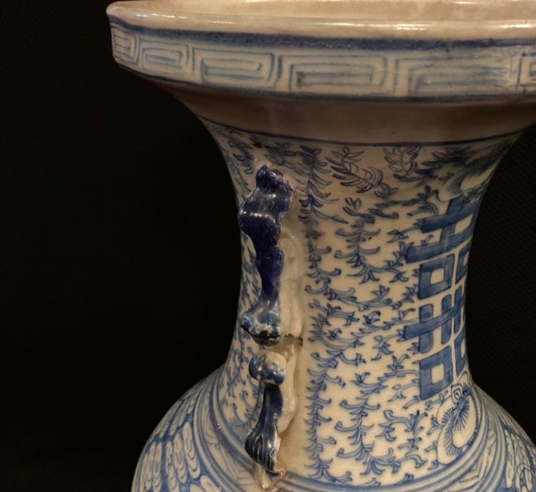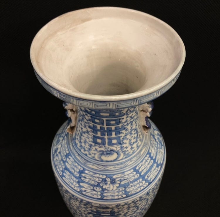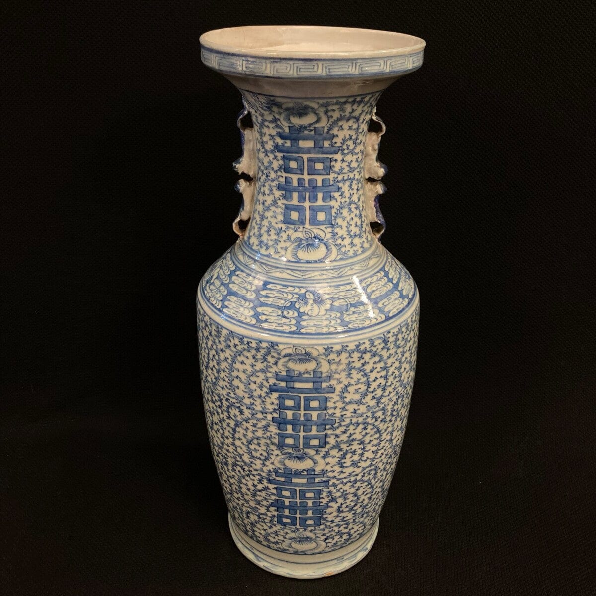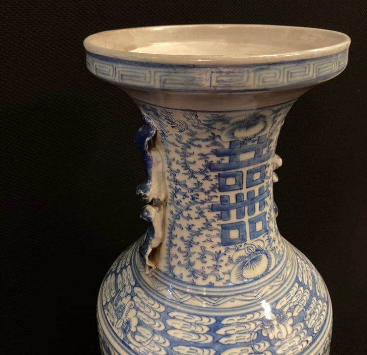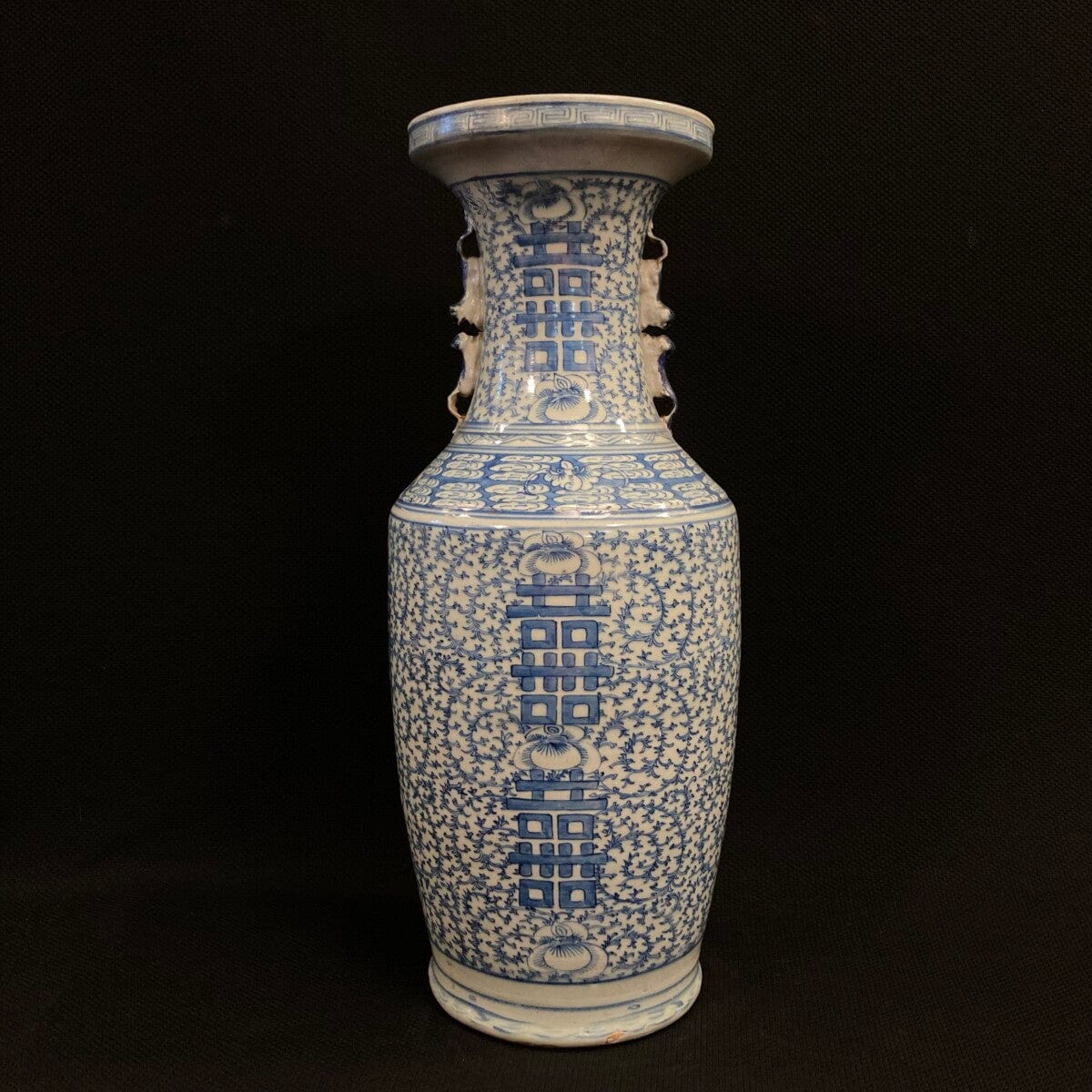Gran jarrón chino de porcelana azul y blanca, con delicadas asas en forma de parejas de perros fo en cada lado de su cuello. Cuenta con un dibujo de enredadera y flores en su exterior.