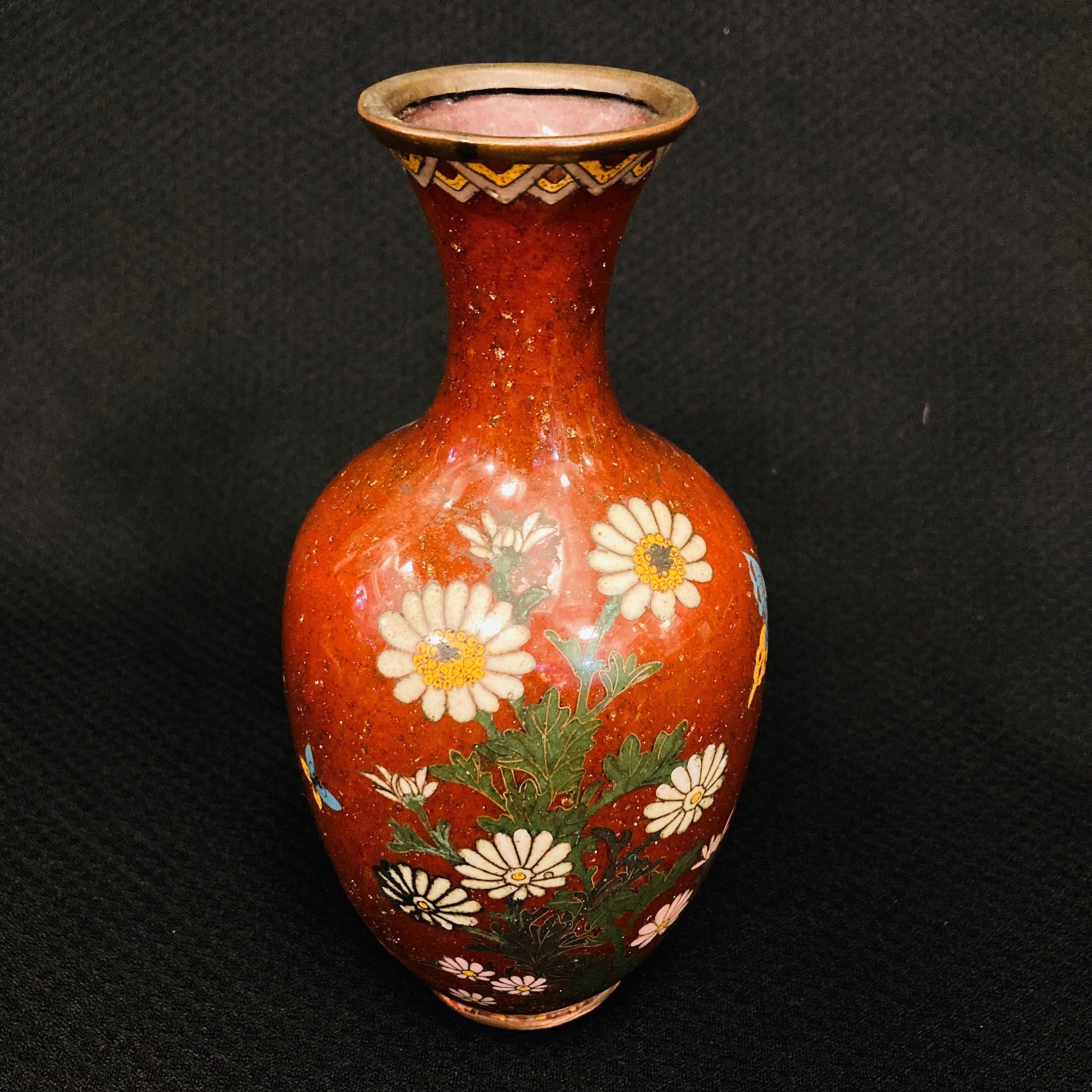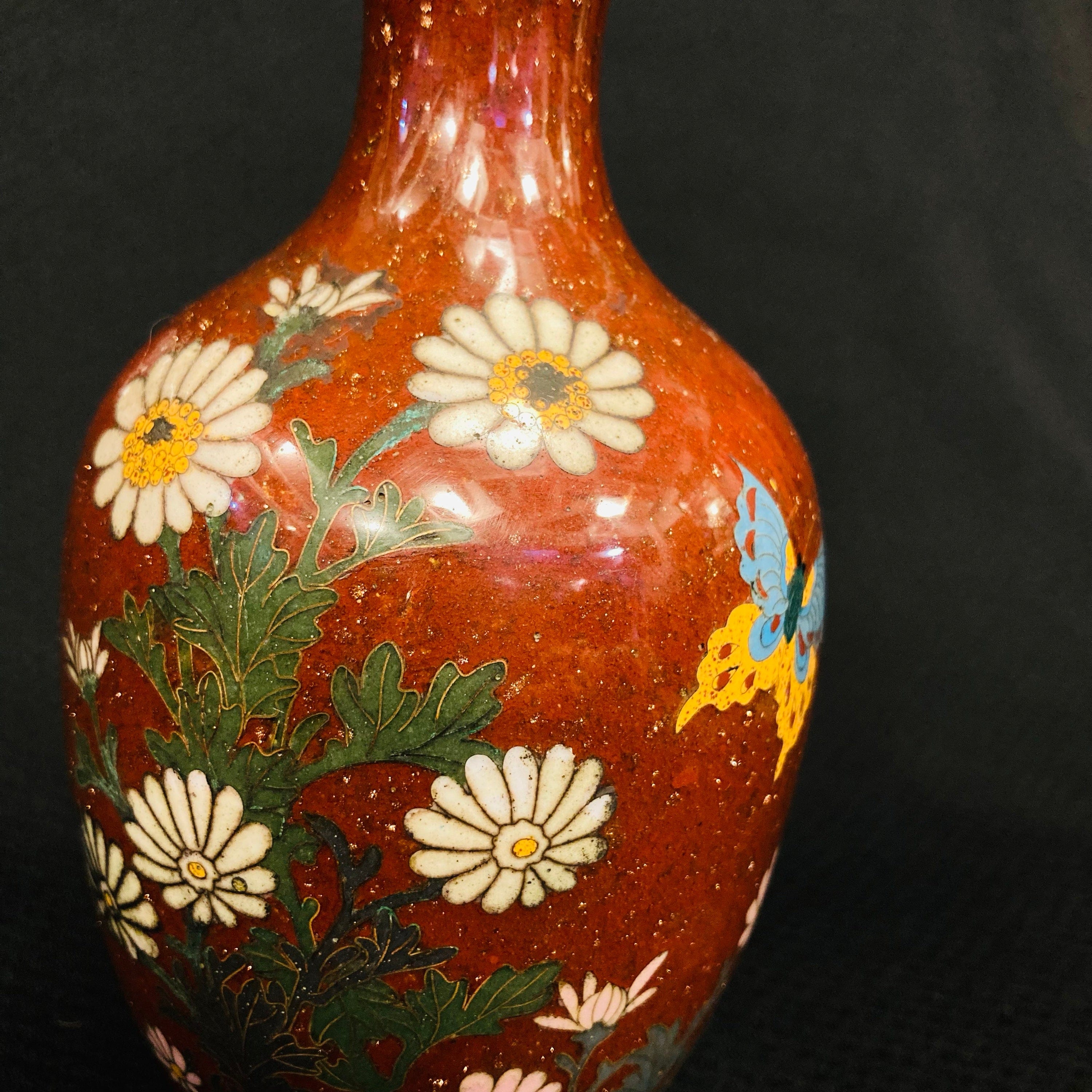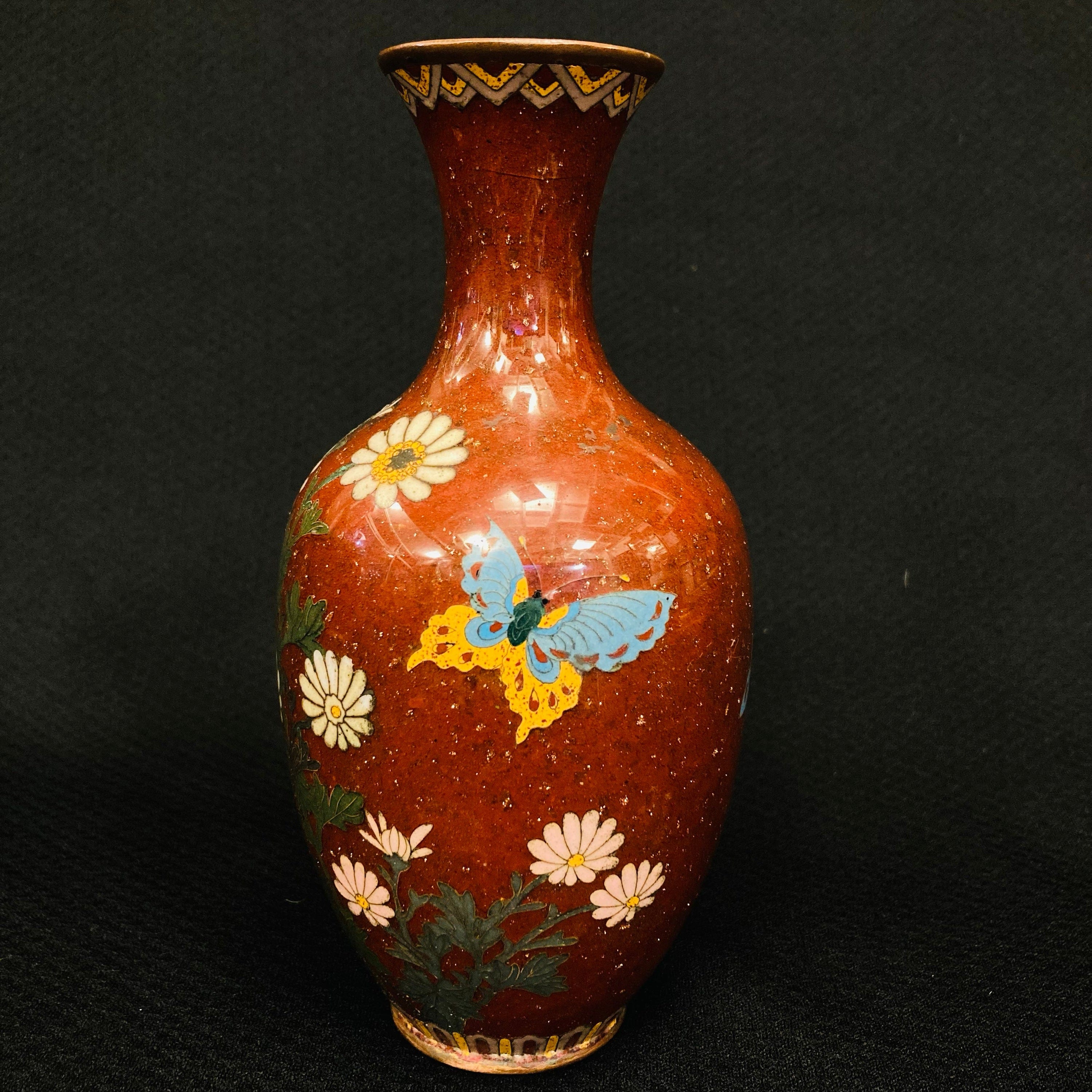 Jarrón de bronce con esmalte cloisonné, con motivo floral y mariposa celeste.