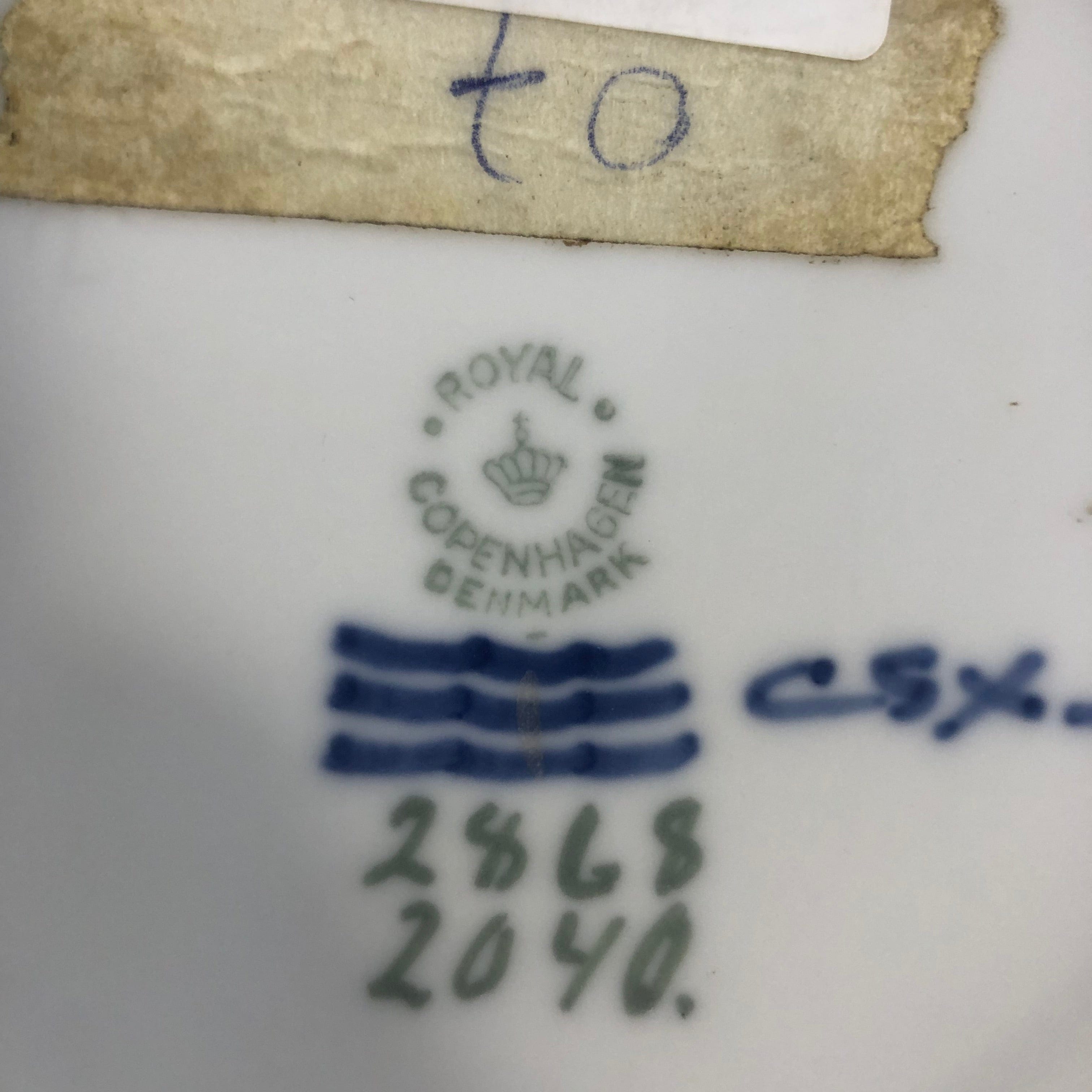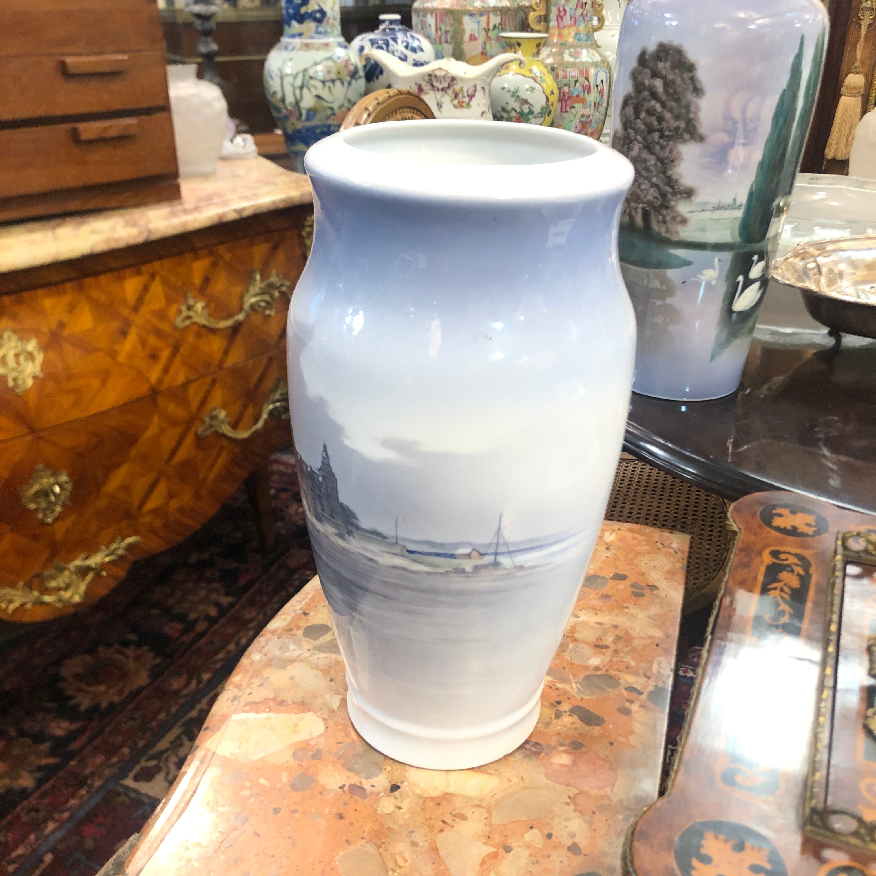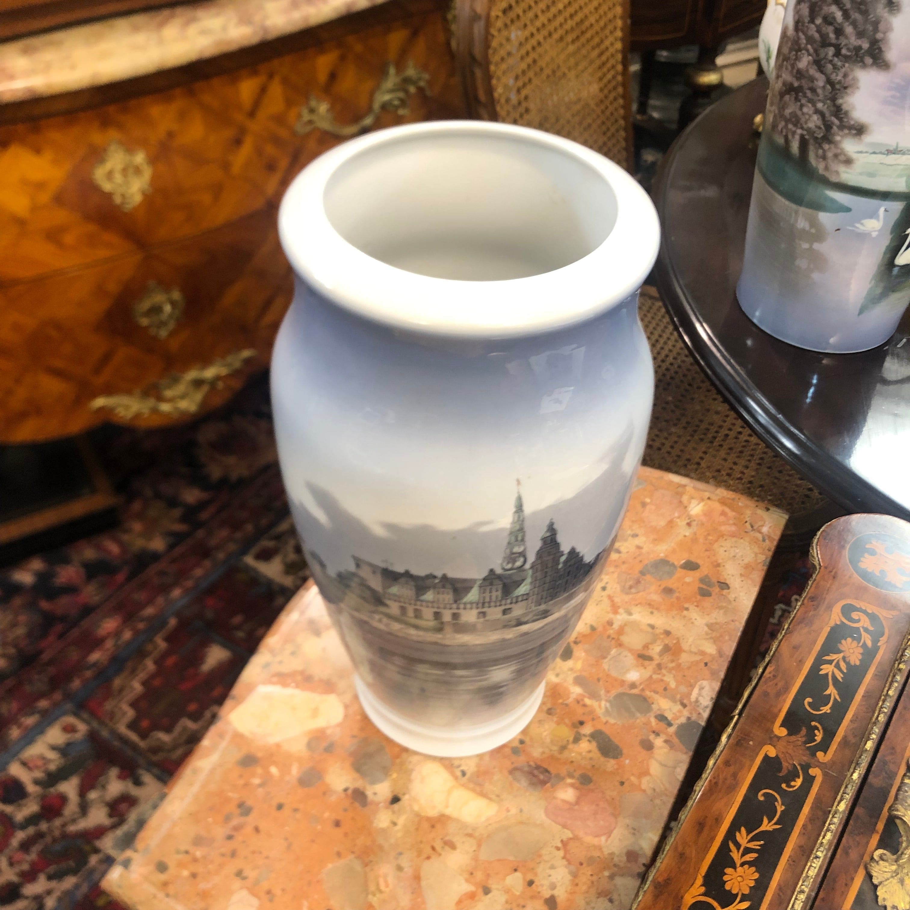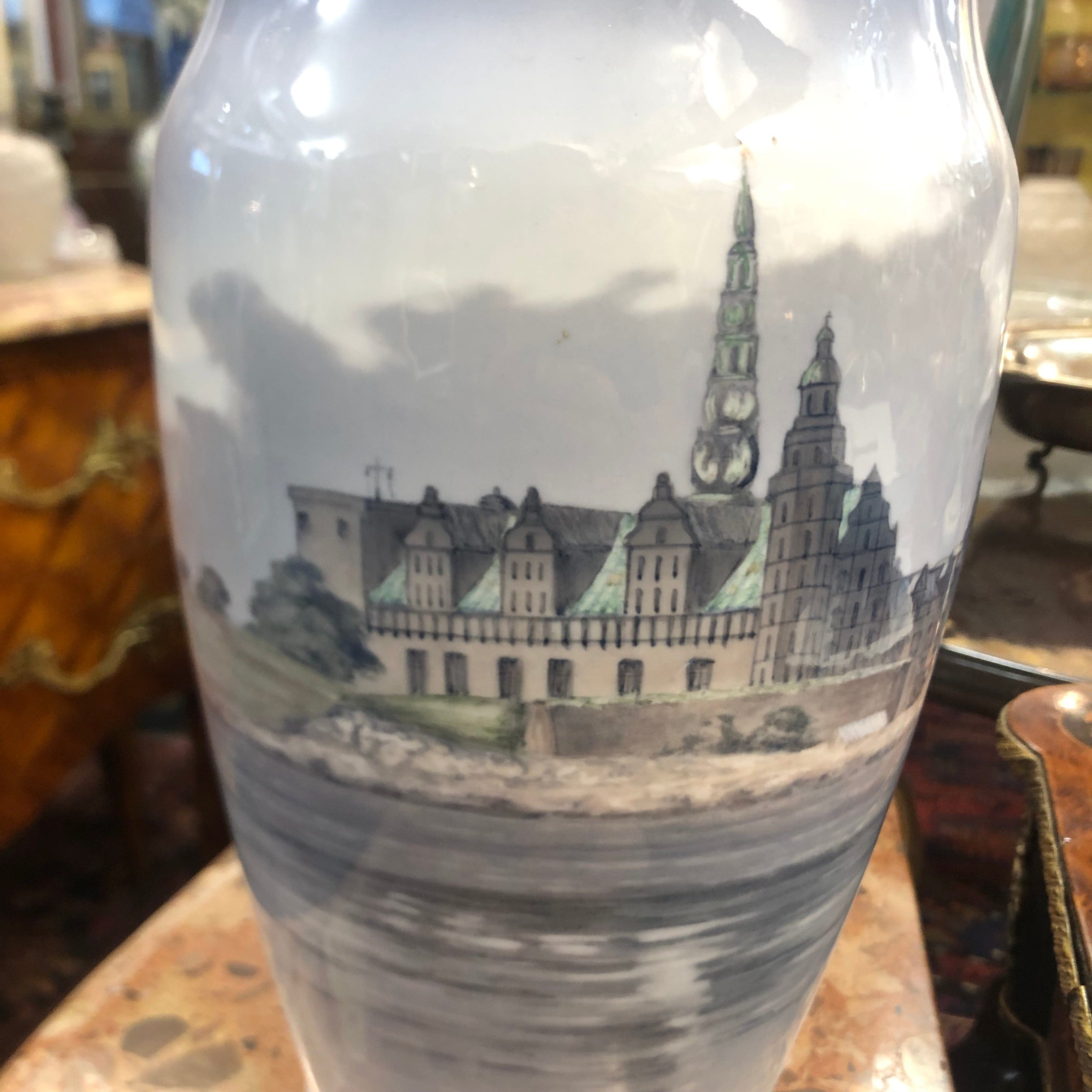 Hermoso jarron de porcelana de la prestigiosa marca danesa Royal Copenhaguen, en tonos grises, azules y verdes vemos un hermoso paisaje de un castillo junto al rio en medio de la naturaleza.