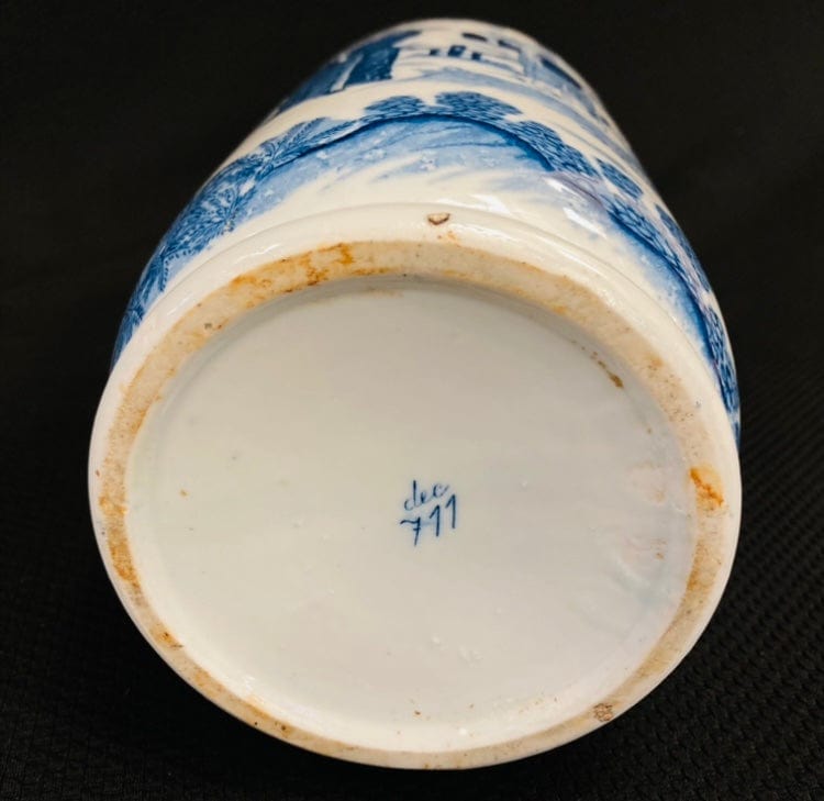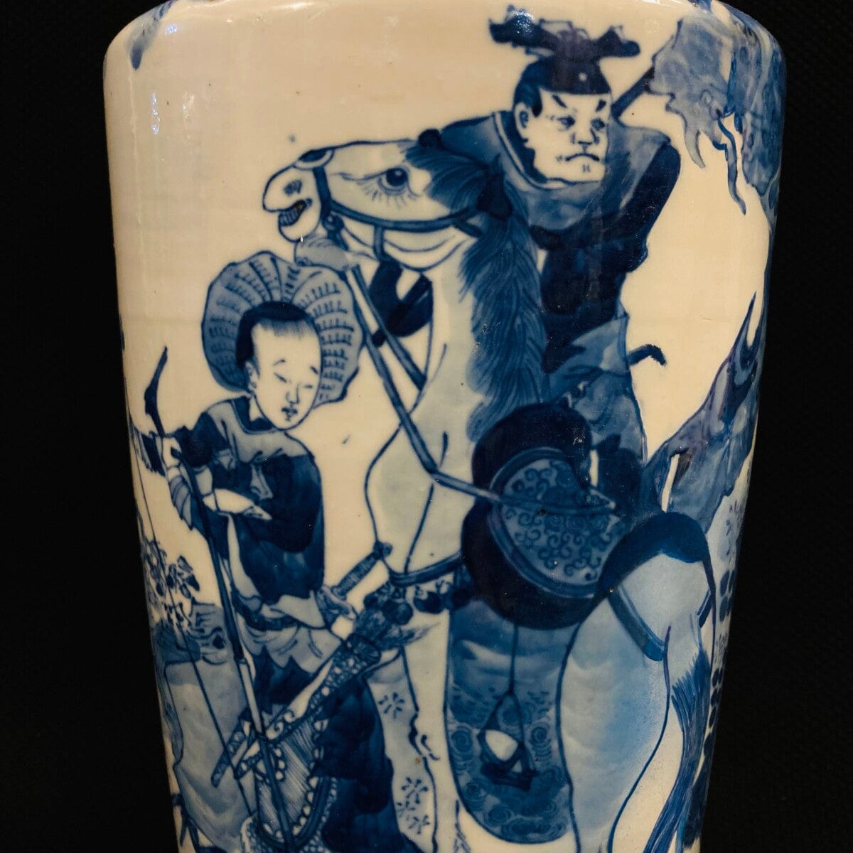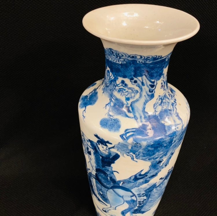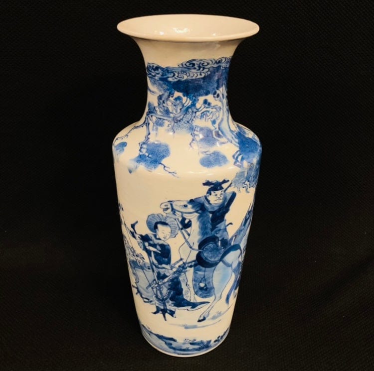 Jarrón chino de porcelana azul y blanco de tamaño medio. Cuenta con un dibujo en su exterior que retrata a un padre e hijo sobre un caballo.