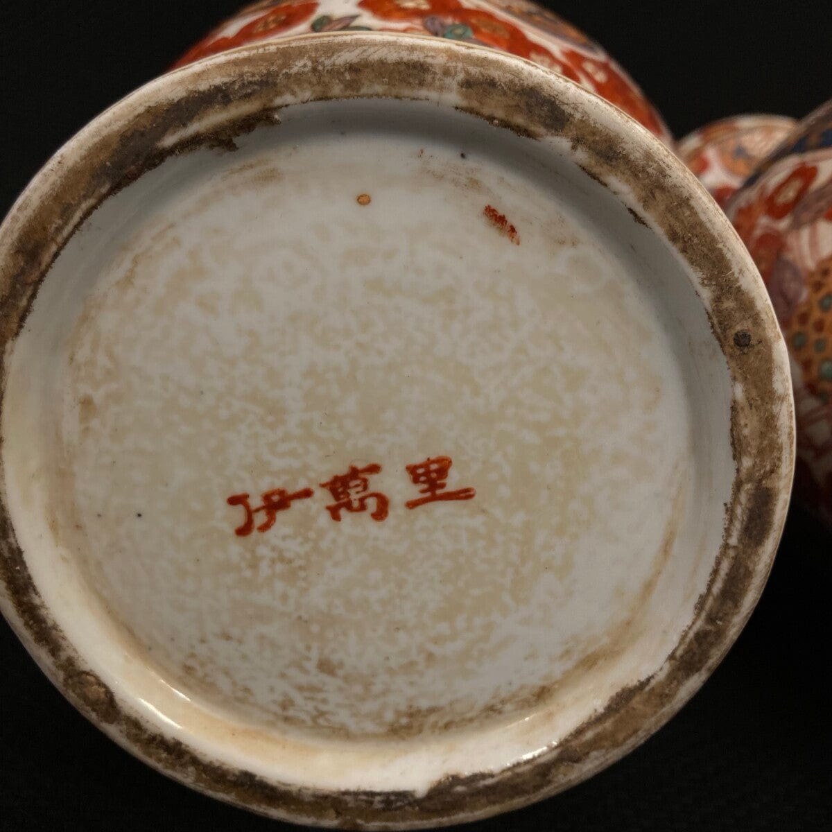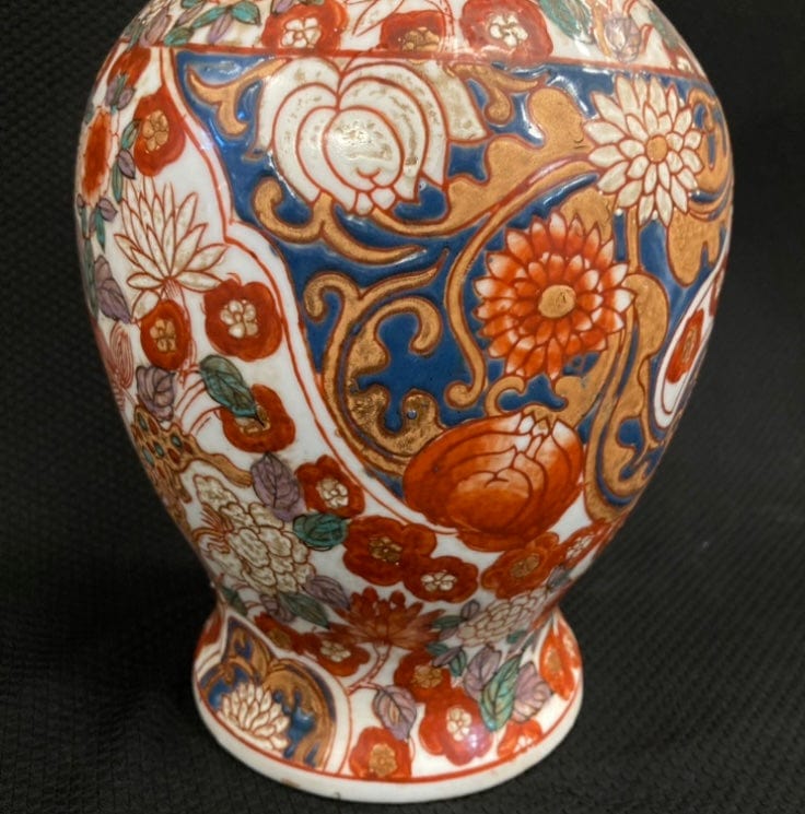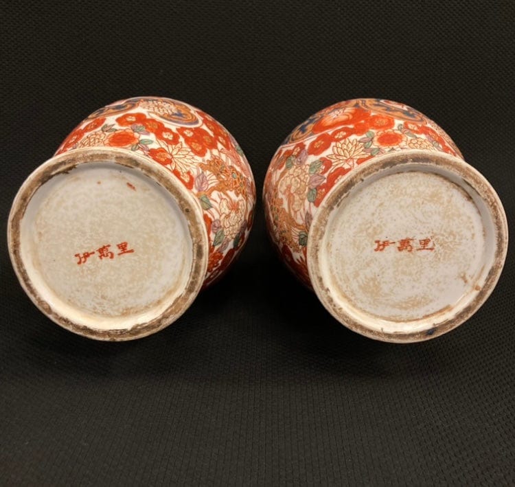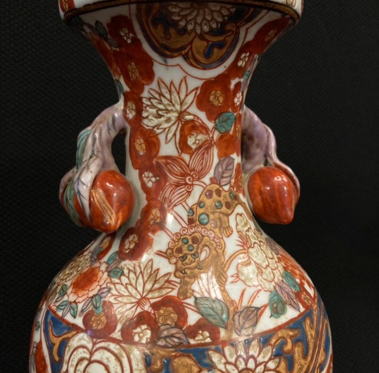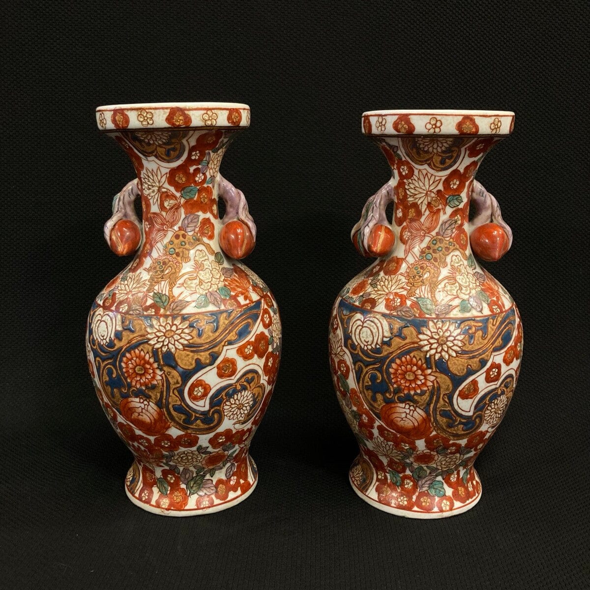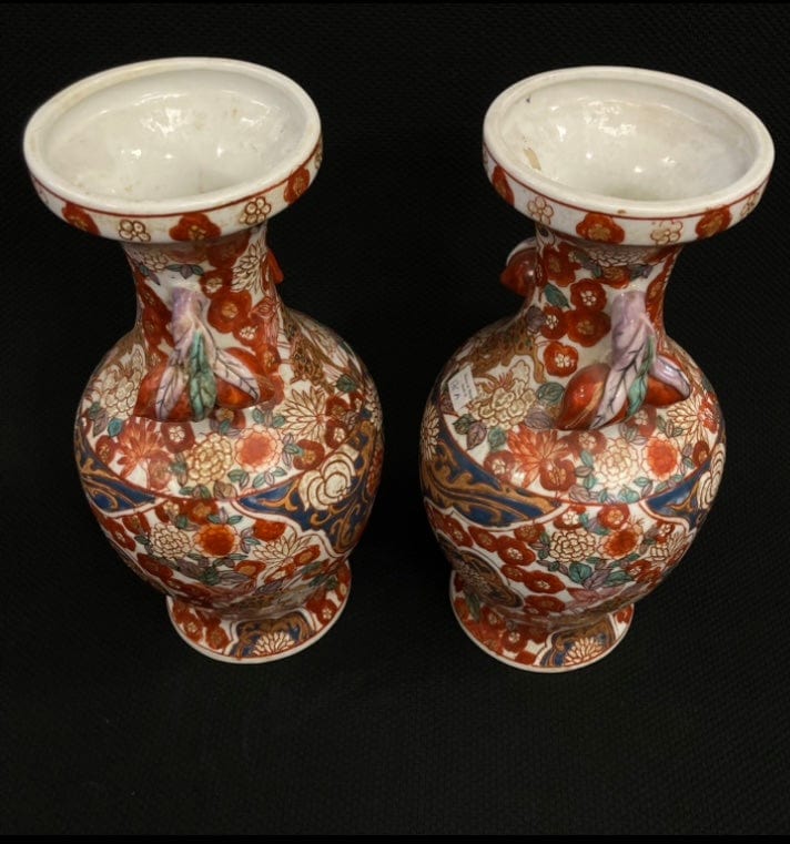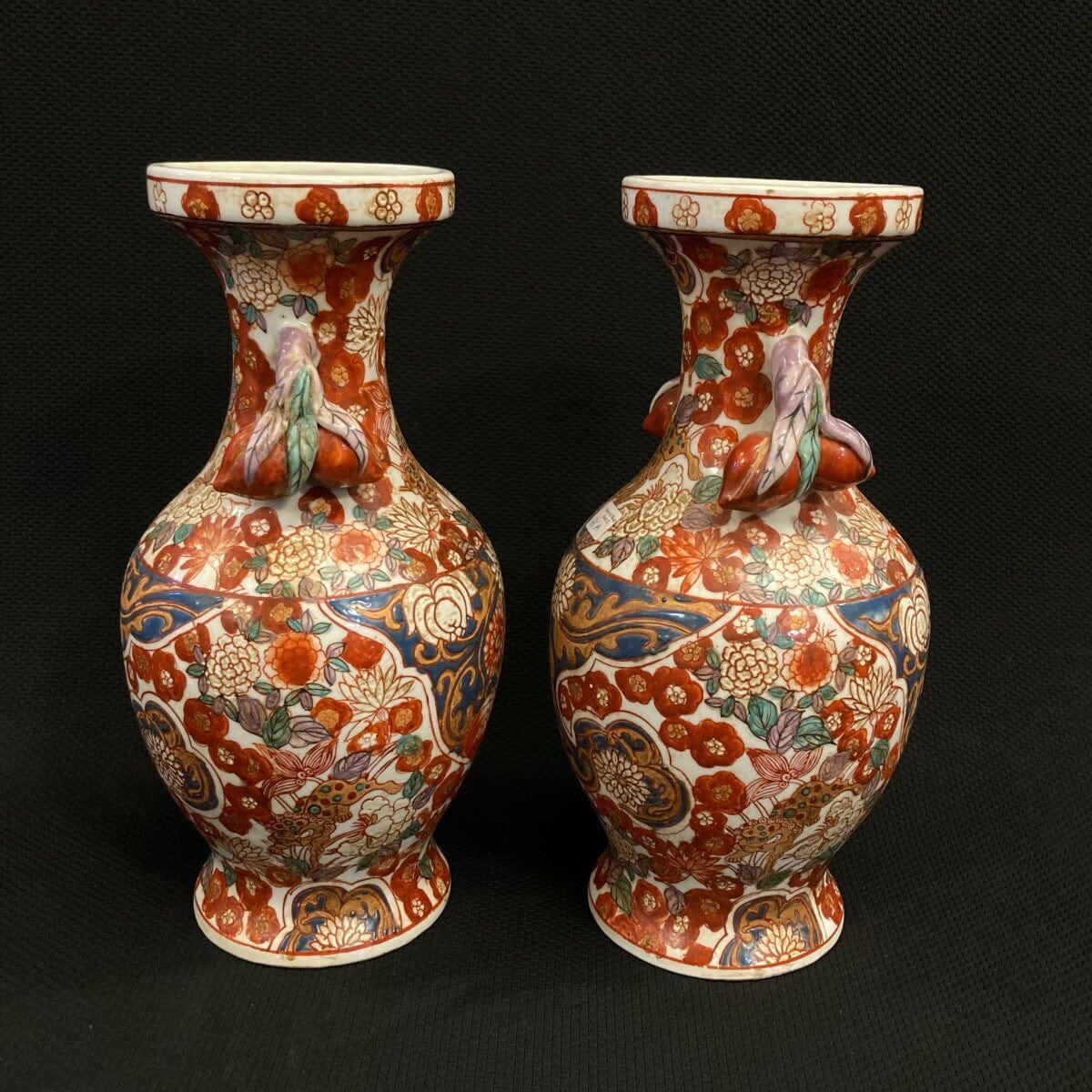 Par de jarrones japoneses de porcelana estilo Imari, con hermosos detalles en su pintura. Ambos tienen el mismo diseño, con granadas en el cuello.