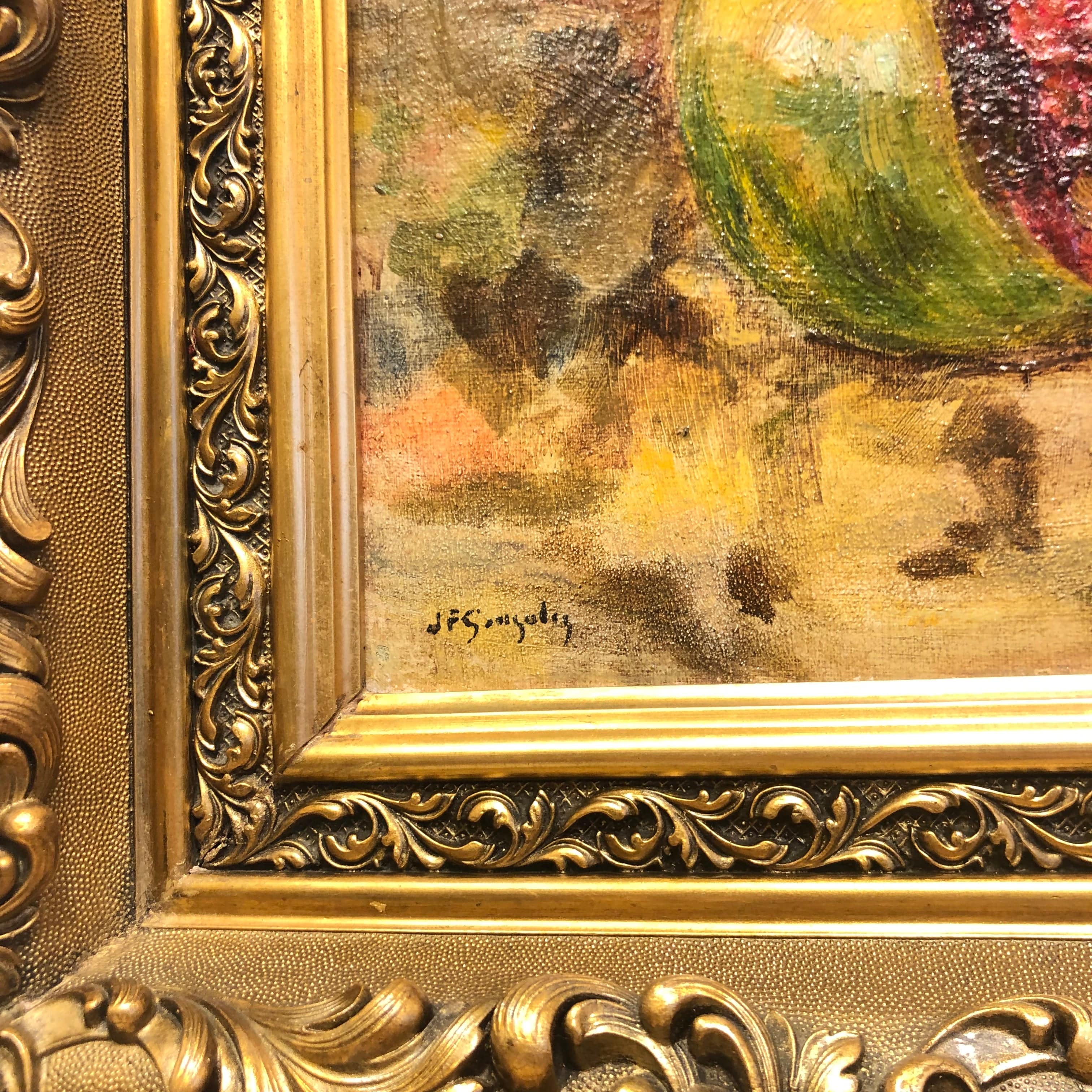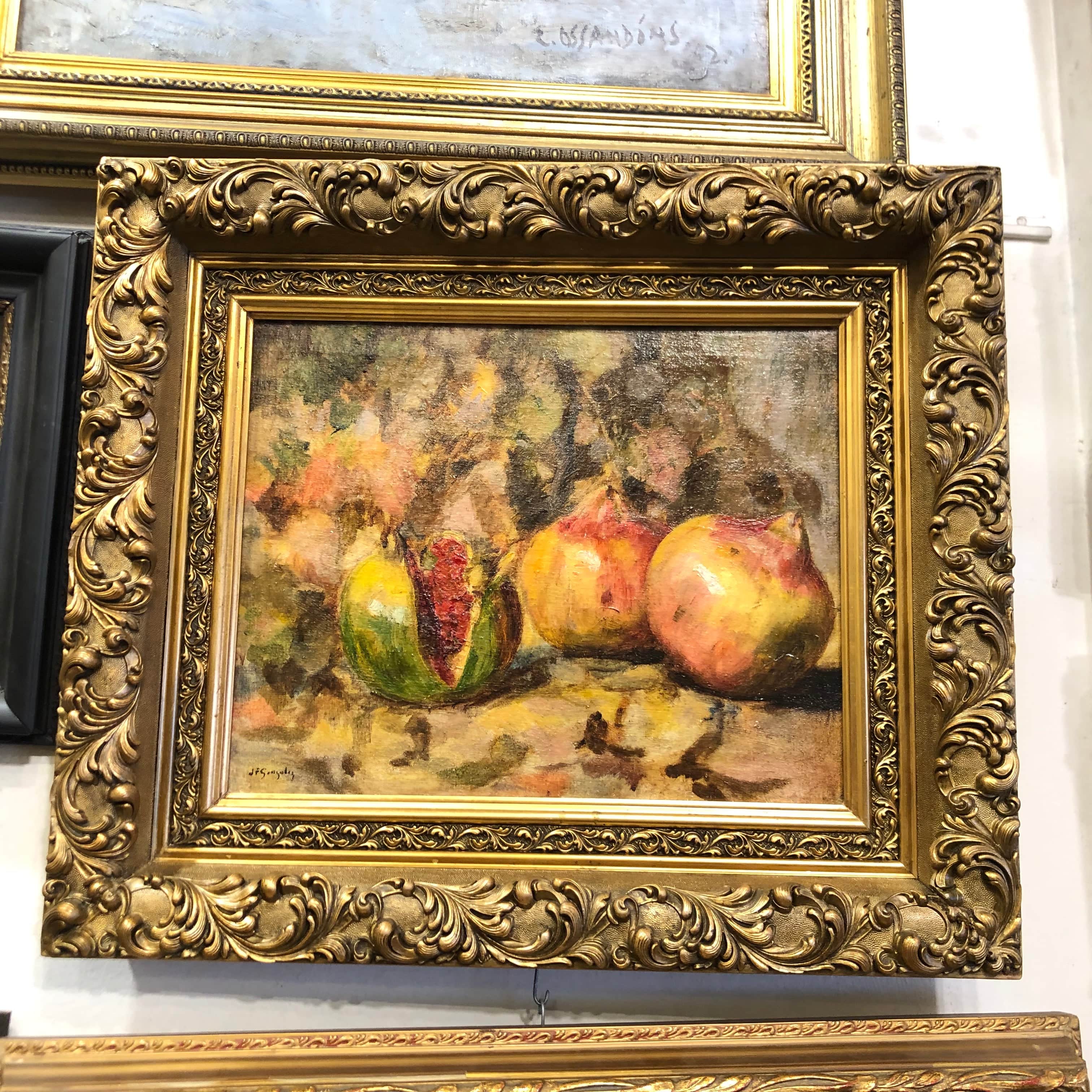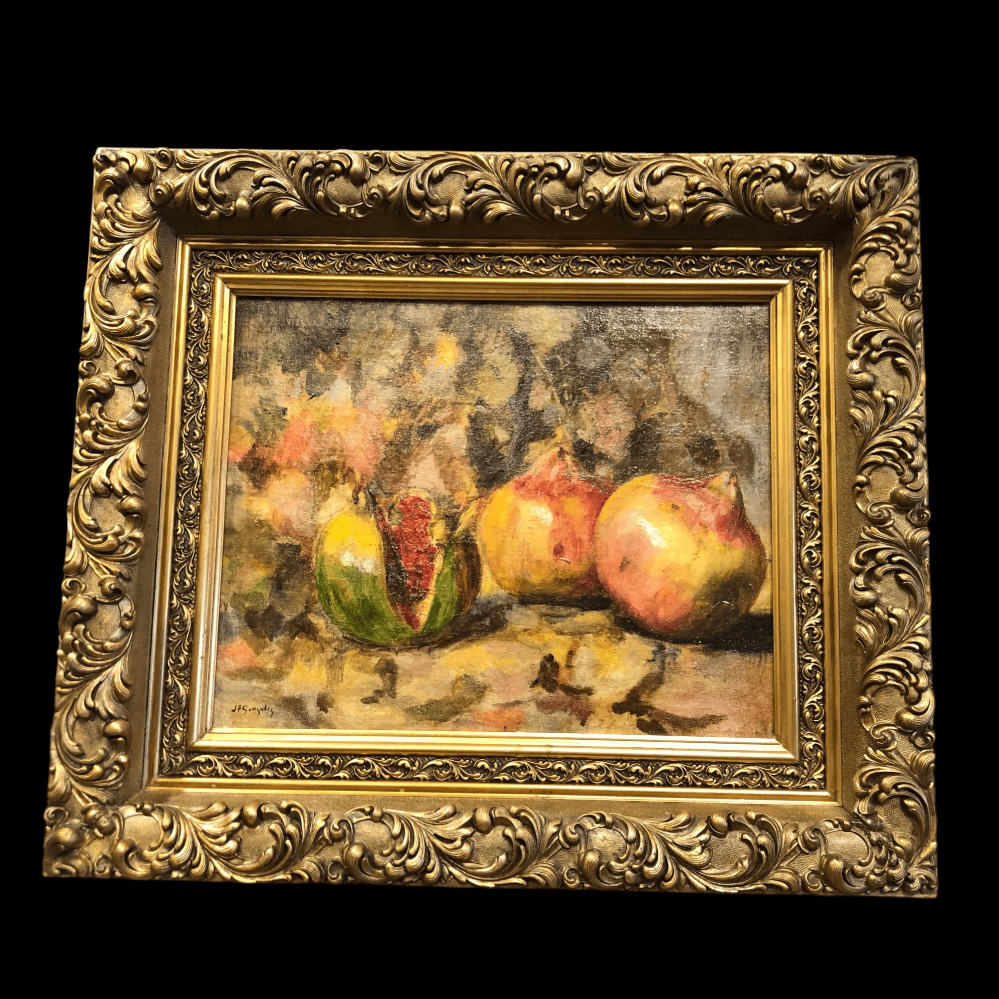 Óleo sobre tela del uno de los maestros de la pintura chilena, Juan Francisco González, representando un bodegón de granadas expresivamente pintadas en tonos cálidos, con un fino trabajo de luz y sombra. La obra está enmarcada en madera tallada con motivos florales y pintada de dorado.