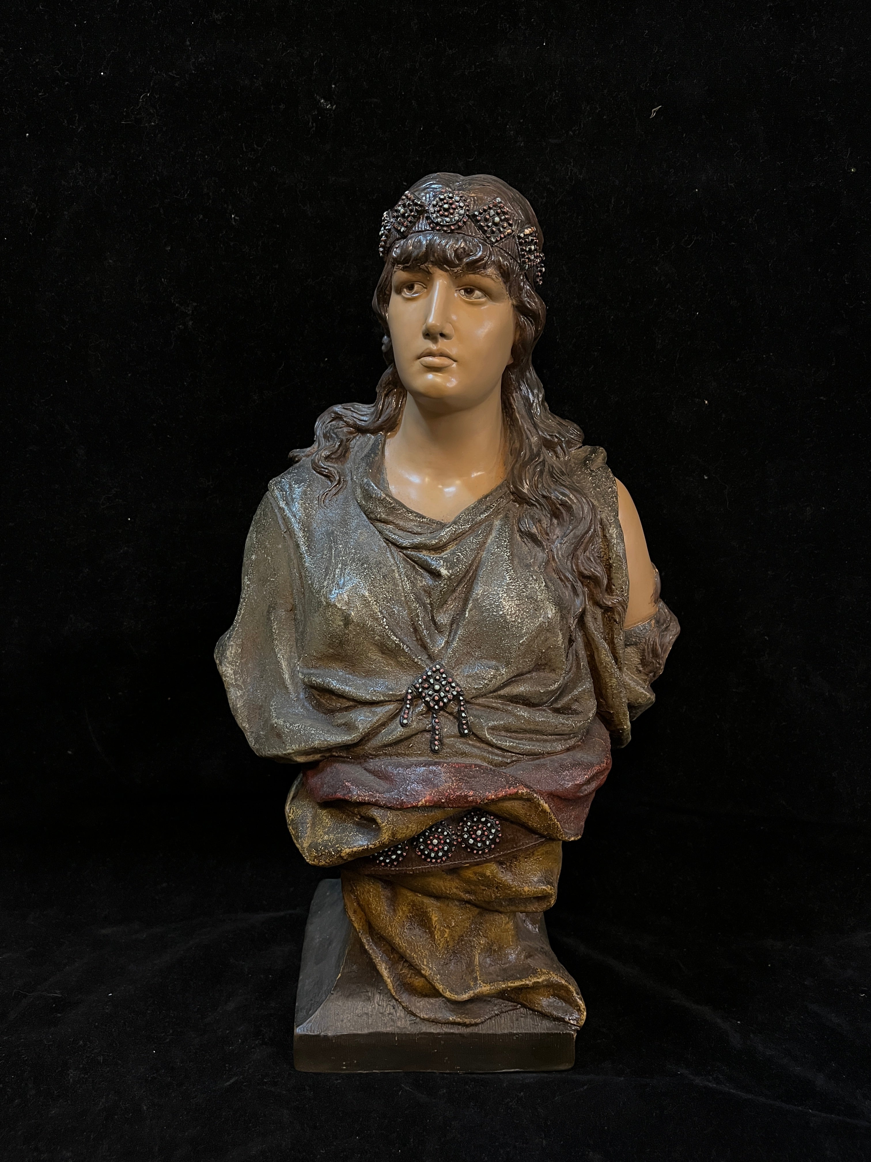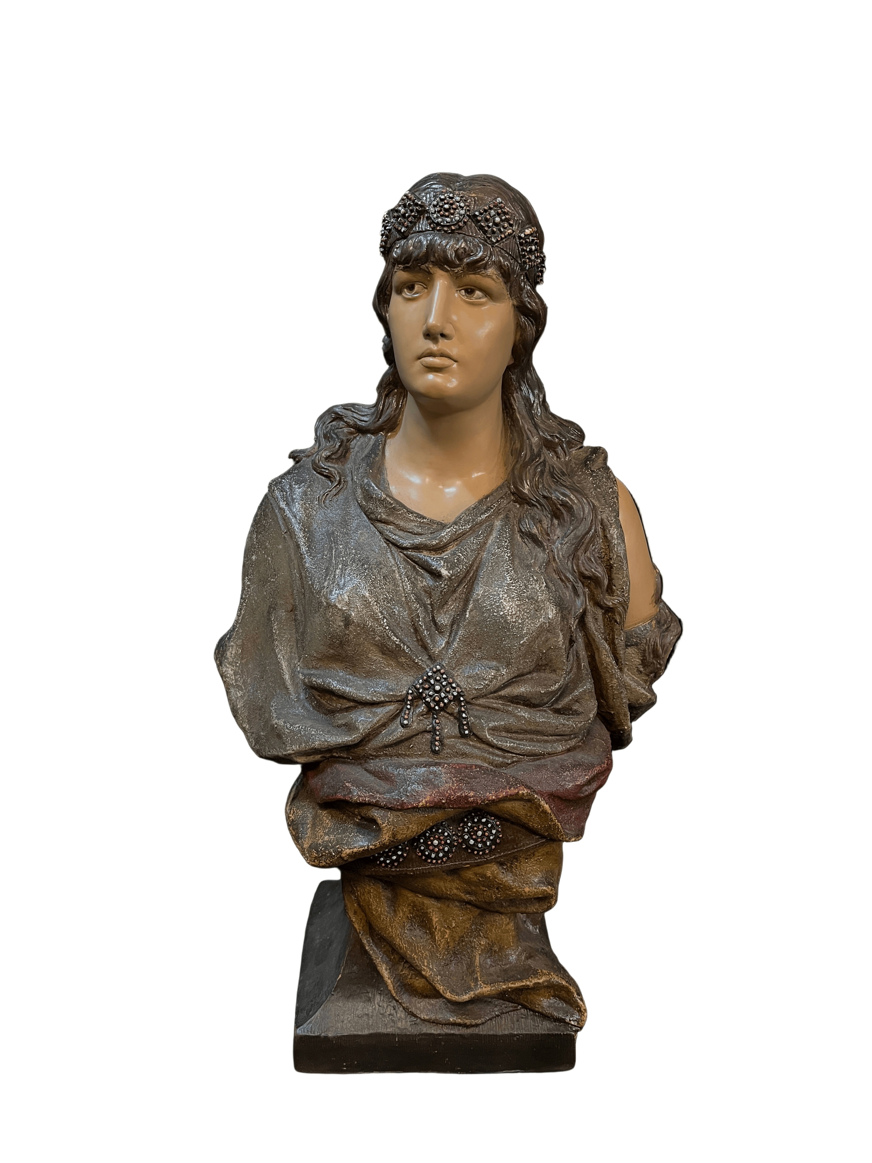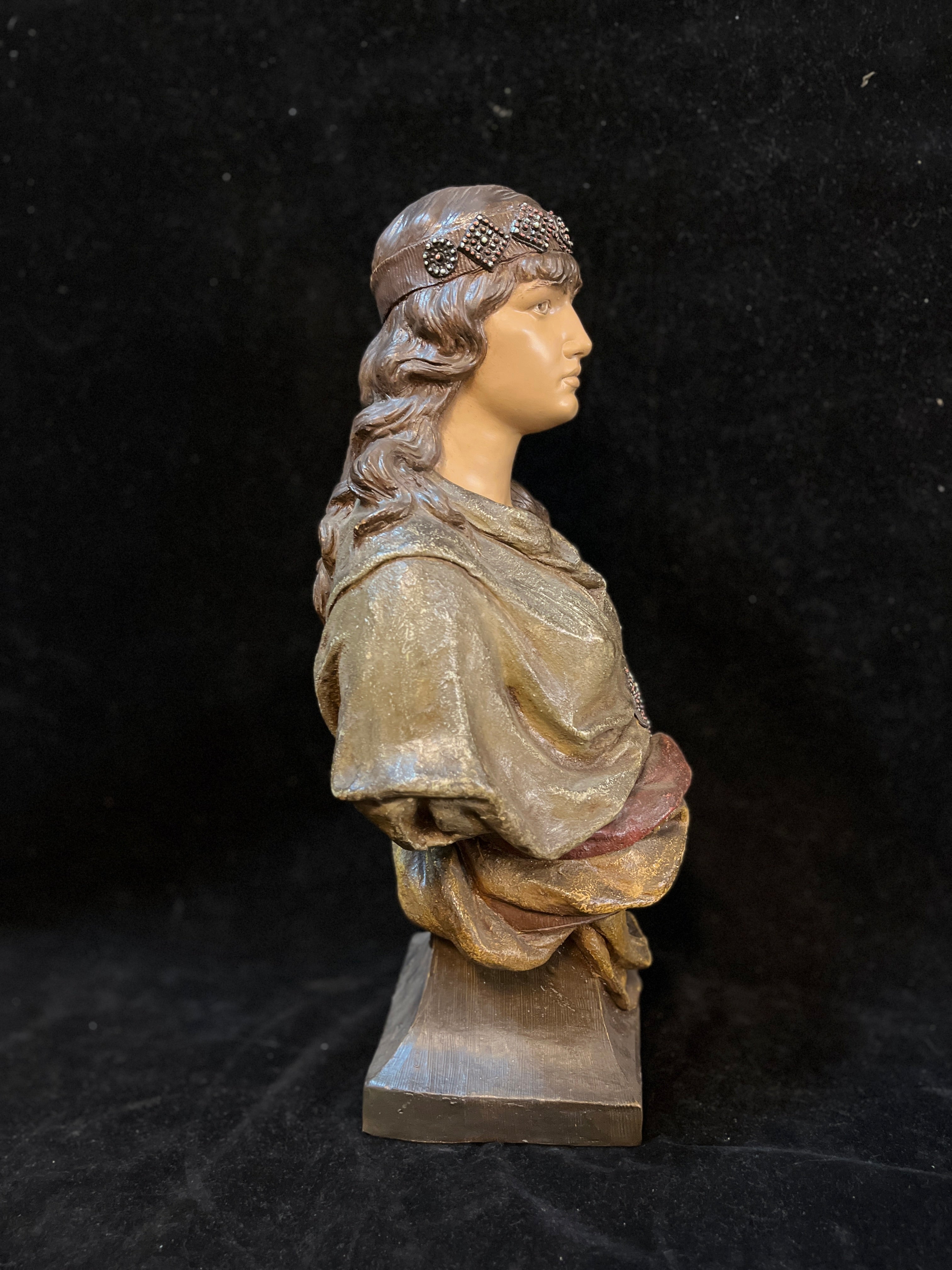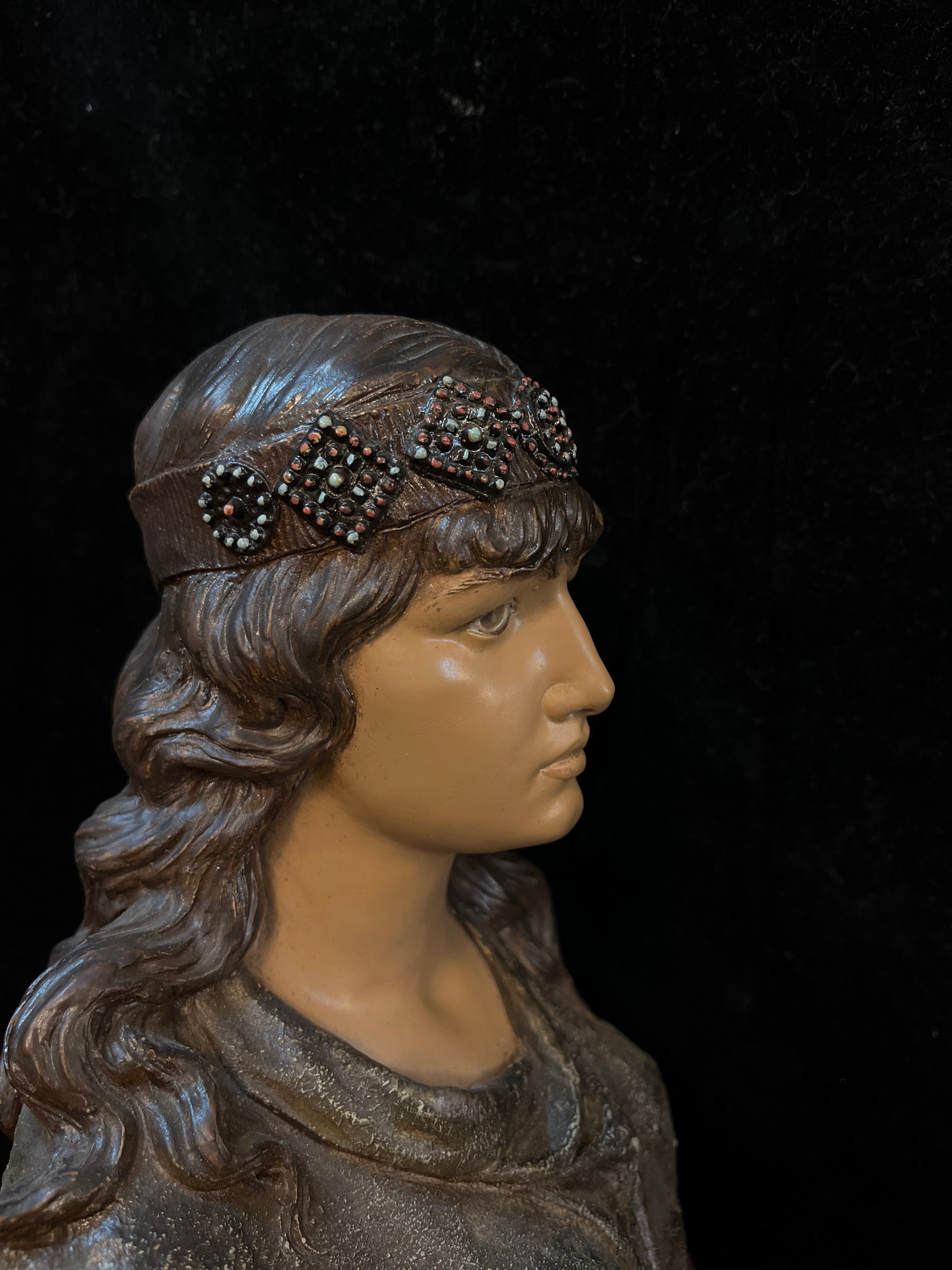 Imponente busto de terracota policromada del talentoso escultor austriaco Friedrich Goldscheider, firmada y con su número de serie visible 12/1042. L figura representa clásica imagen de Judith. Resaltando de ella una presencia desbordante que mezcla fuerza y serenidad. Además se observa un gran nivel de detalles tanto en sus vestimentas, adornos, como también en su rostro, donde destaca su mirada segura hacia un horizonte y su cabello ondeante cayendo por sus hombros. Se presume que su data es muy cercana a principios de 1900.