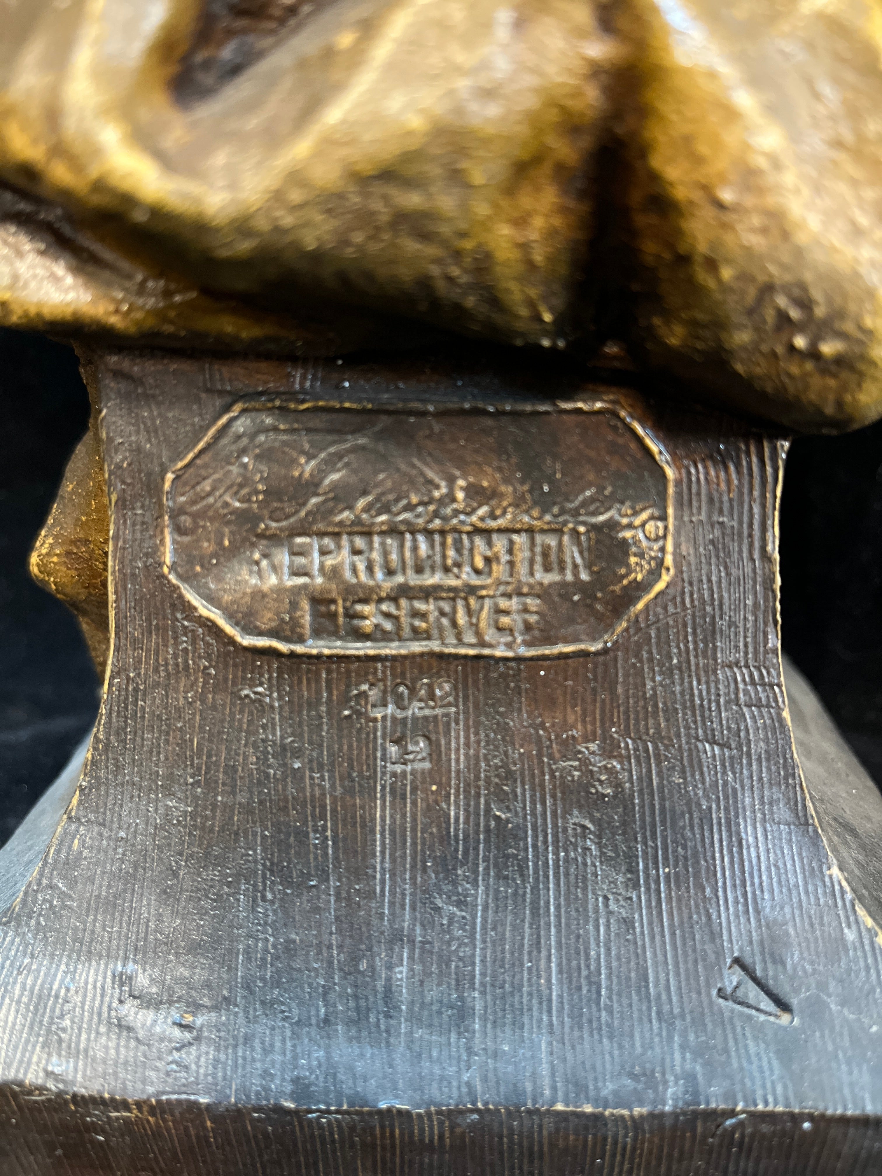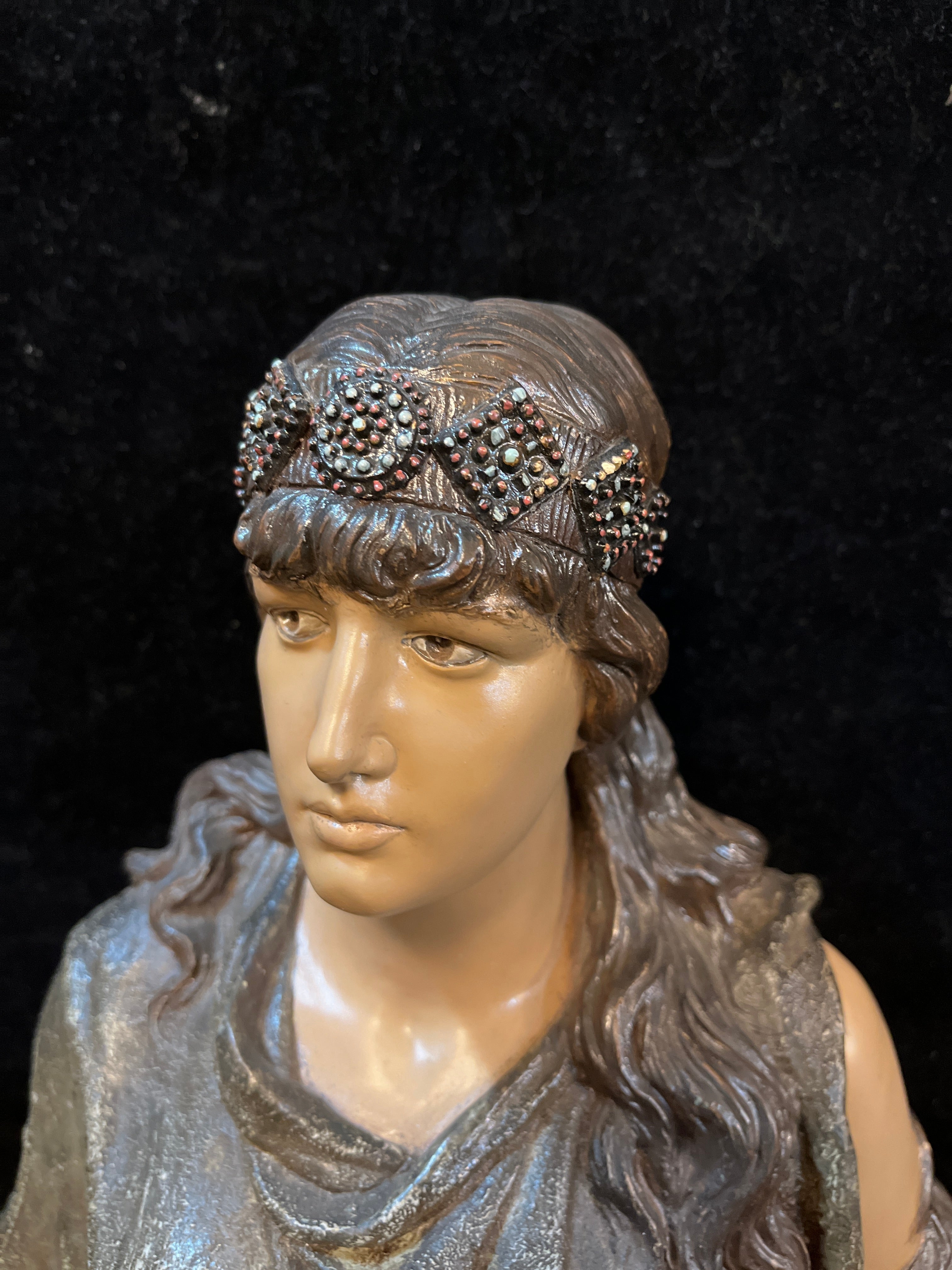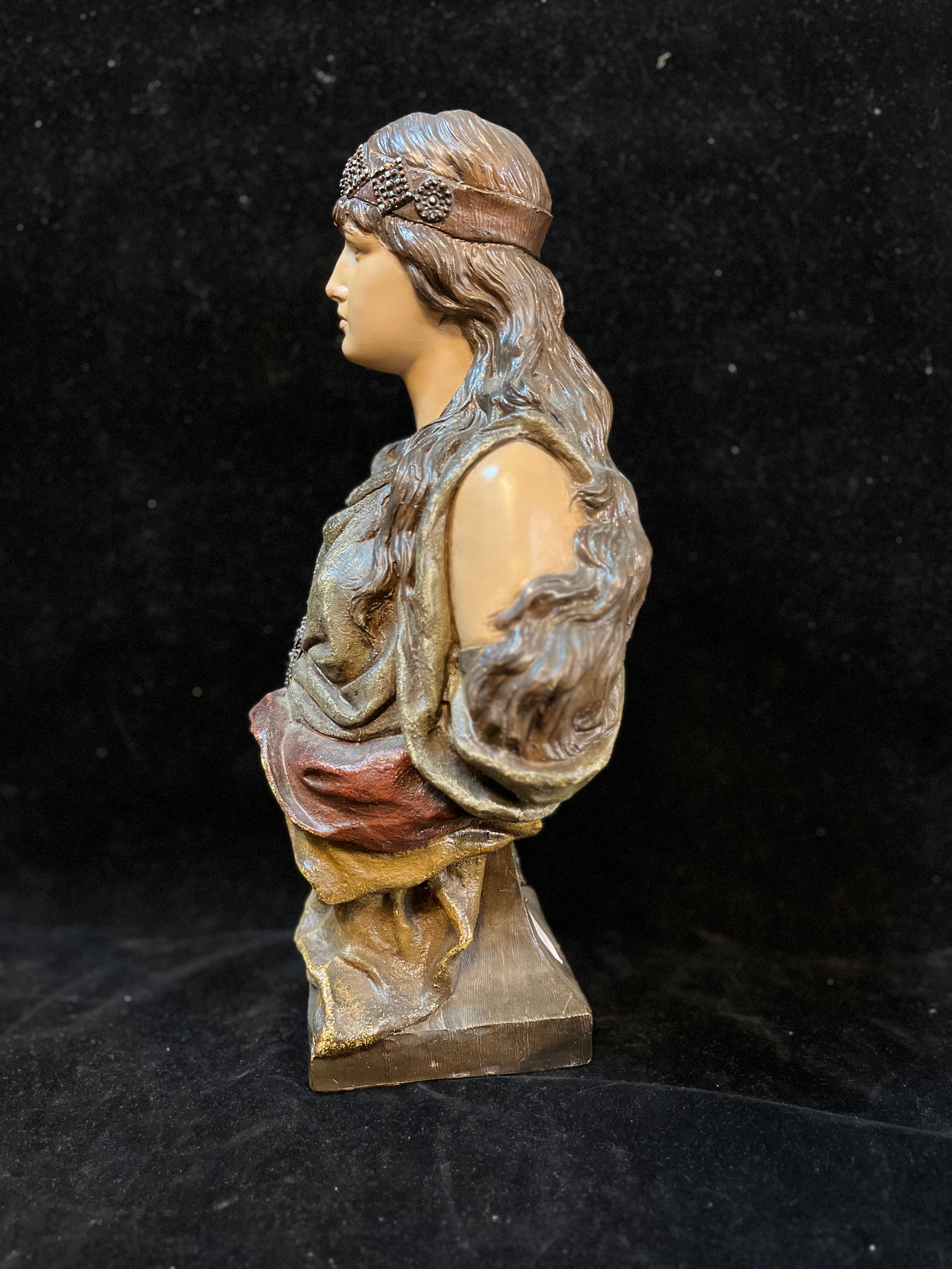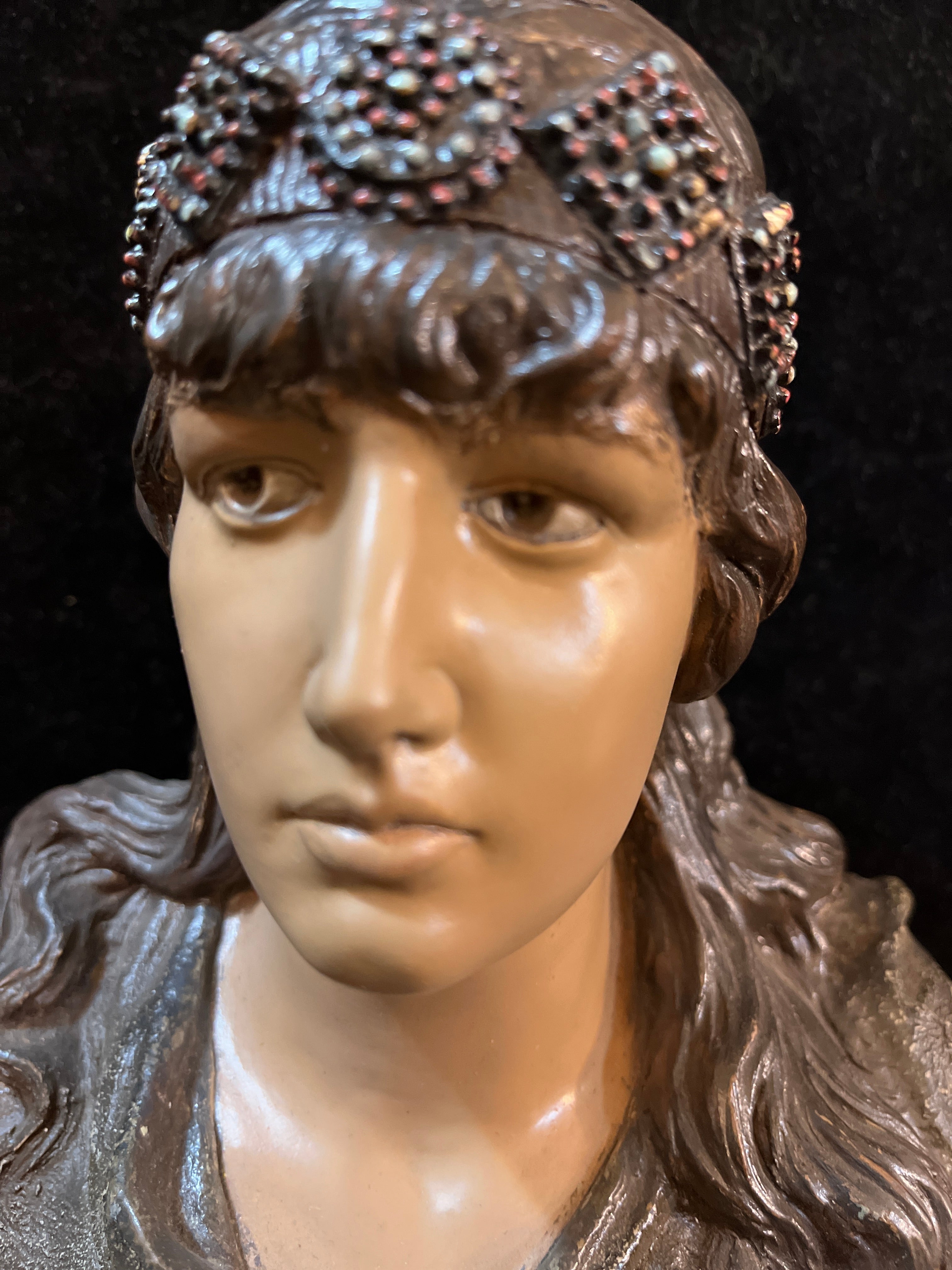 Imponente busto de terracota policromada del talentoso escultor austriaco Friedrich Goldscheider, firmada y con su número de serie visible 12/1042. L figura representa clásica imagen de Judith. Resaltando de ella una presencia desbordante que mezcla fuerza y serenidad. Además se observa un gran nivel de detalles tanto en sus vestimentas, adornos, como también en su rostro, donde destaca su mirada segura hacia un horizonte y su cabello ondeante cayendo por sus hombros. Se presume que su data es muy cercana a principios de 1900.