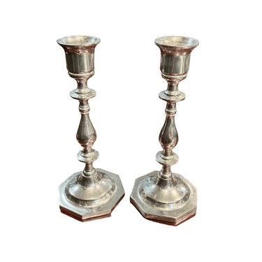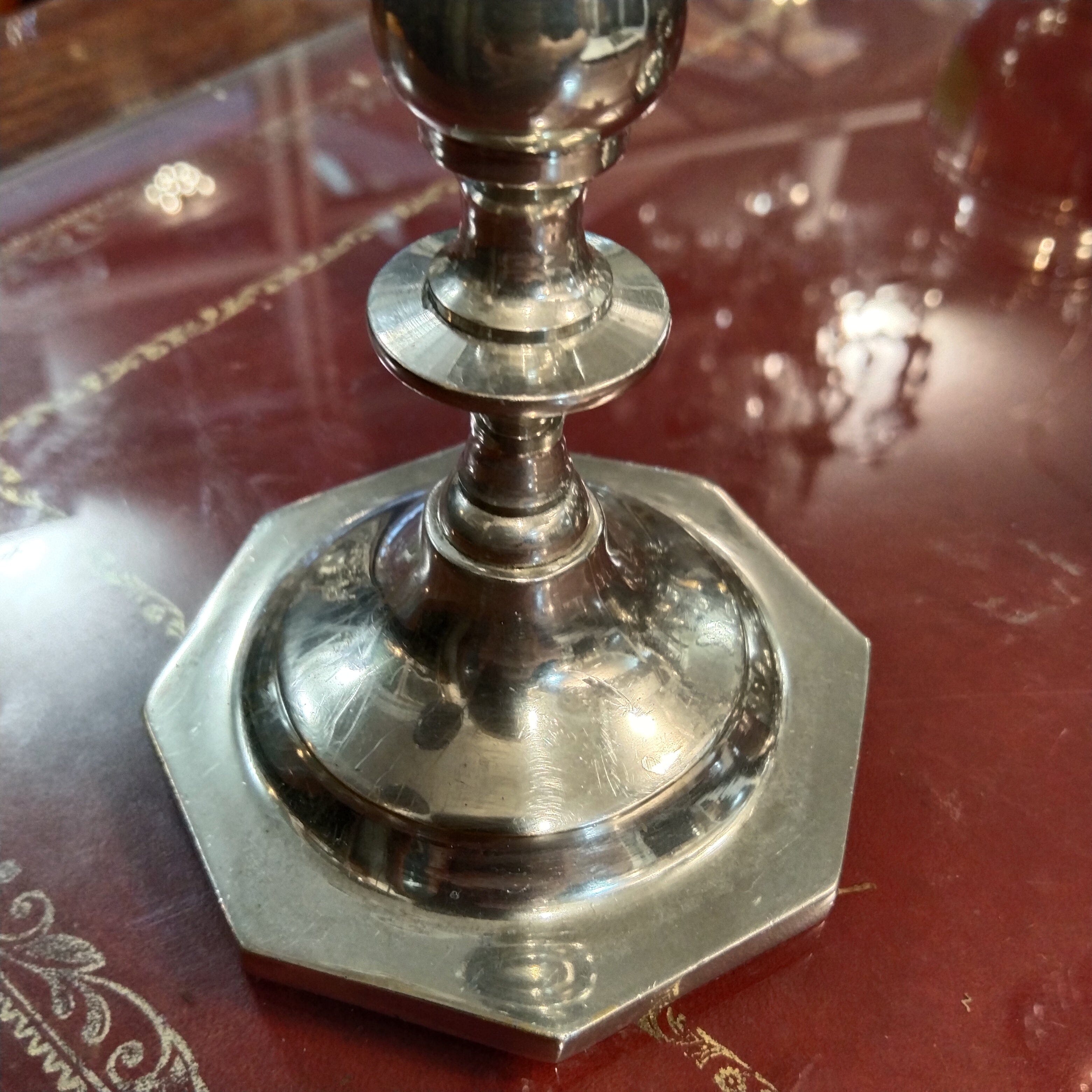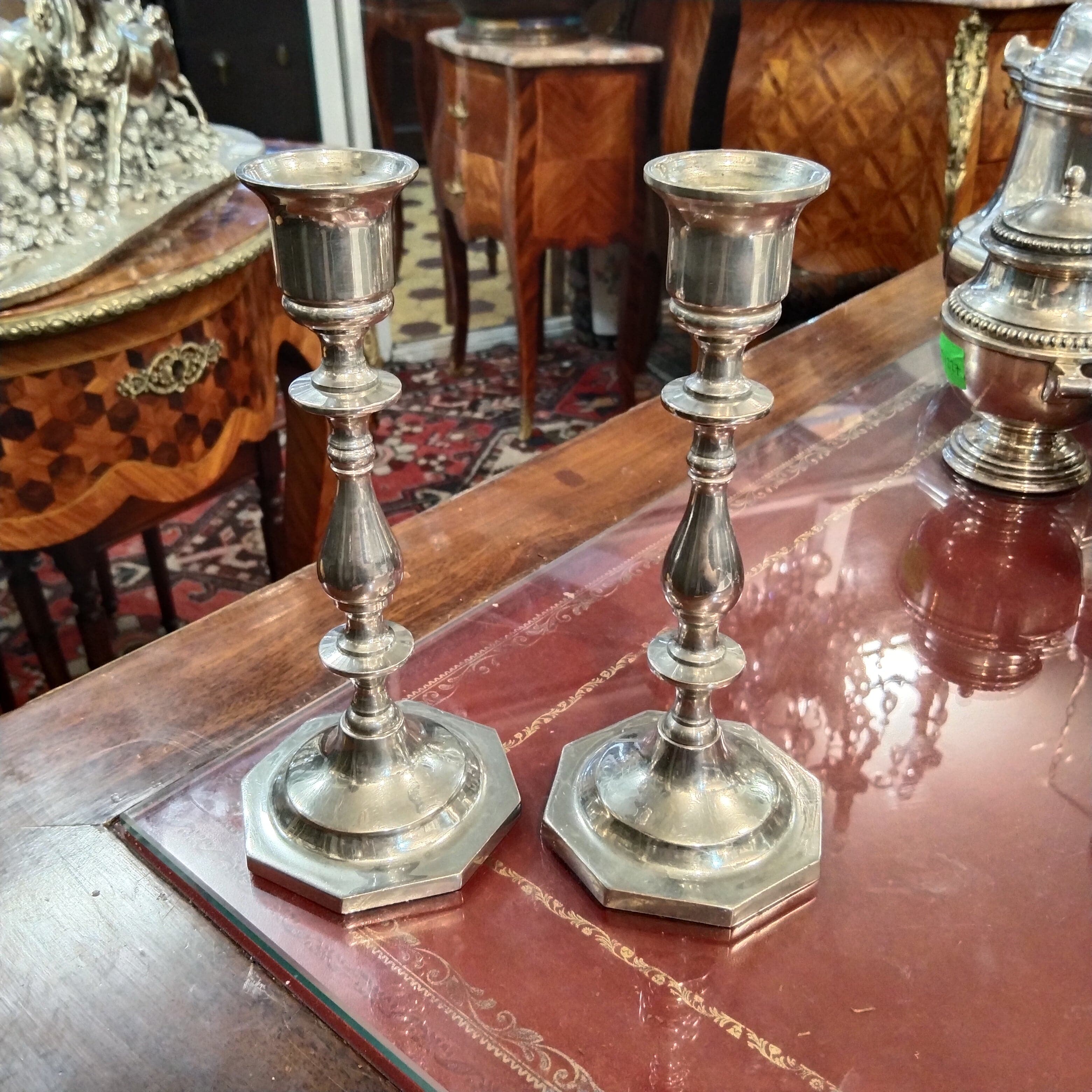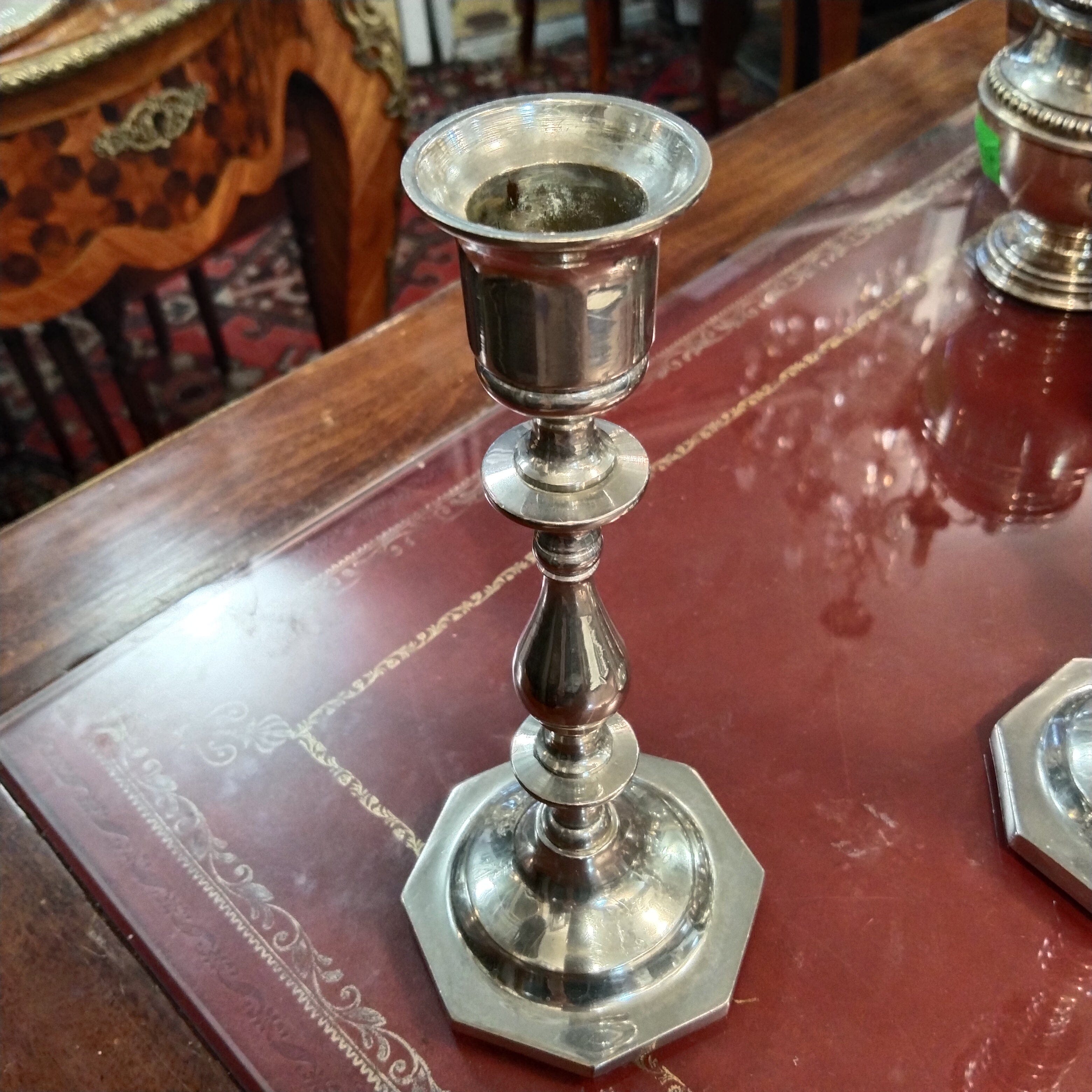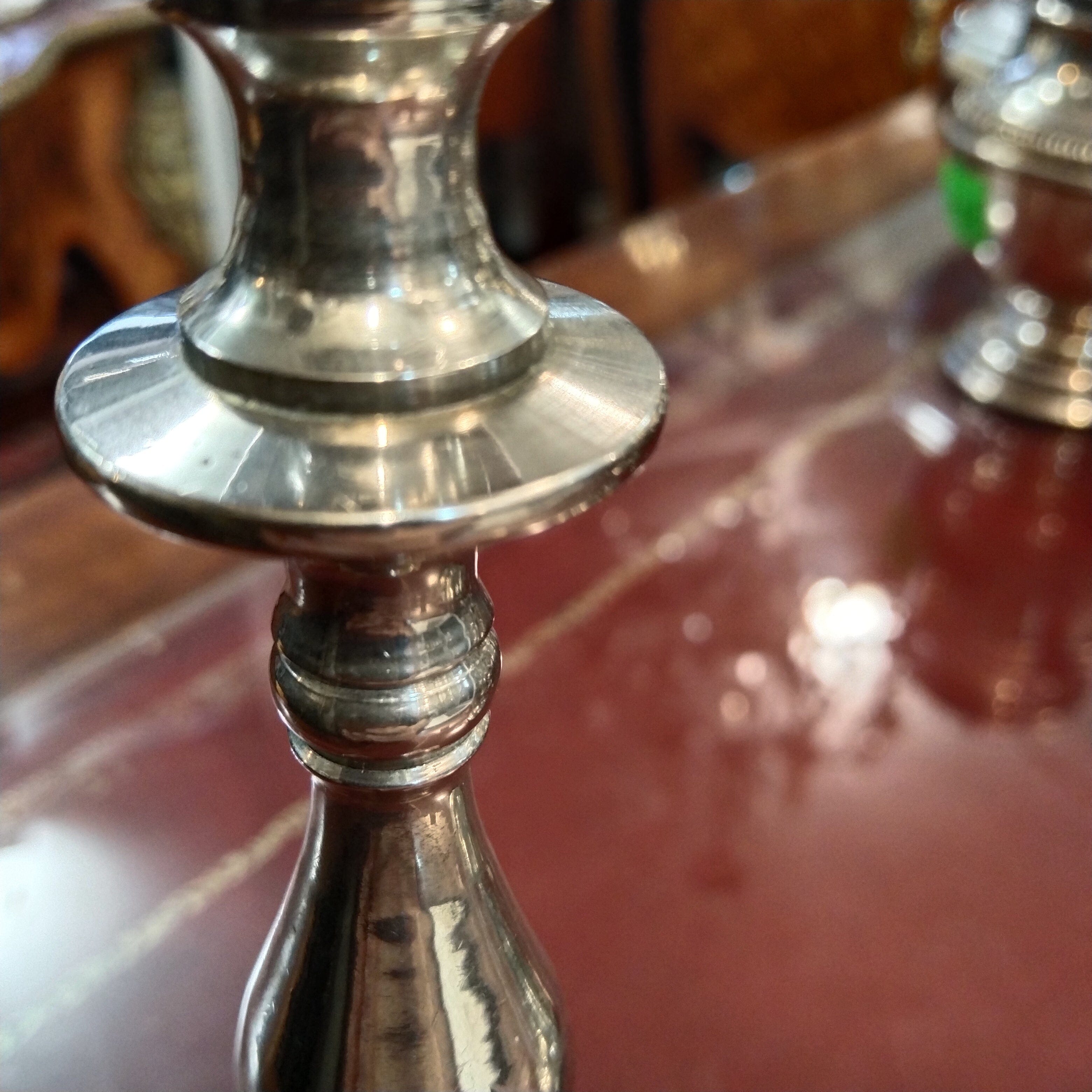 Bello juego de dos candelabros de plaqué pequeños, con un sobrio diseño torneado.