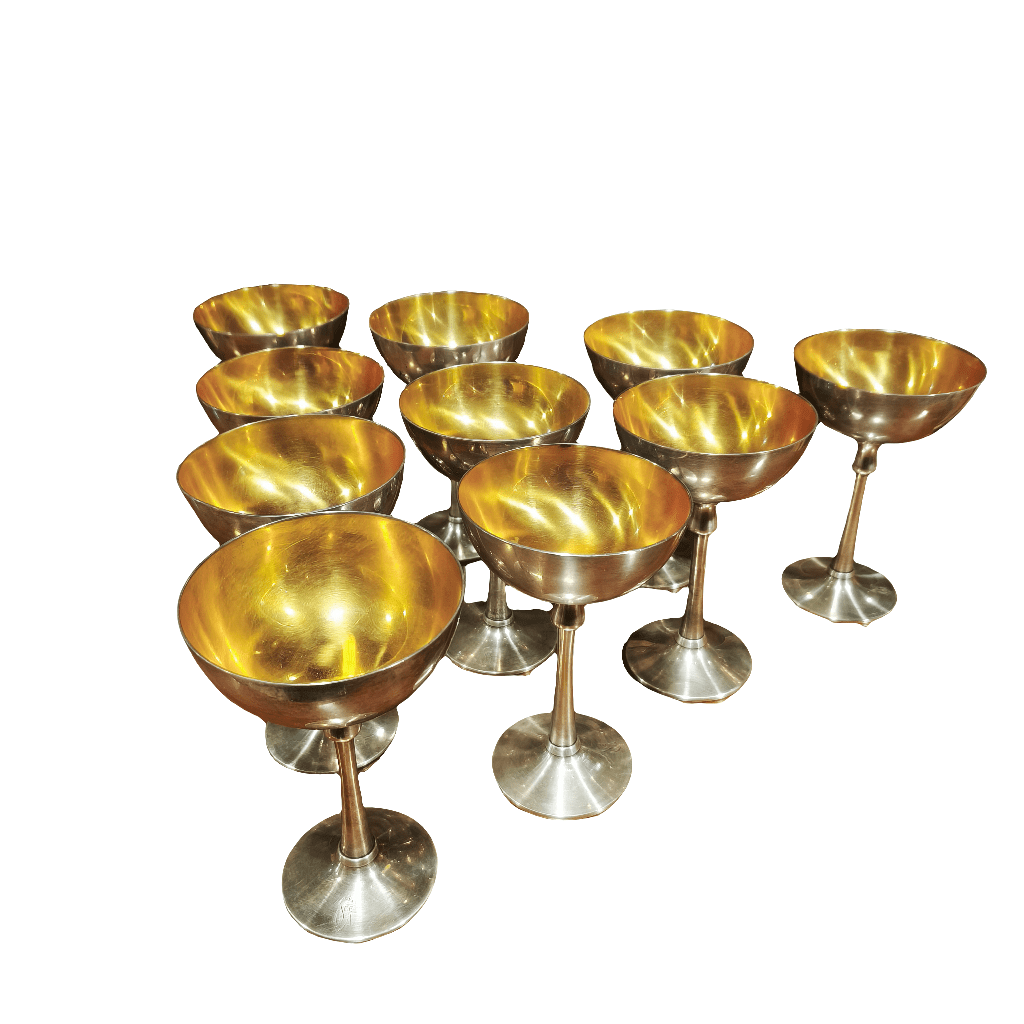 Juego de 10 copas de plaqué vermeil, de la reconocida marca metalúrgica de origen Austriaco Art Krupp Berndorf, con un elegante y sobrio diseño con el interior de la copa en baño de oro y las iniciales S de G en su base. El copon es desmontable de su mango para la limpieza. El juego viene con su cofre original de madera y recubrimiento de cuero verde, de dos cajones para almacenar las copas.