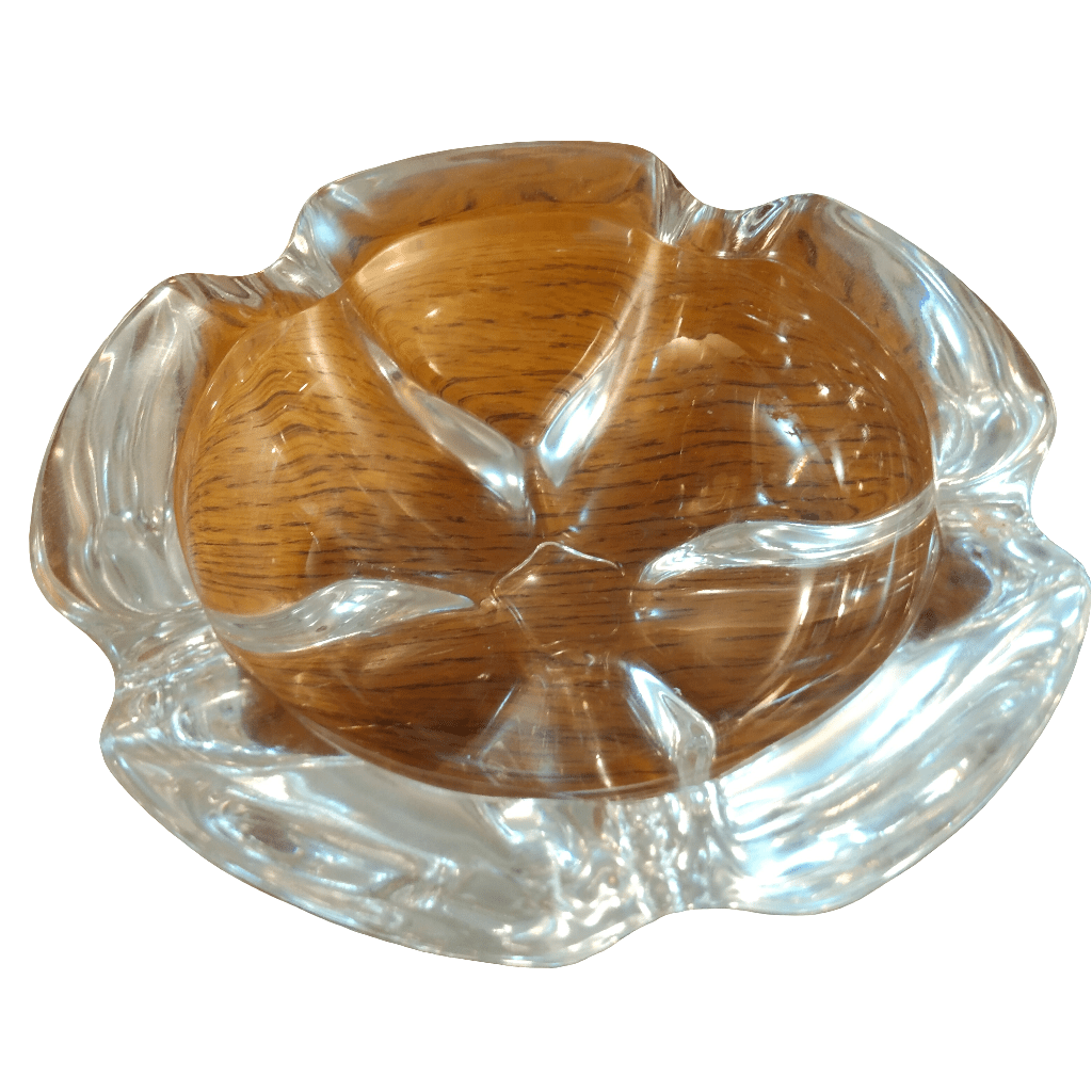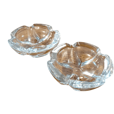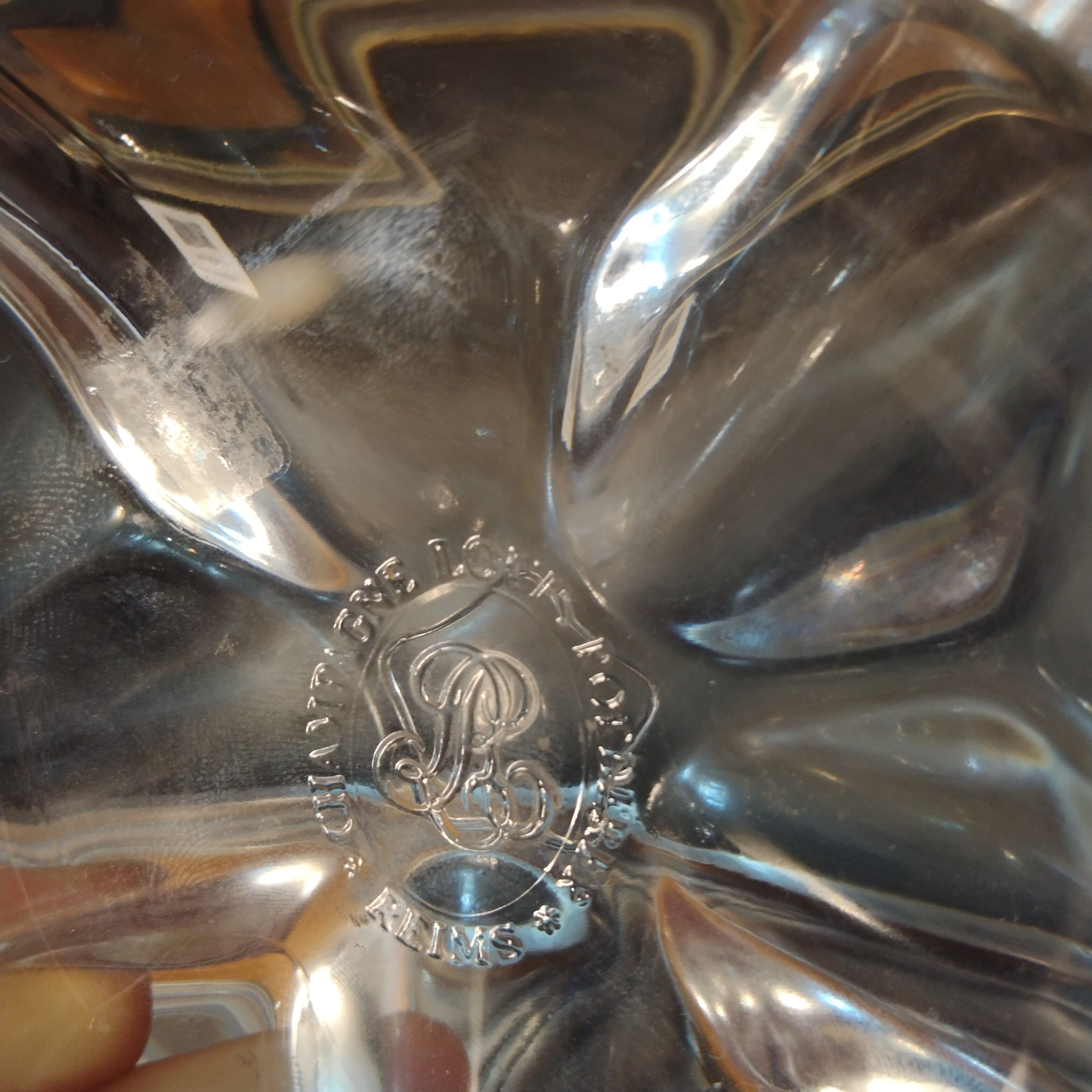 Juego de dos posa Champagne de cristal, de la exclusiva marca de espumante francés Louis Roderer. Las piezas tienen una bella forma floral y el sello de la marca en su superficie.