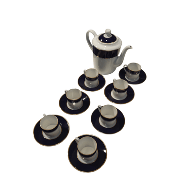 Elegante juego de café para 7 personas, con un bello diseño azul y dorado.